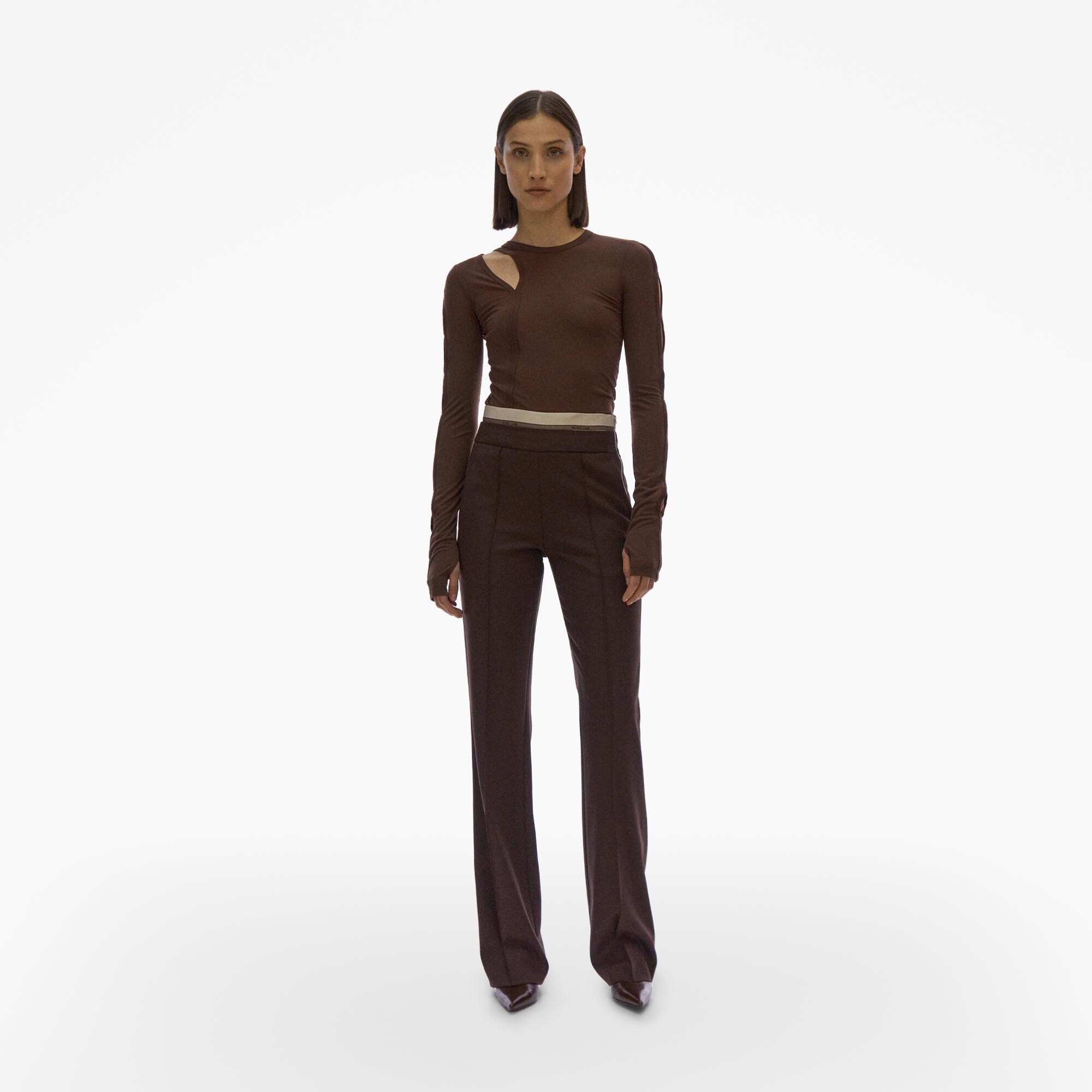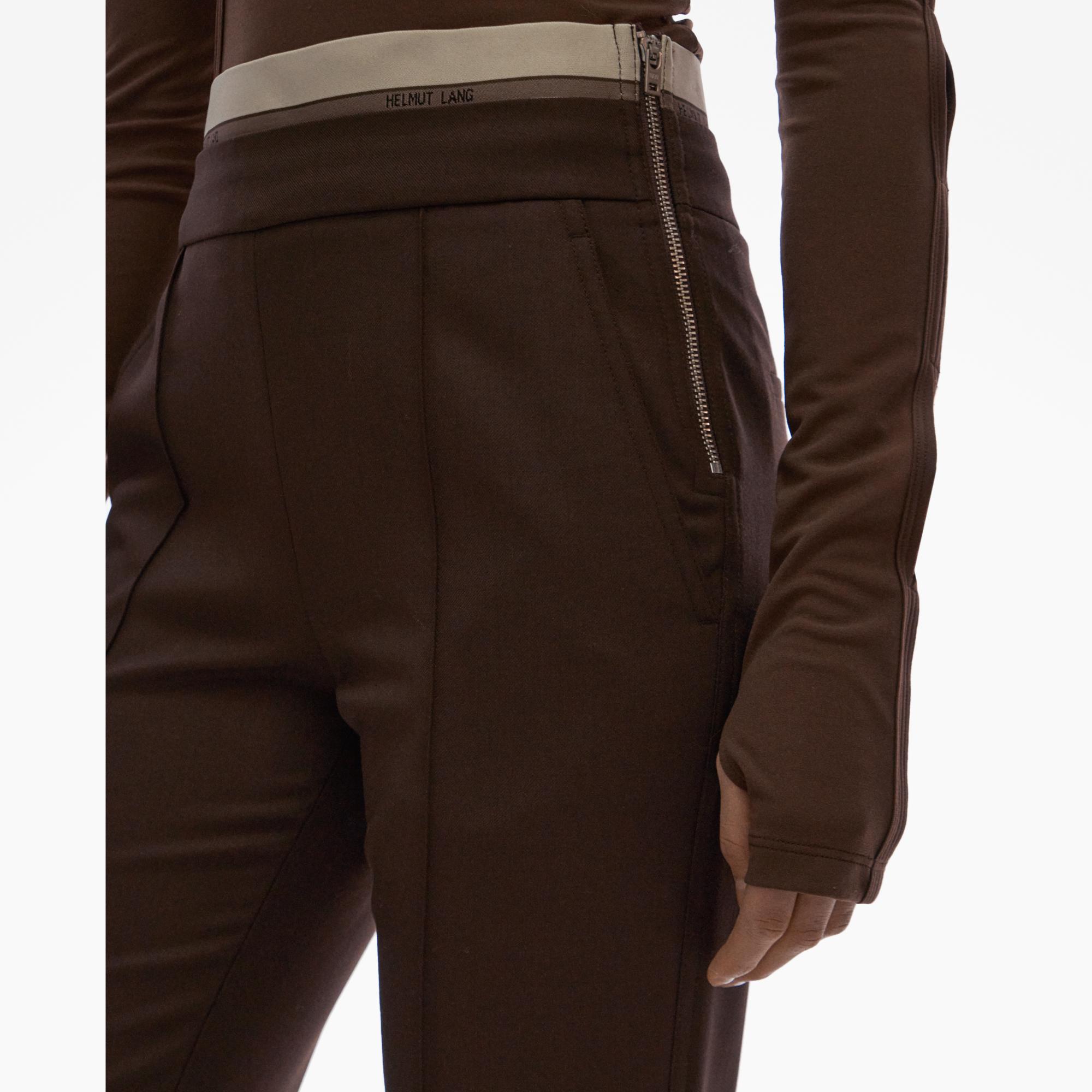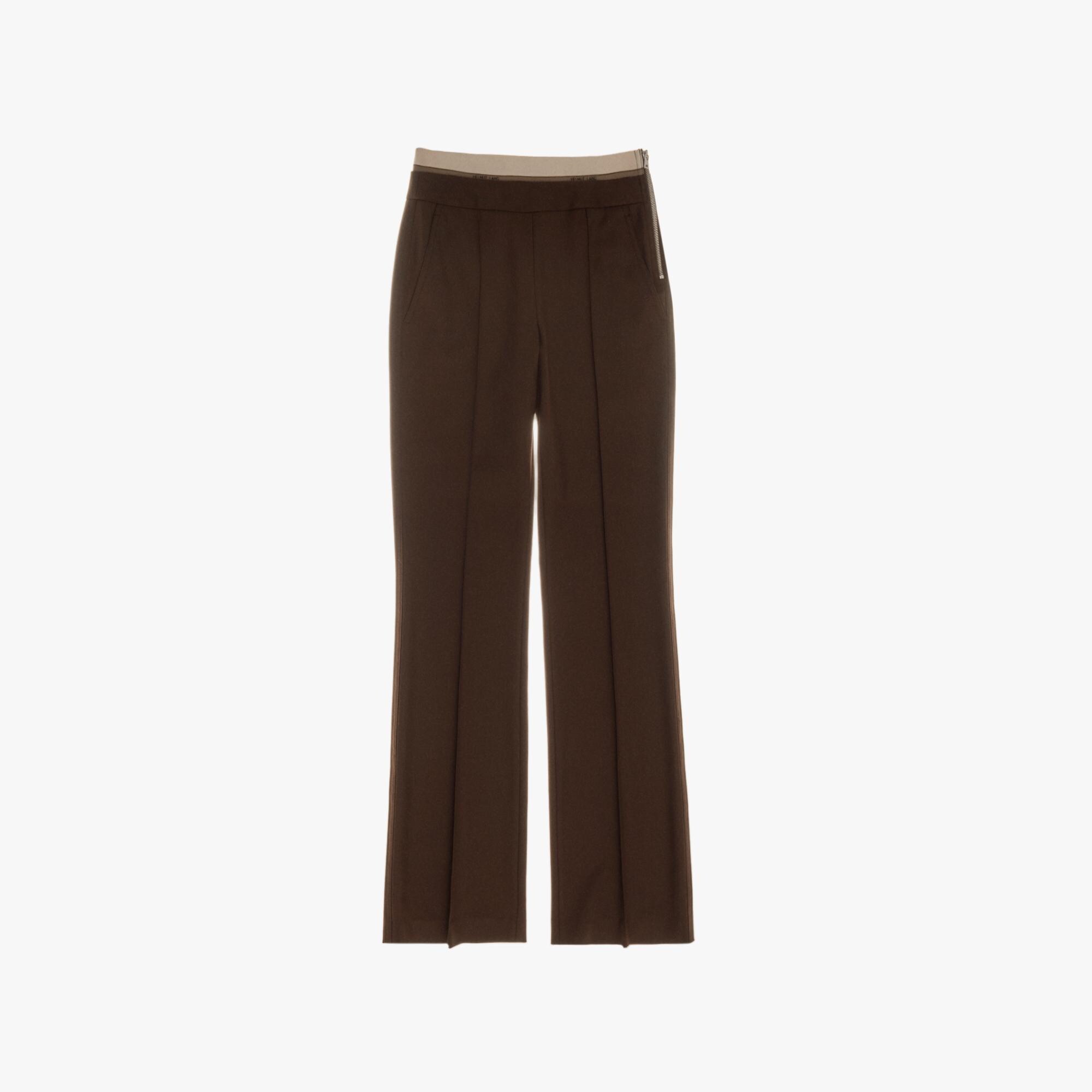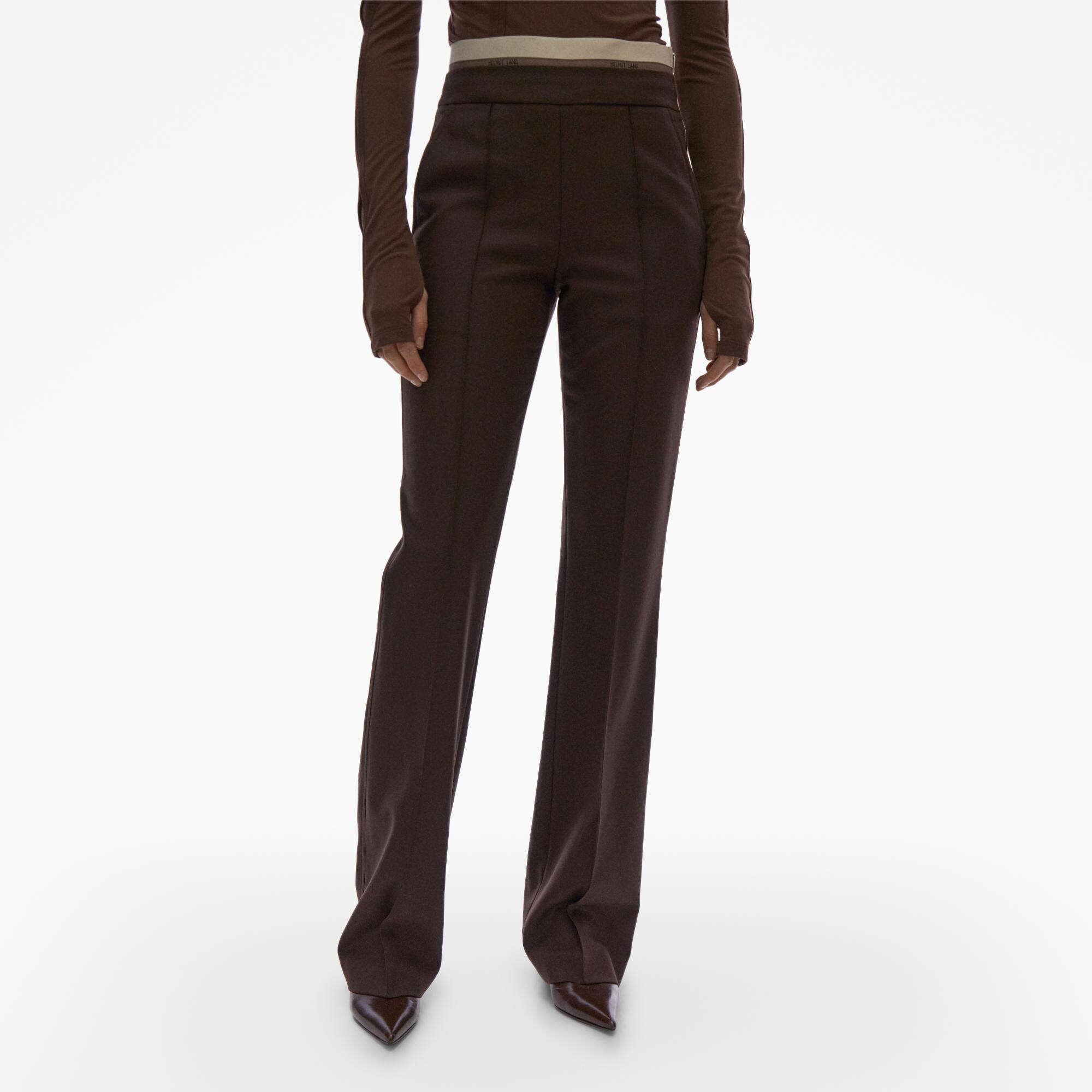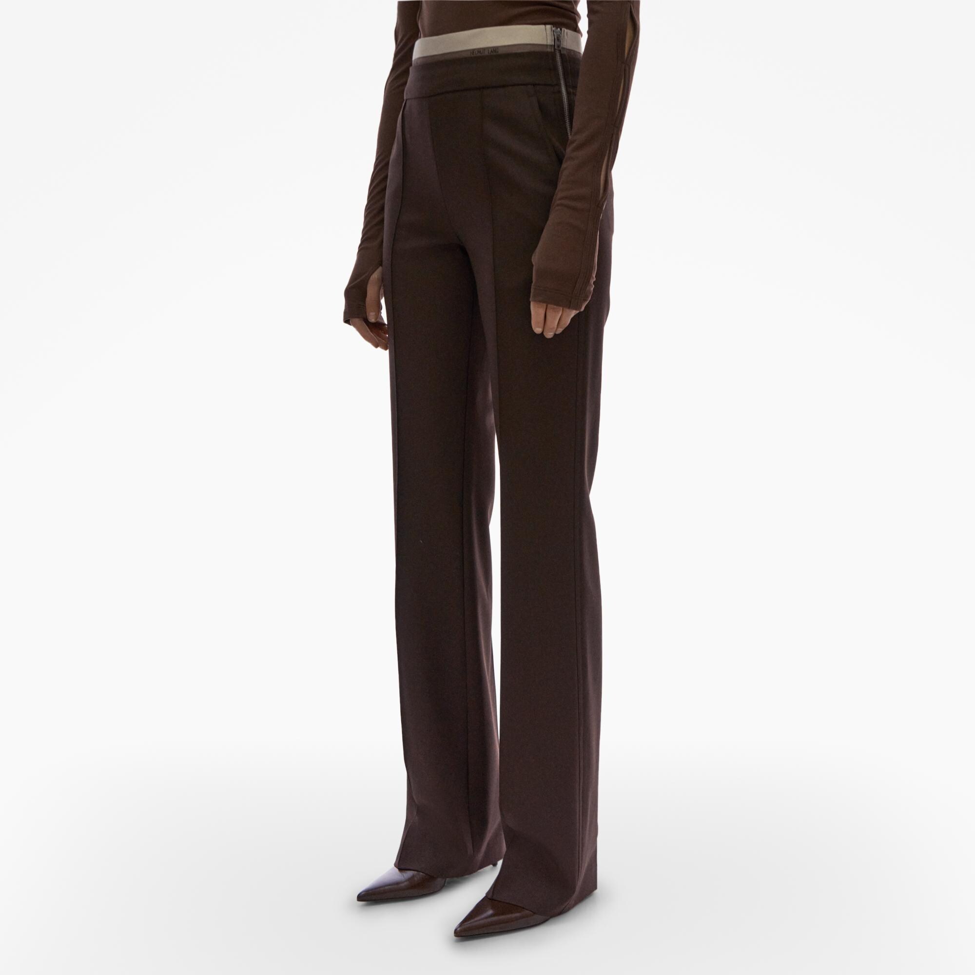 The Helmut Lang Pull On Pant is a high-rise wide-leg pant in stretch wool-blend with a pleated elasticized logo waistband.