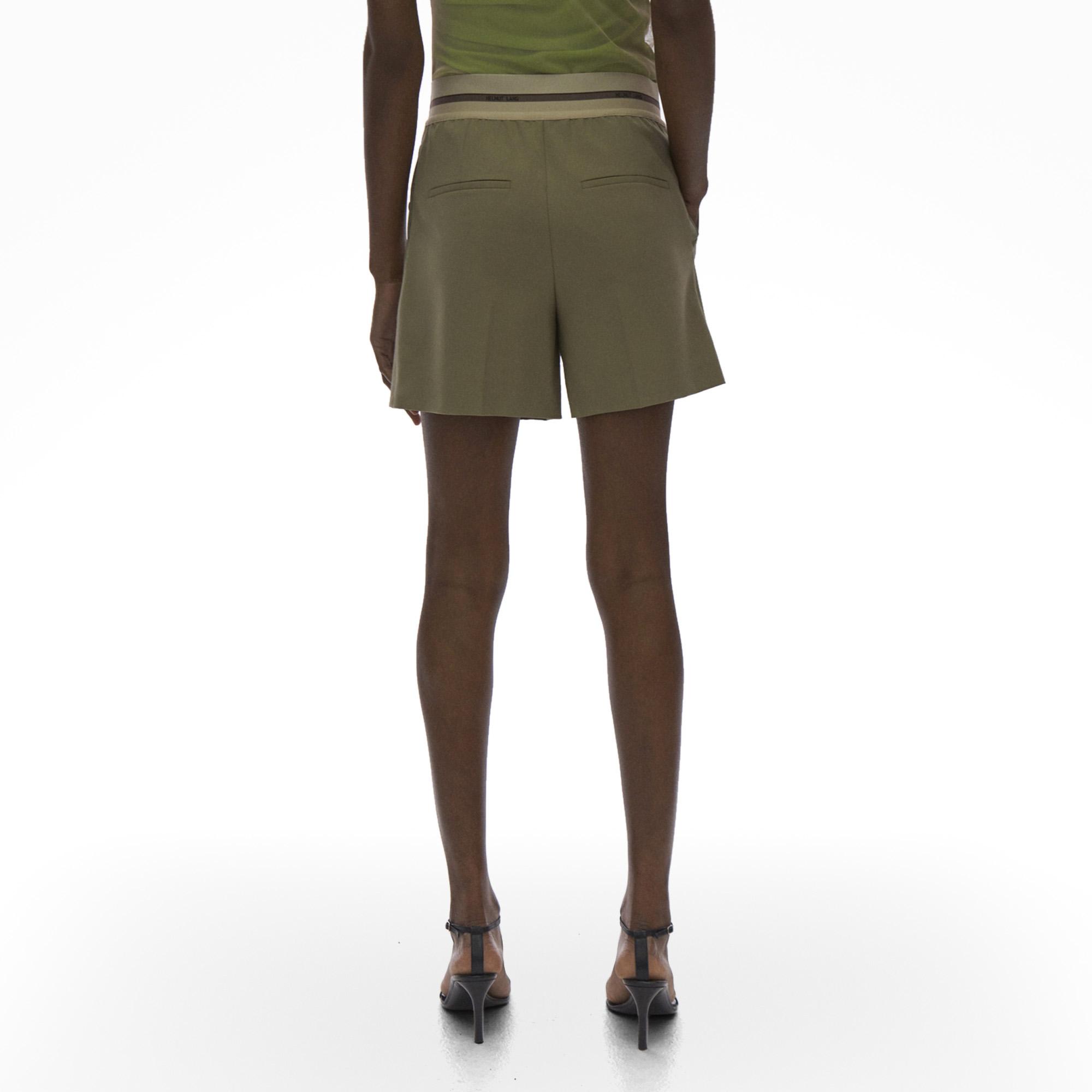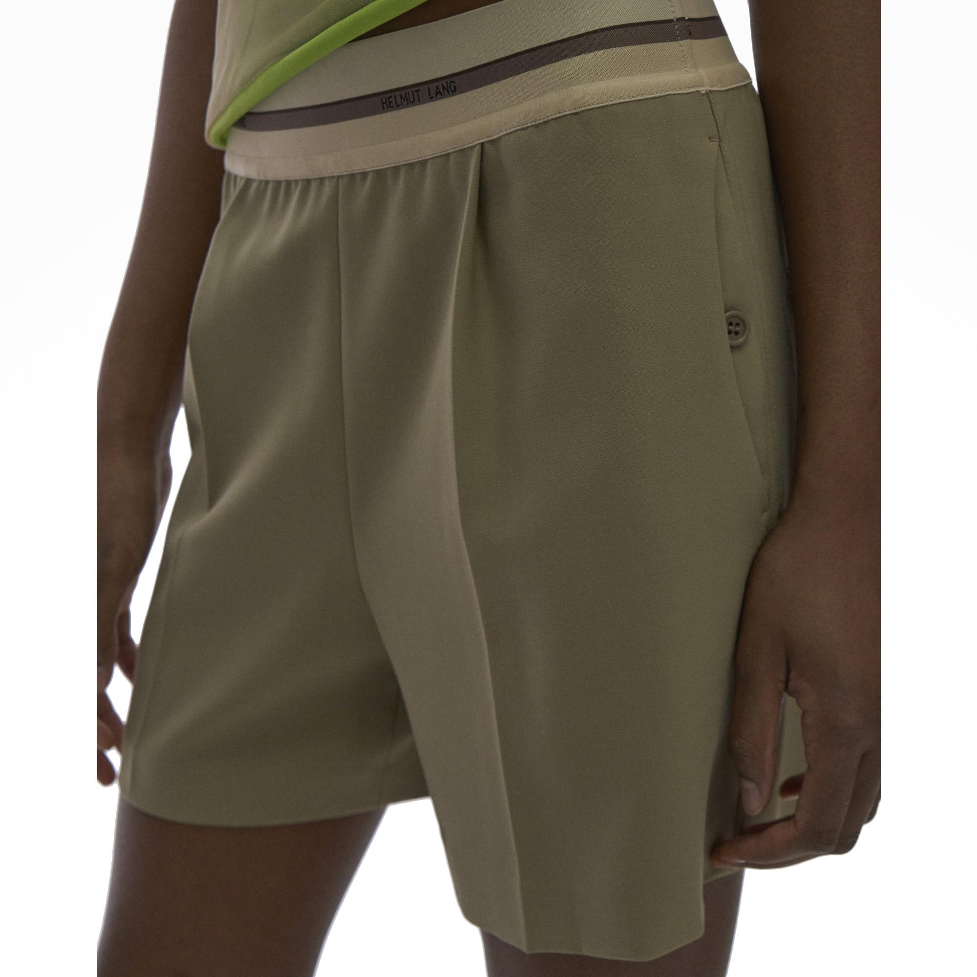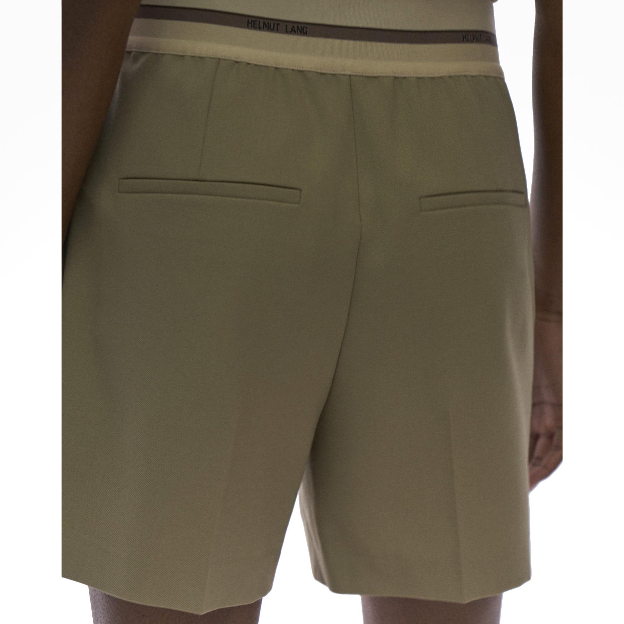 The Helmut Lang Pull On Short is a high-rise short in stretch wool-blend with a pleated elasticized logo waistband.