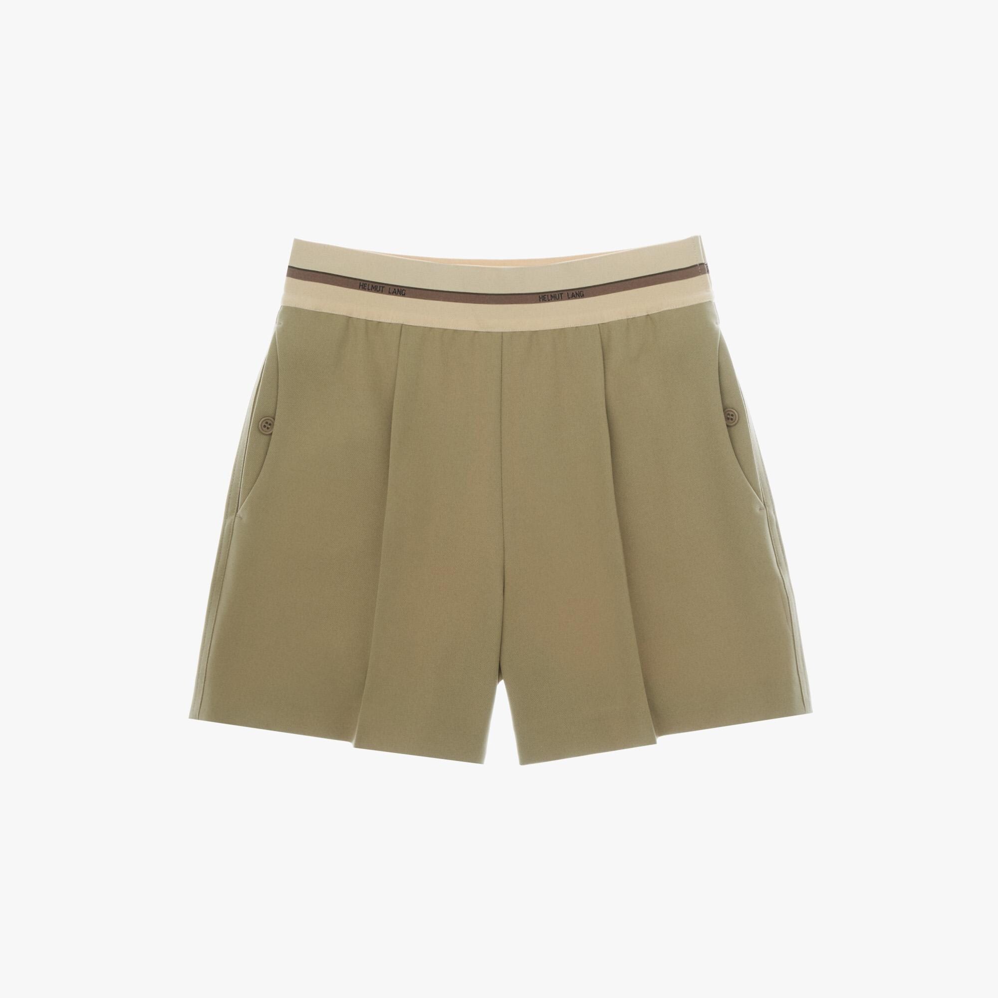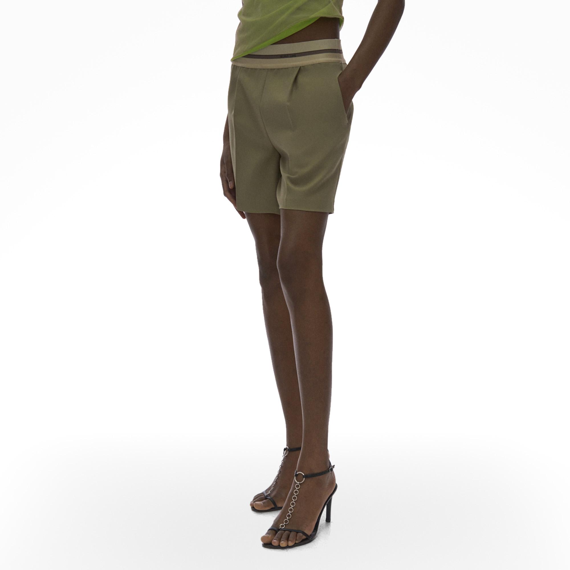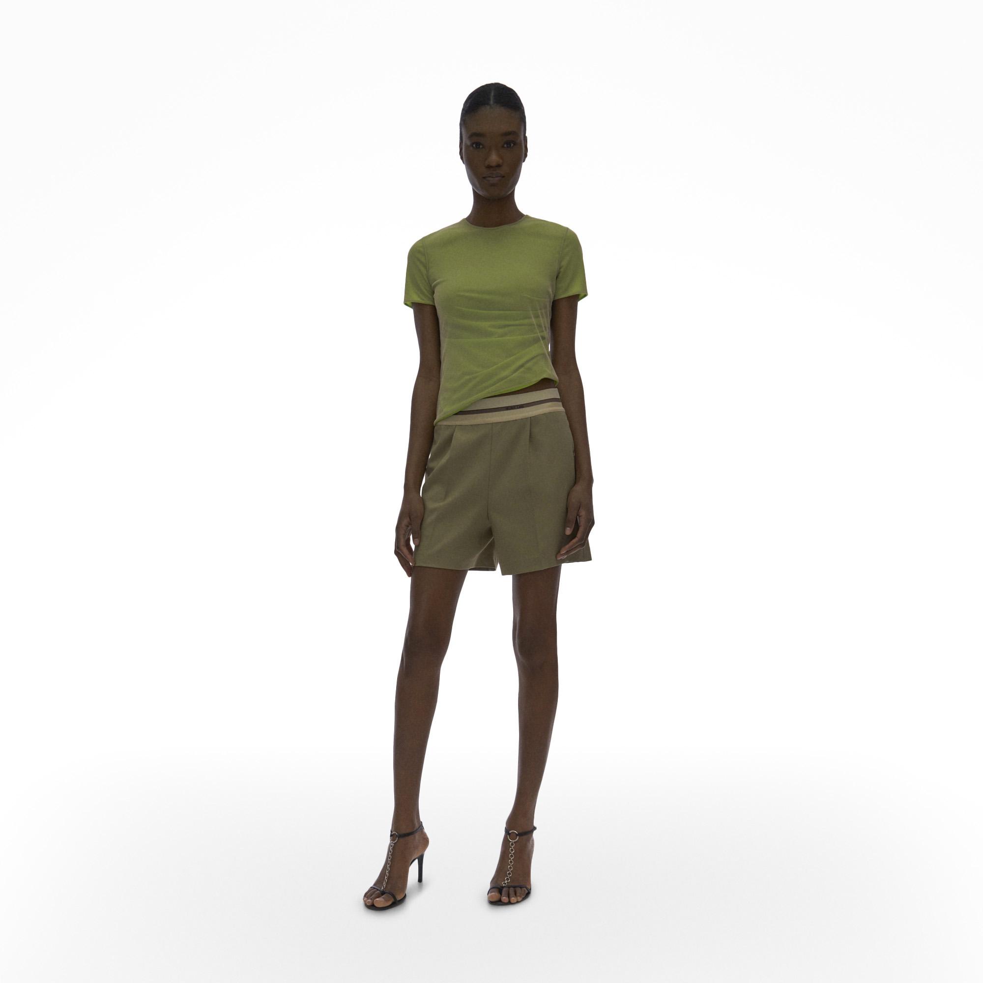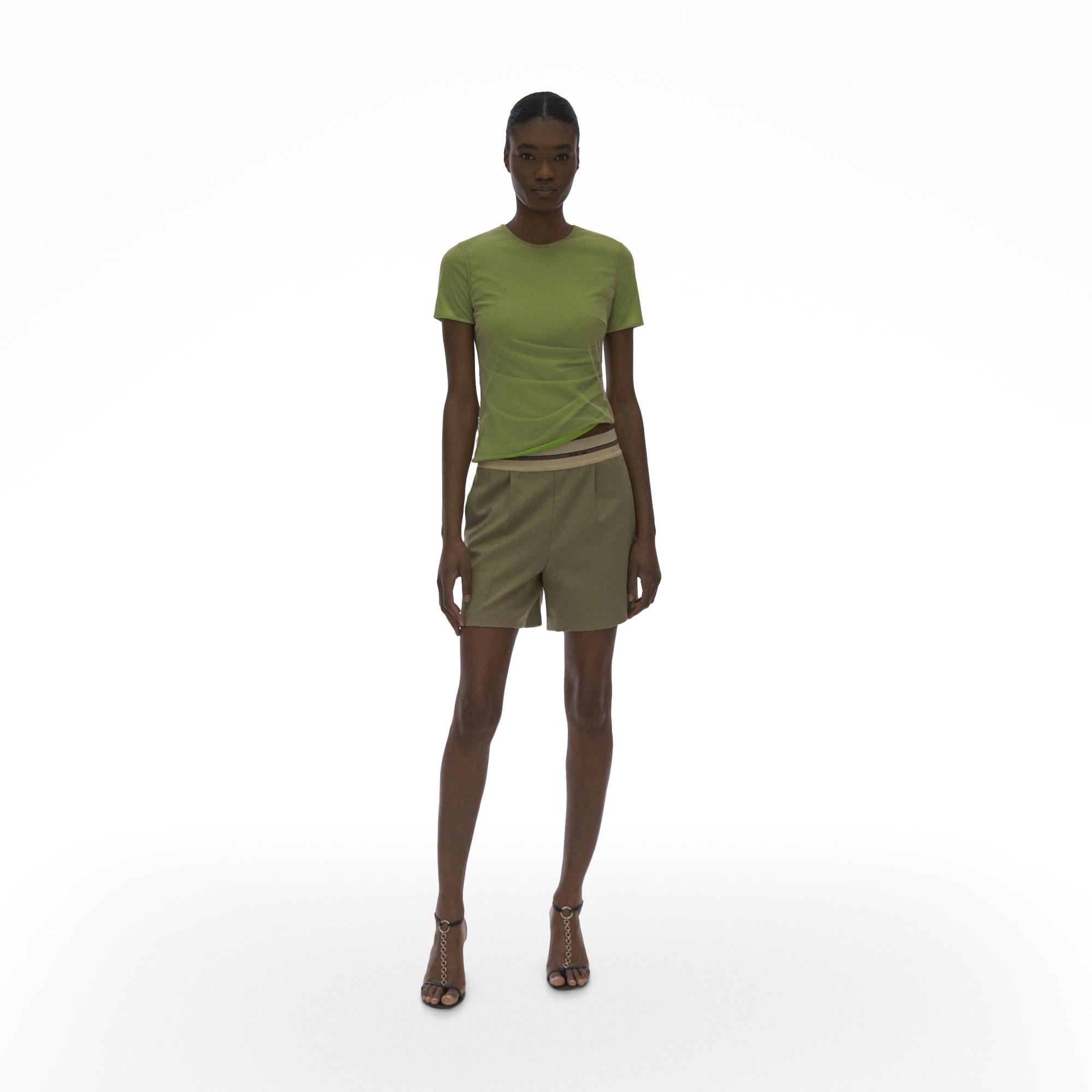 The Helmut Lang Pull On Short is a high-rise short in stretch wool-blend with a pleated elasticized logo waistband.