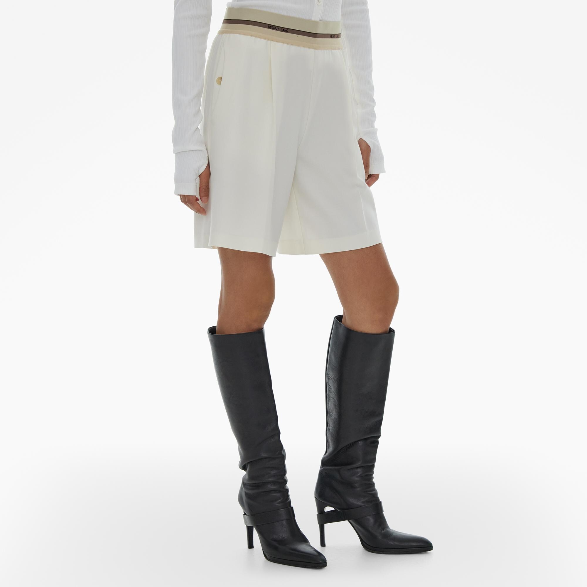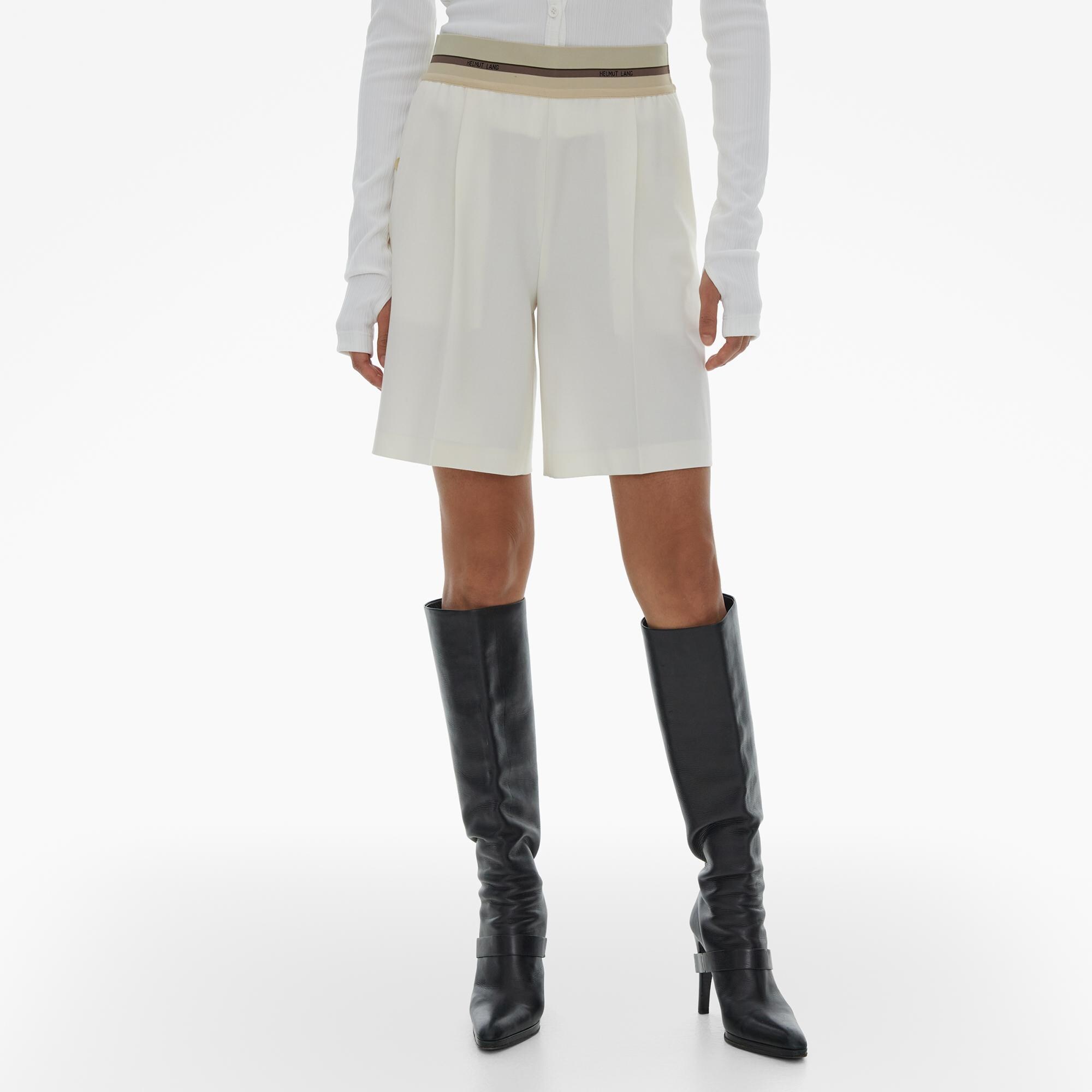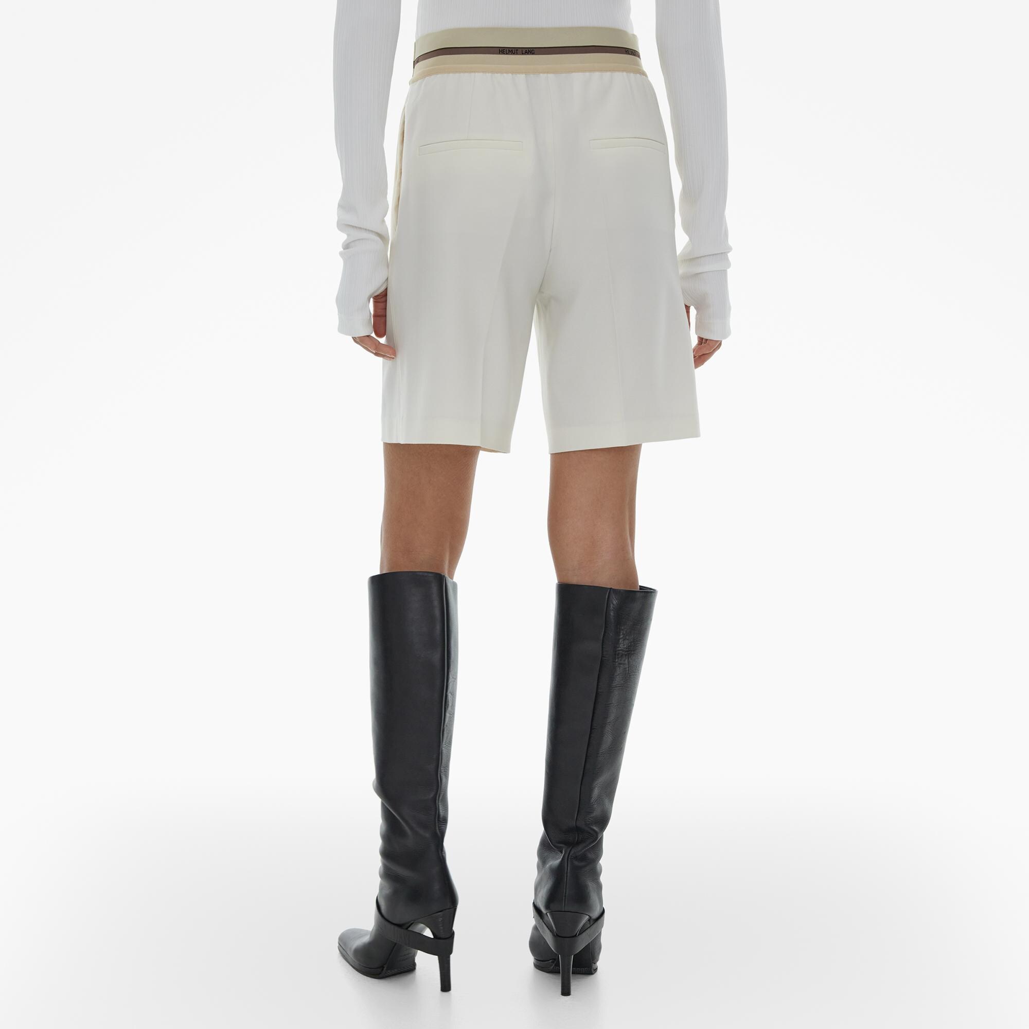 The Helmut Lang Pull On Short is a high-rise short in stretch wool-blend with a pleated elasticized logo waistband.