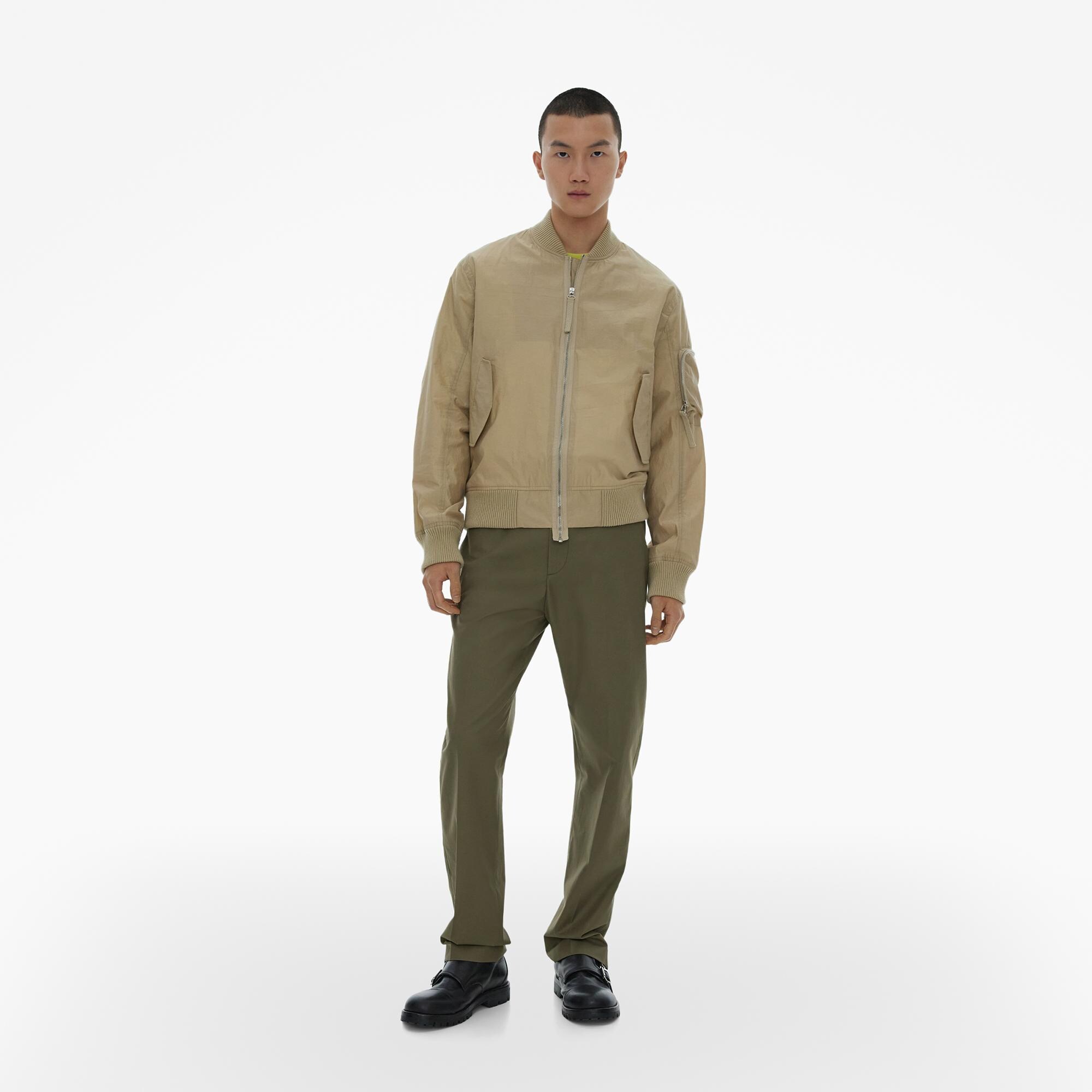 The Helmut Lang Bomber Jacket is a relaxed style with a semi-sheer cotton-nylon overlay and rib knit collar, cuffs and hem, zip front closures, flap pockets and back HL logo.