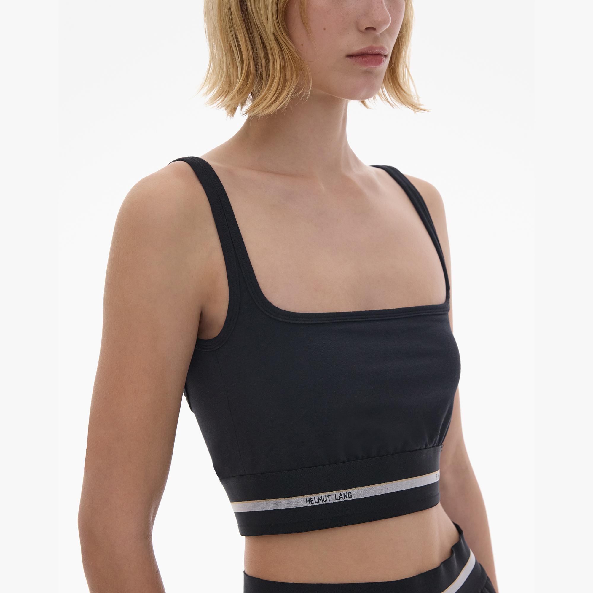 The Helmut Lang Bra Top is a cropped style in a light cotton-modal jersey with a square neckline, racer-cut back, and an elasticized logo waistband.