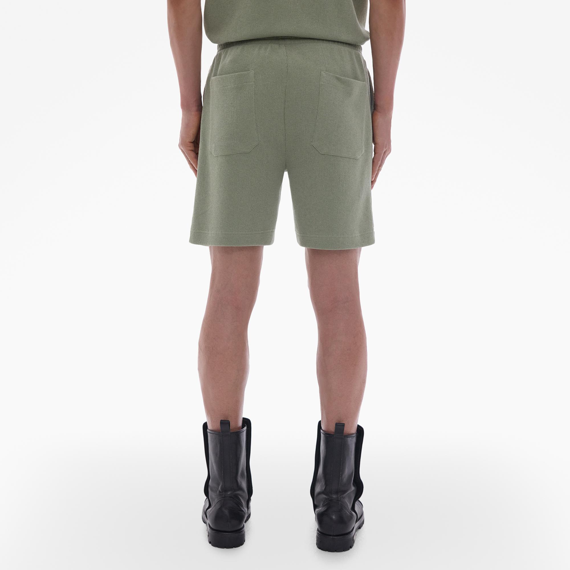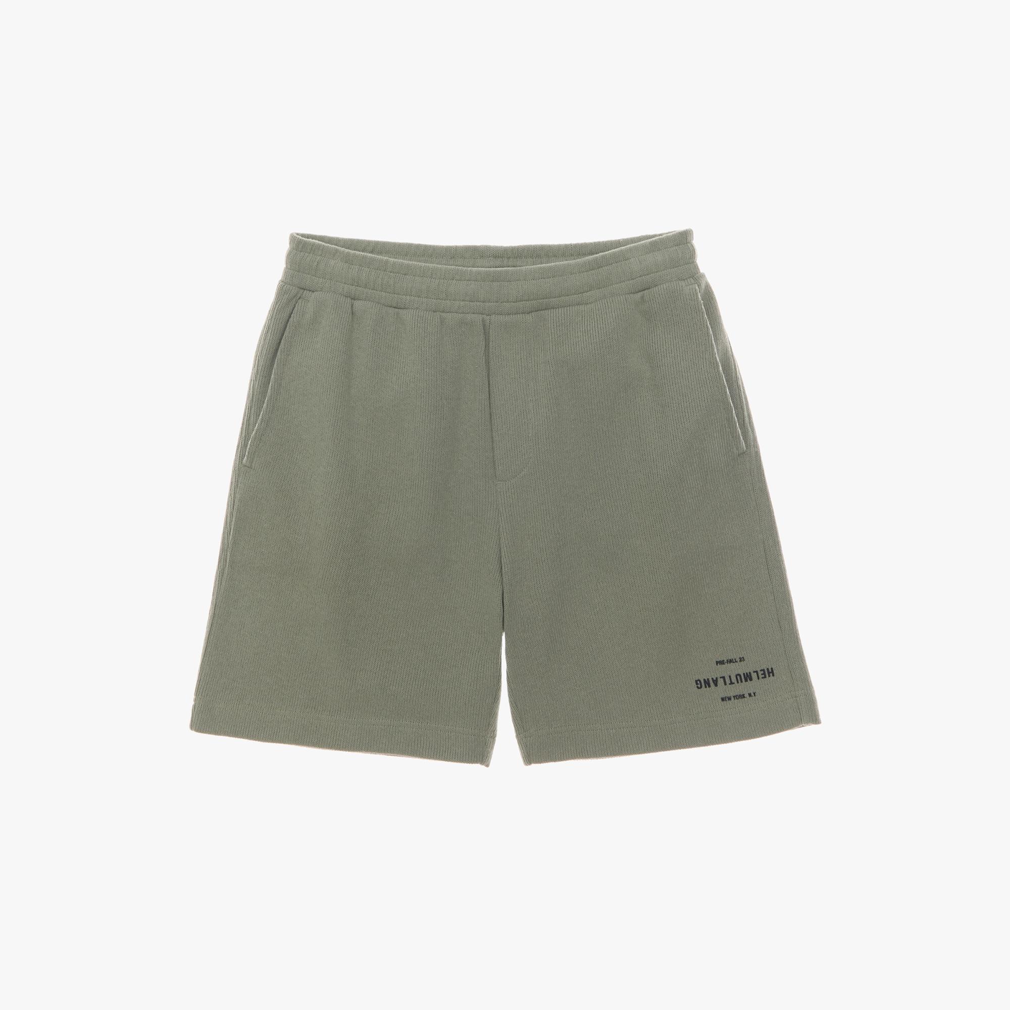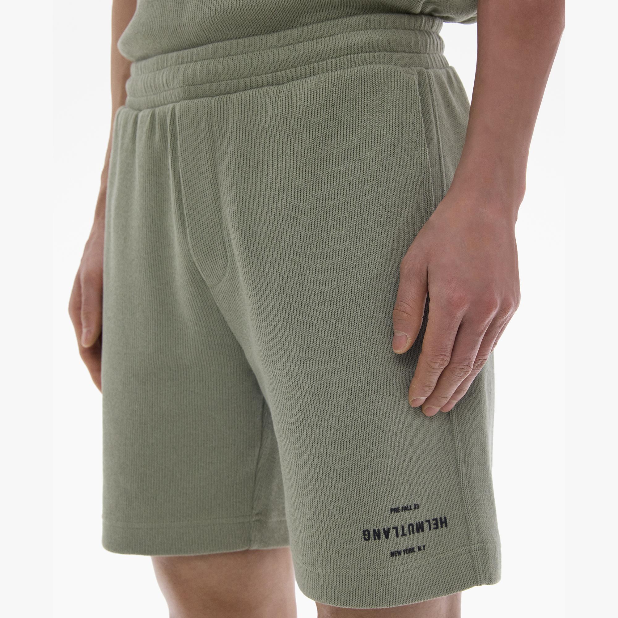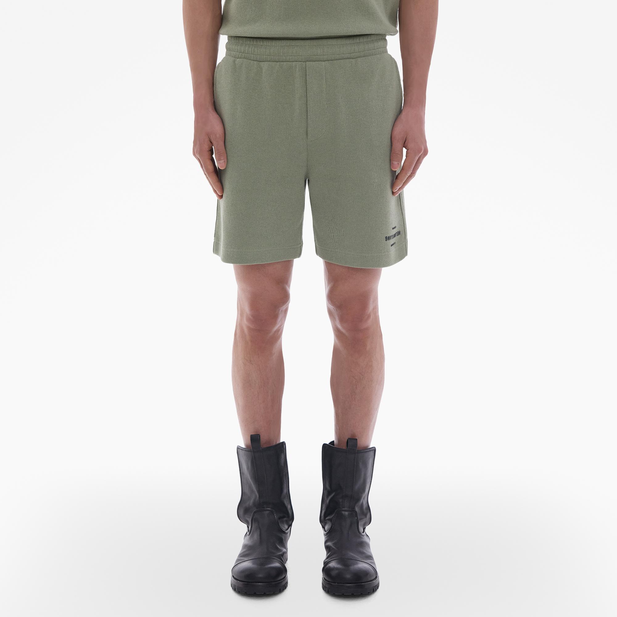 The Helmut Lang Short is a pull-on style in a blended cotton knit with a drawstring waistband, slash pockets, a back patch pocket, and an HL logo at the wearer’s left leg.