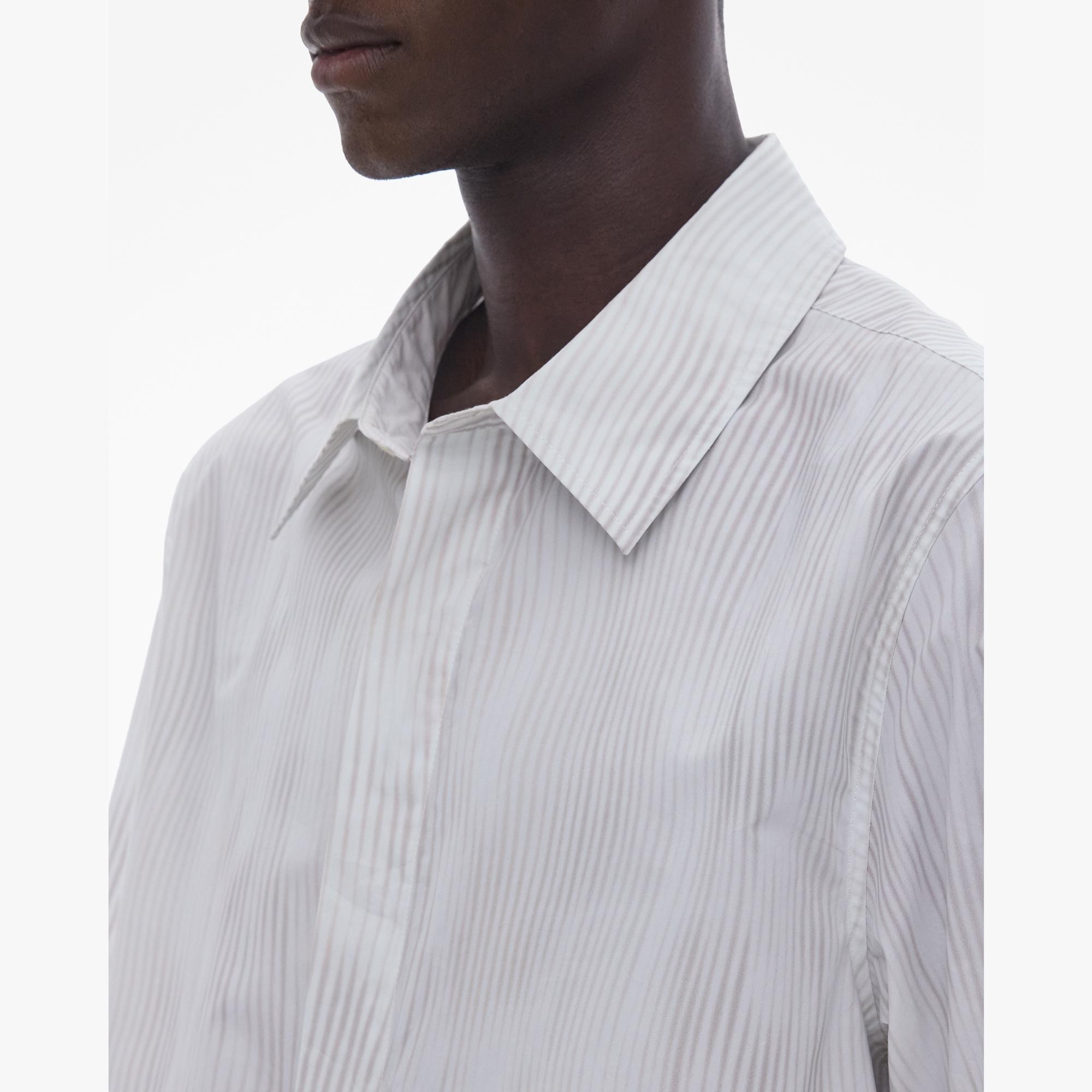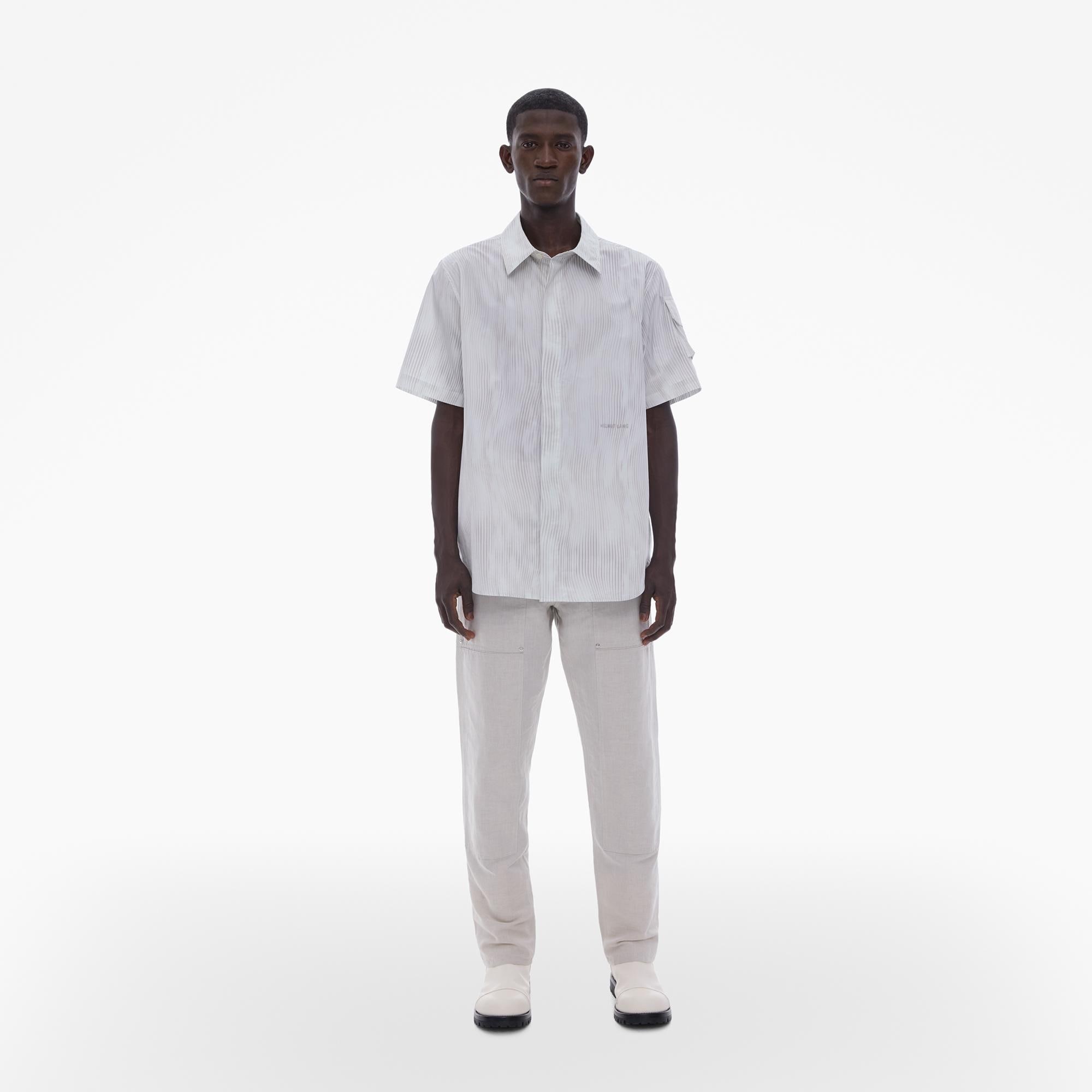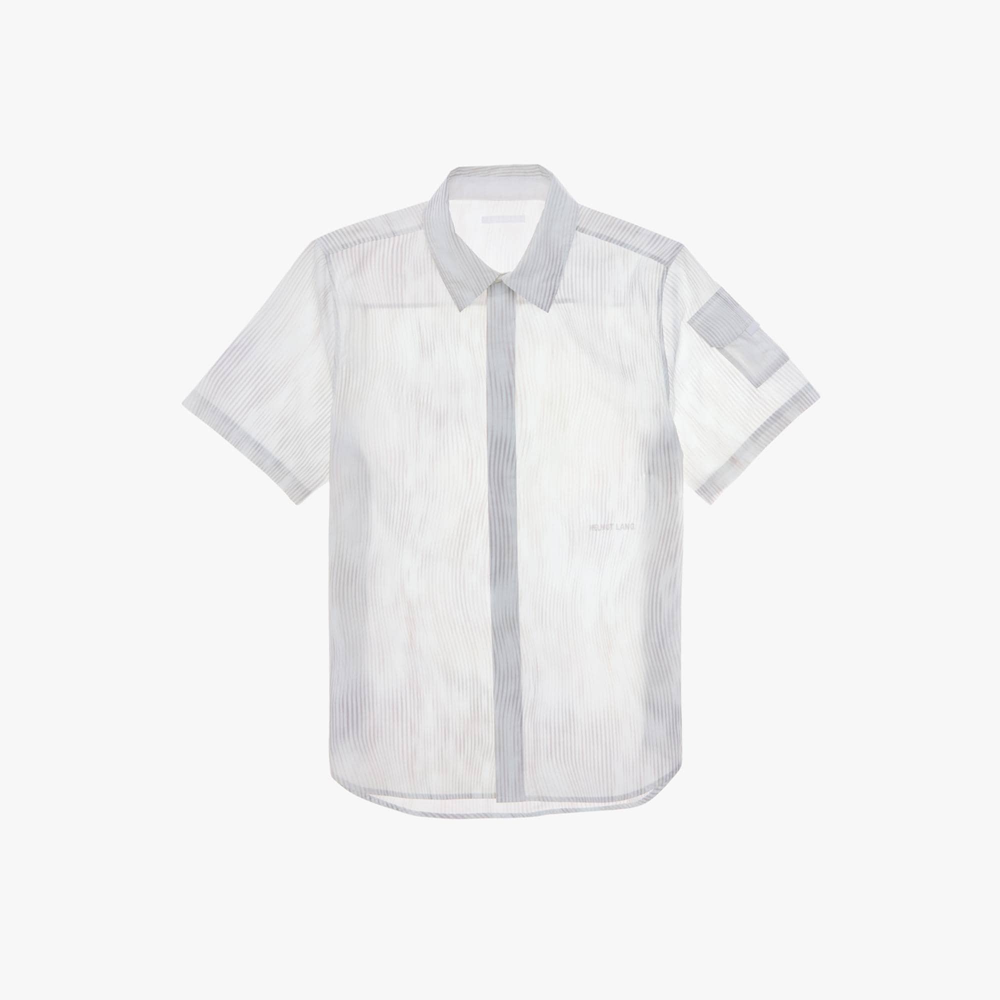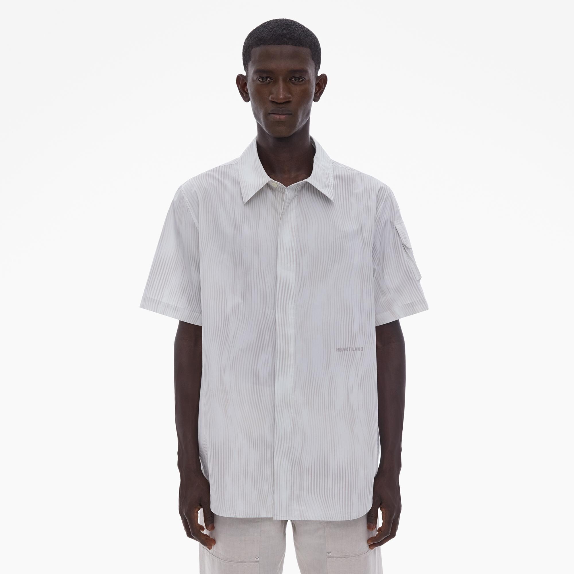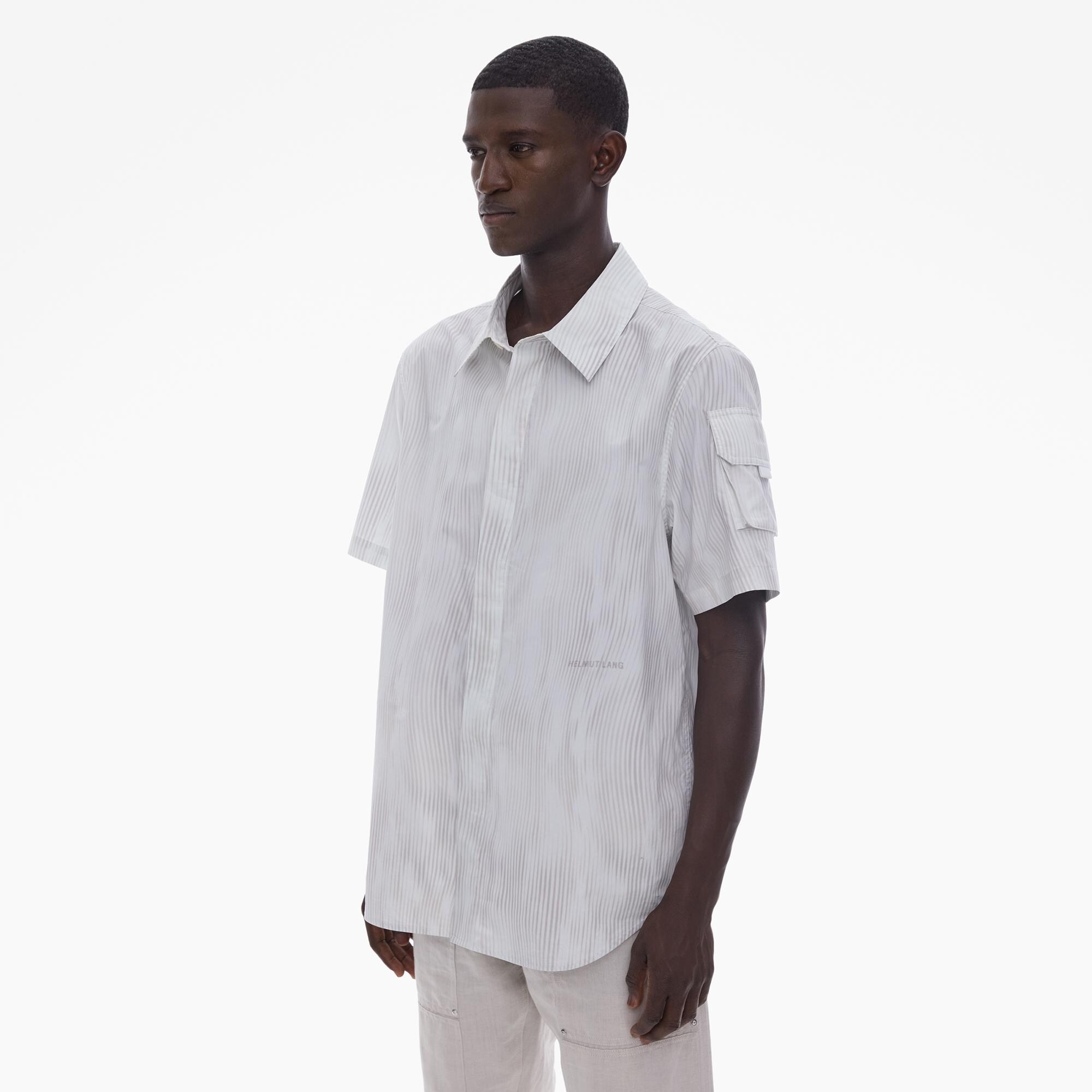 The Helmut Lang Standard Shirt is a straight-cut style in wavy striped cotton poplin with a point collar, covered button front closures, and short sleeves with a cargo pocket.