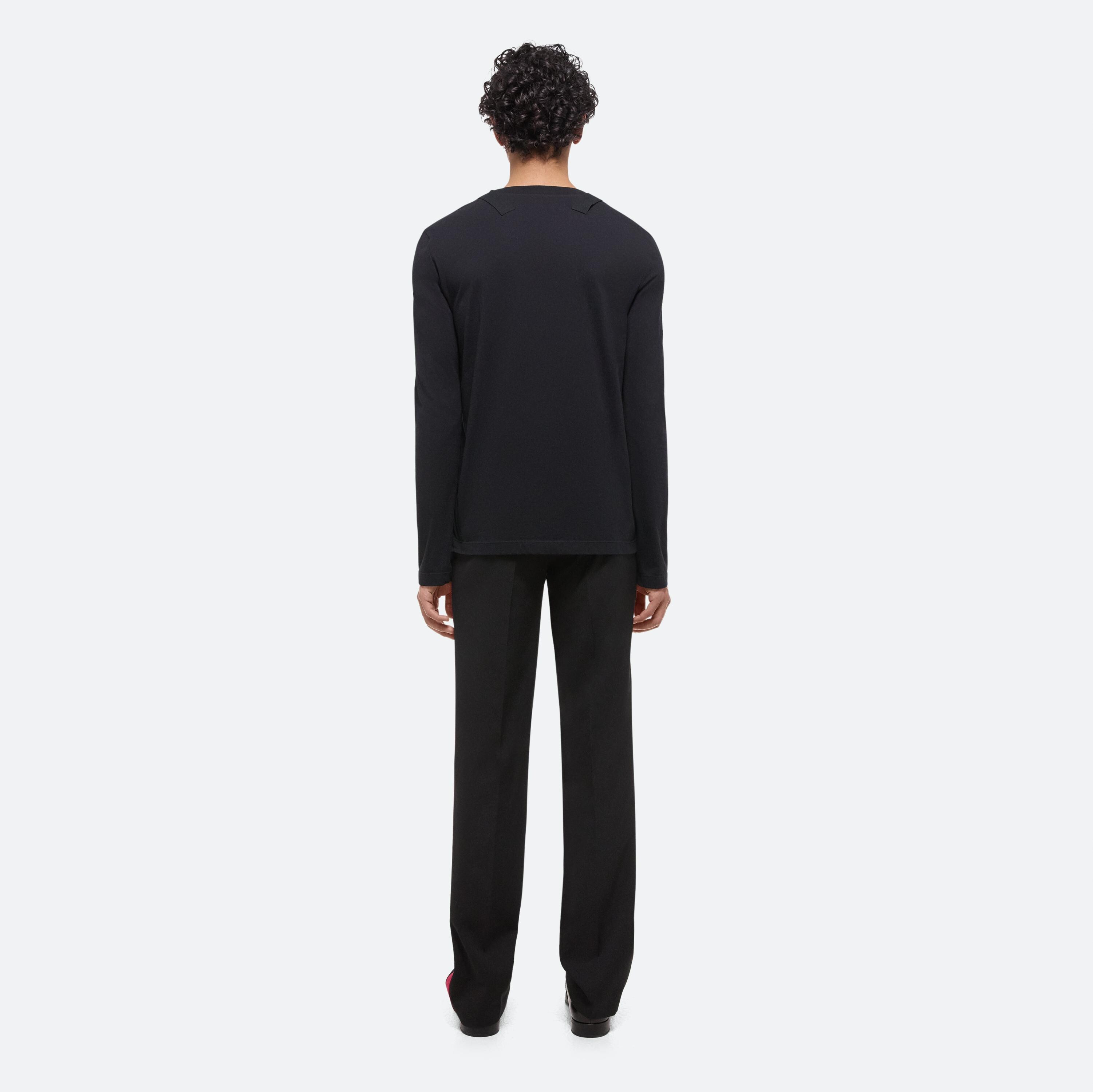 Lightweight crewneck tee with long sleeves and seatbelt tape details at shoulder.