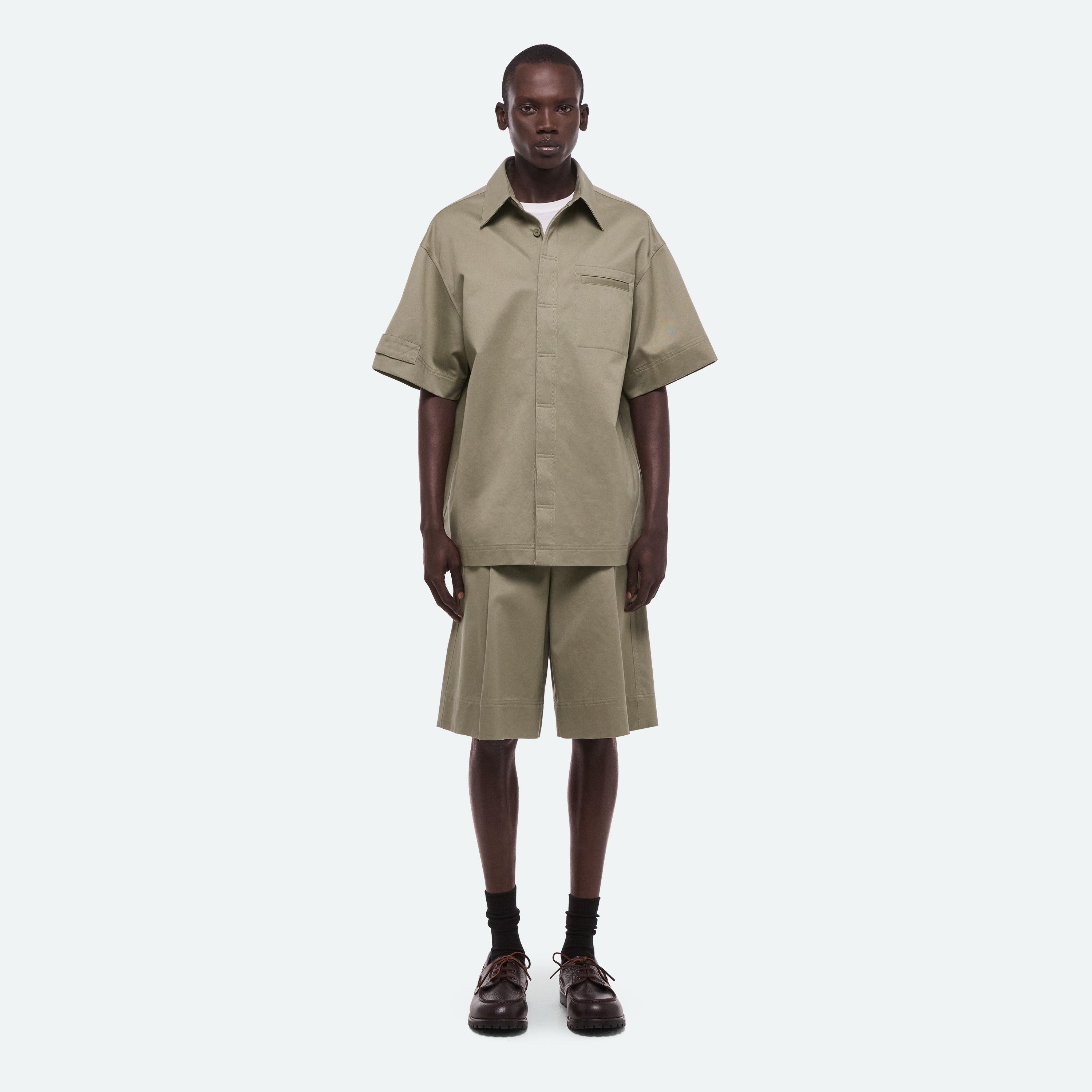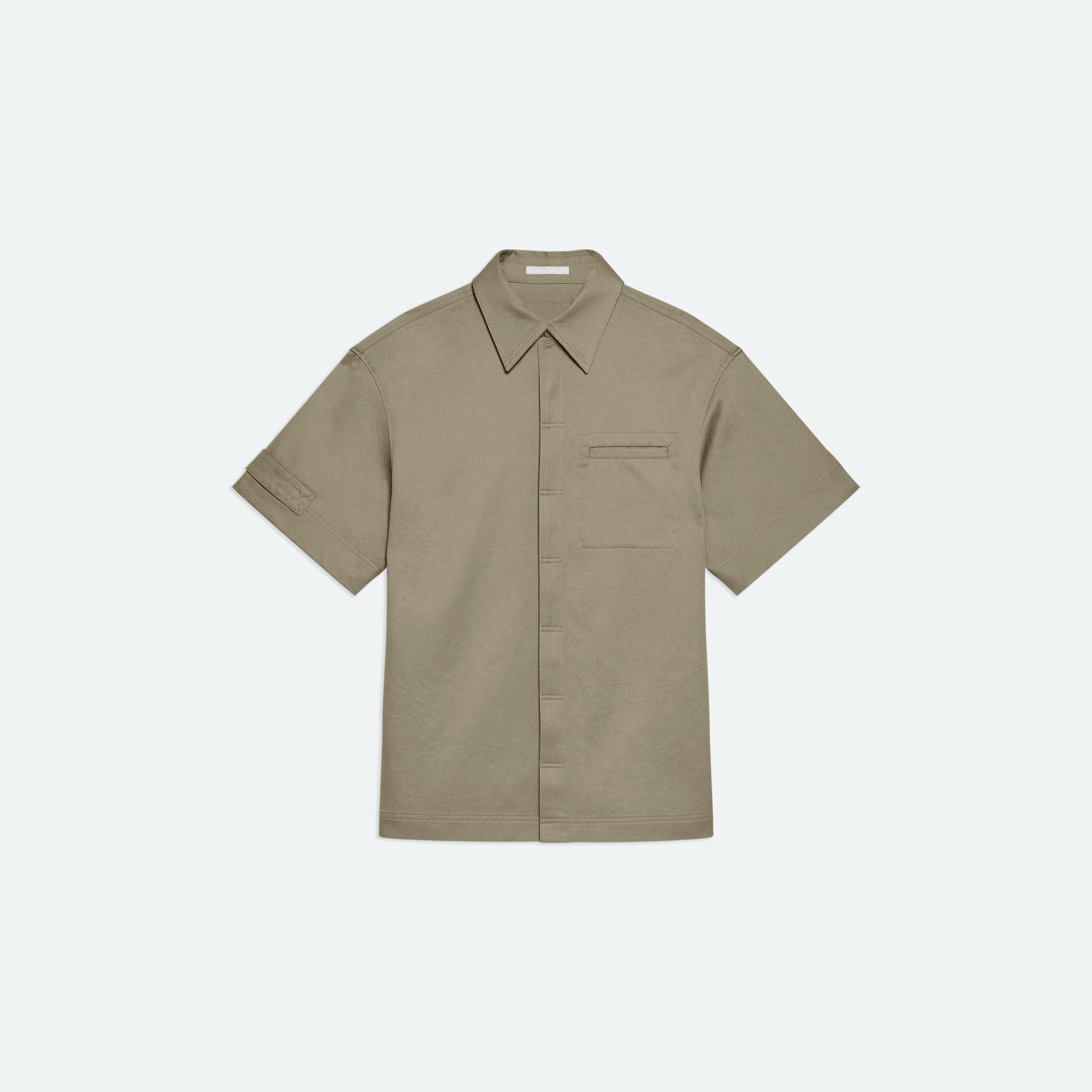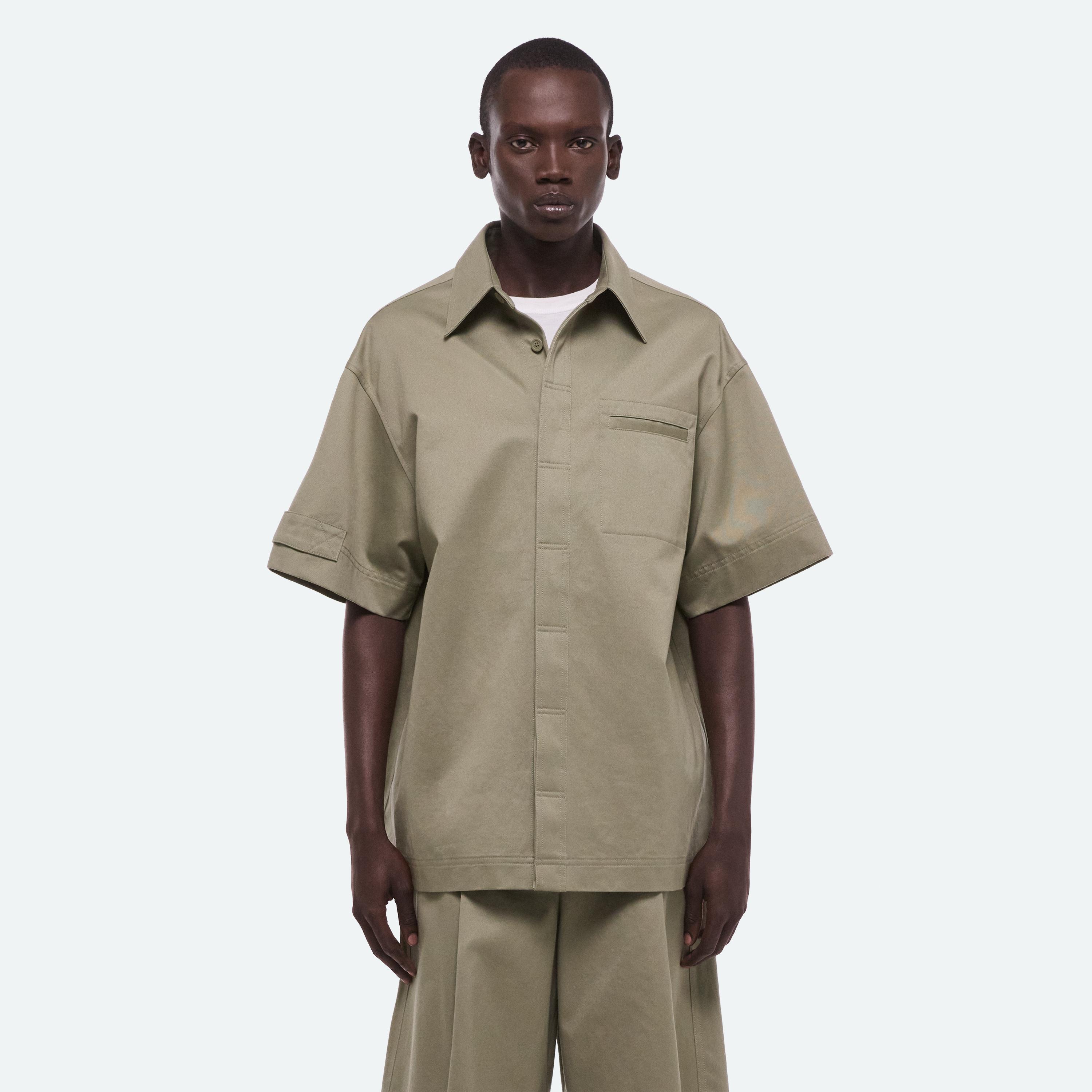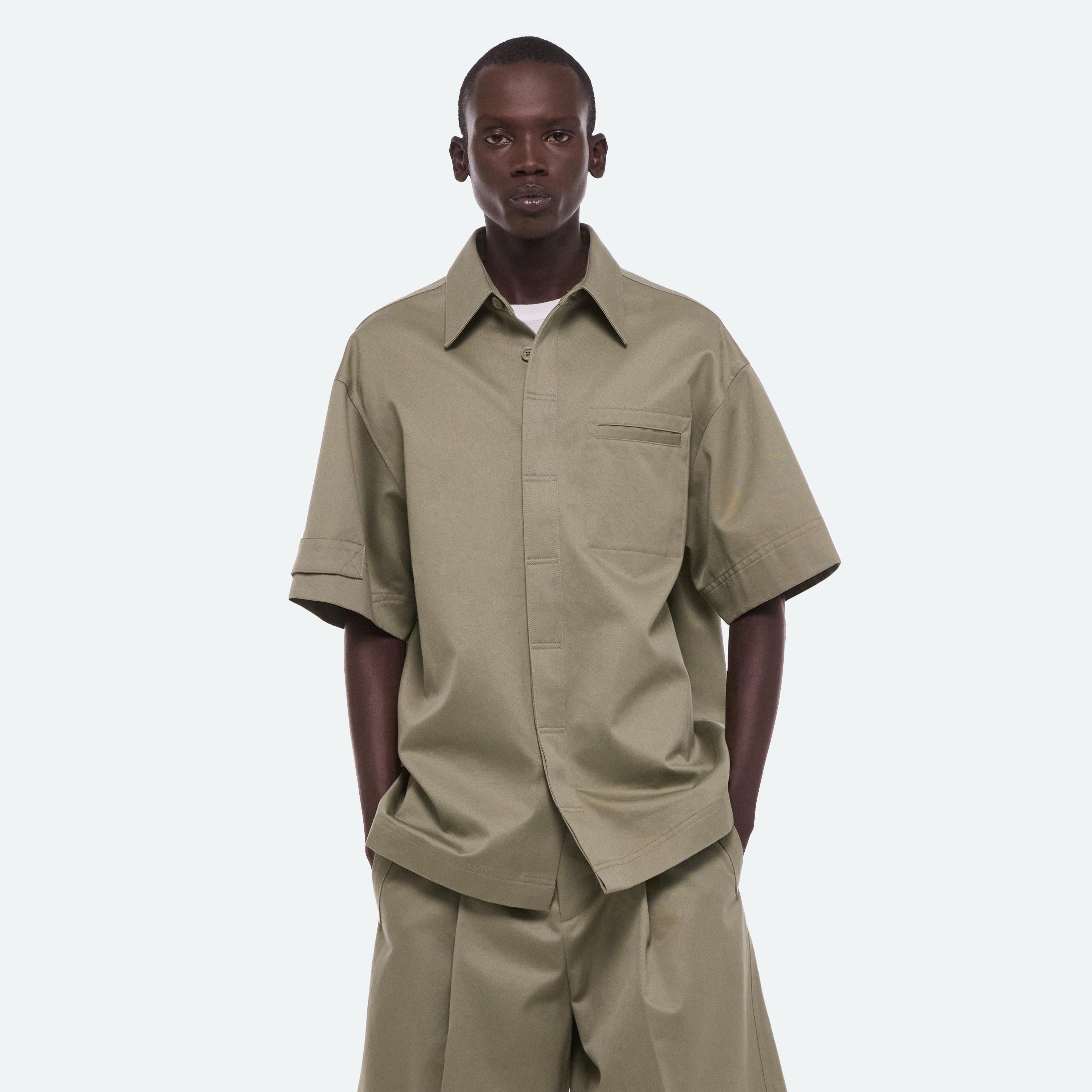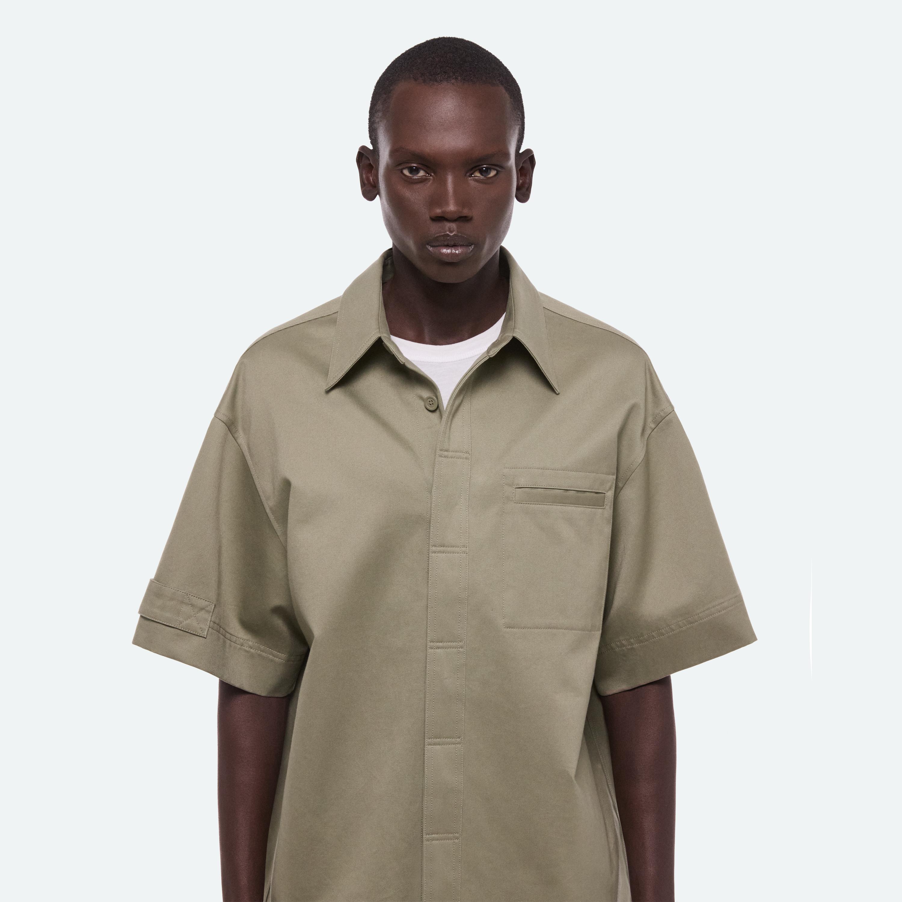 Short-sleeved shirt in cotton chino twill. A boxier cut and loop detail on the sleeve reference the uniform inspiration.