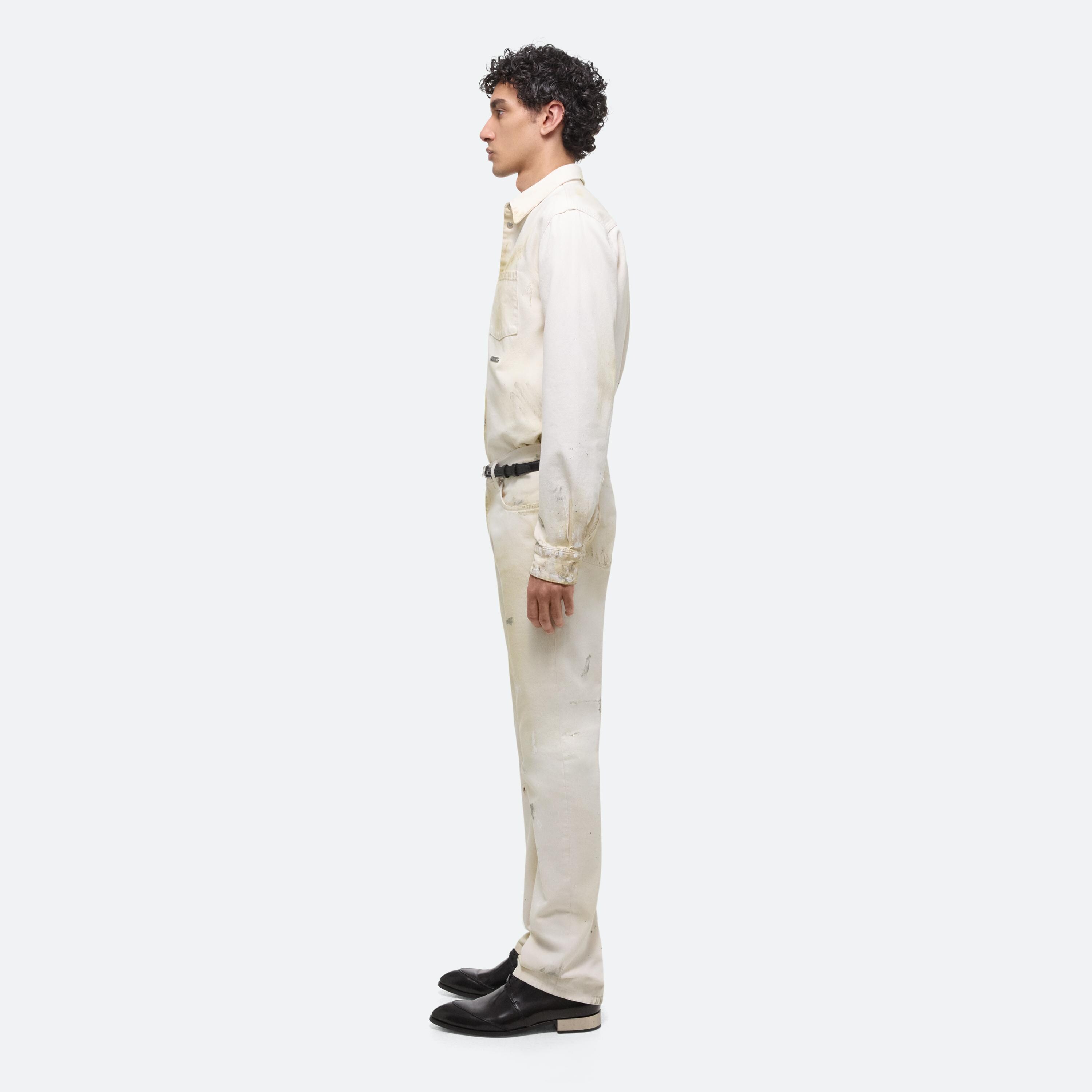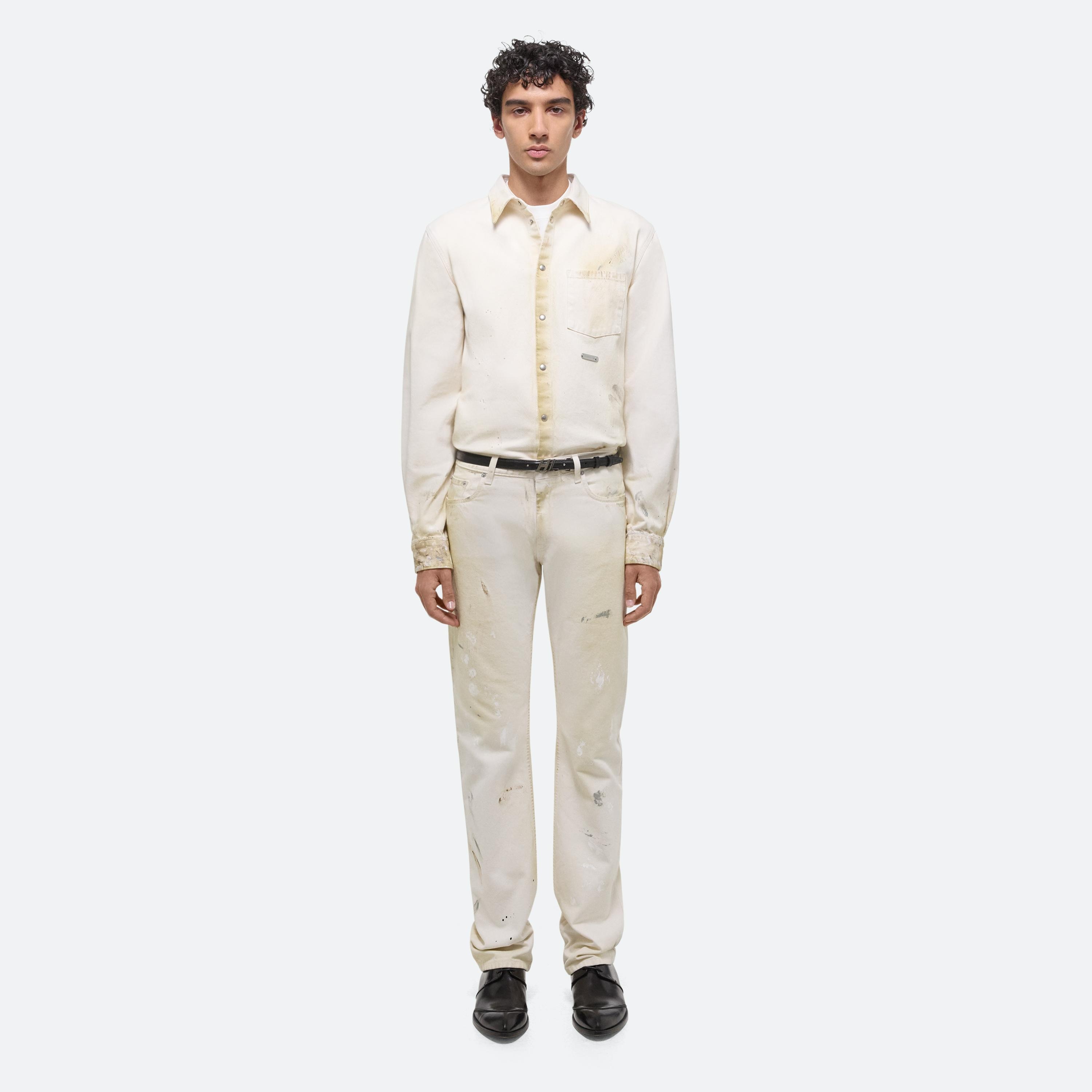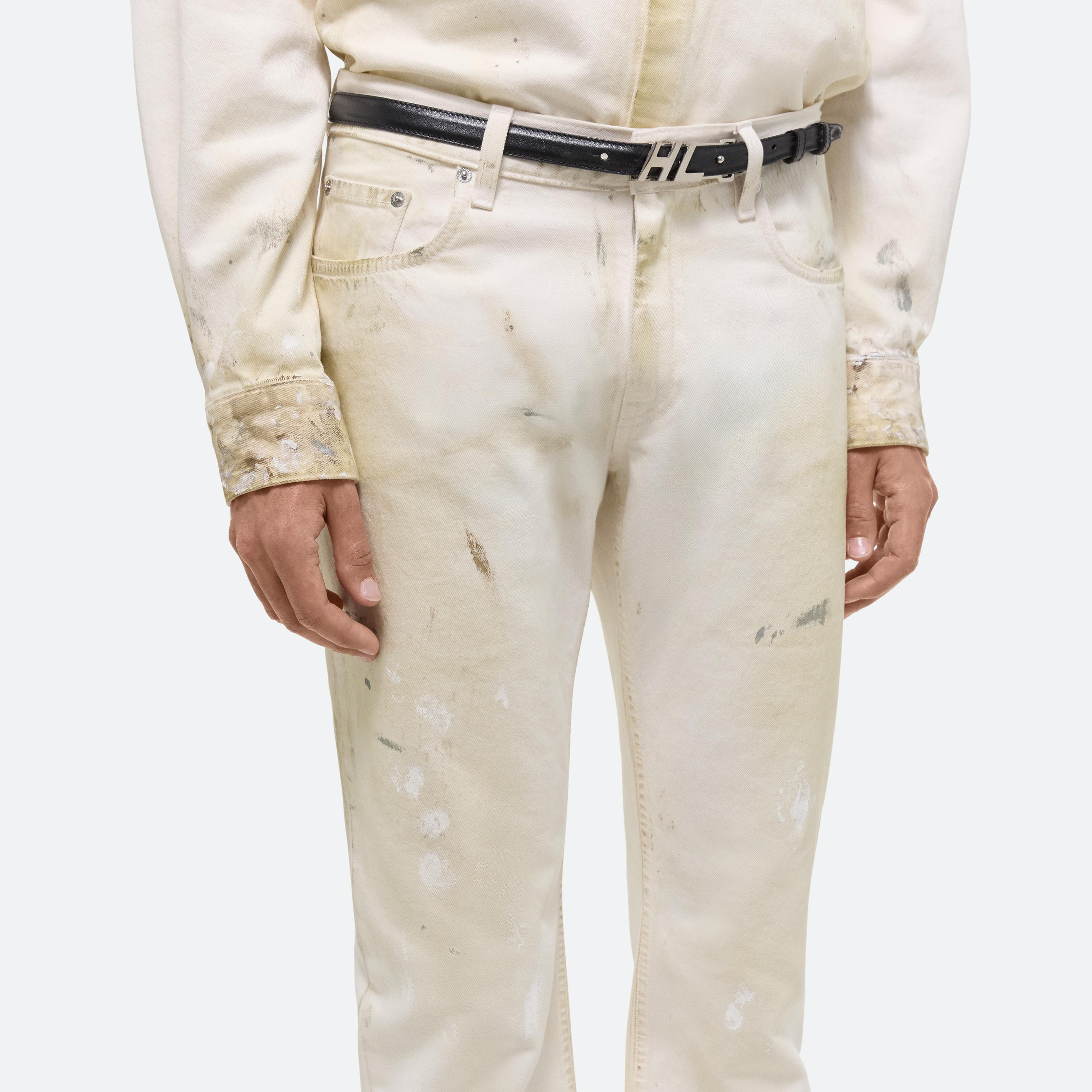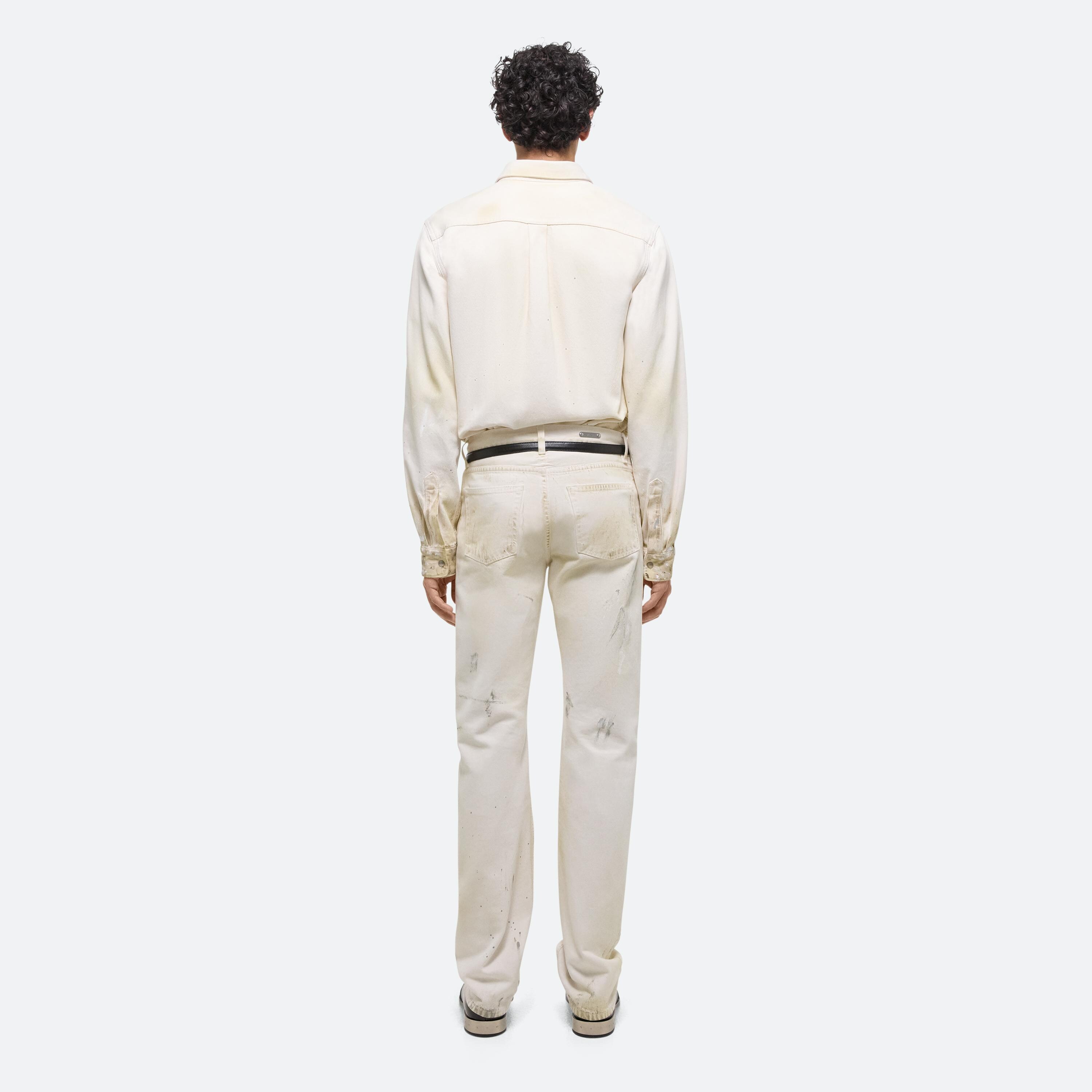 Low-rise five-pocket jeans in undyed denim. Cut with an easy, relaxed fit and a straight leg. Each pair is finished by hand with paint and oil staining for a one-of-a-kind patina.