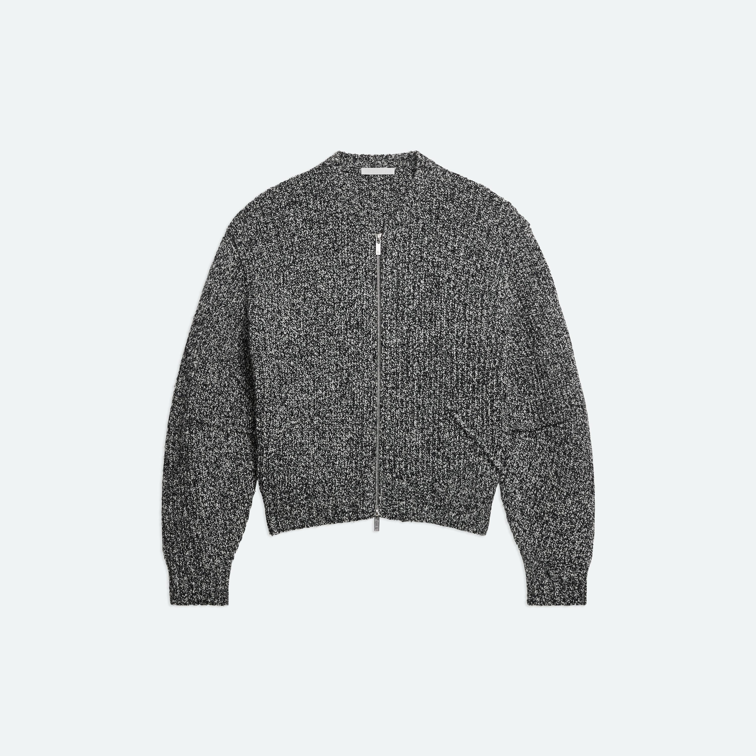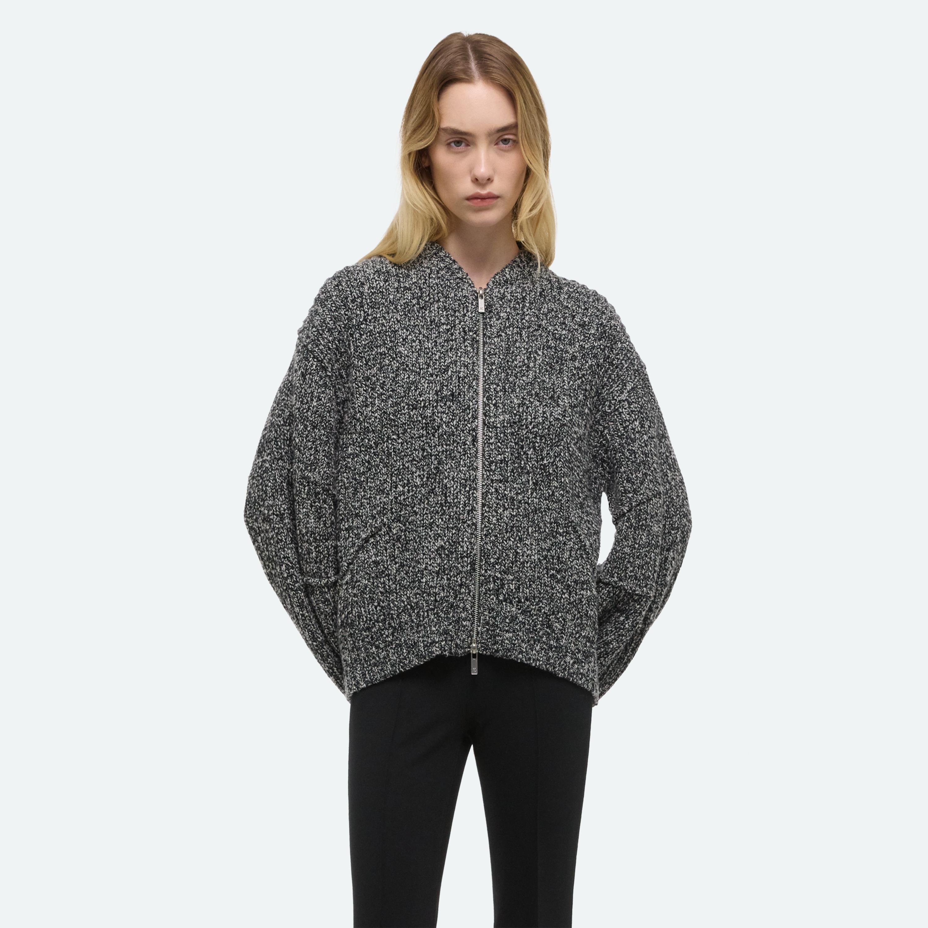 Zip-front sweater in a rib knit. Pin-tucked seams wrap around the body, adding a softly curved shape to the slouchy fit.