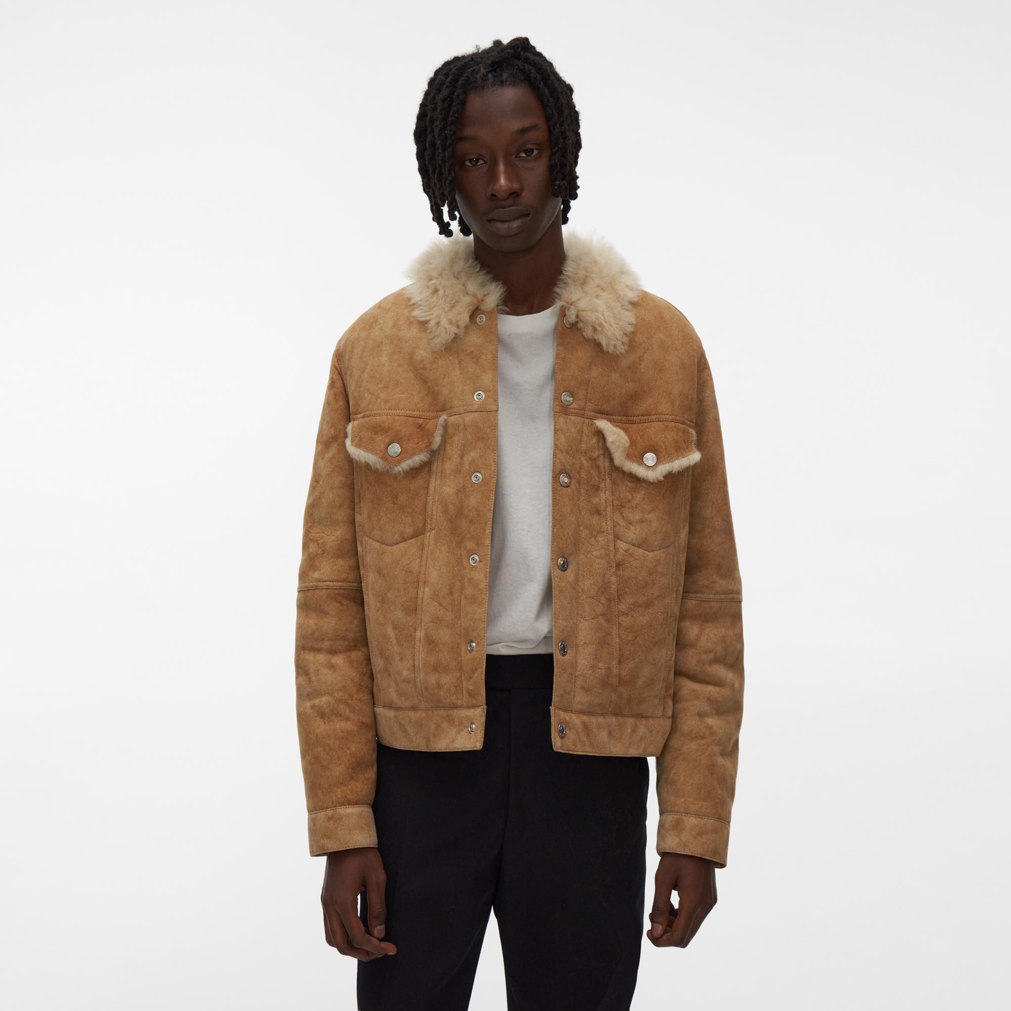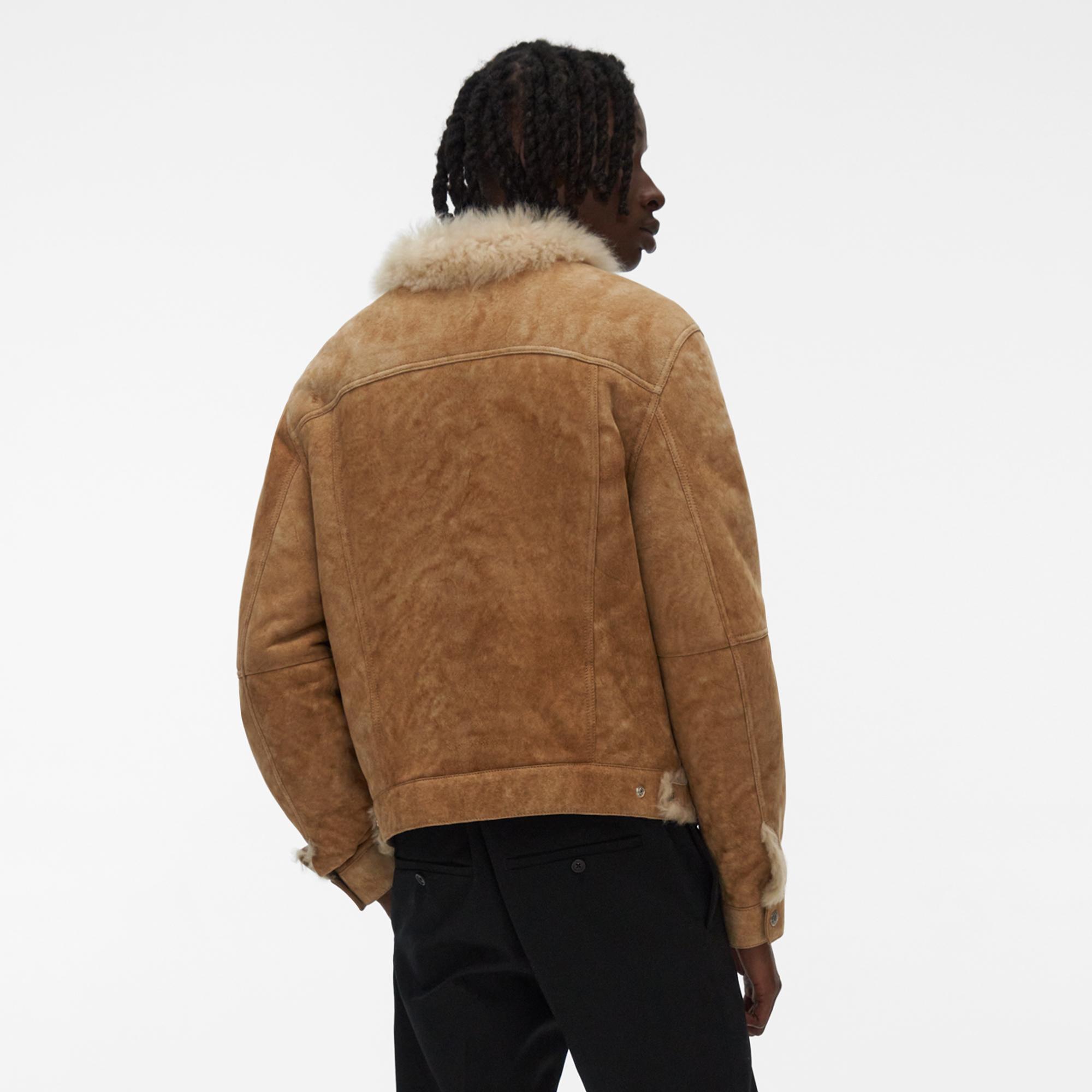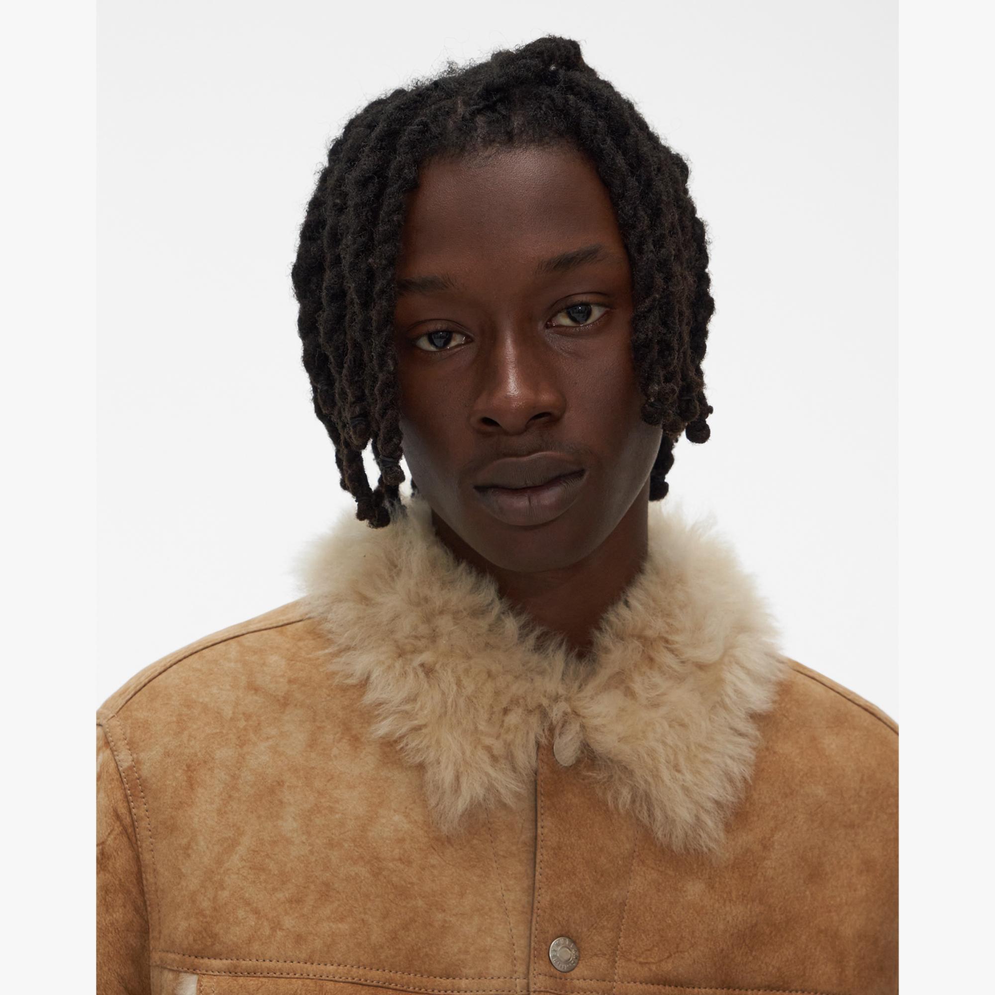 The Helmut Lang Masc Big Trucker Shearling Jacket is a classic trucker jacket made of soft shearling