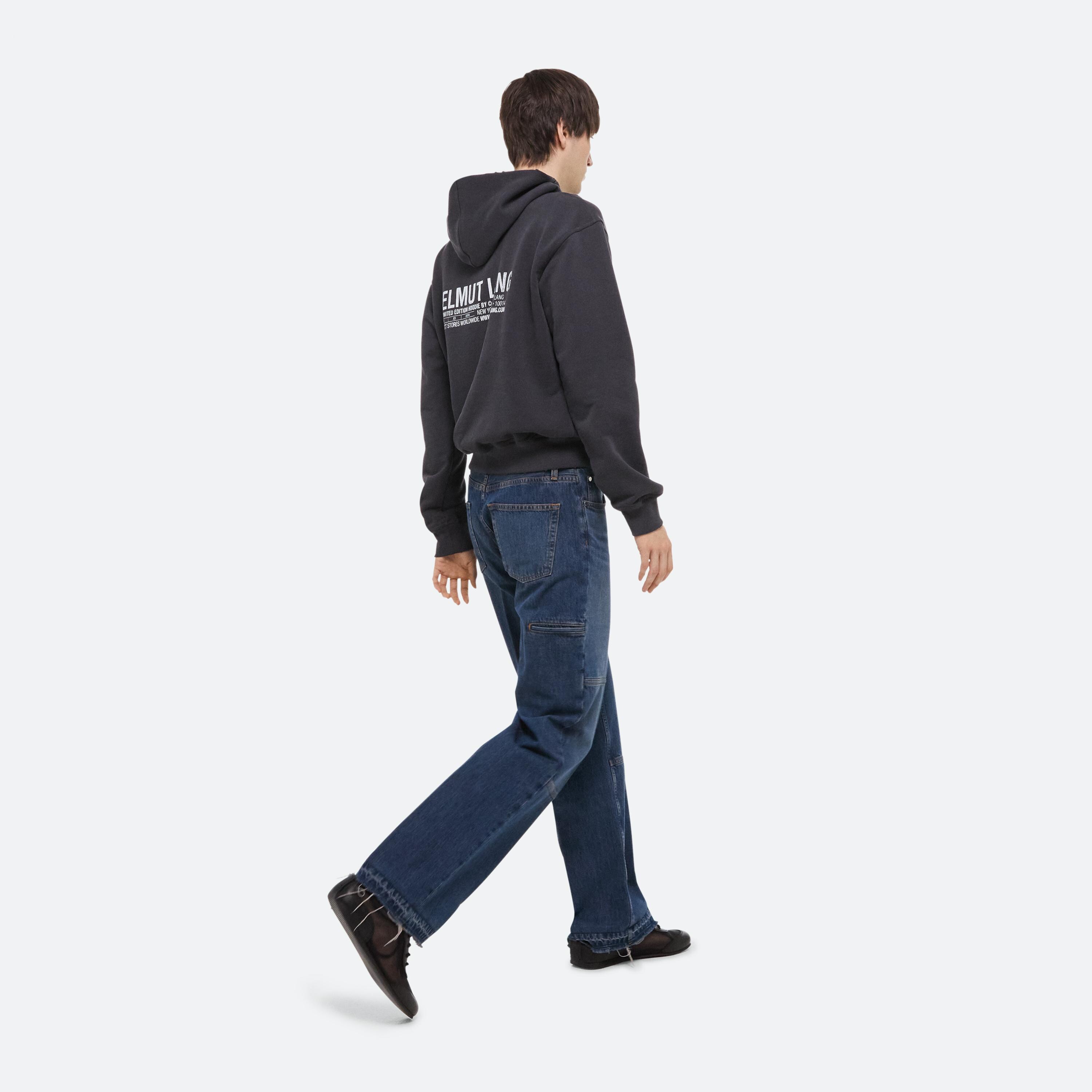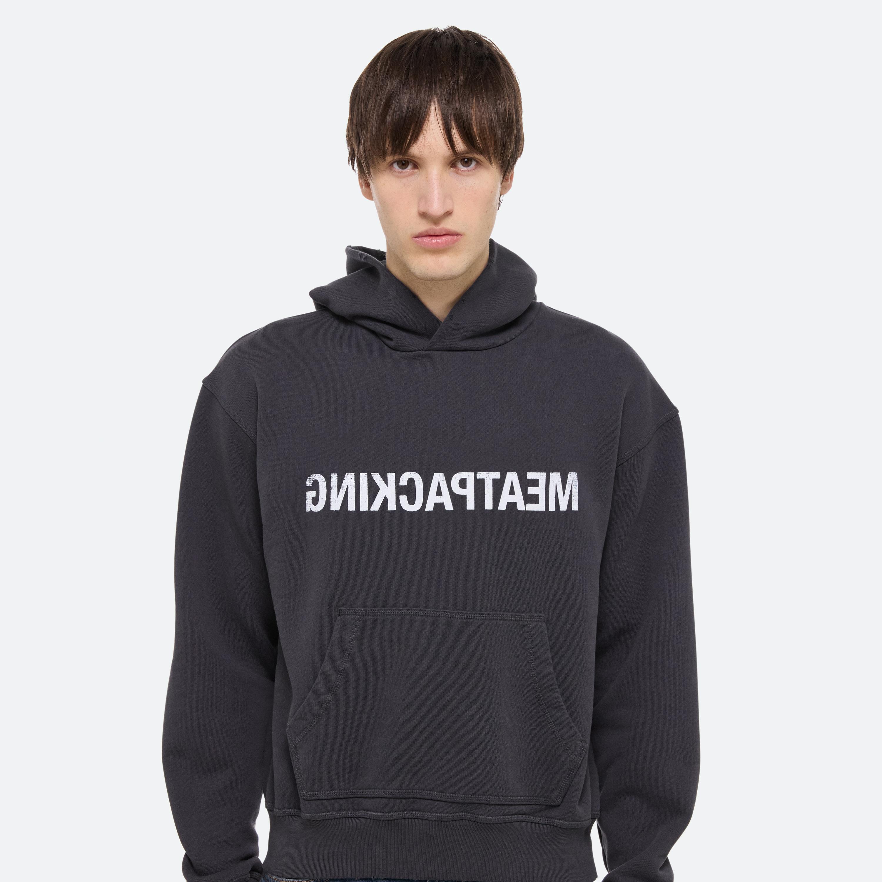 Hooded sweatshirt with reversed text. Gentle distressing creates the feeling of a long-time favorite. Matches the Meatpacking Shorts.