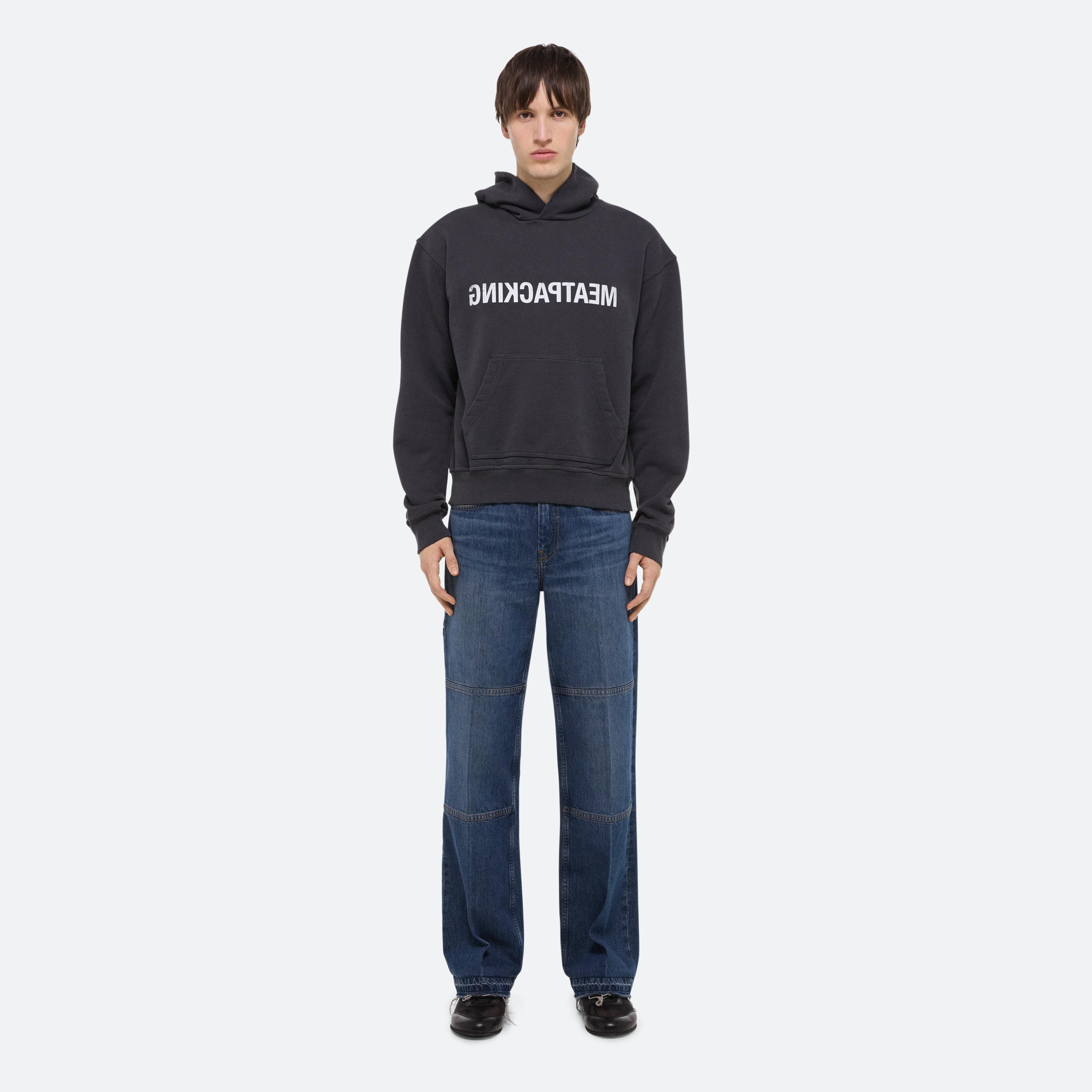 Hooded sweatshirt with reversed text. Gentle distressing creates the feeling of a long-time favorite. Matches the Meatpacking Shorts.
