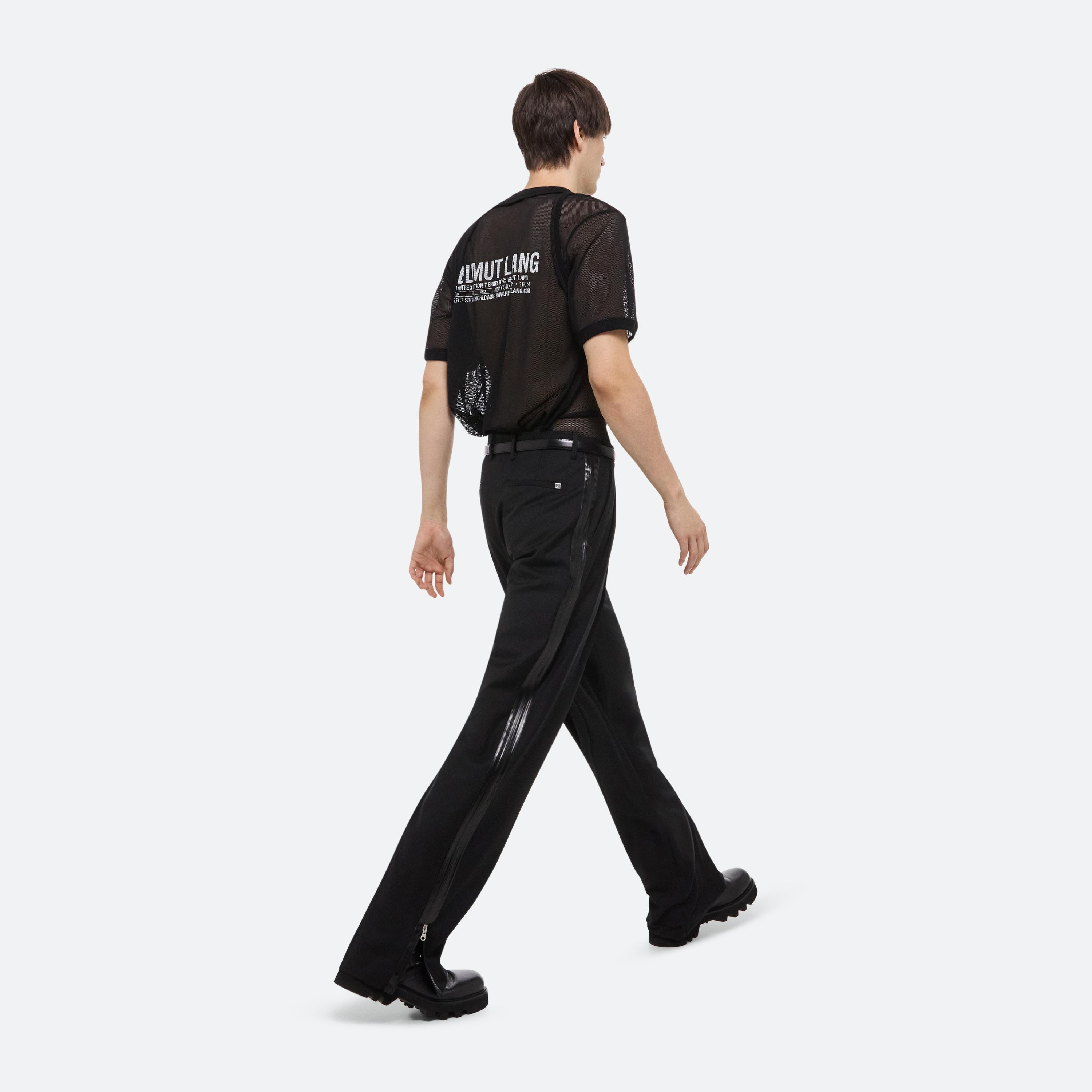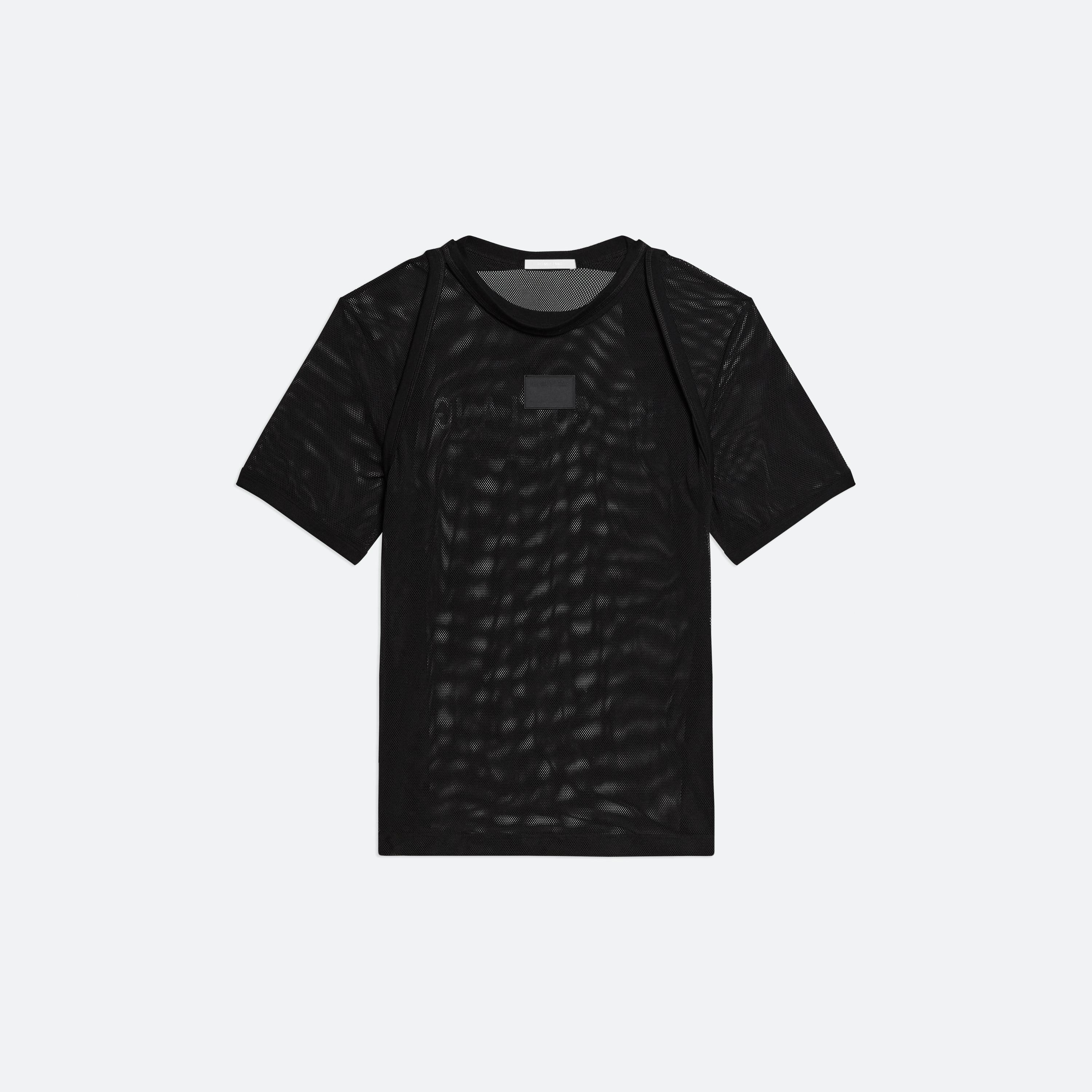 Sheer mesh tee with ribbed harness detail.