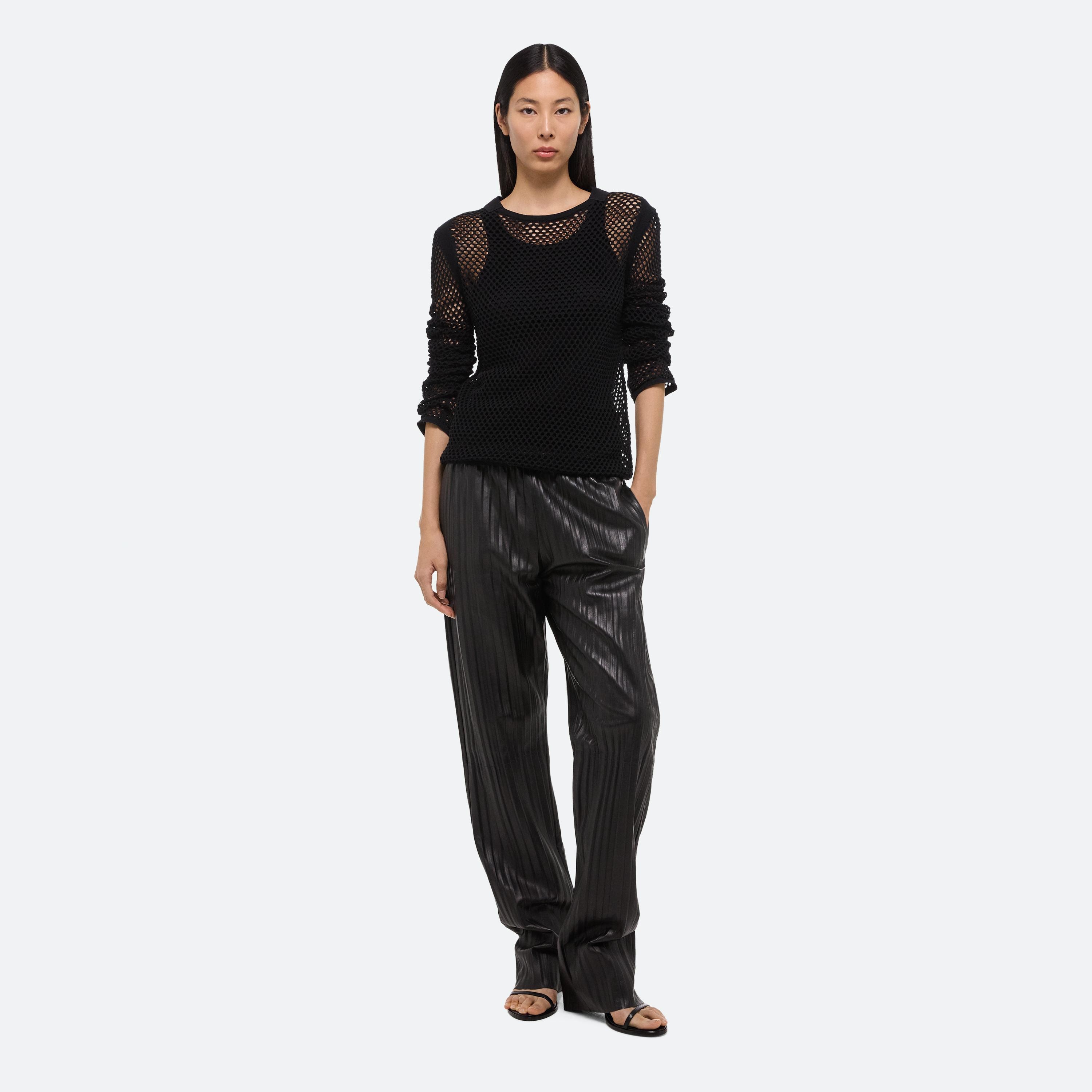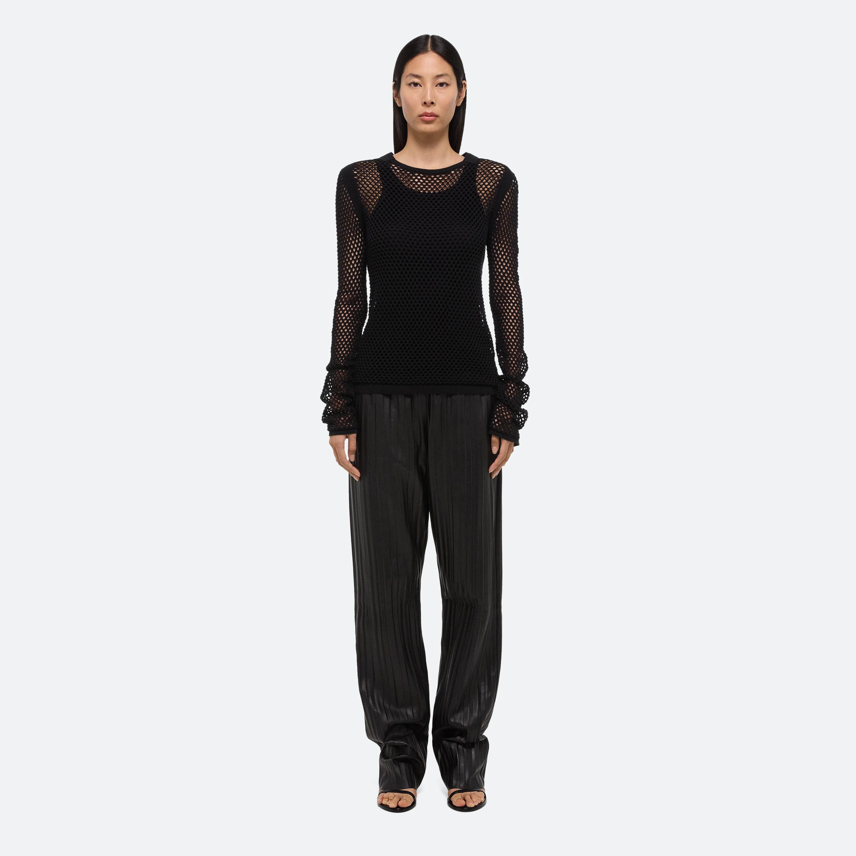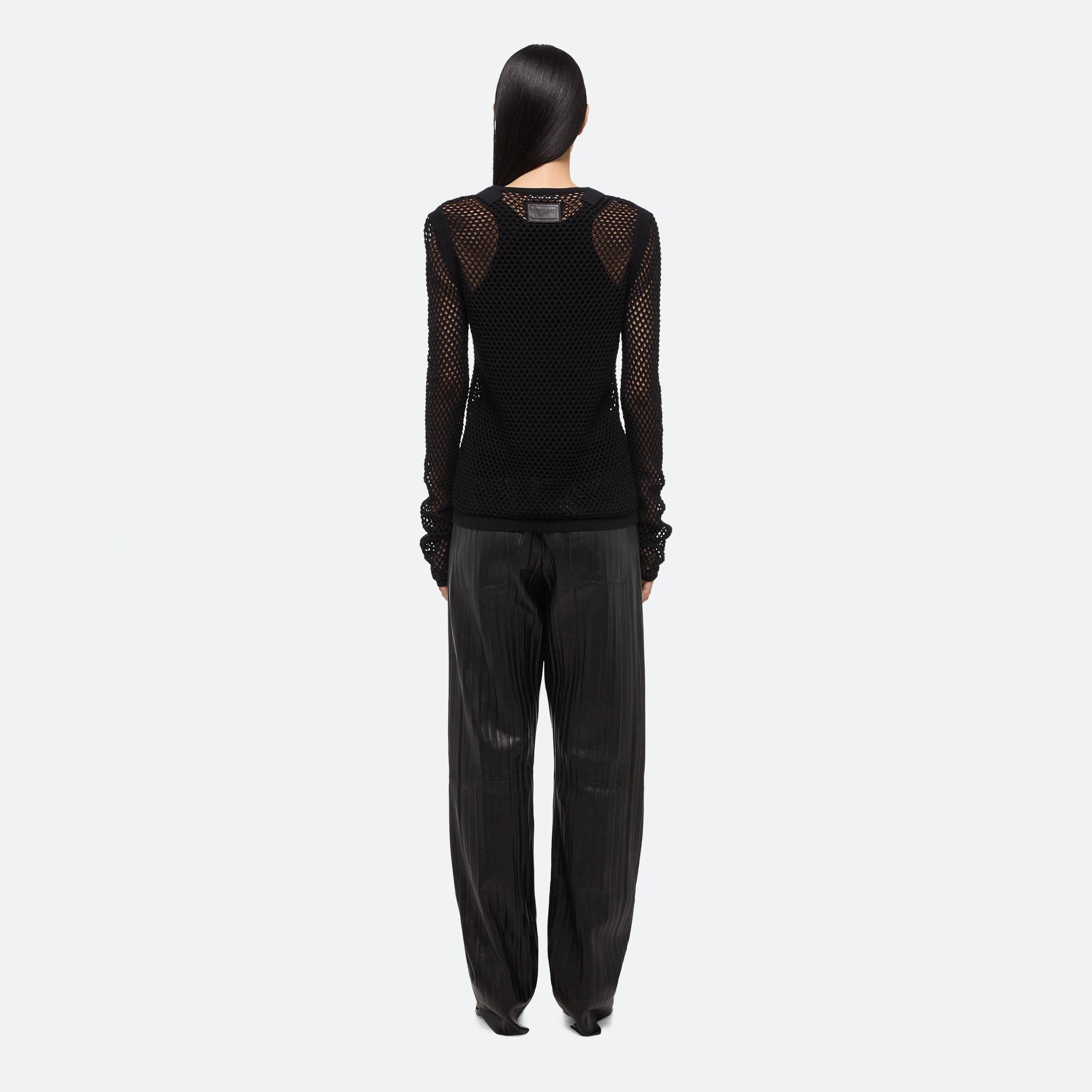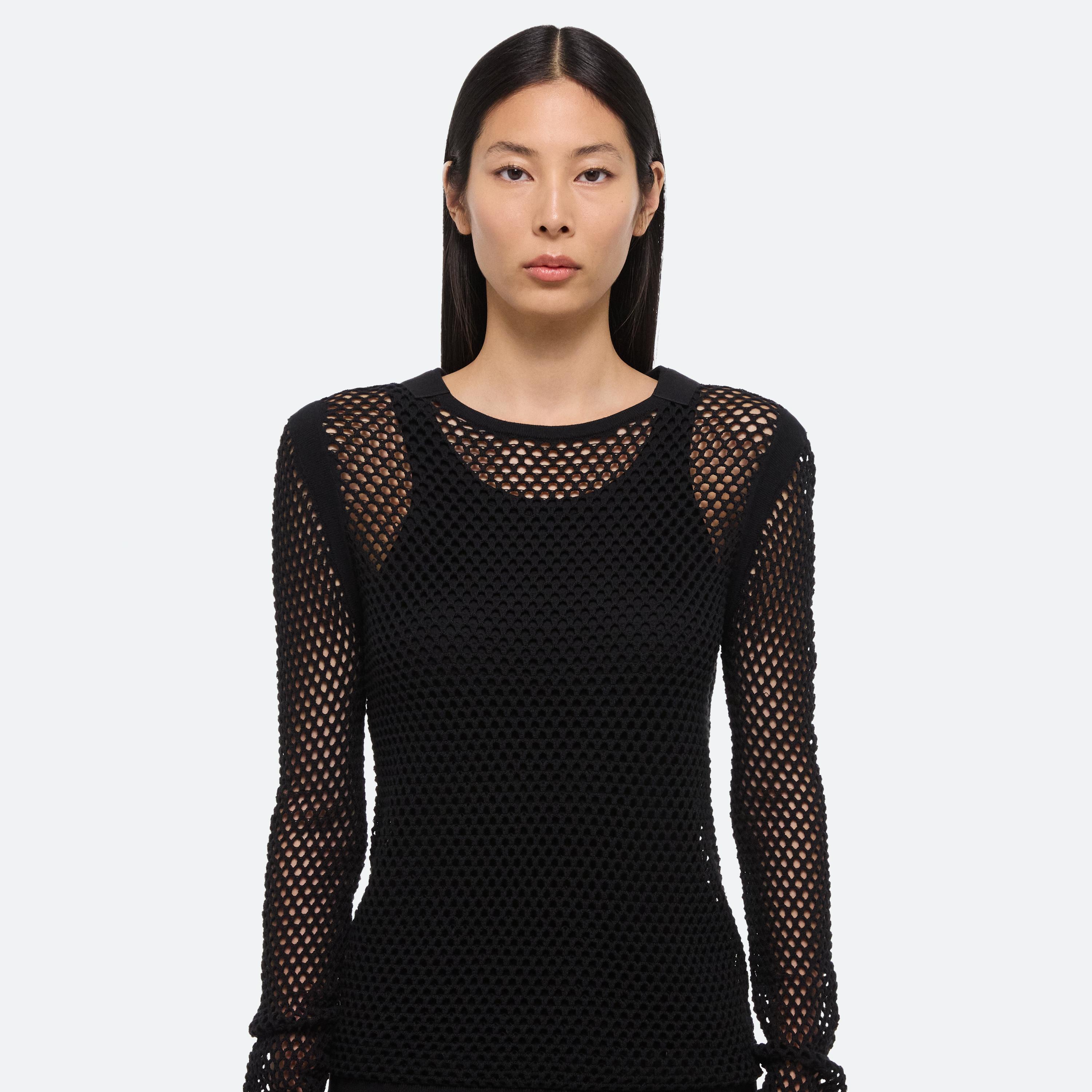 Long-sleeved cotton top in an open crocheted mesh. Finished with utility details and our signature seatbelt tape.