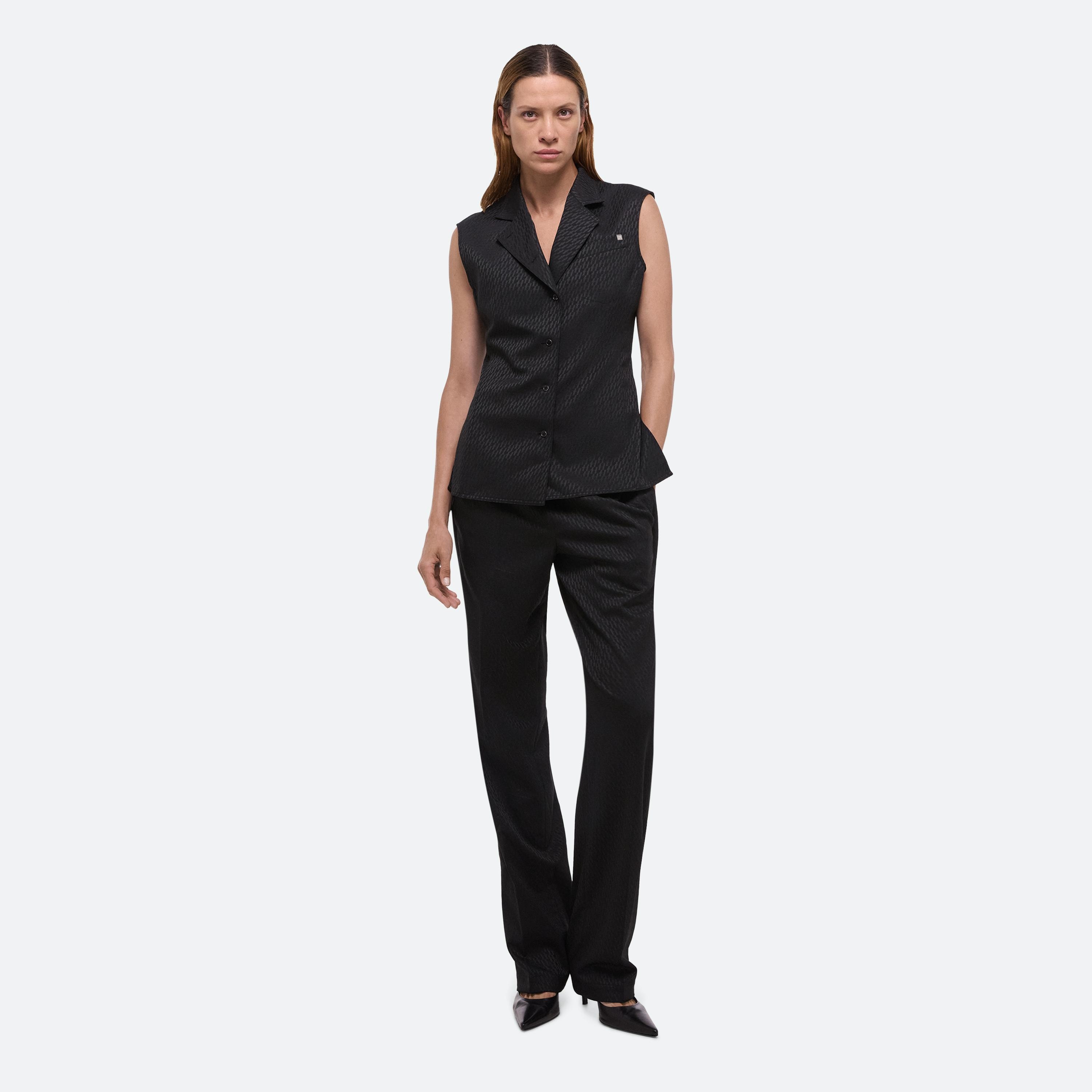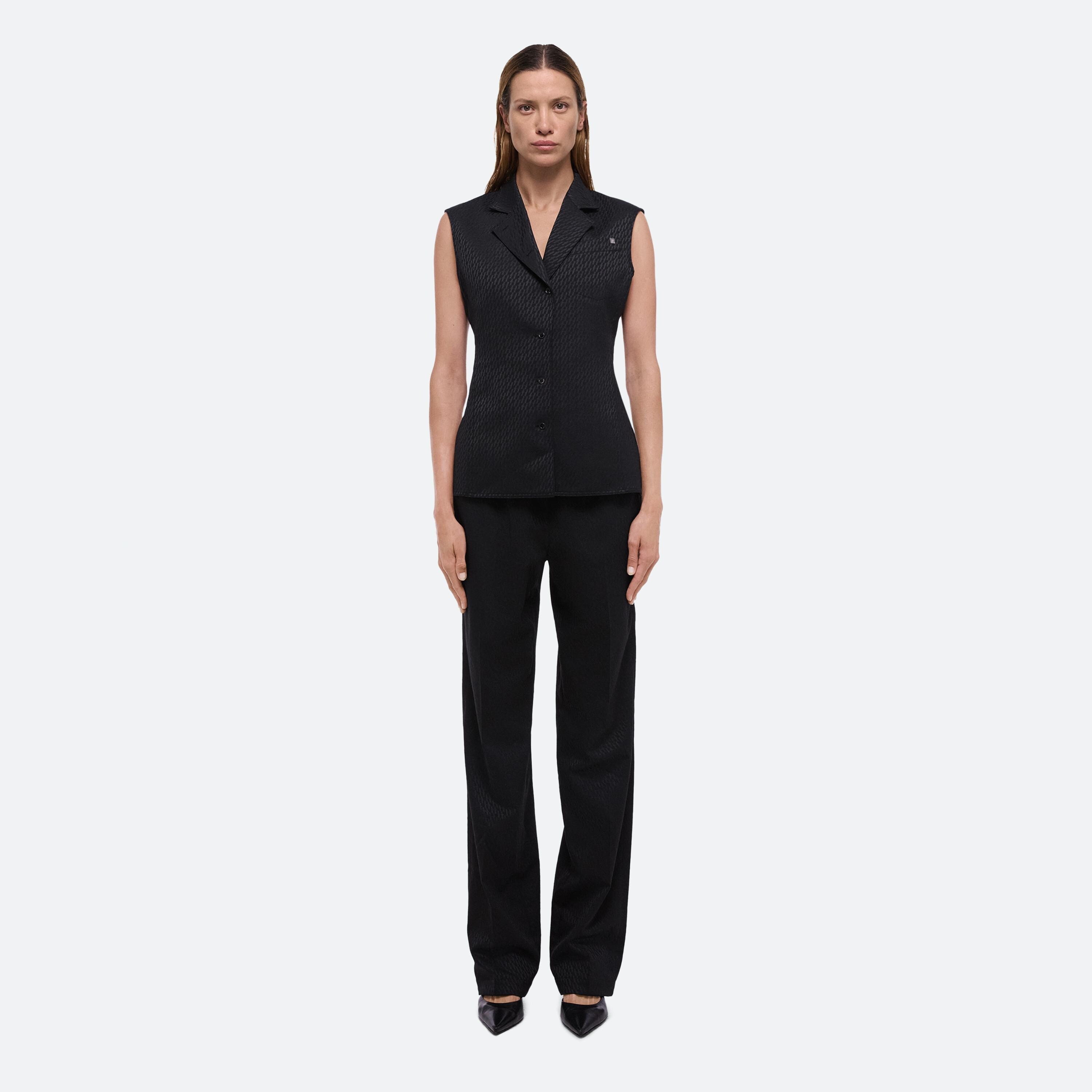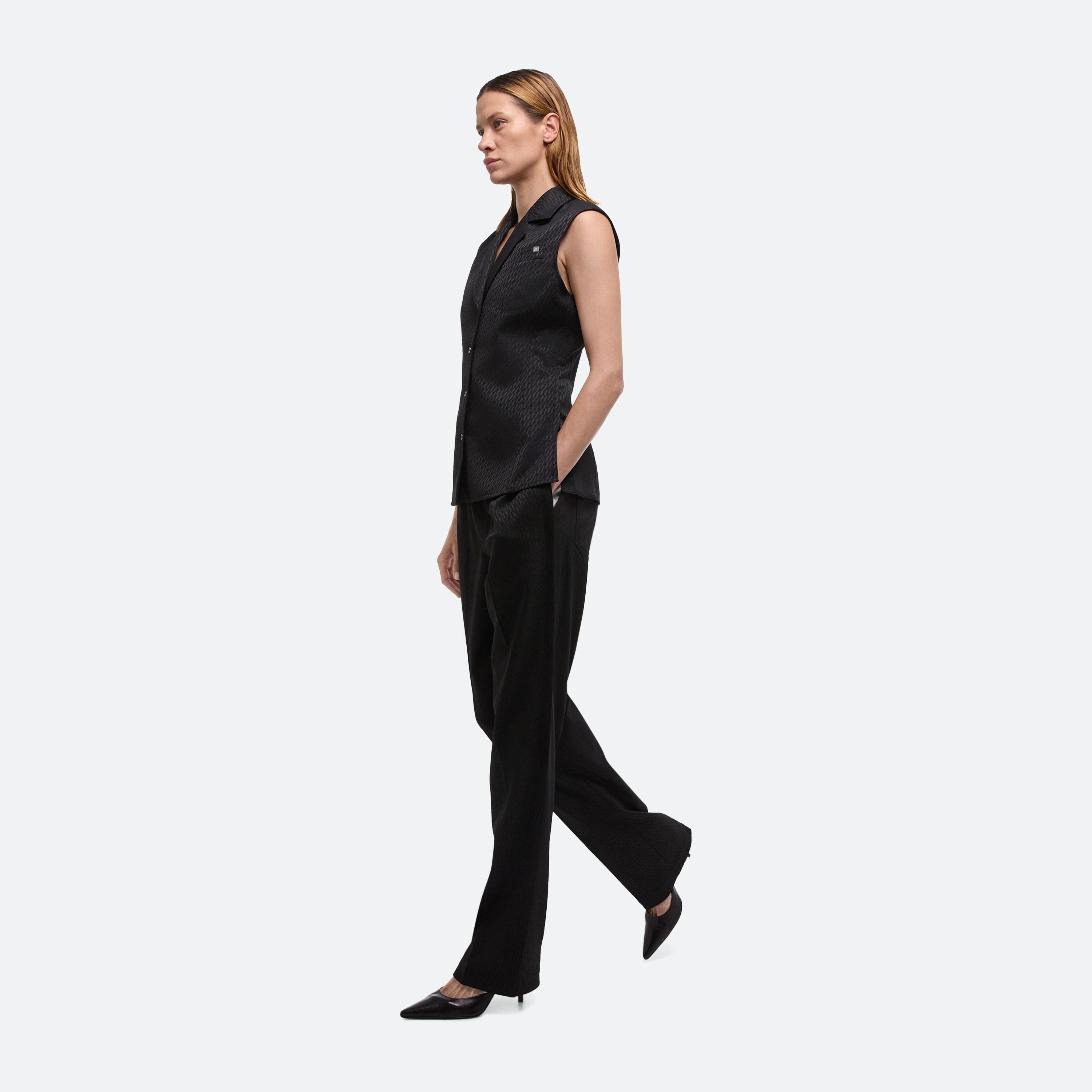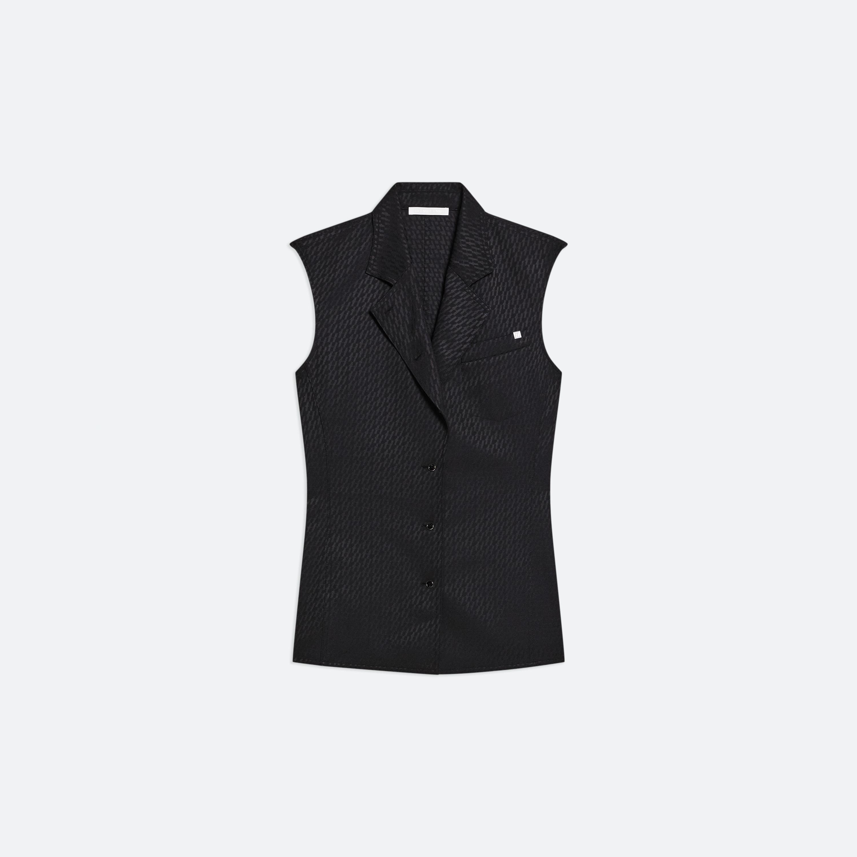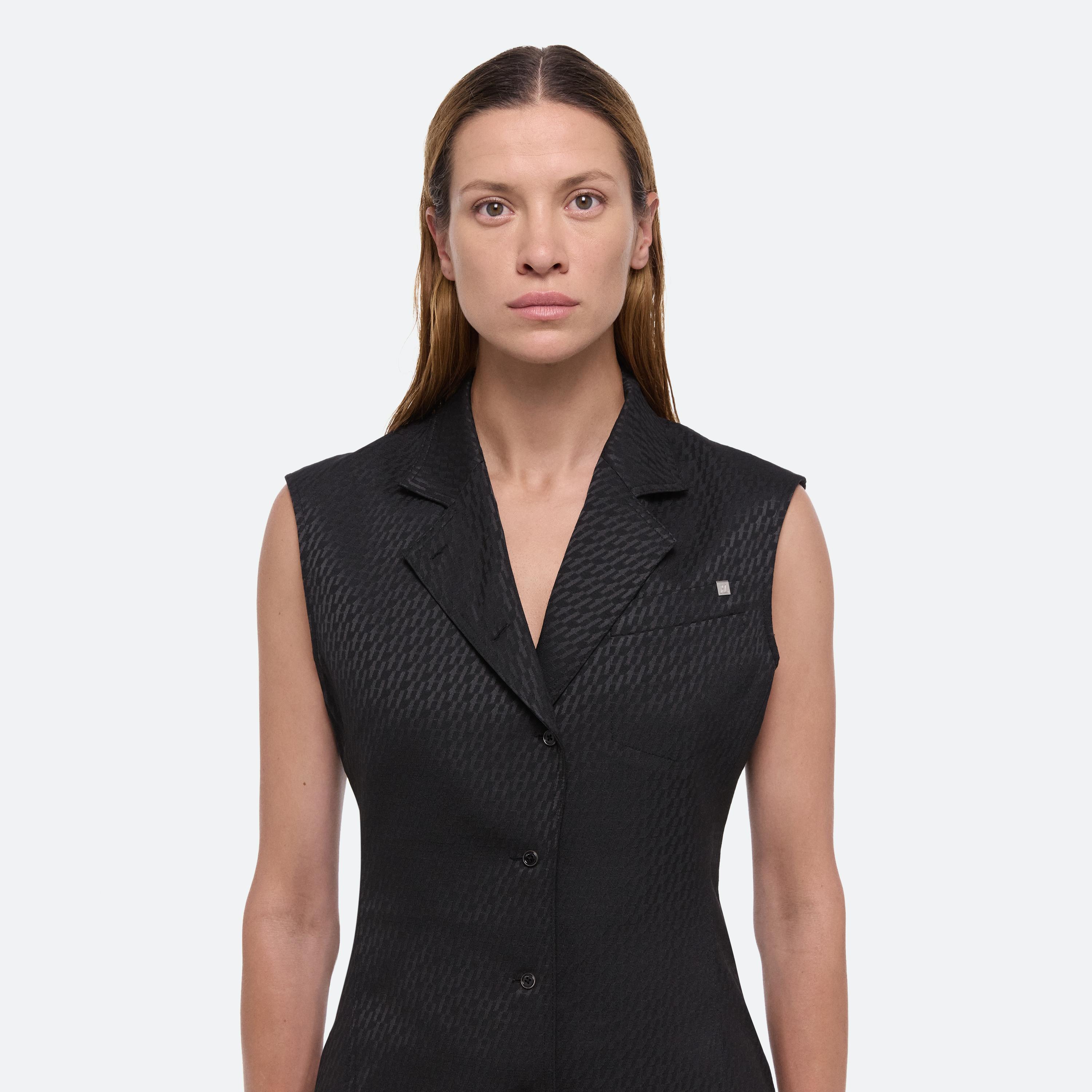 Tailored vest in satin logo jacquard, featuring classic blazer details like notched lapels and a front welt pocket. Matches the Jacquard Car Trouser.