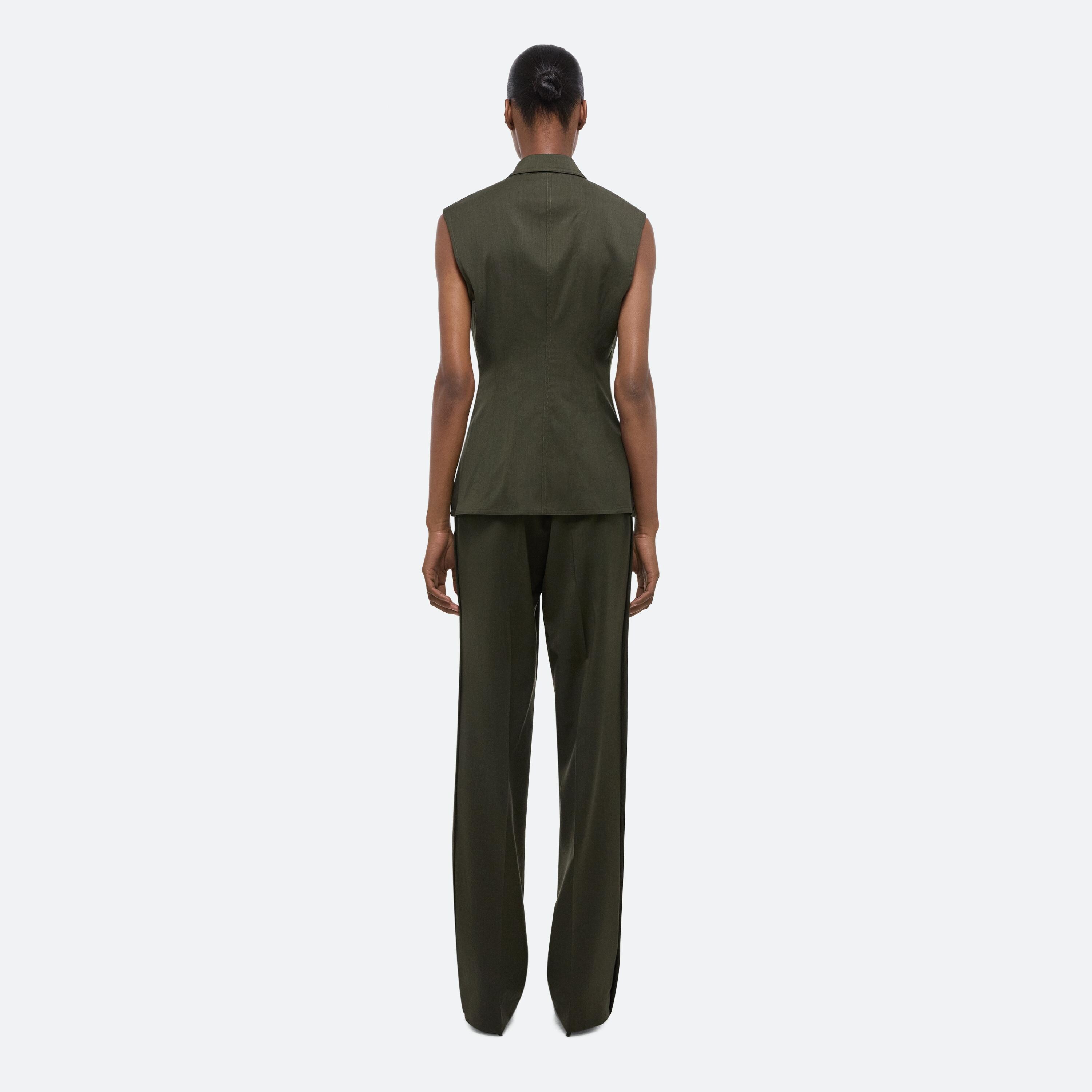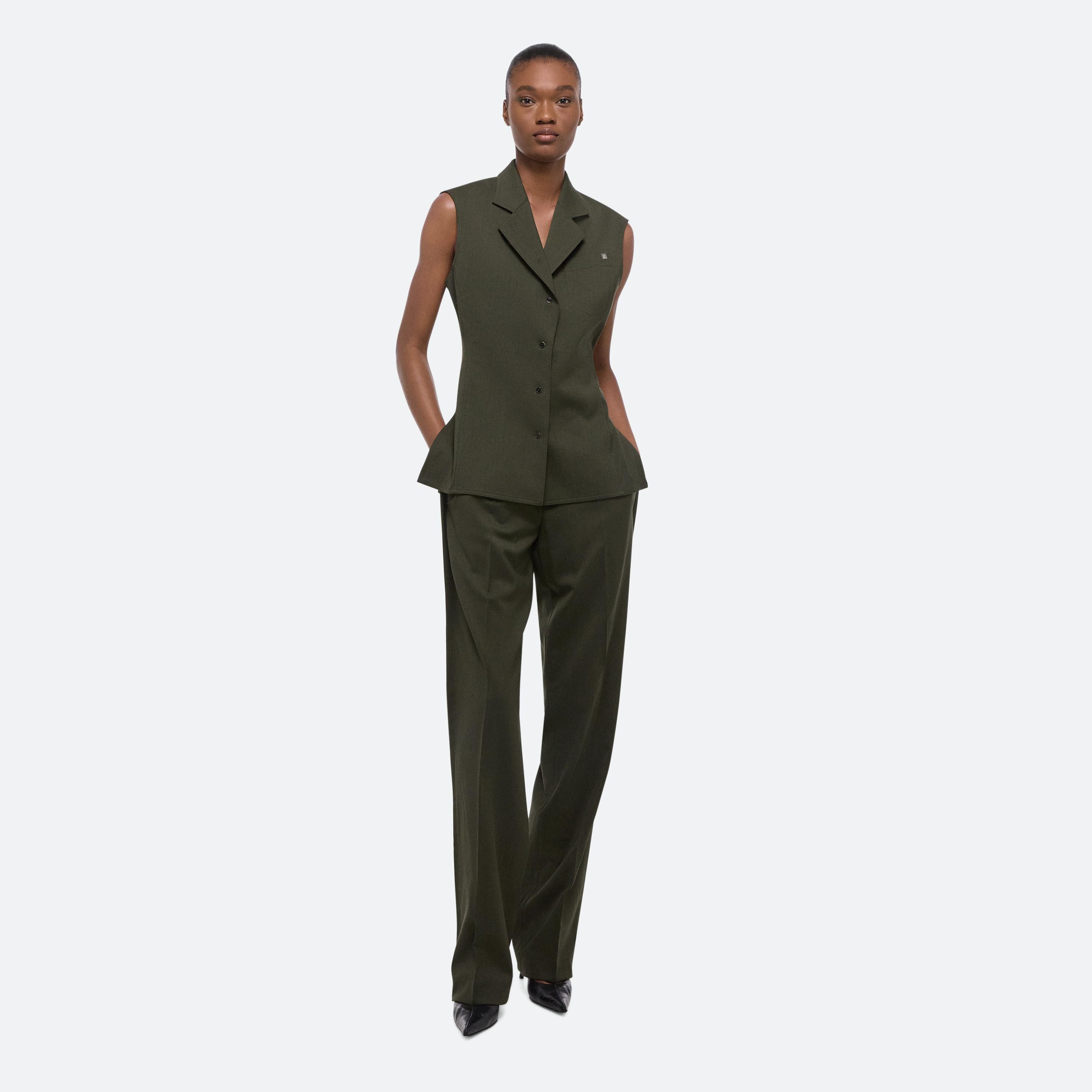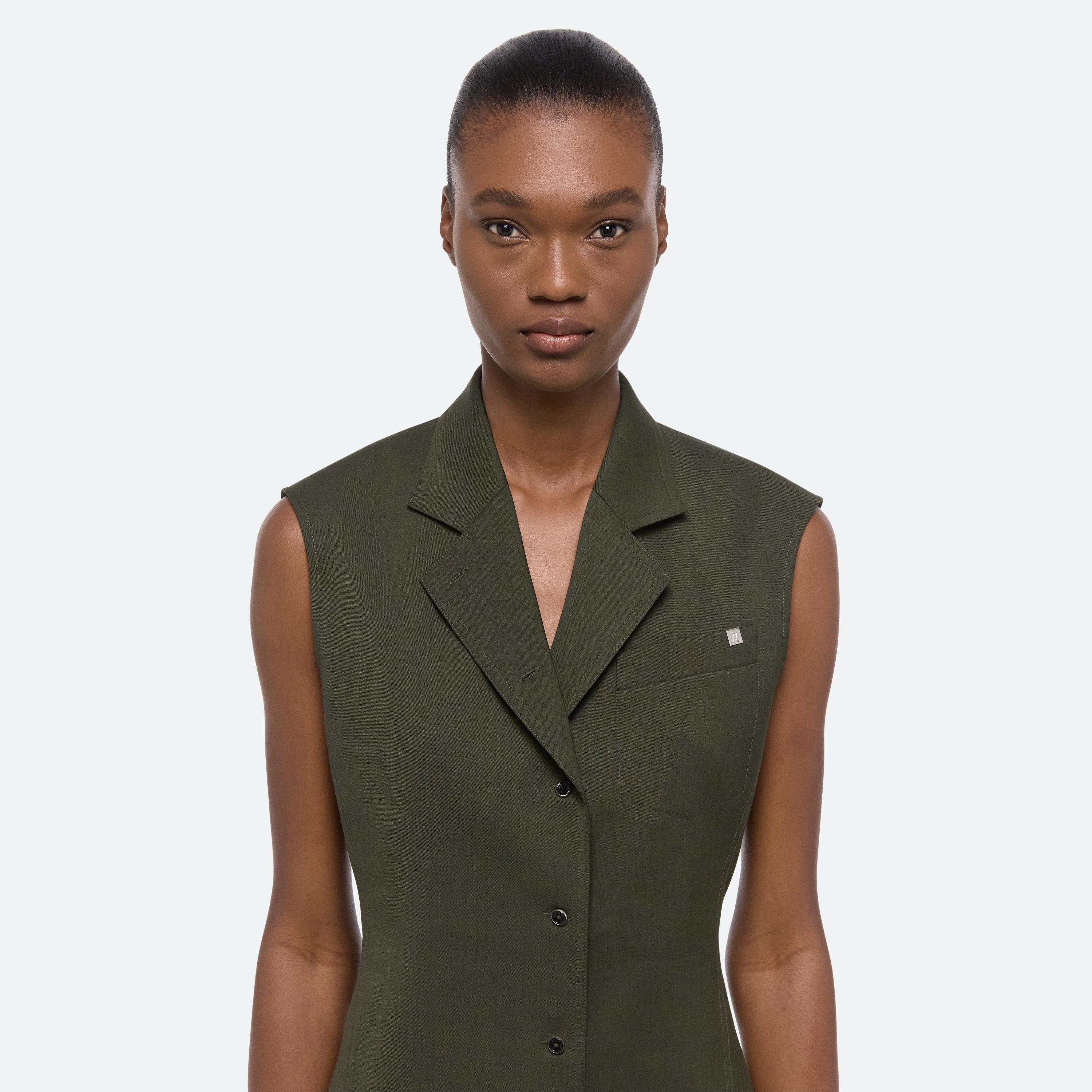 Tailored top in virgin Italian wool suiting, featuring classic blazer details like notched lapels and a front welt pocket. Matches the Wool Car Trouser.
