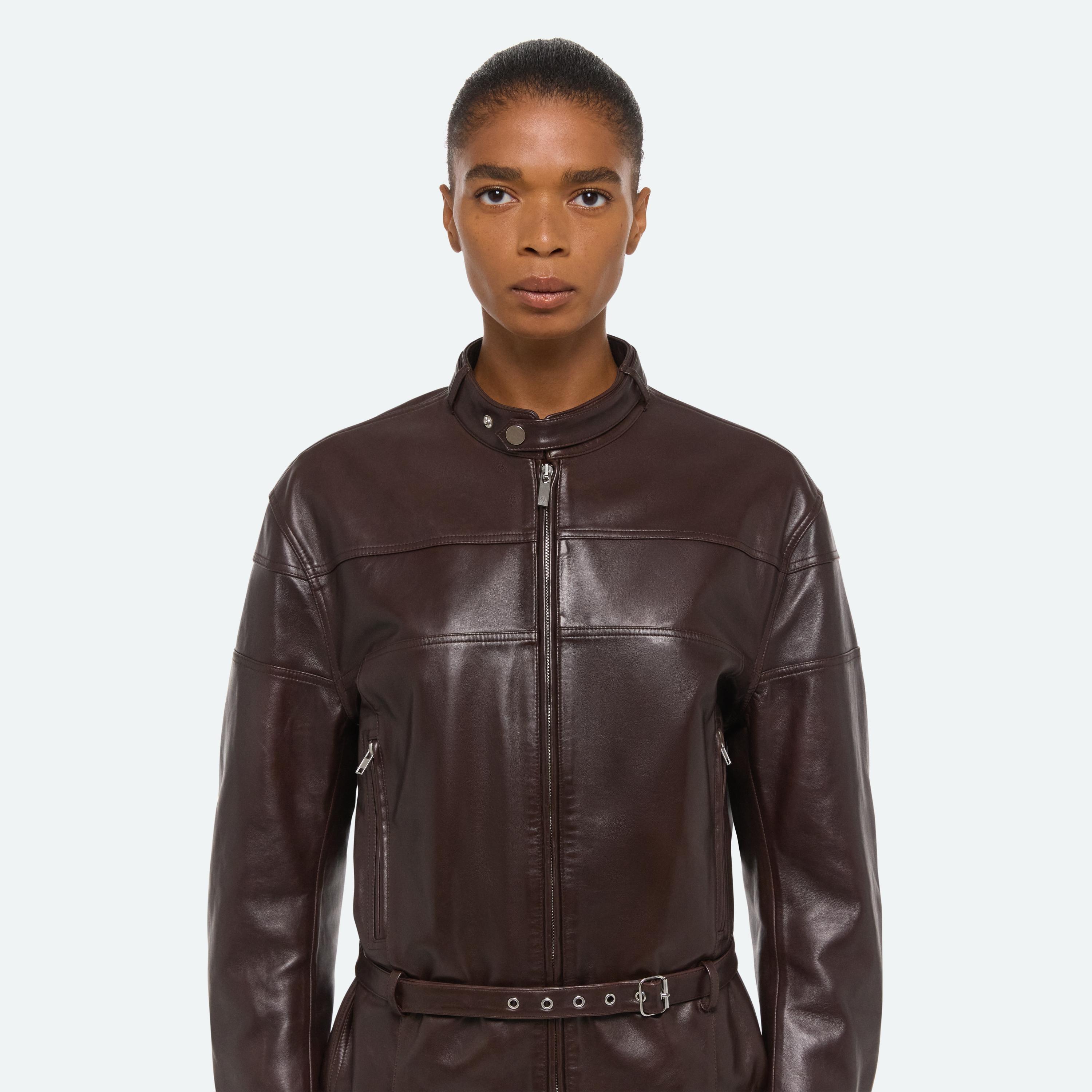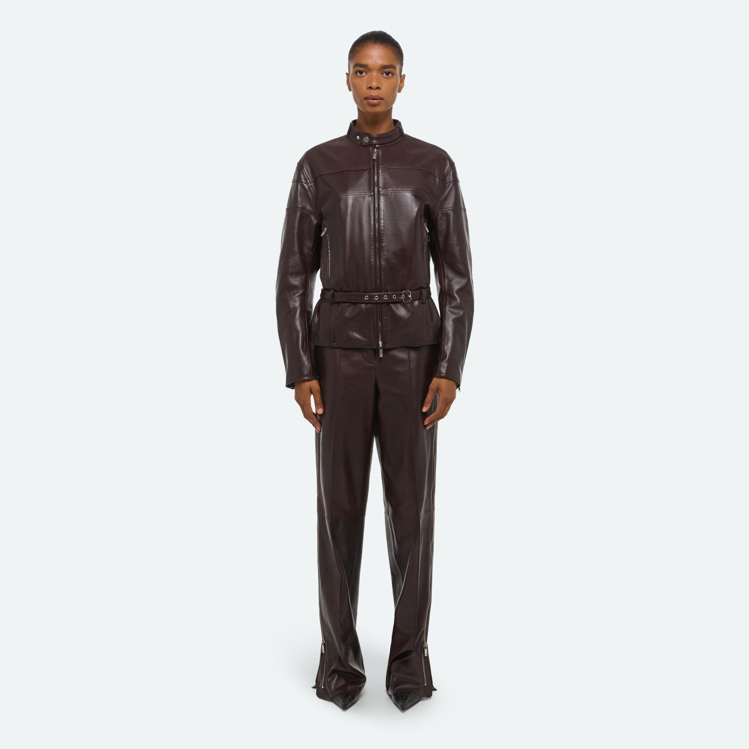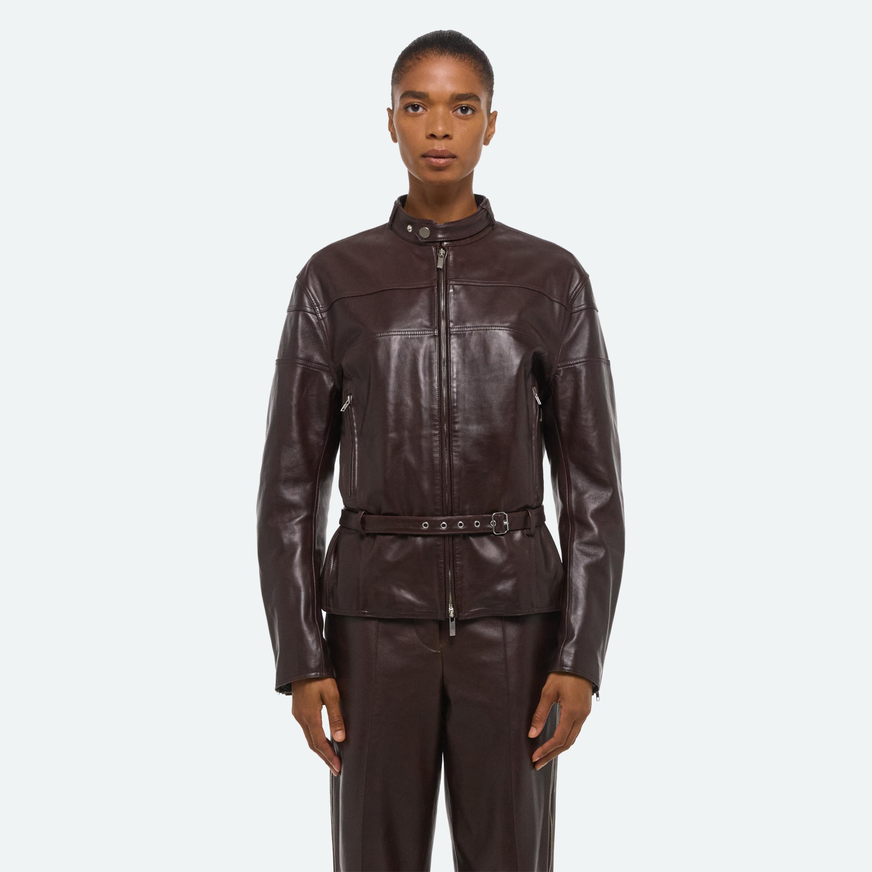 Leather moto jacket with belted waist and collar. Finished with classic moto details.