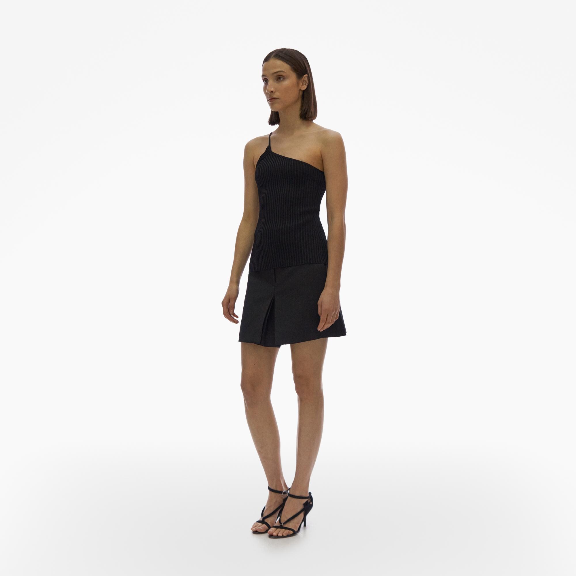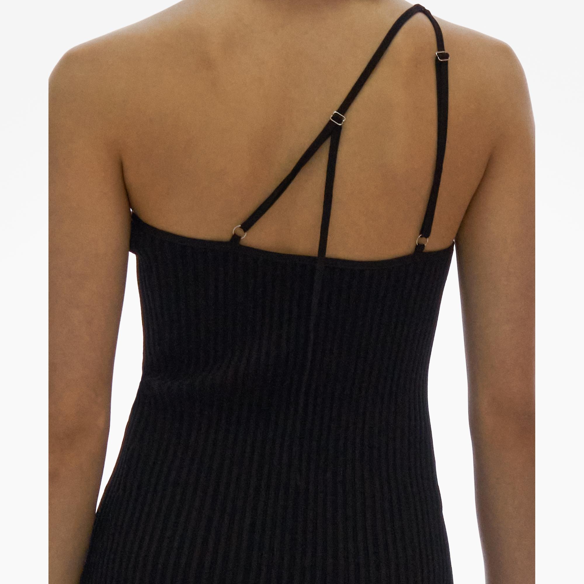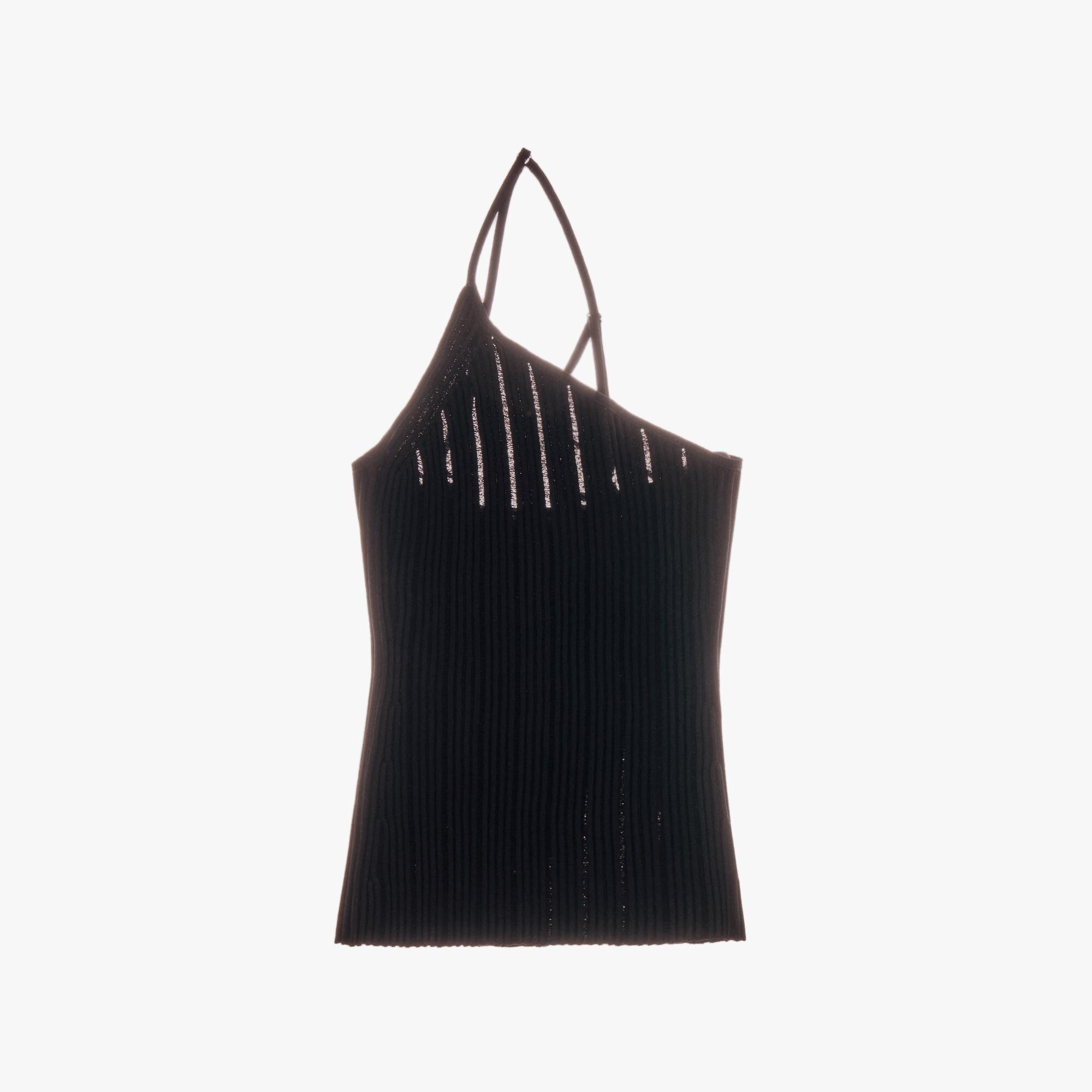 The Helmut Lang Tank is a one-shoulder style in rib knit with a cross-over strap detail.