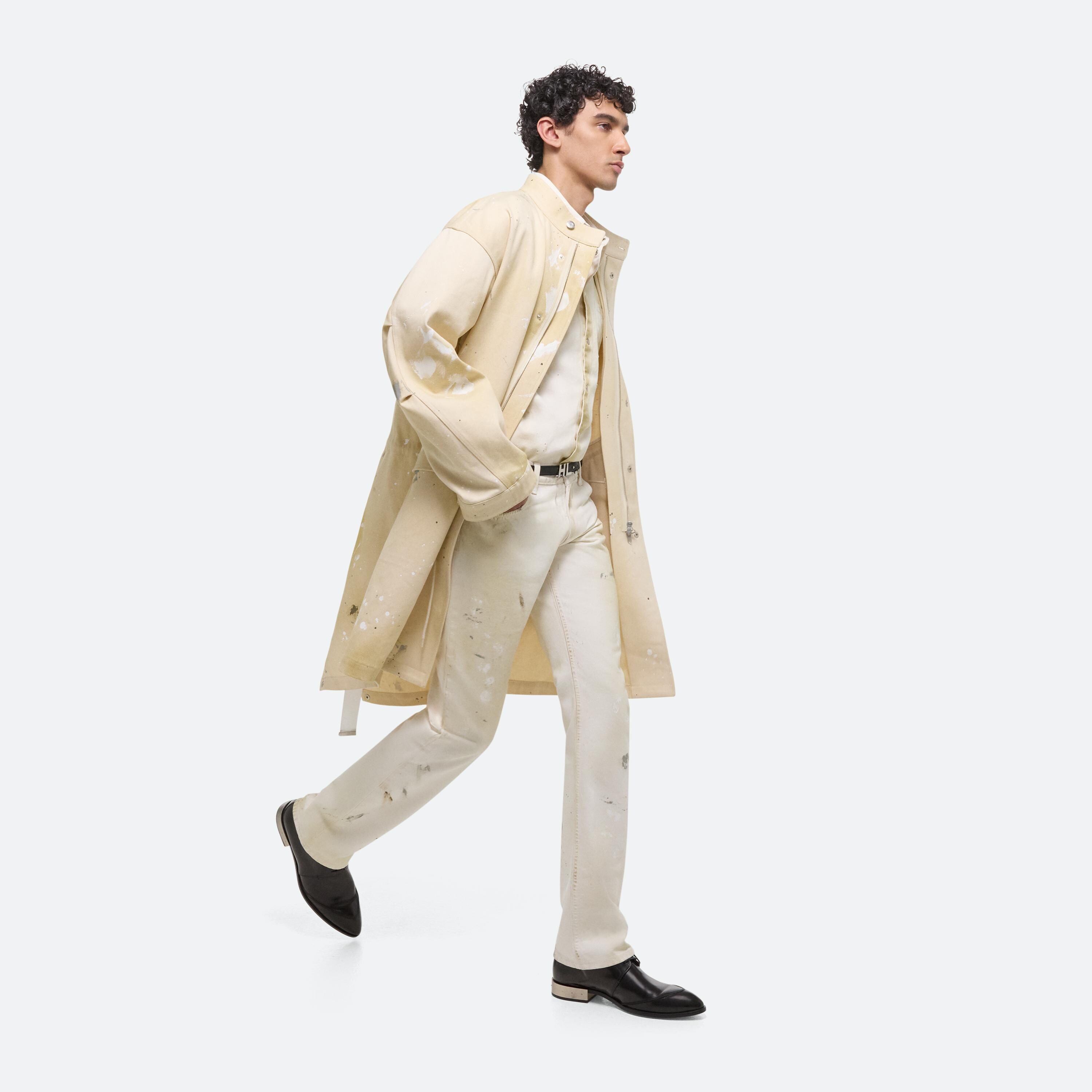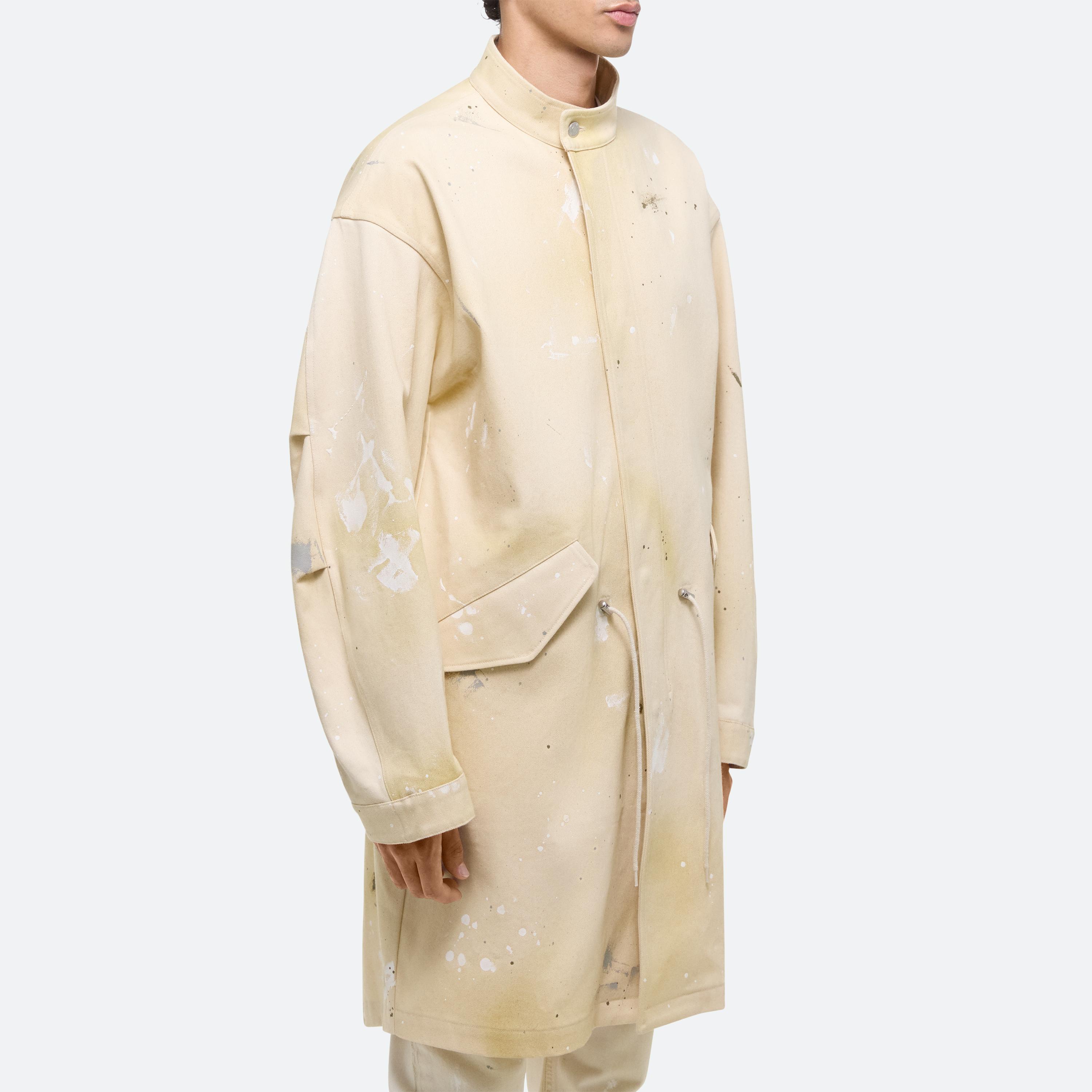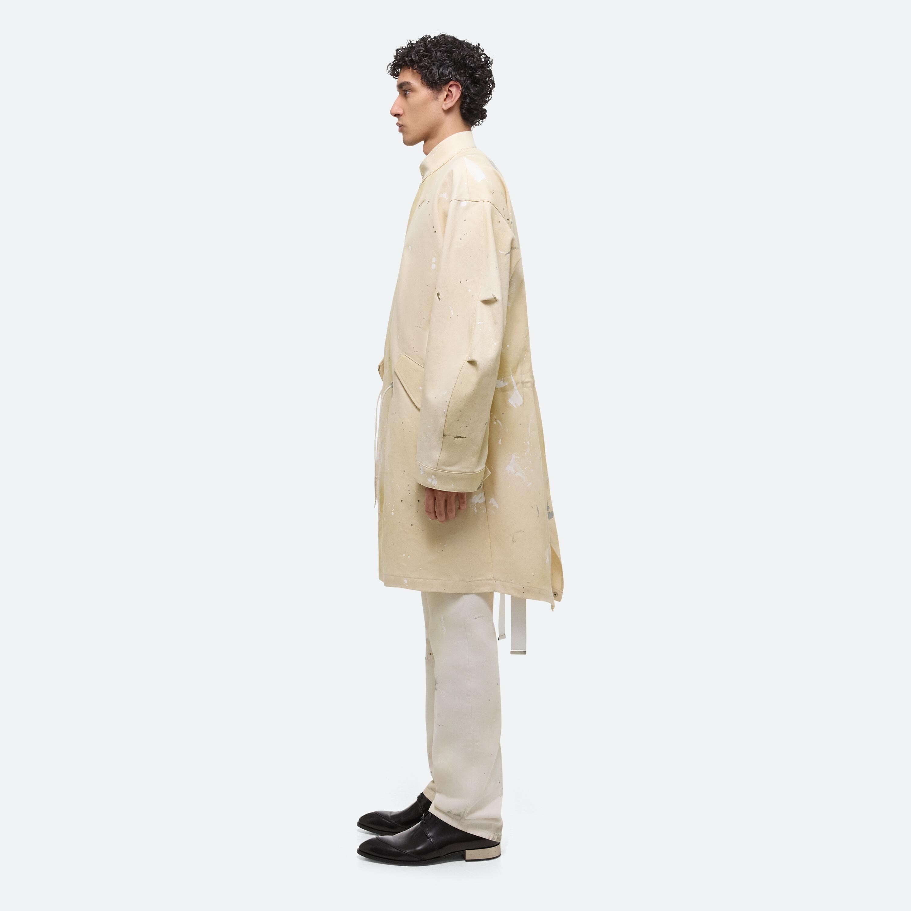 Raw undyed denim jacket with classic parka details like a fishtail hem and drawstring waist. Adjustable straps inside allow the coat to be worn over the shoulders like a backpack. Each jacket is finished by hand with paint and oil staining for a one-of-a-kind patina.
