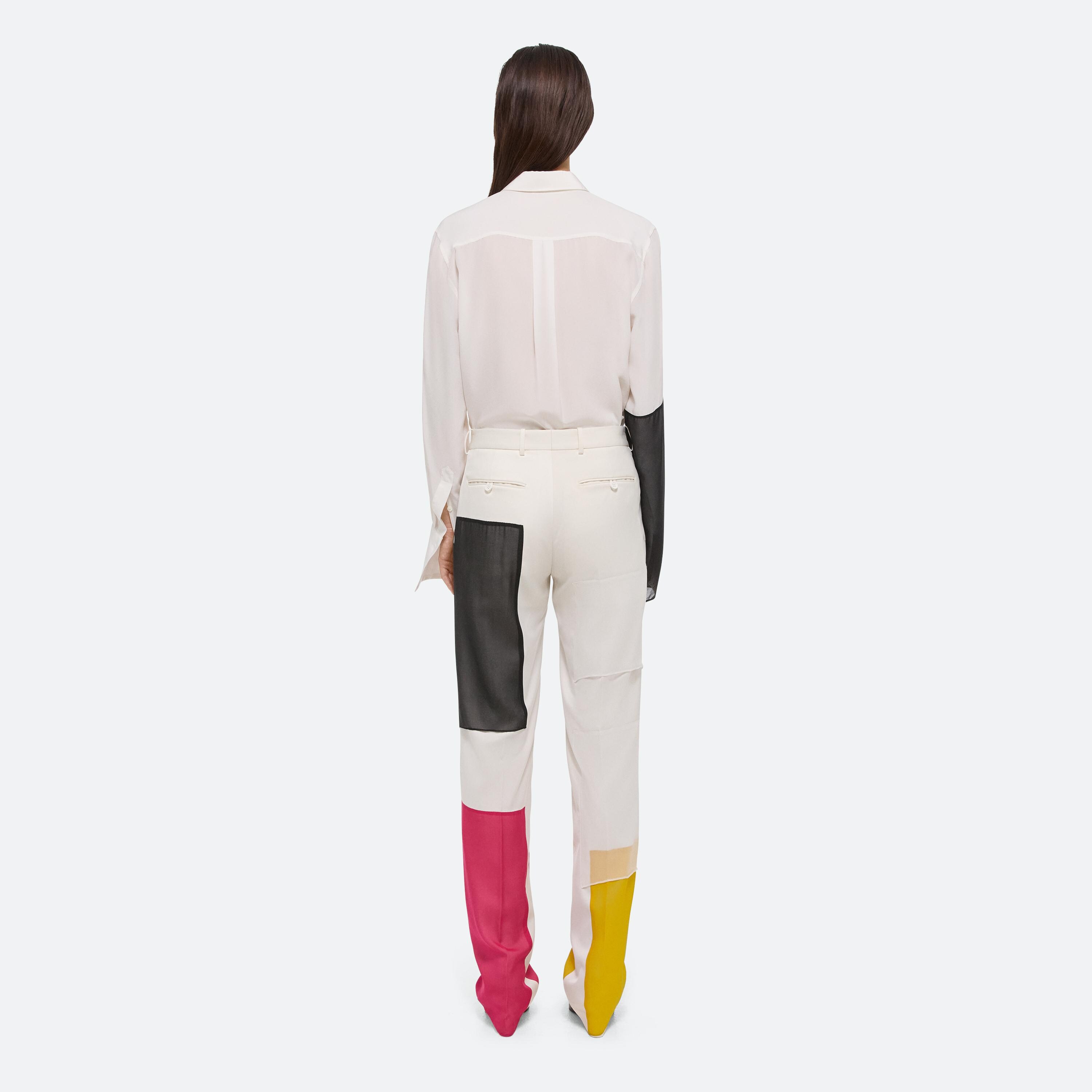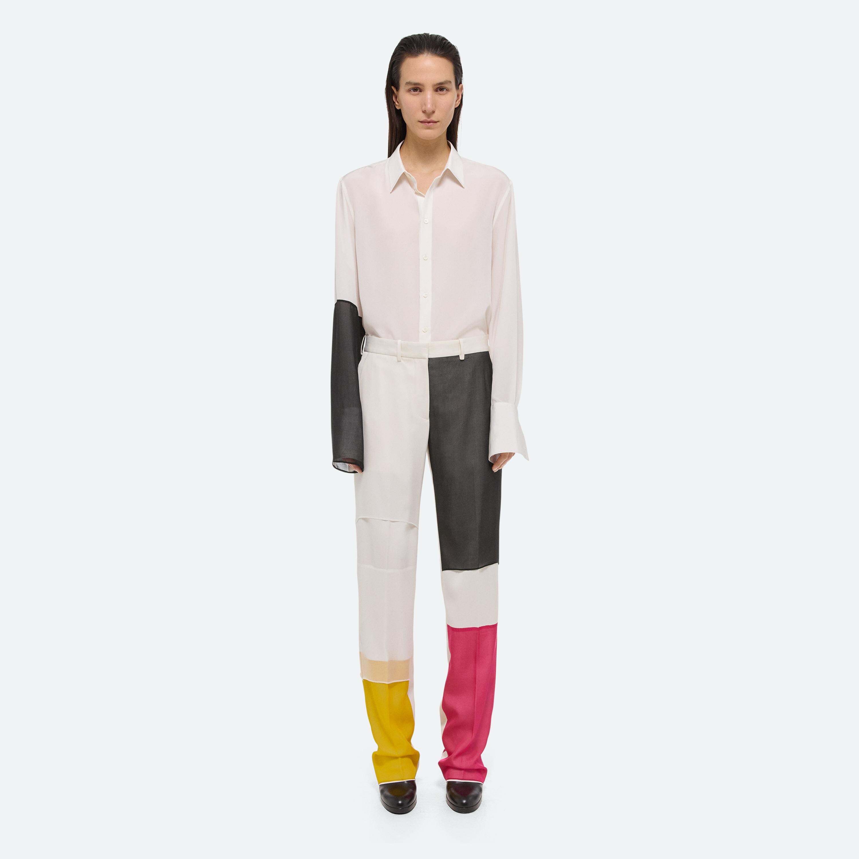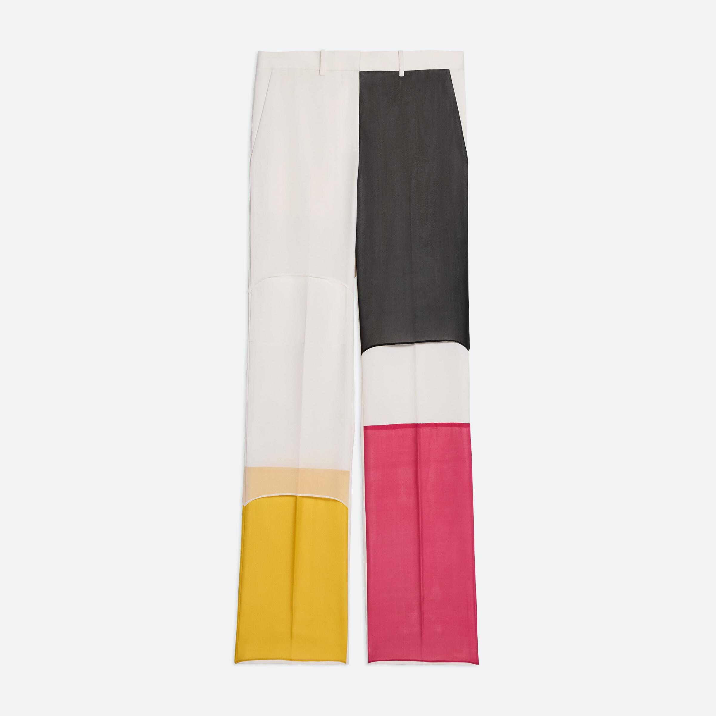 A relaxed fit with a straight leg cut. The trousers feature an overlay of silk chiffon panels for a patchwork affect.