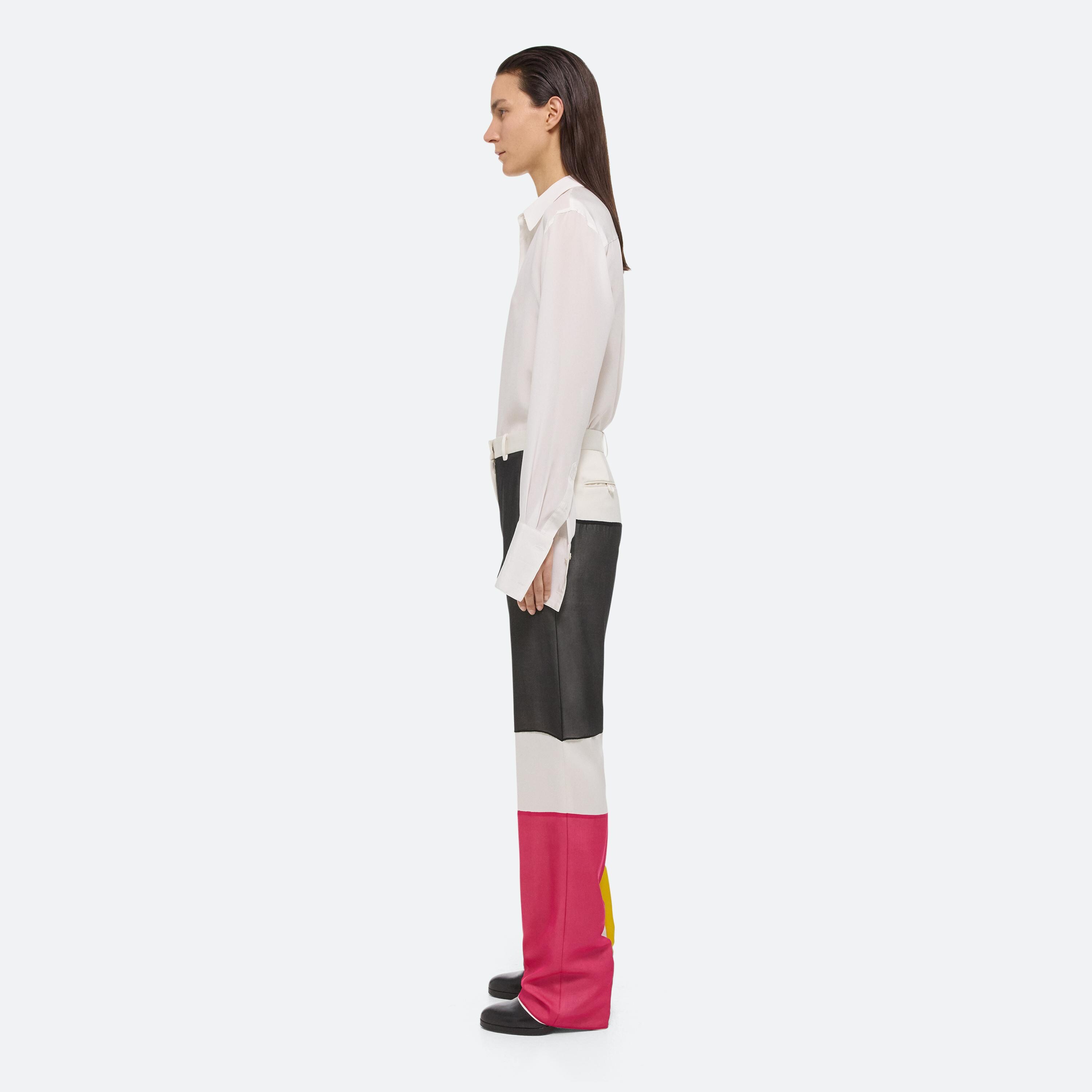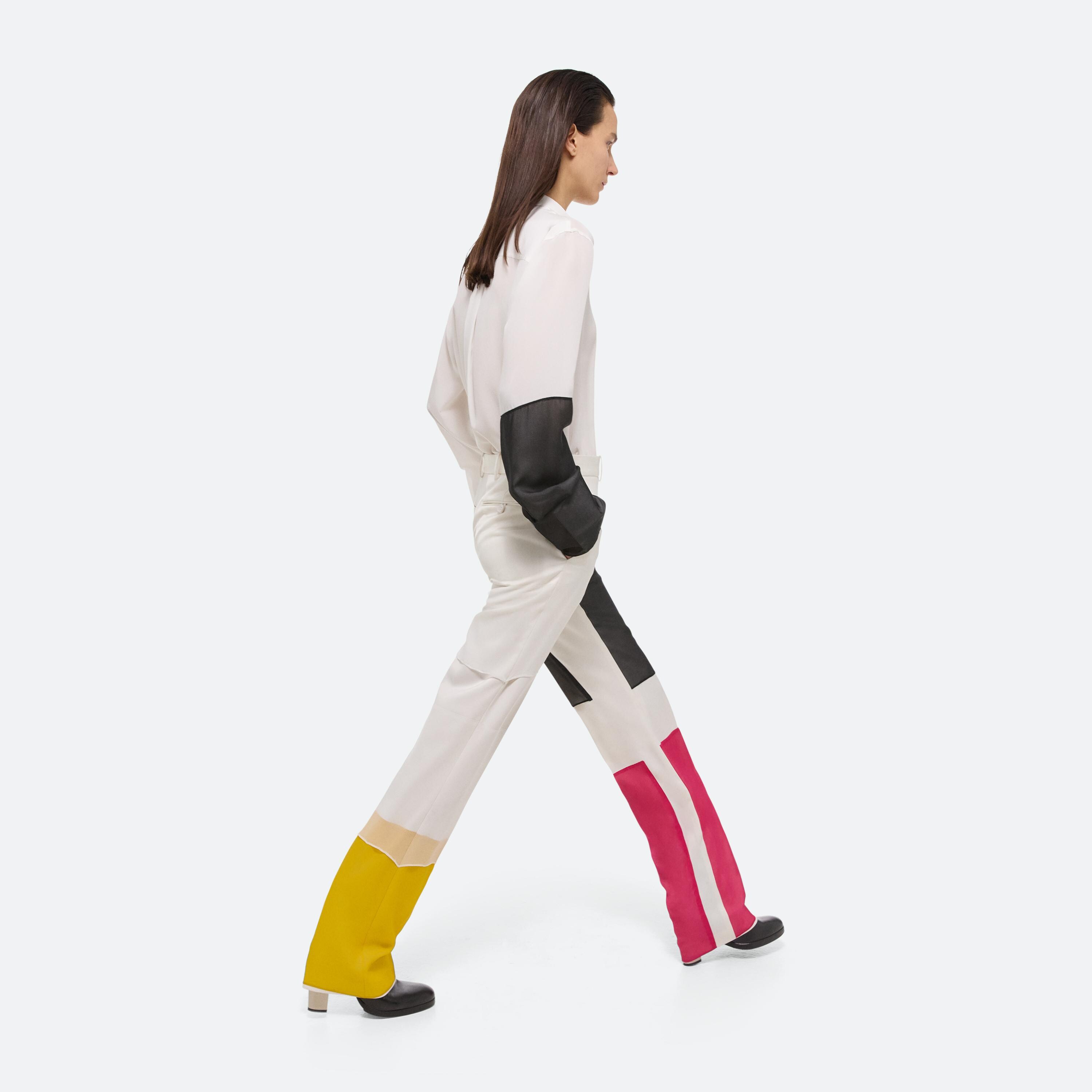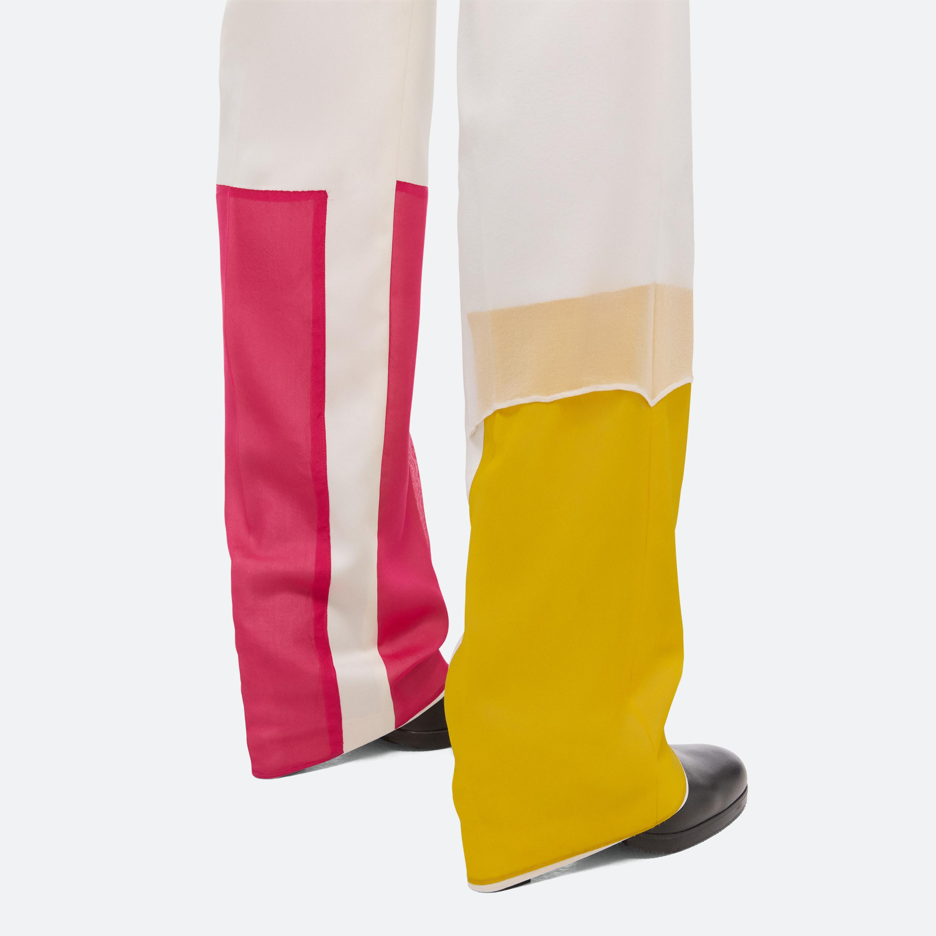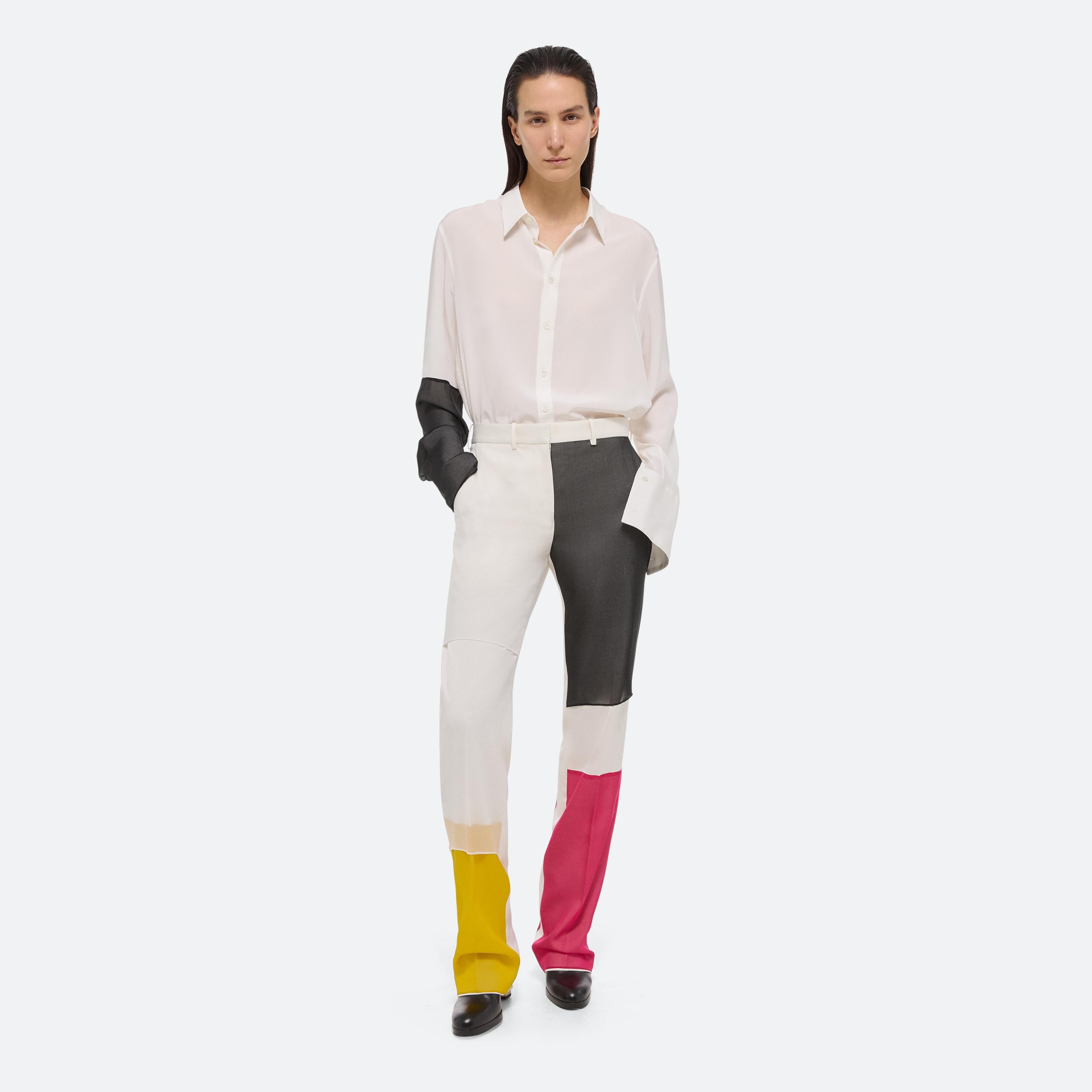 A relaxed fit with a straight leg cut. The trousers feature an overlay of silk chiffon panels for a patchwork affect.