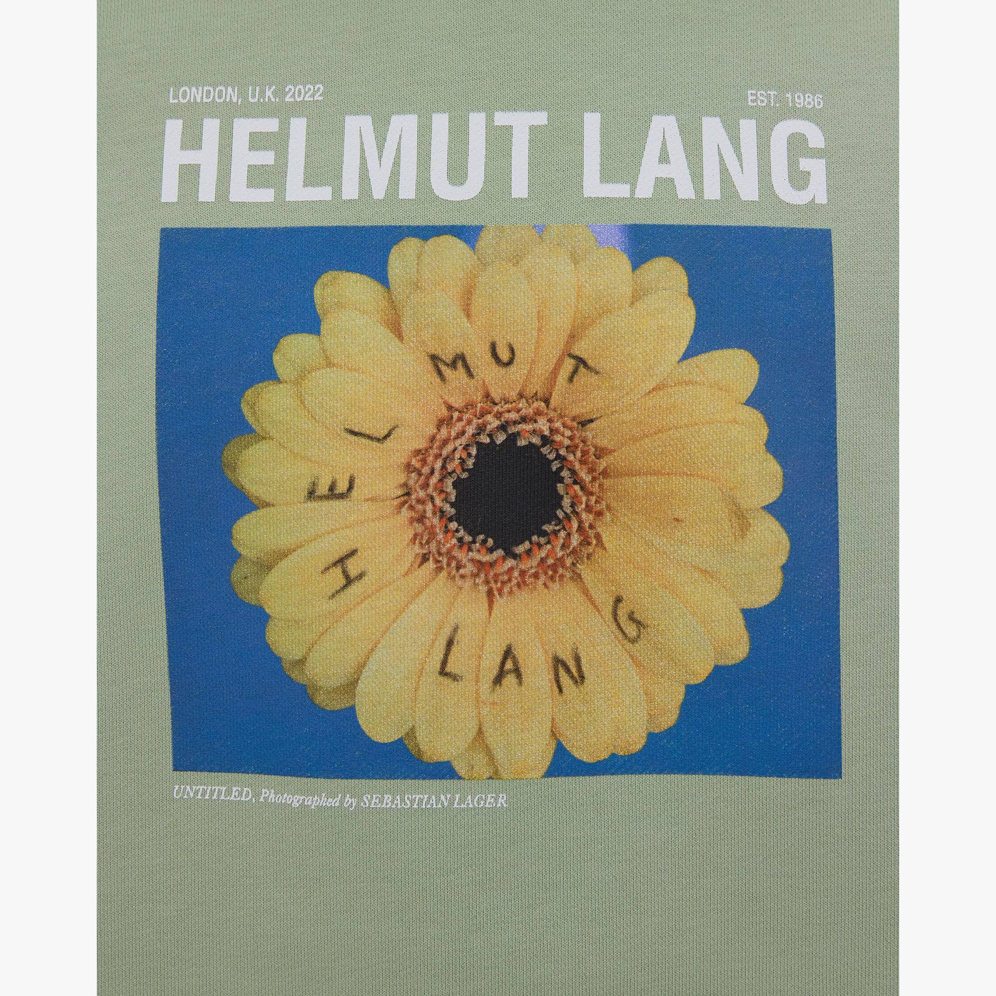 The Helmut Lang Photo Logo Hoodie is a relaxed style in a compact French terry cloth with an HL logo and a photo by Sebastian Lager at the front, drawstring hood, kangaroo pocket, and rib knit details throughout.