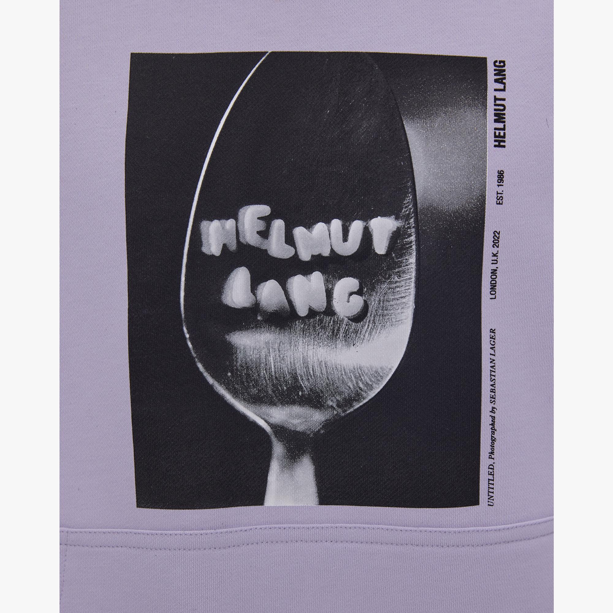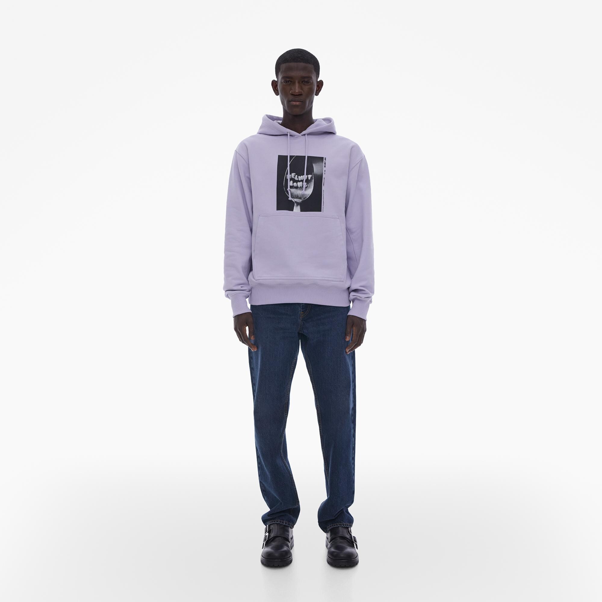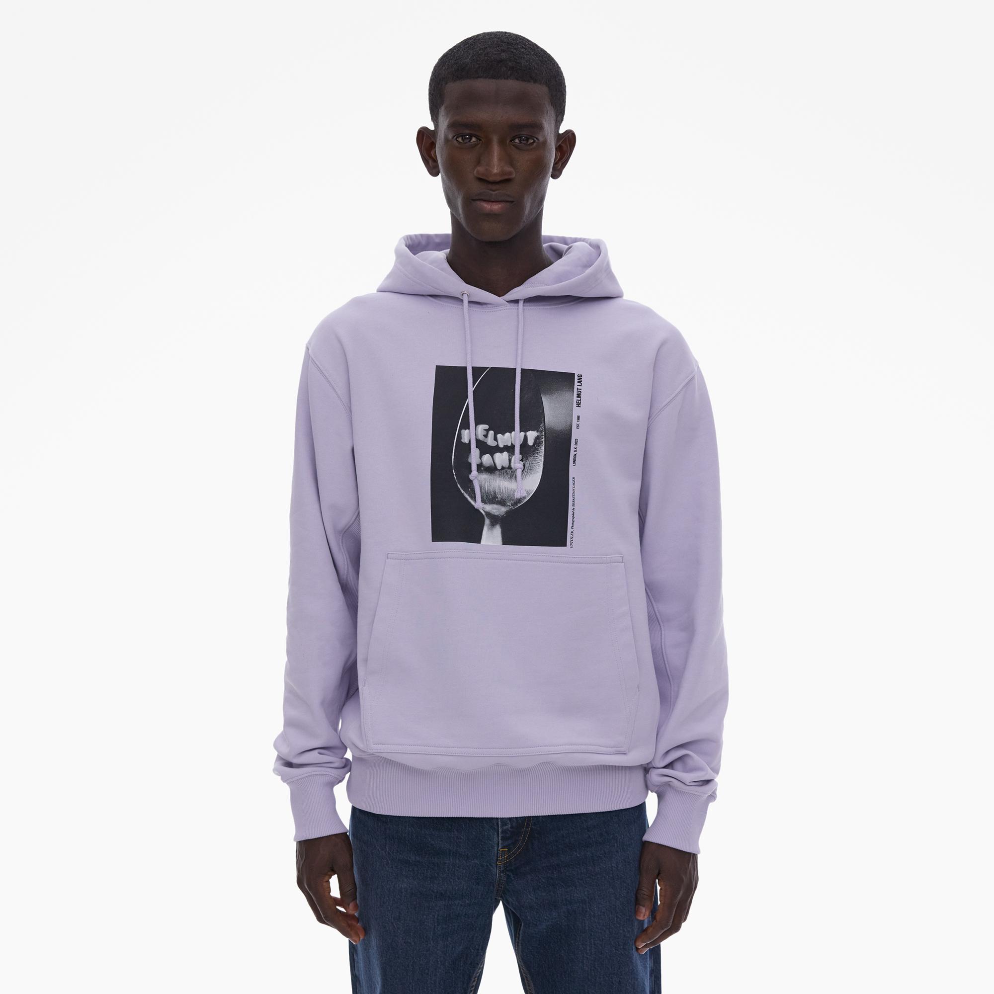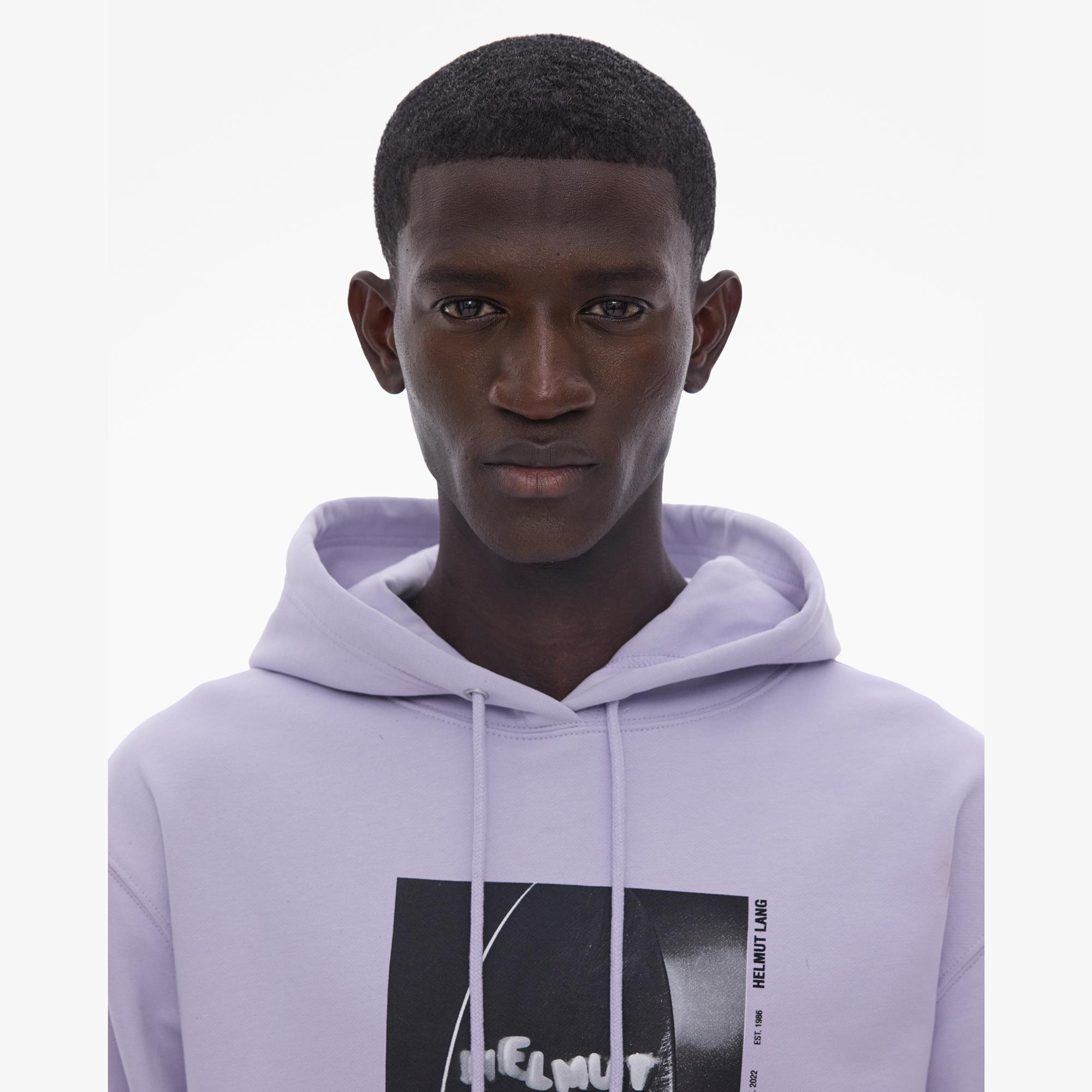 The Helmut Lang Photo Logo Hoodie is a relaxed style in a compact French terry cloth with an HL logo at the back, a photo by Sebastian Lager at the front, drawstring hood, kangaroo pocket, and rib knit details throughout.