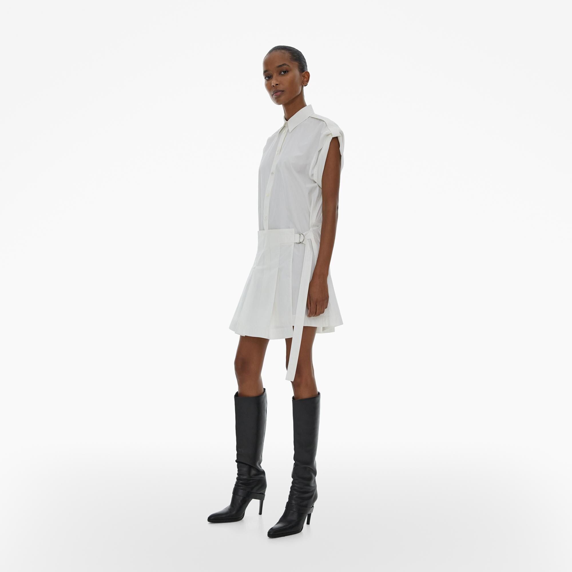 The Helmut Lang Mini Shirt Dress is a sleeveless style in a tumbled cotton-nylon blend that is detailed with a pointed collar, shoulder epaulets, button front closures and a pleated wrap overlay with a D-ring buckle.