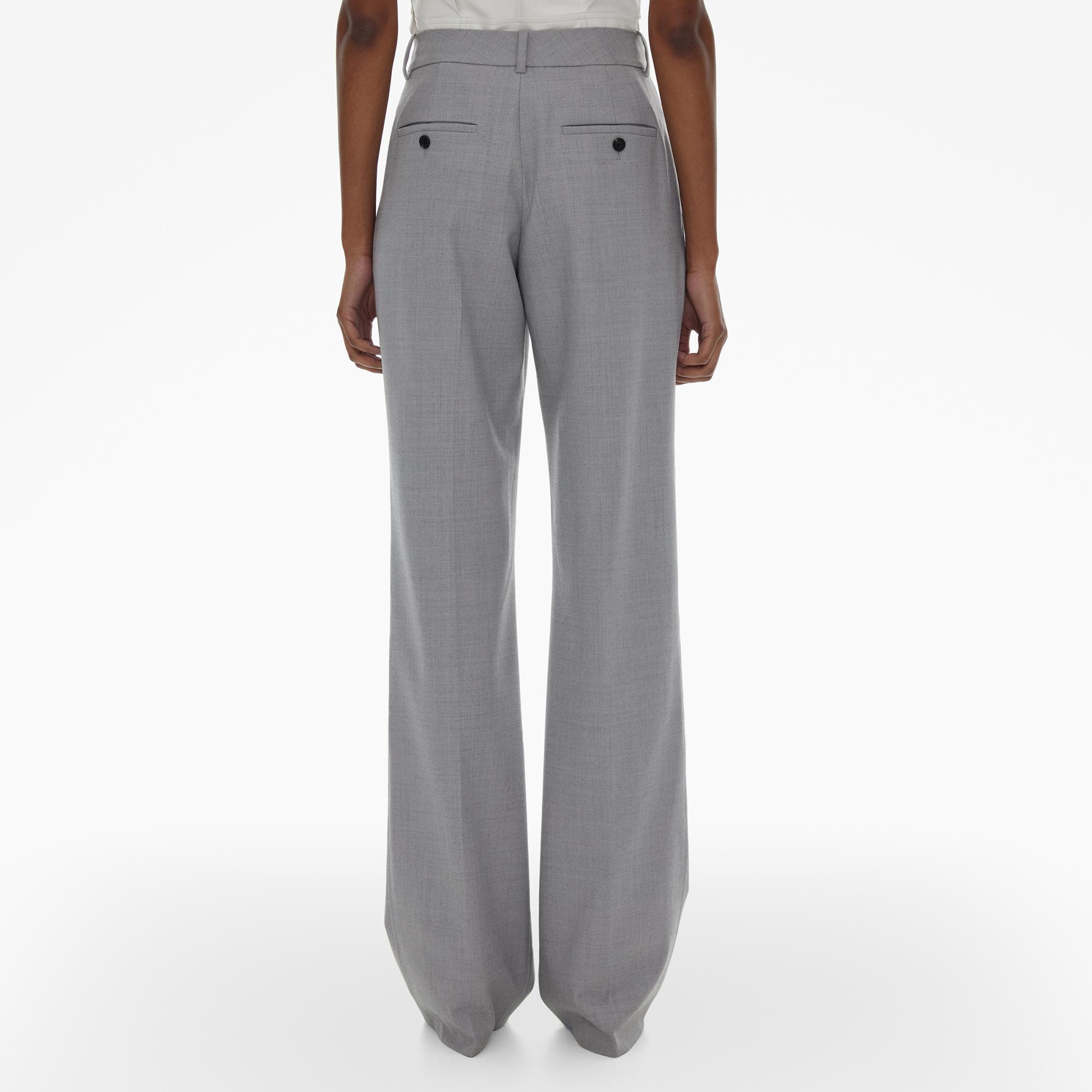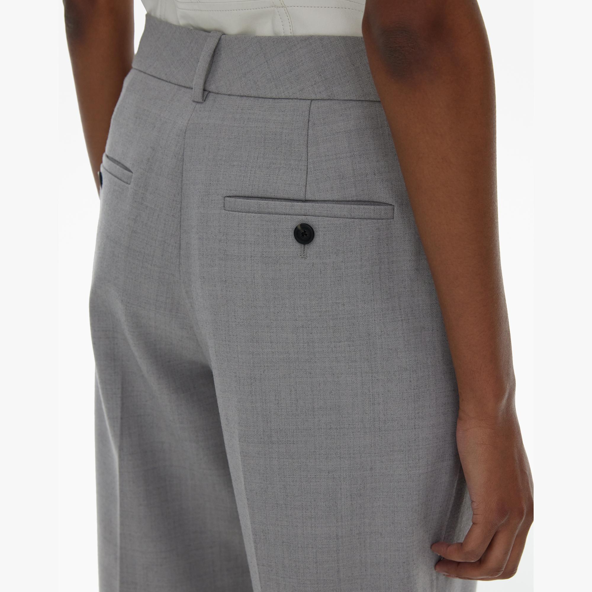 The Helmut Lang Wide-Leg Pant is a high-rise style in a stretch wool blend with a pleated waistband, belt loops, zip fly and hook closures, side slant pockets and back button pockets.