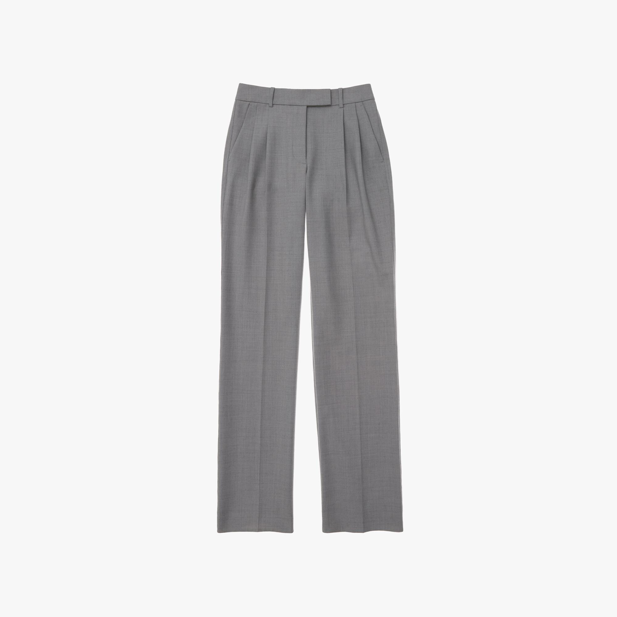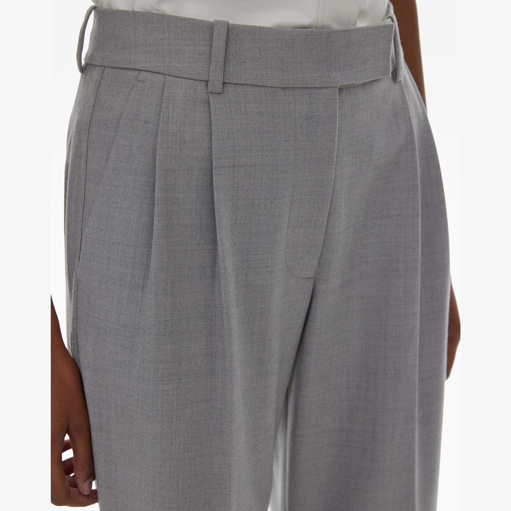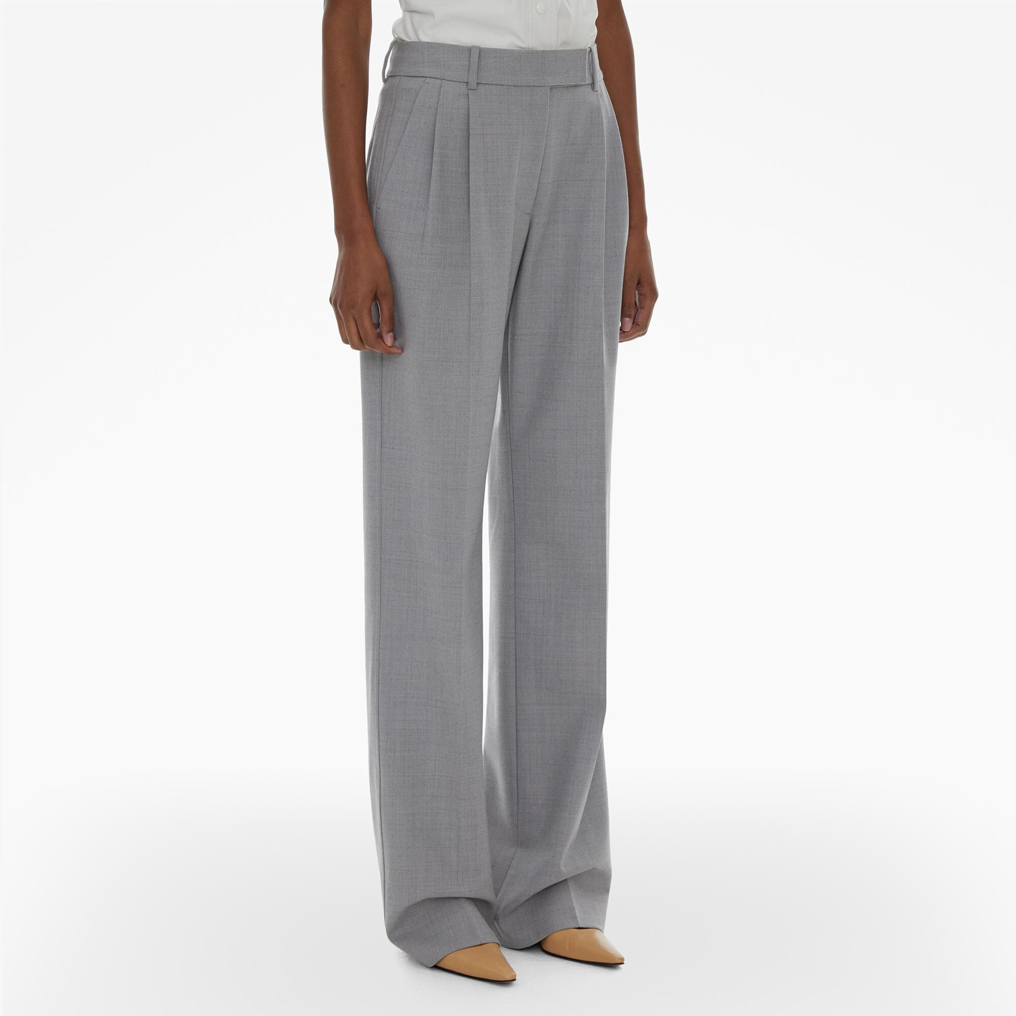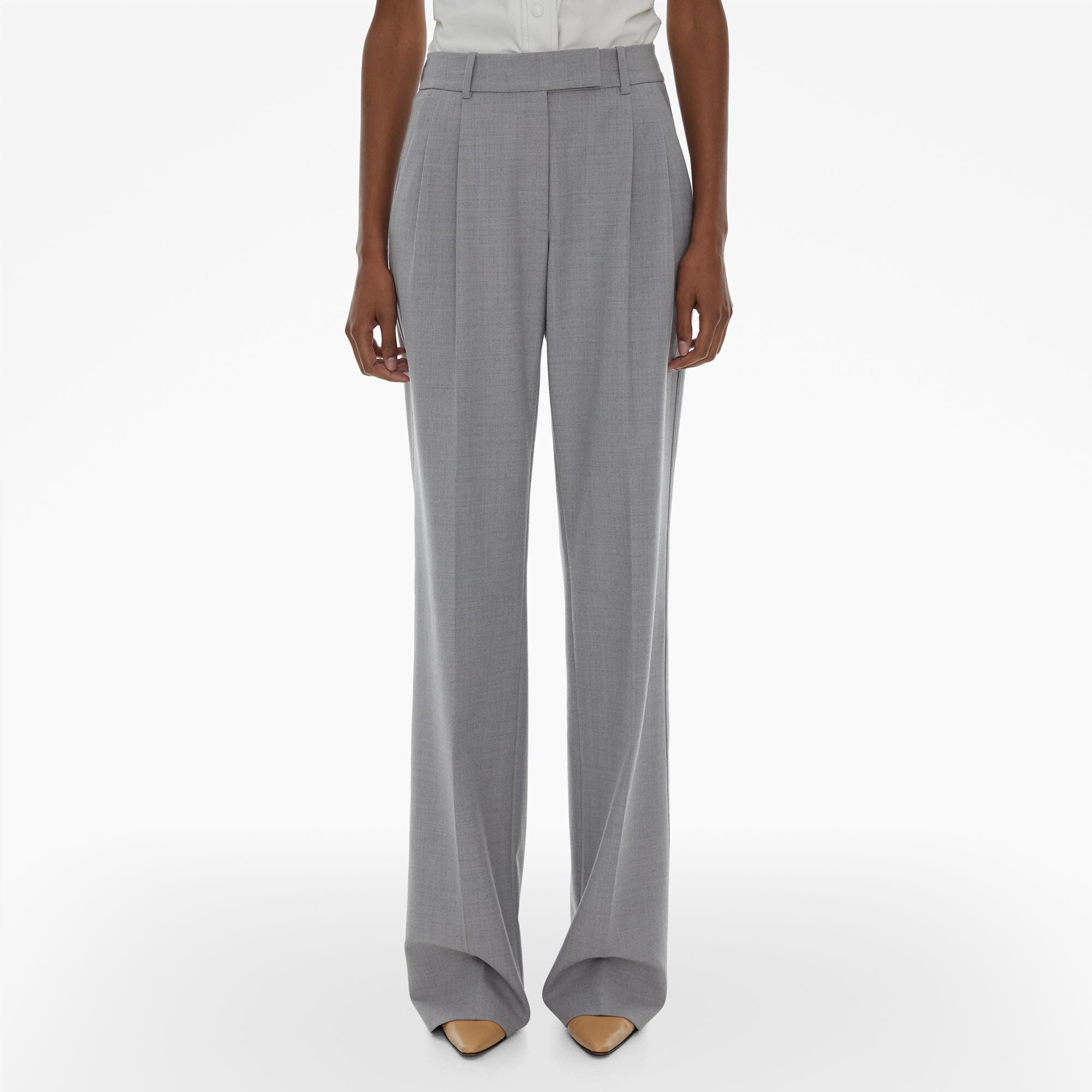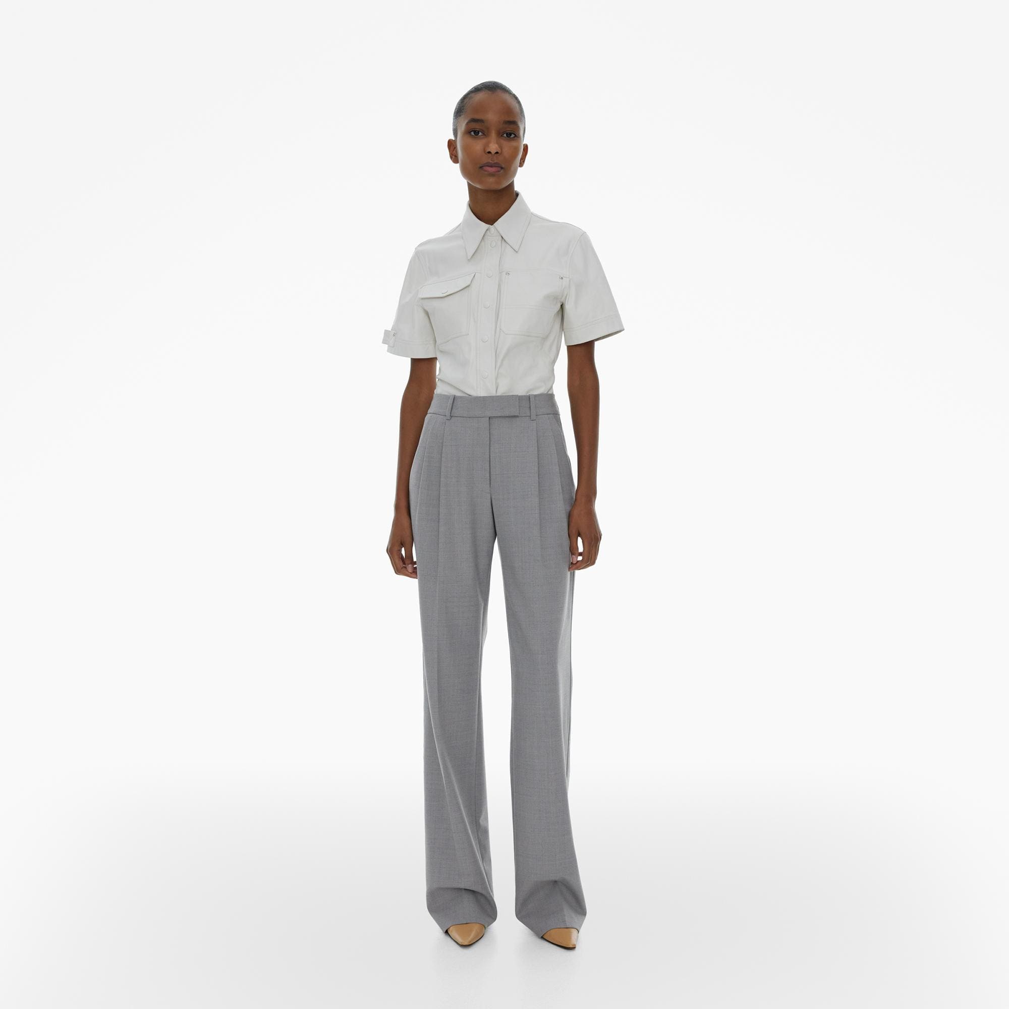The Helmut Lang Wide-Leg Pant is a high-rise style in a stretch wool blend with a pleated waistband, belt loops, zip fly and hook closures, side slant pockets and back button pockets.