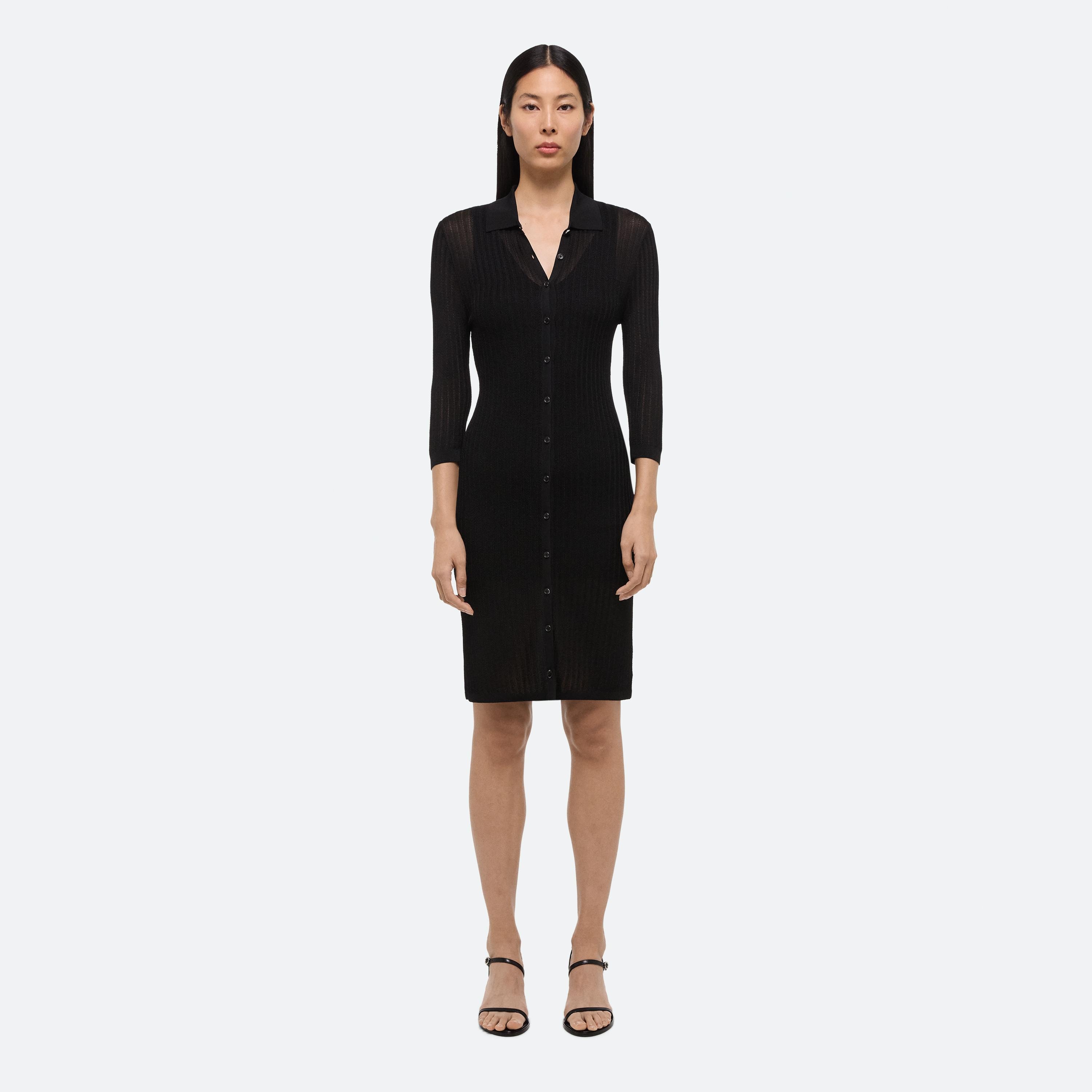 Button-front shirt dress in pointelle rib knit. Wear it with the included tonal slip or as a sheer layer.