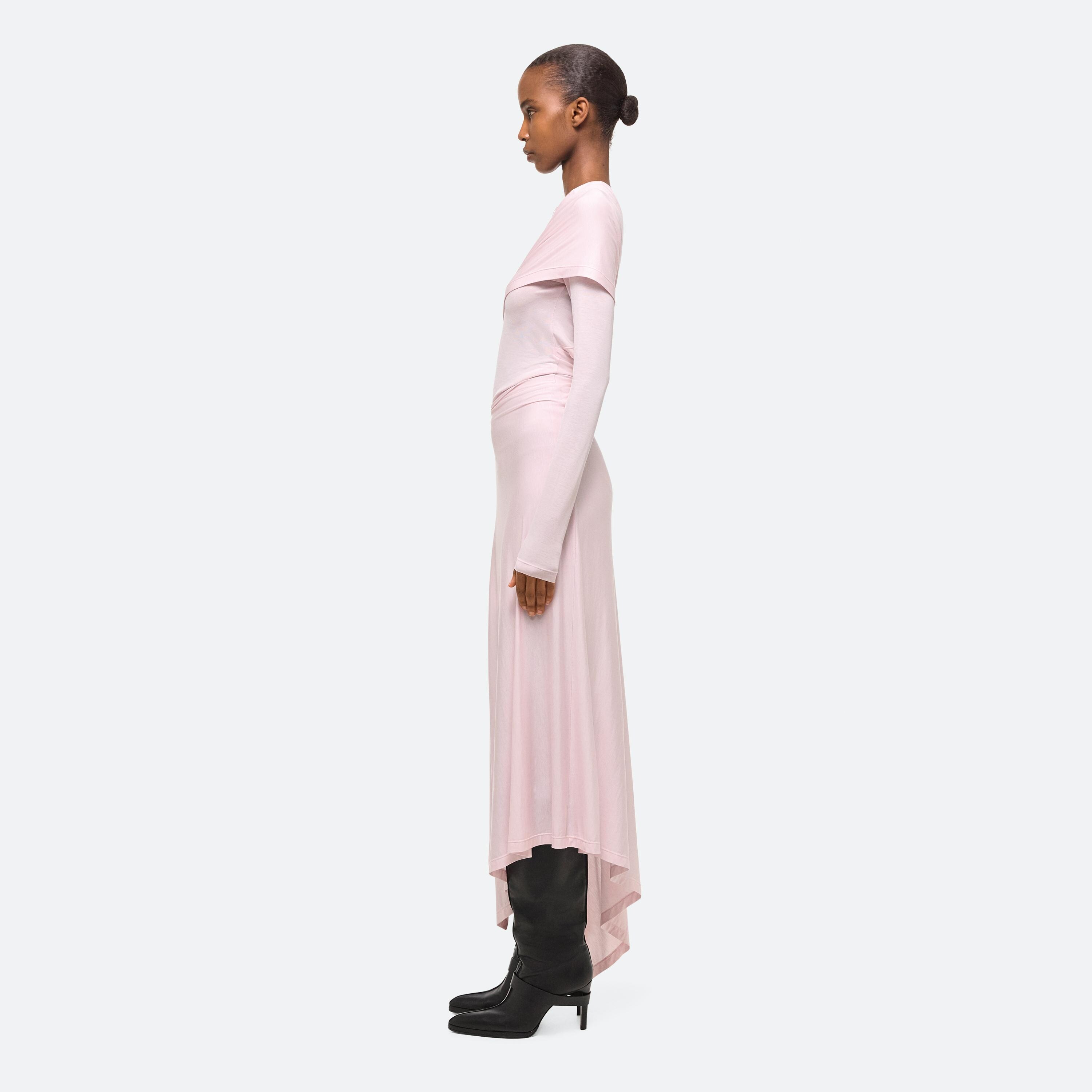 Long-sleeved dress in lyocell jersey. The translucent knit becomes opaque underneath draped panels that wrap around the body, creating a sense of movement and allowing for flashes of exposed skin.