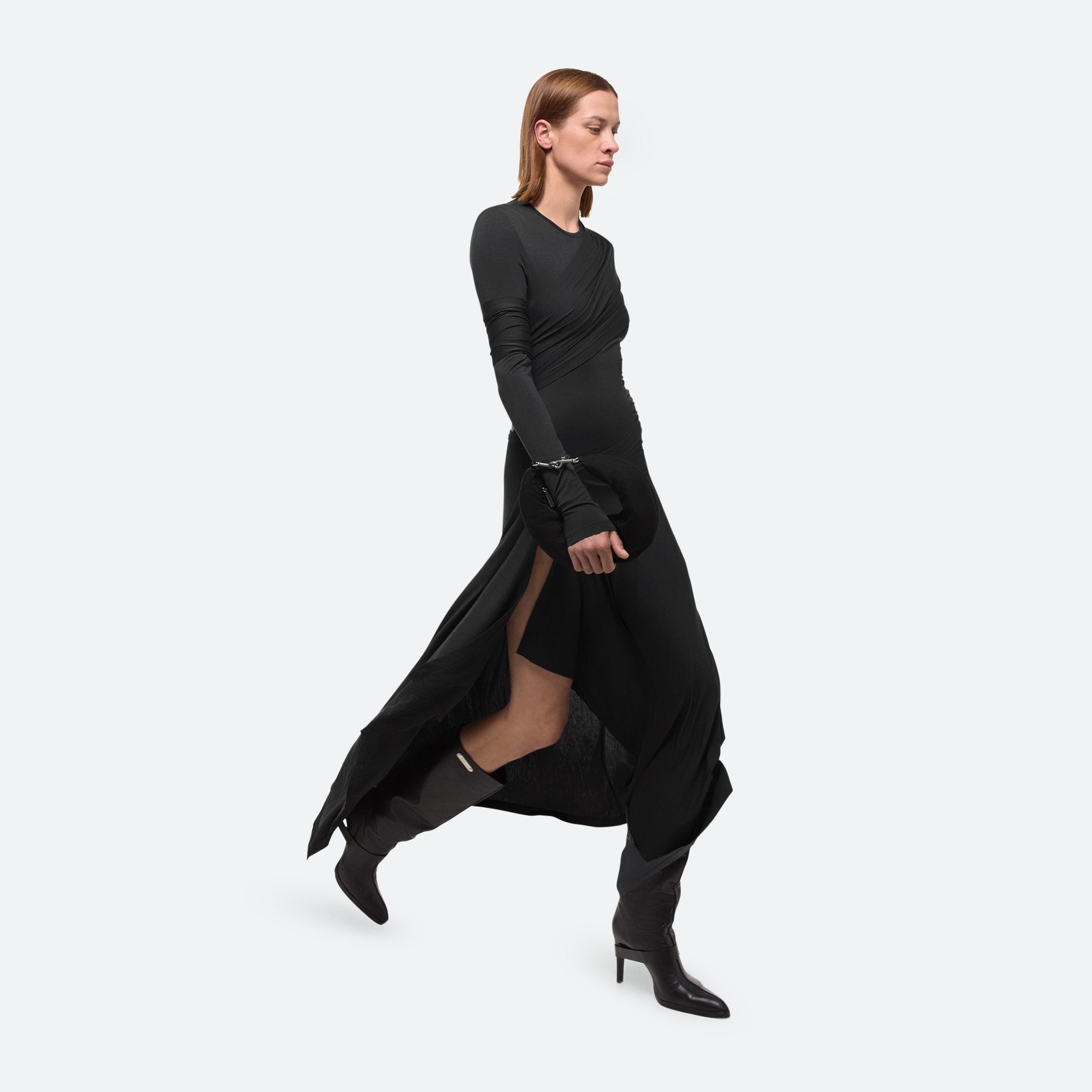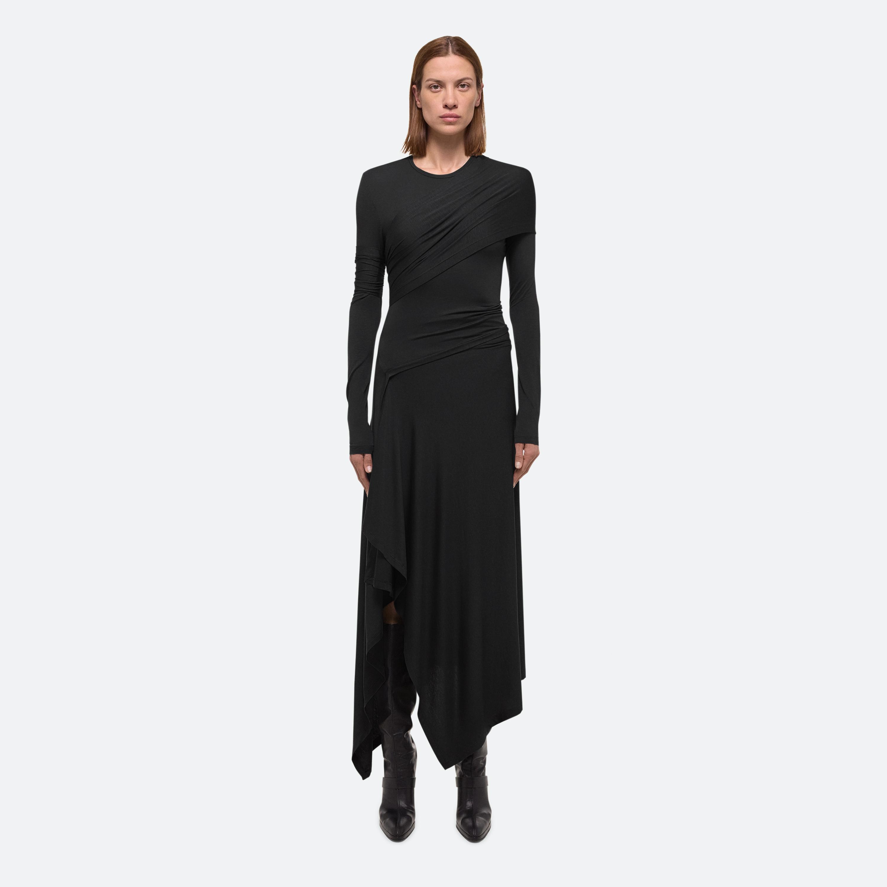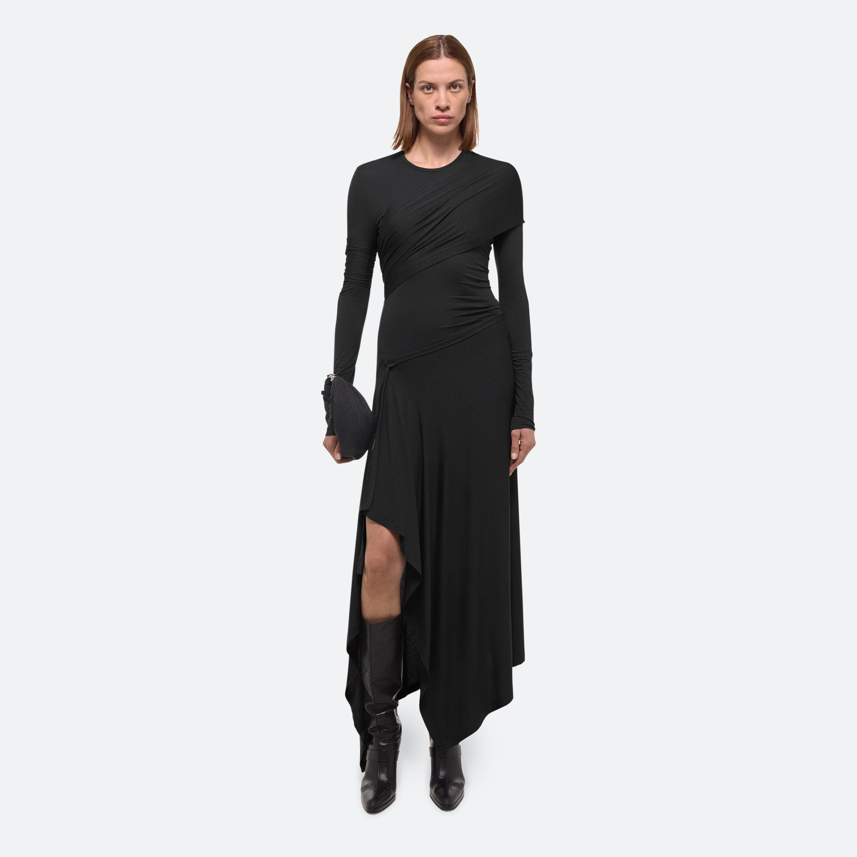 Long-sleeved dress in lyocell jersey. The translucent knit becomes opaque underneath draped panels that wrap around the body, creating a sense of movement and allowing for flashes of exposed skin.