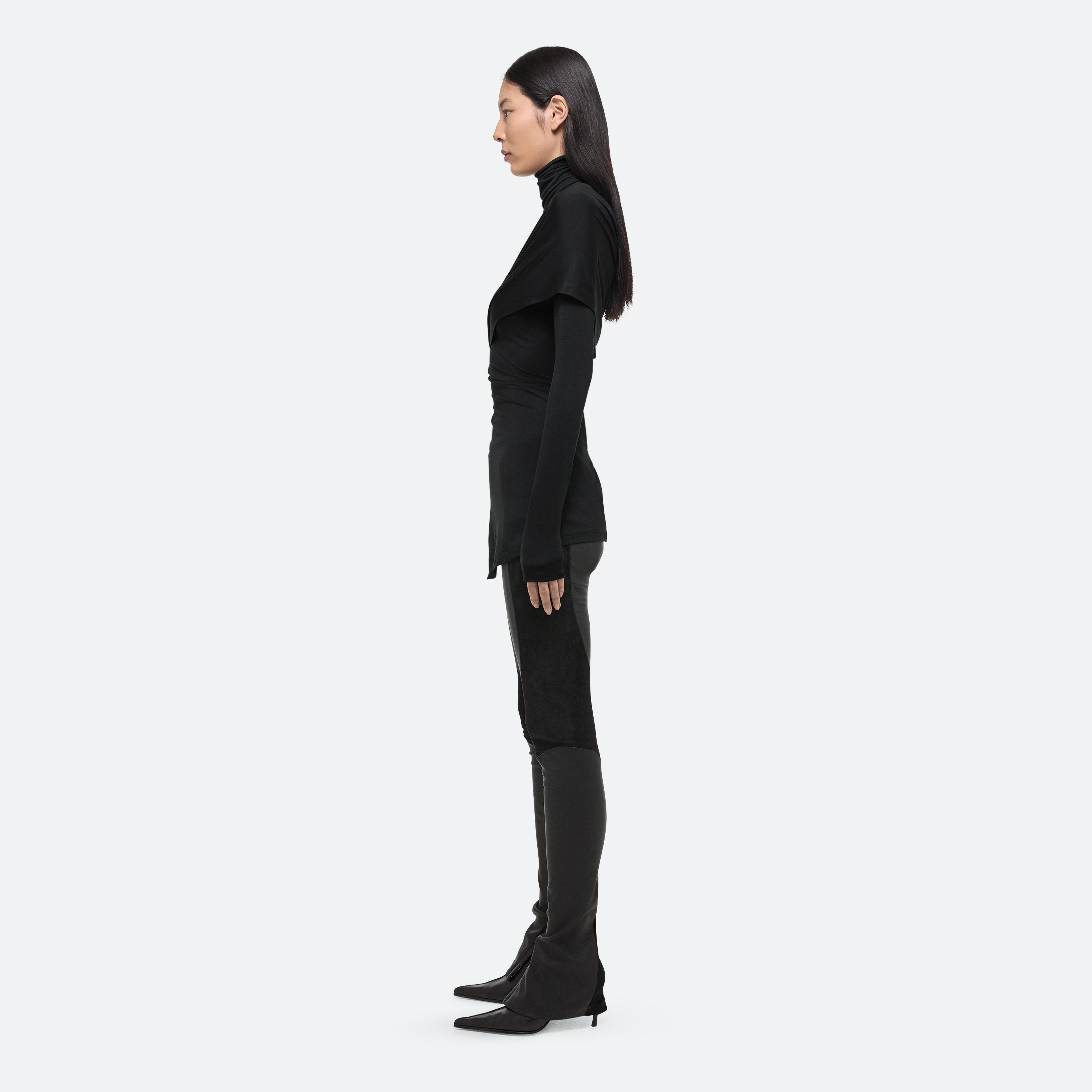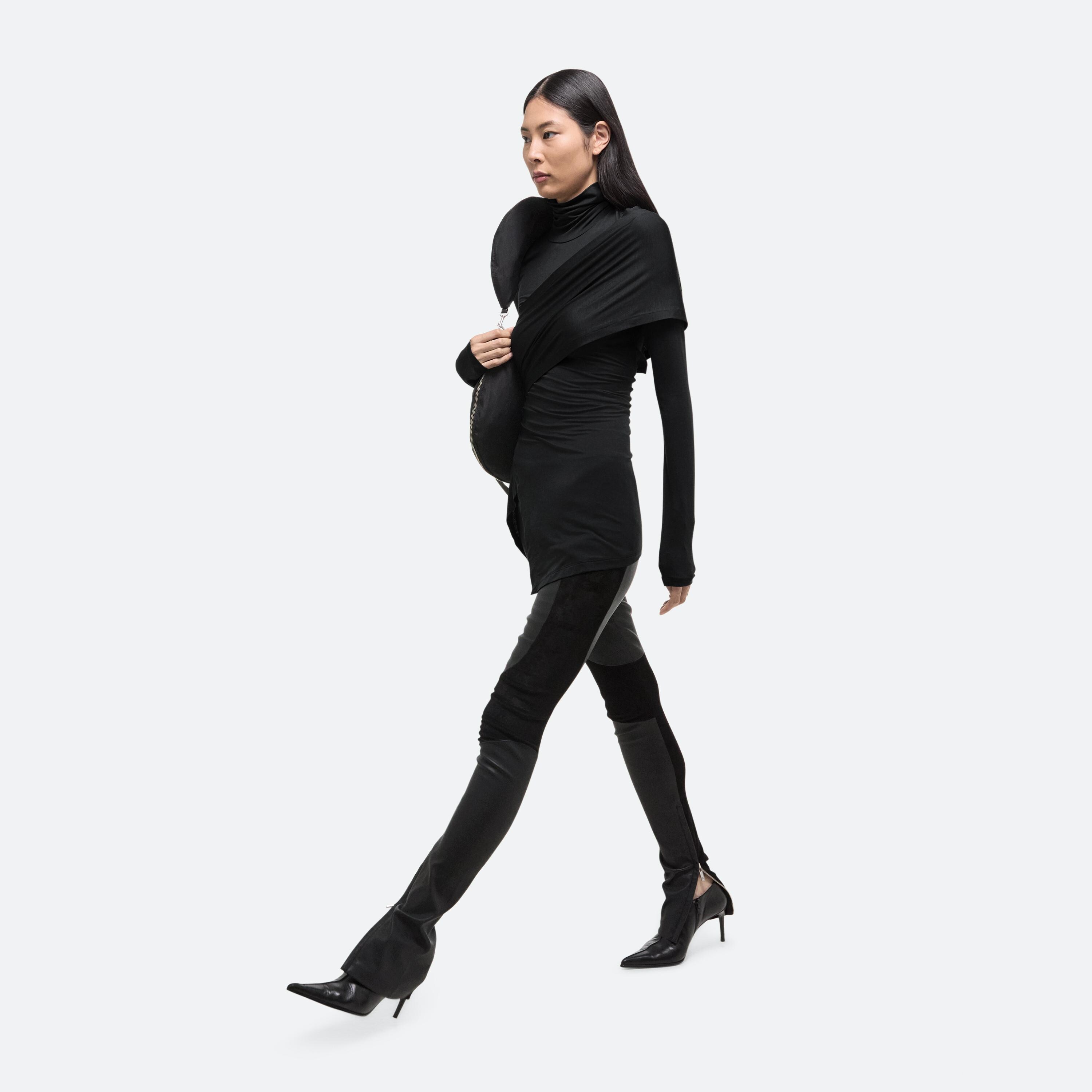 Long-sleeved turtleneck in lyocell jersey. Features a layered design with draped panels that wrap around the body, creating a sense of movement and allowing for flashes of exposed skin.