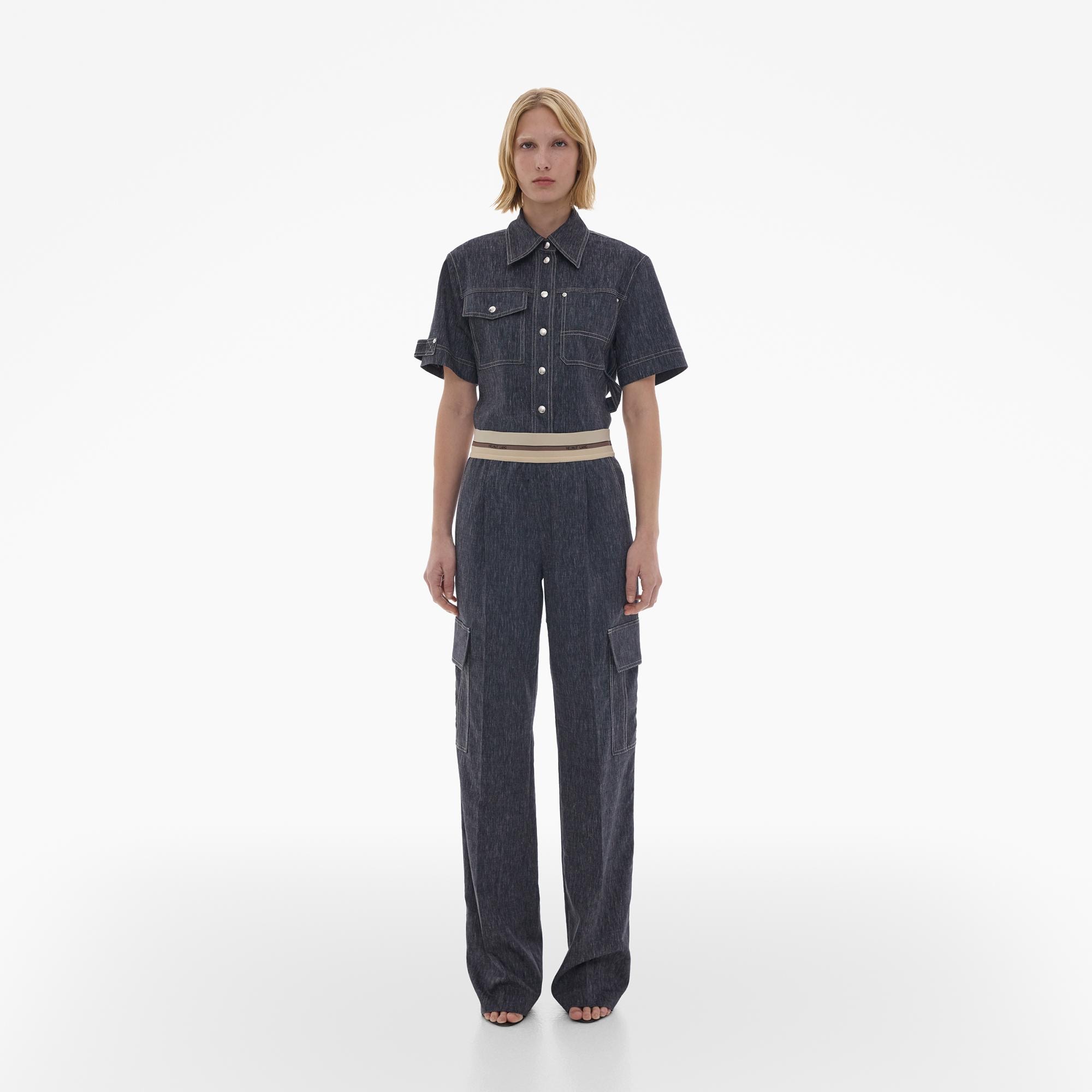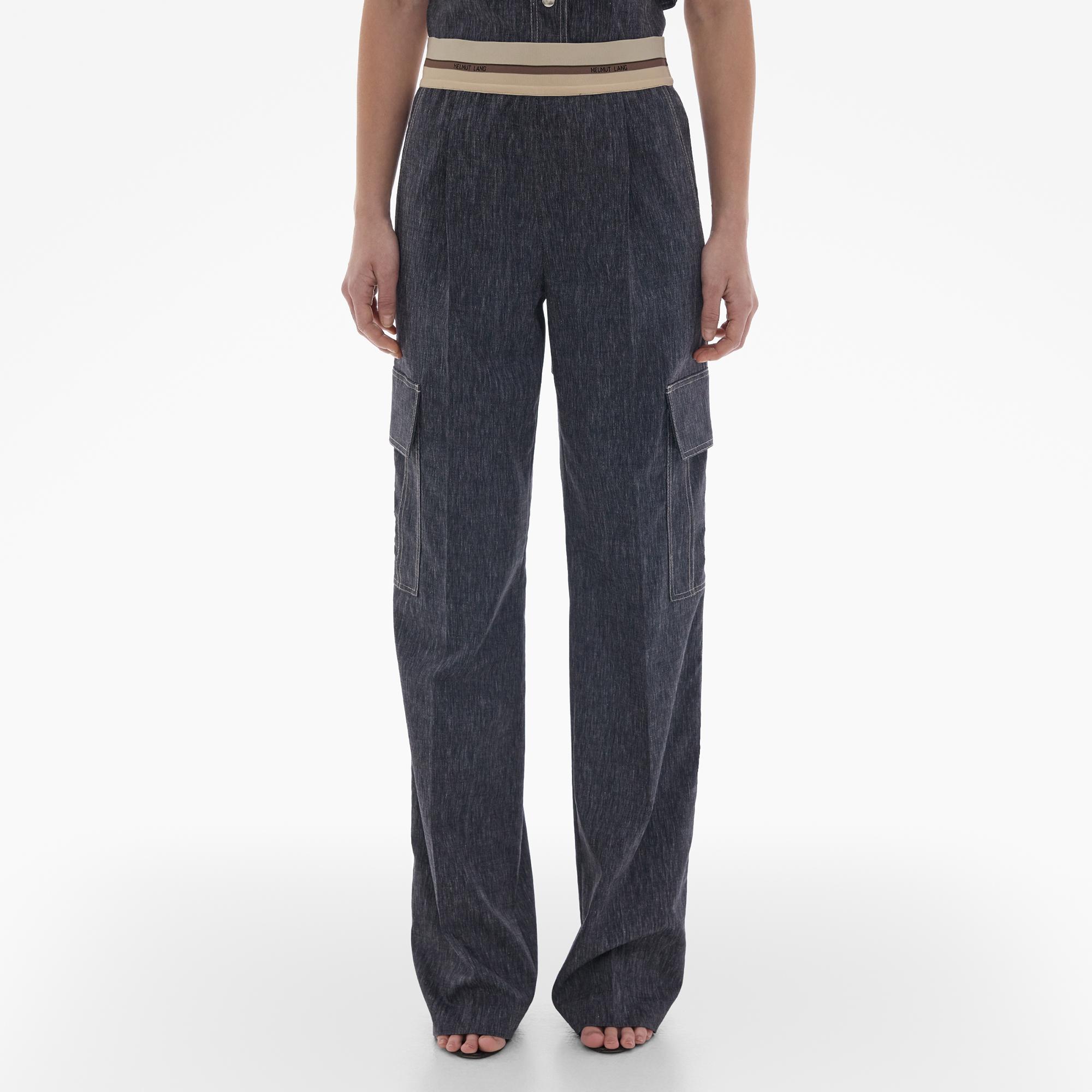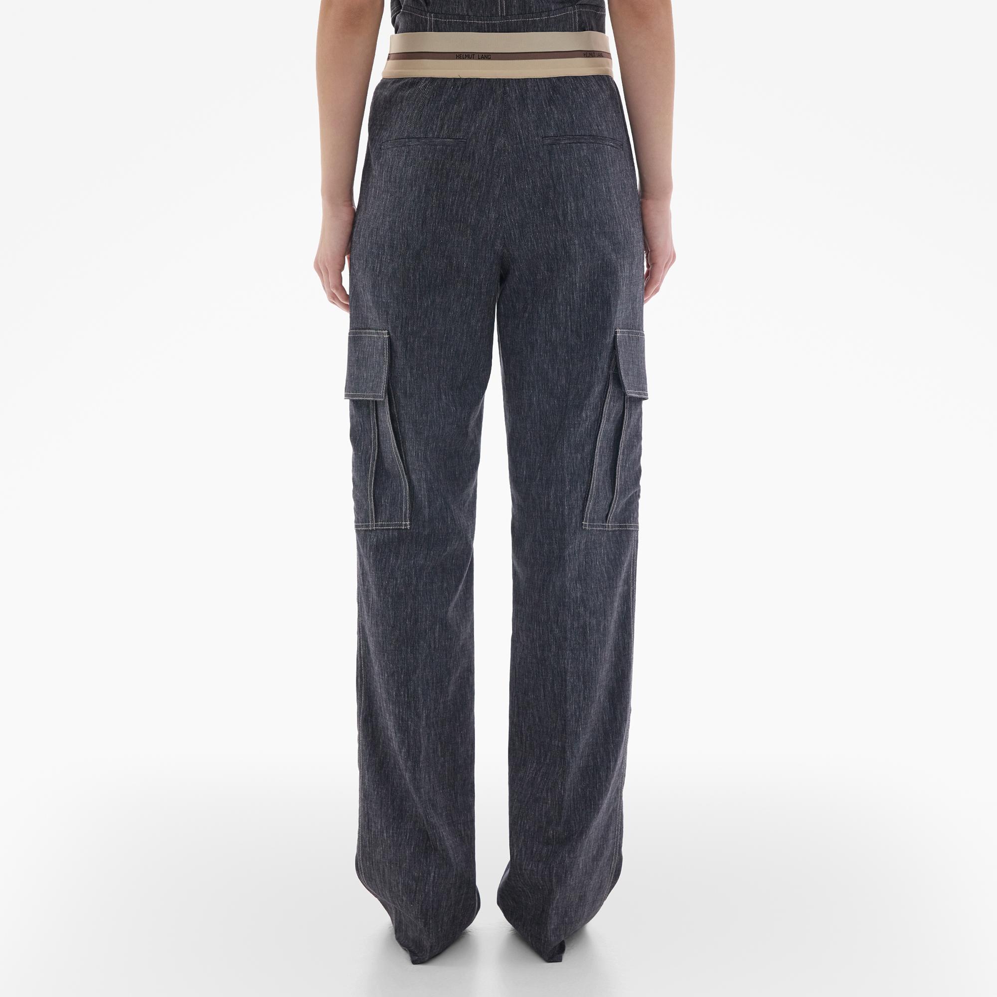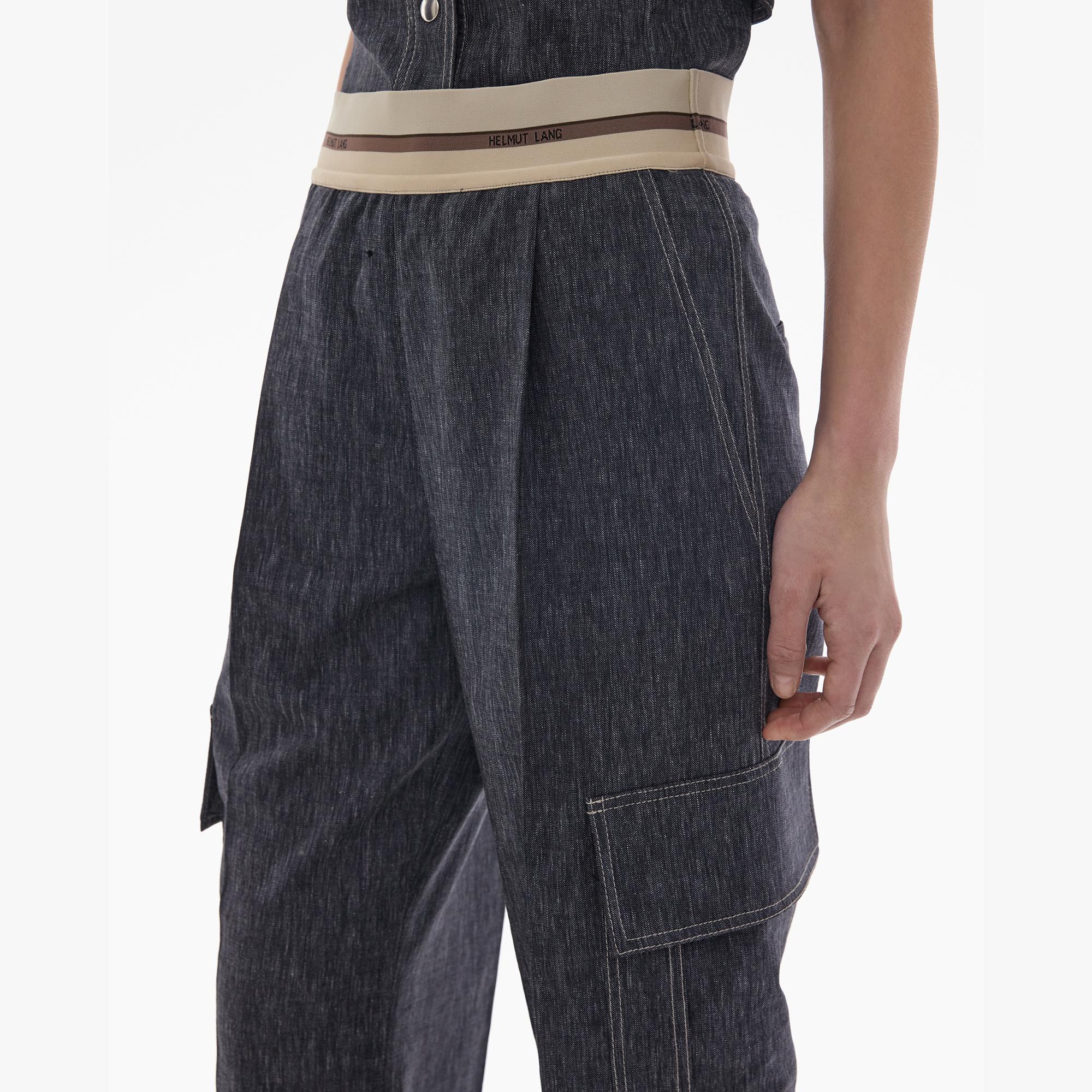 The Helmut Lang Pull-On Pant is a wide-leg style in a blended stretch linen twill with a drawstring elasticized waistband, side zip, and cargo pockets.