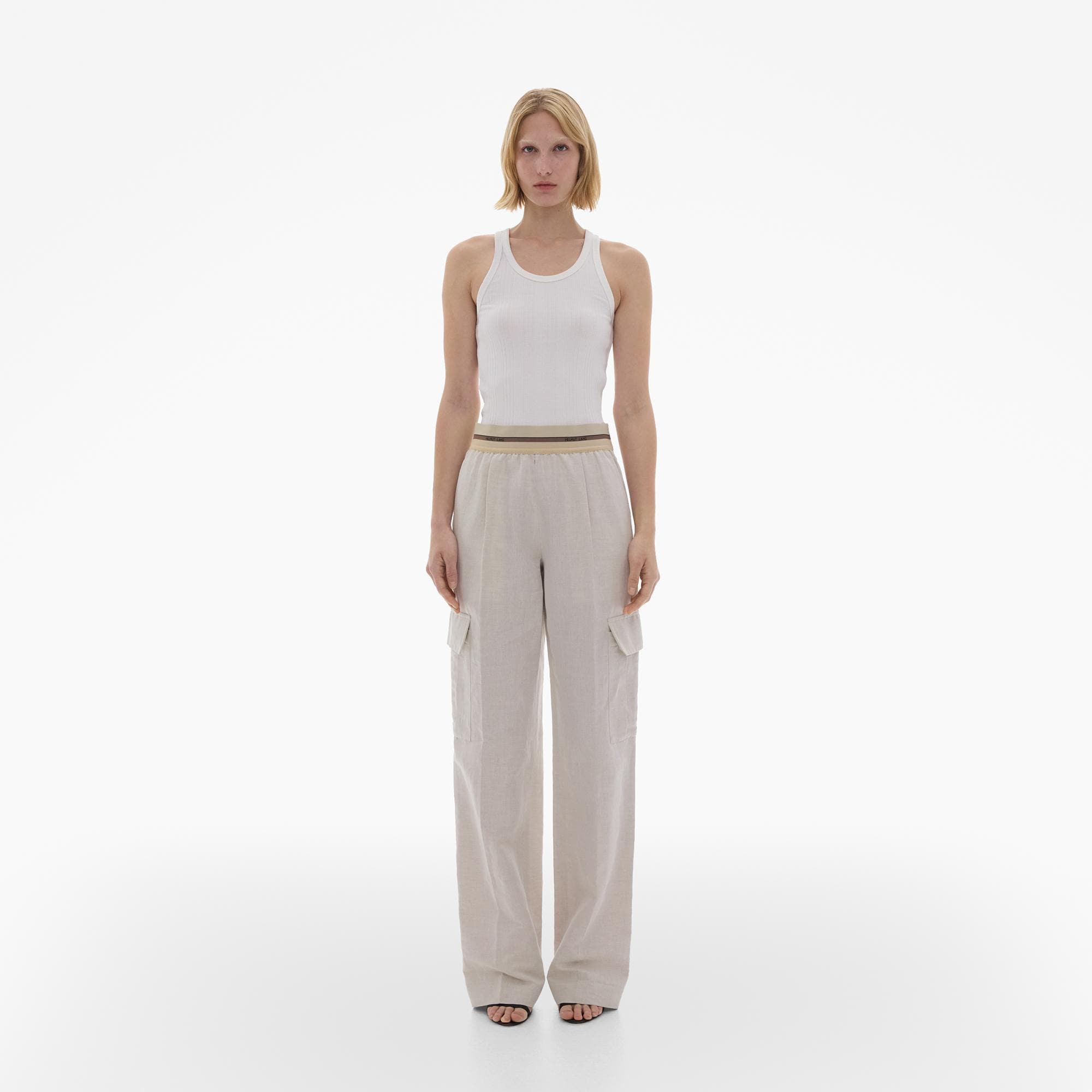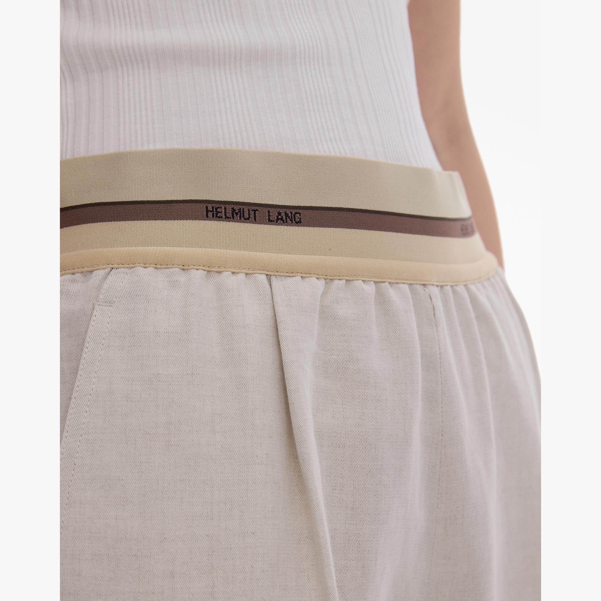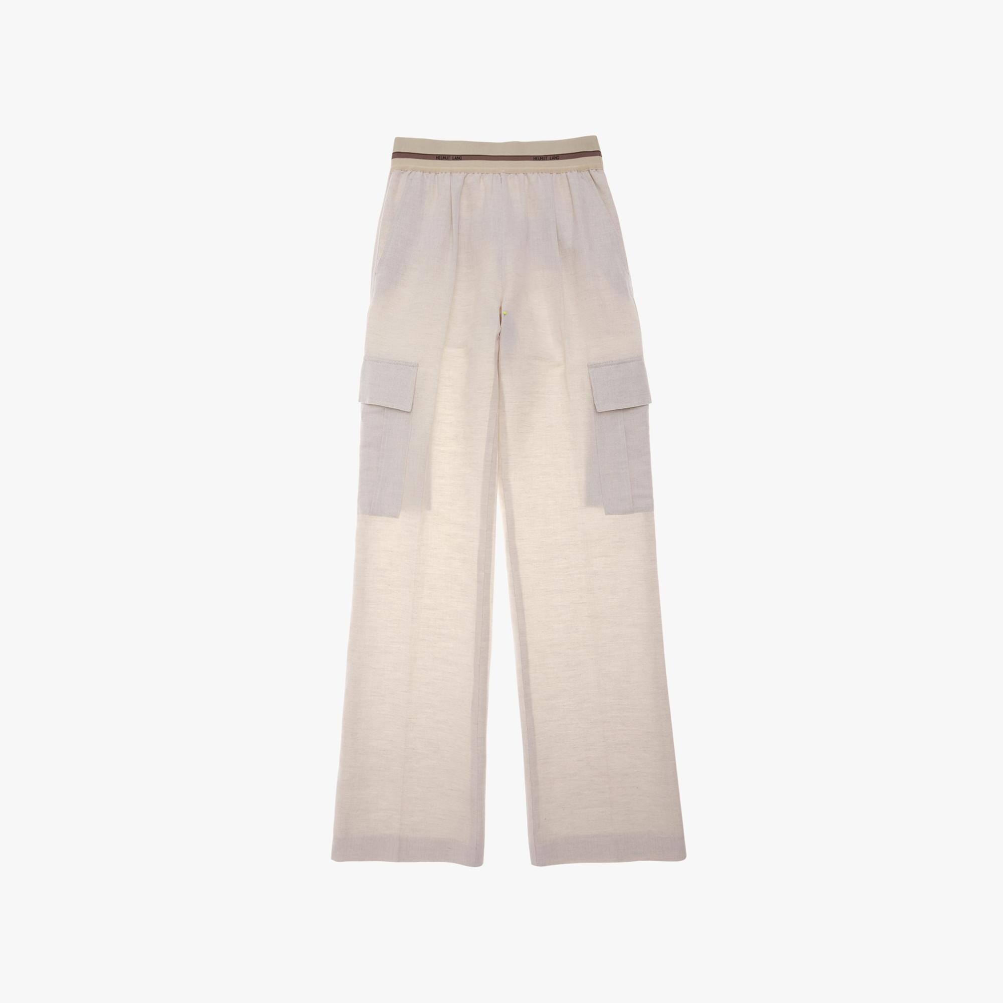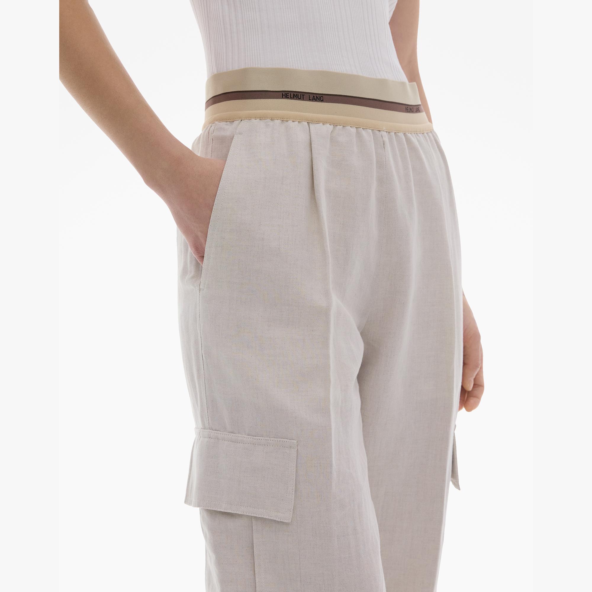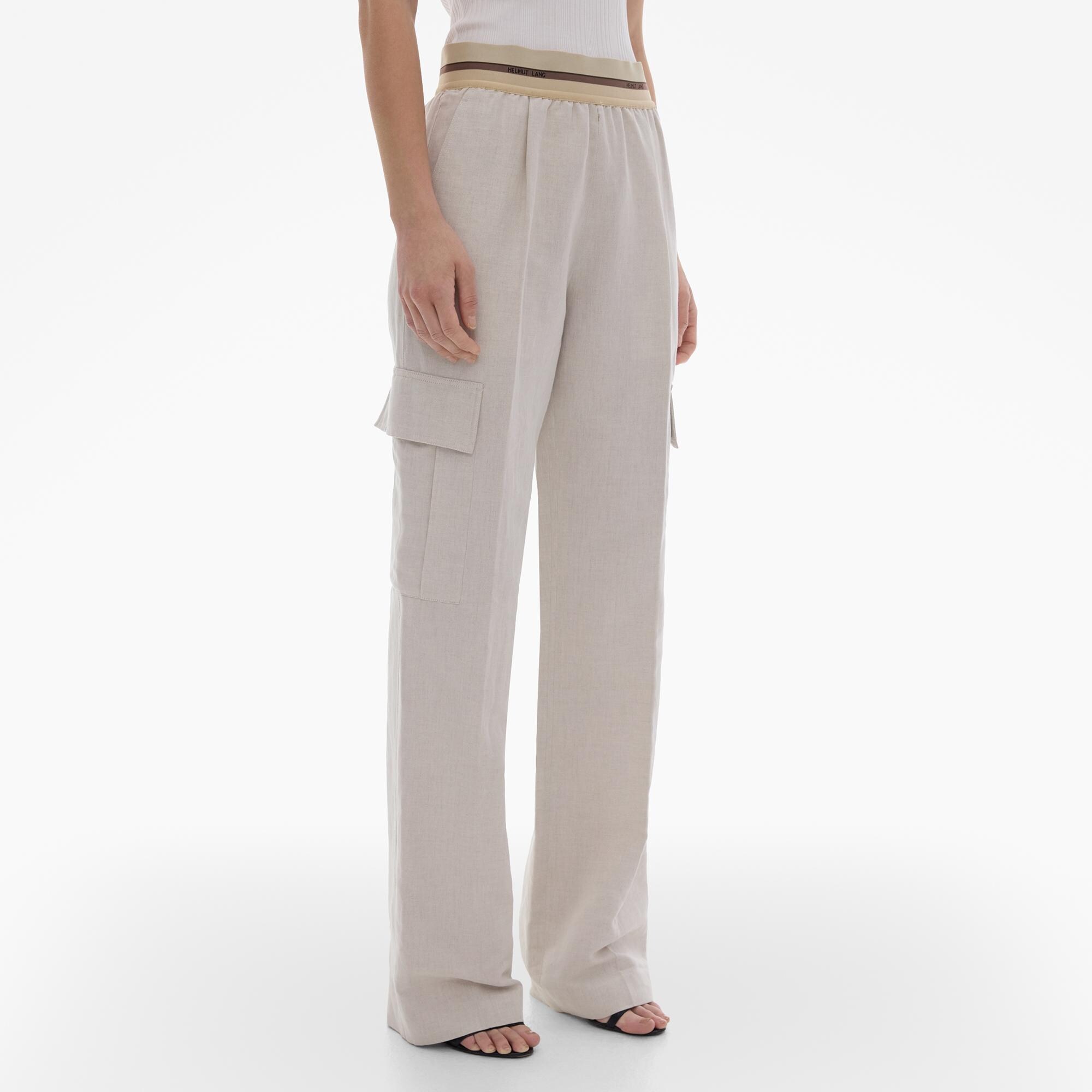 The Helmut Lang Pull-On Pant is a wide-leg style in a cotton-linen with a drawstring elasticized waistband, side zip, and cargo pockets.