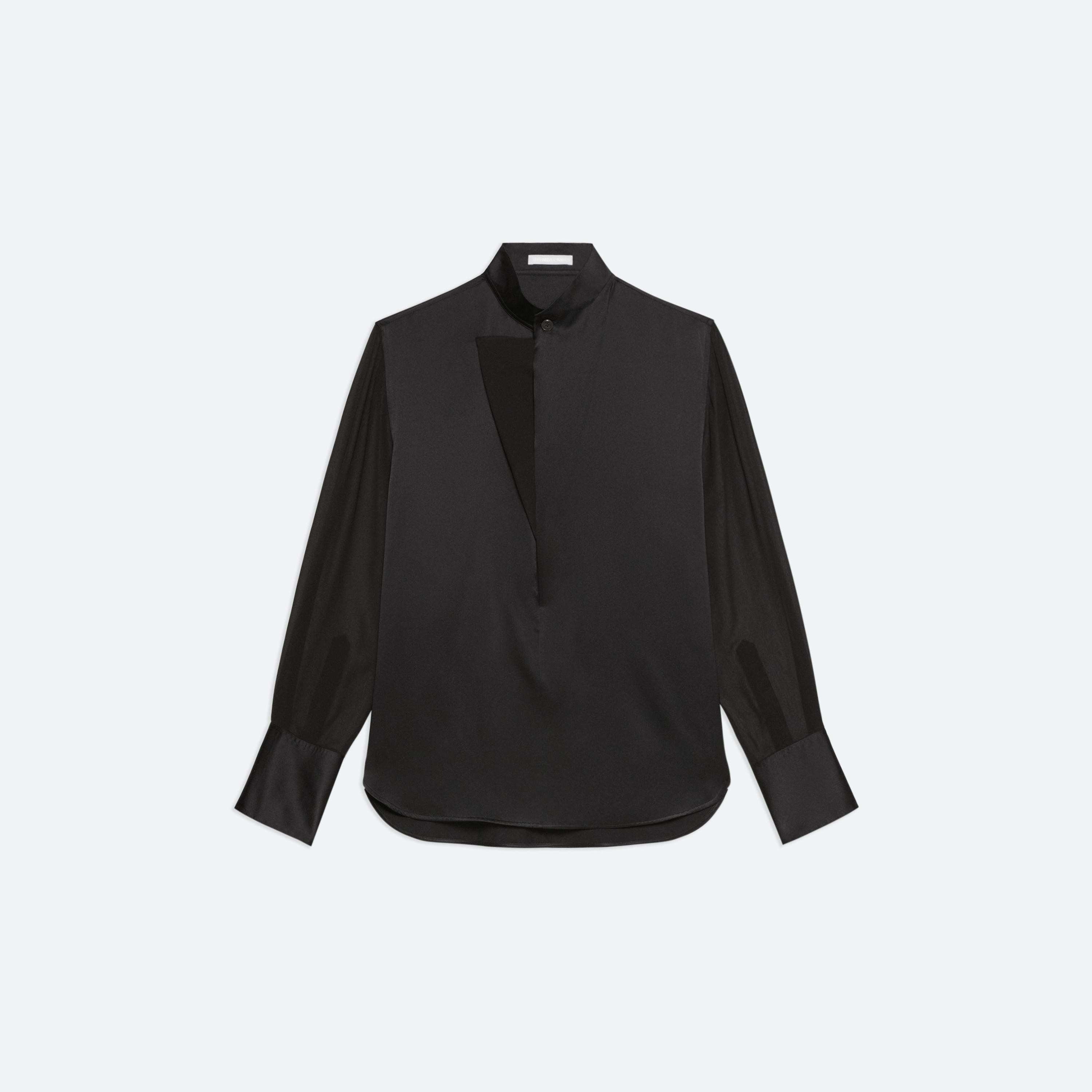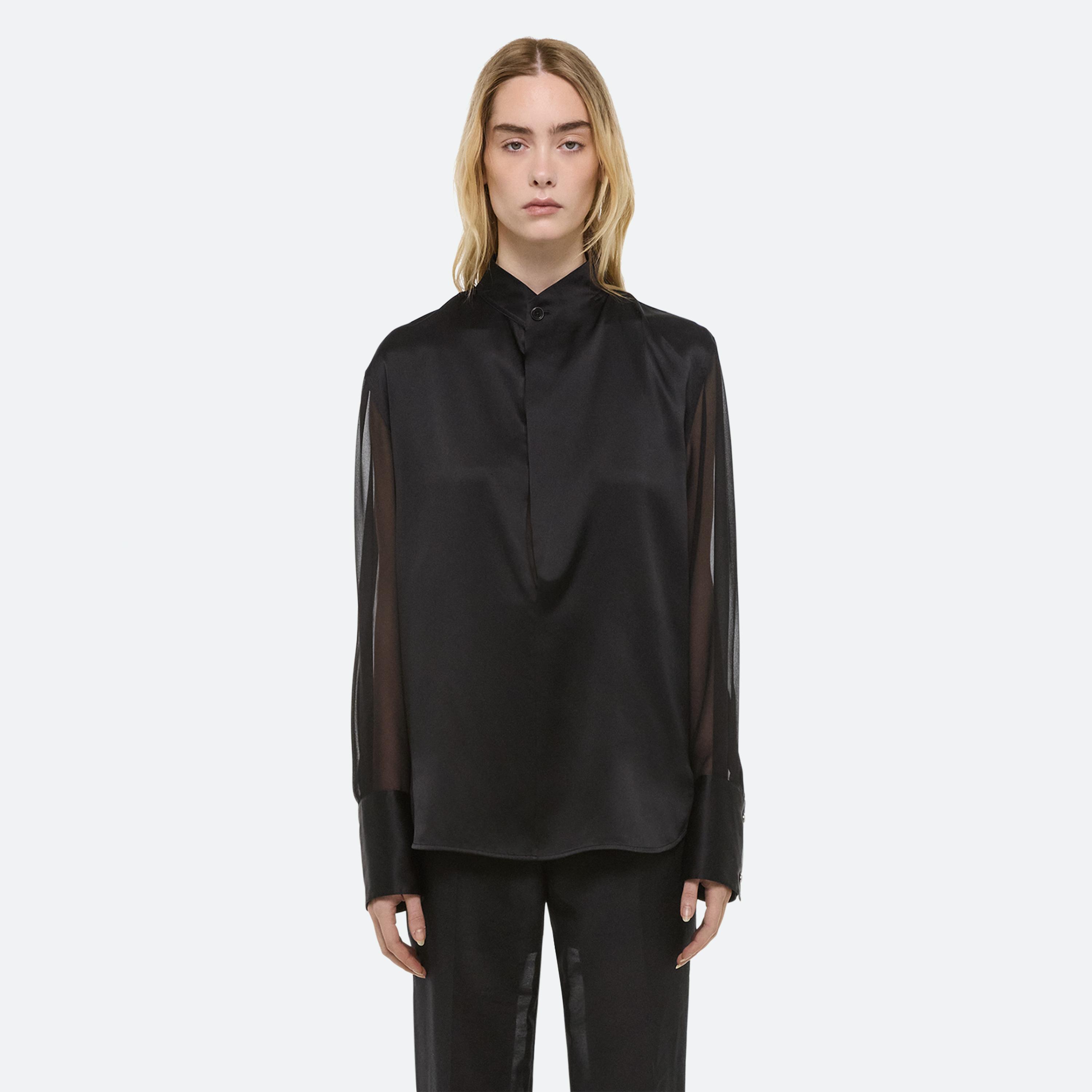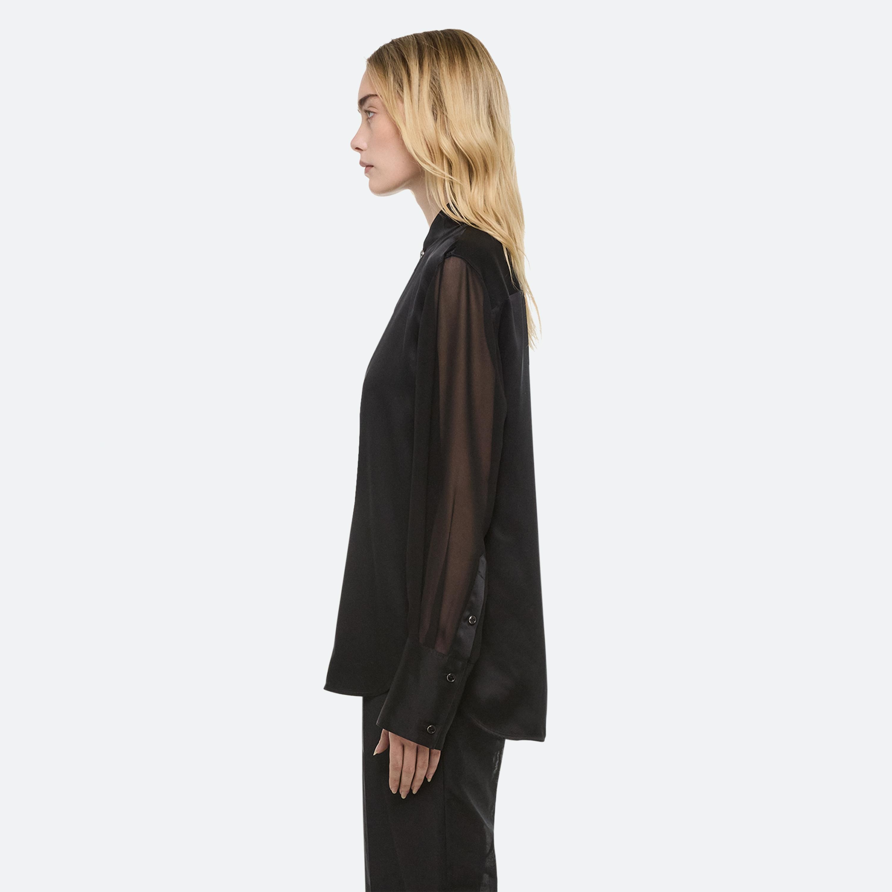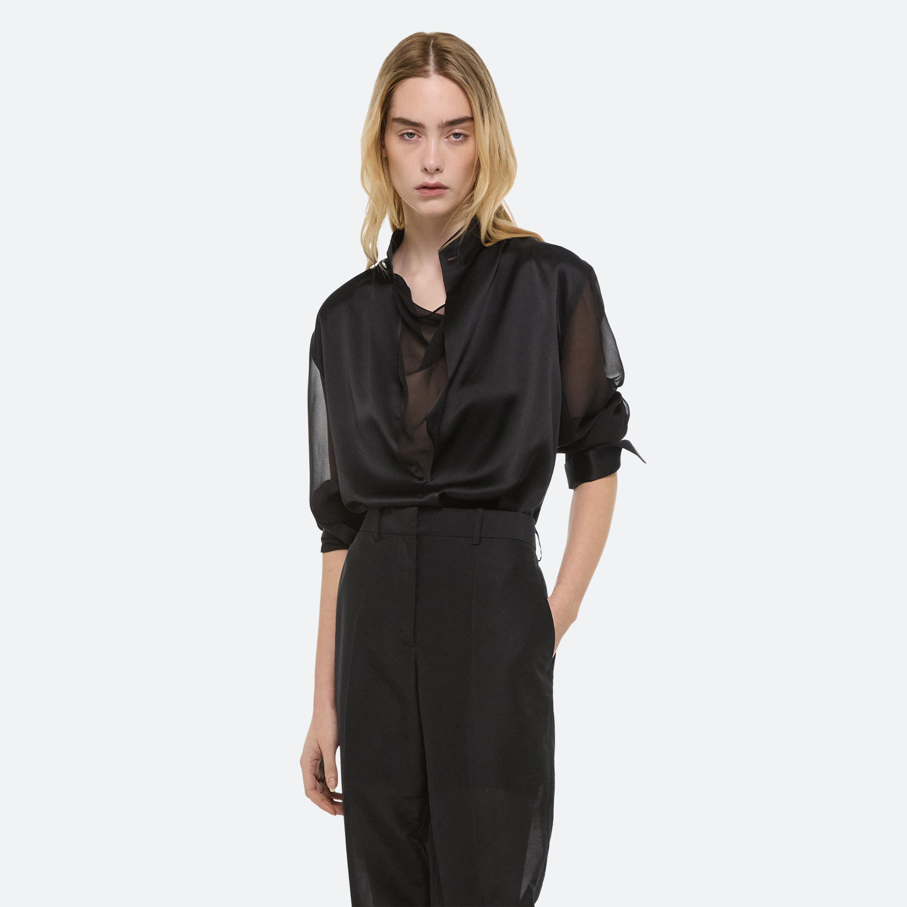 Silk shirt with sheer sleeves. Open the collar to reveal a draped cowl neckline in sheer chiffon.