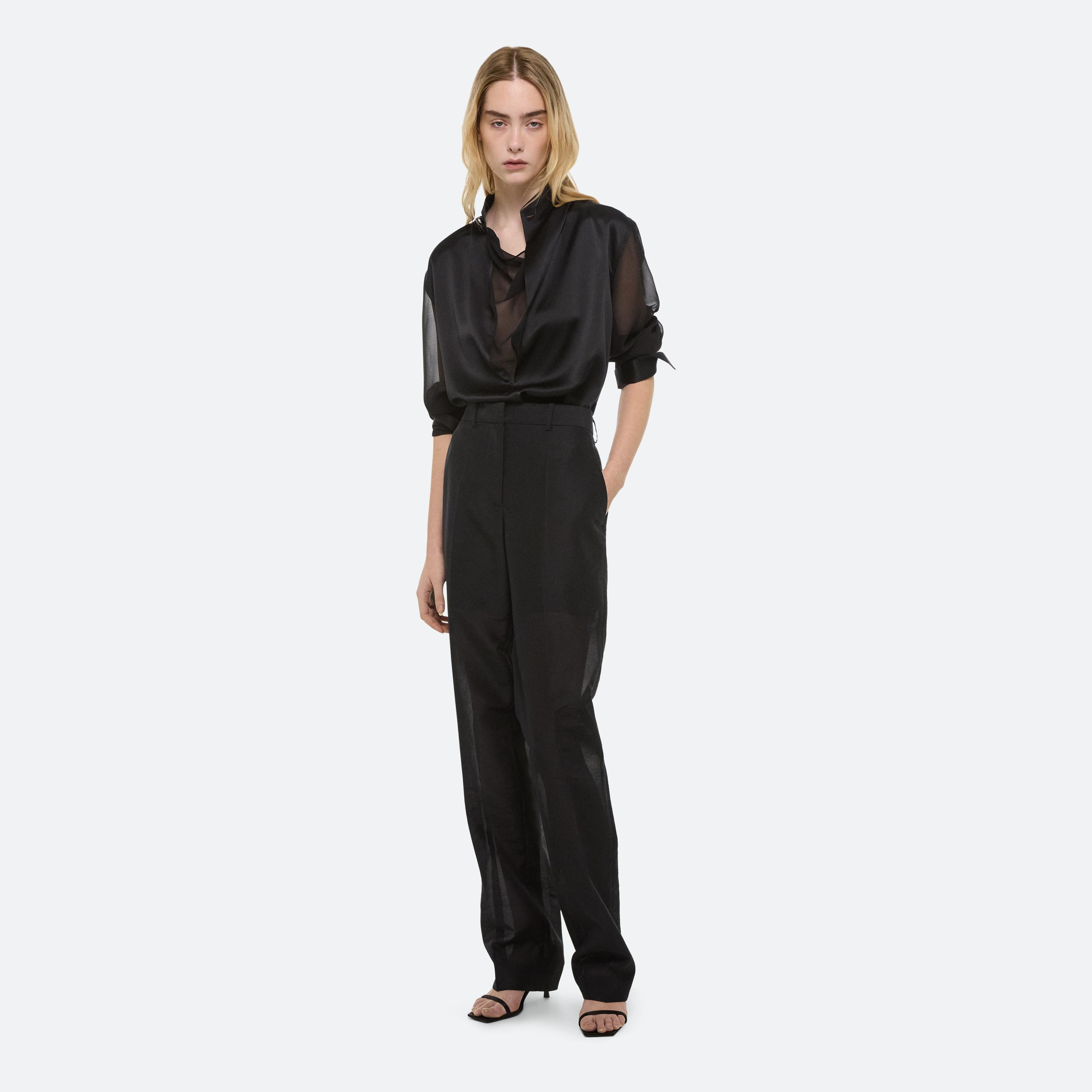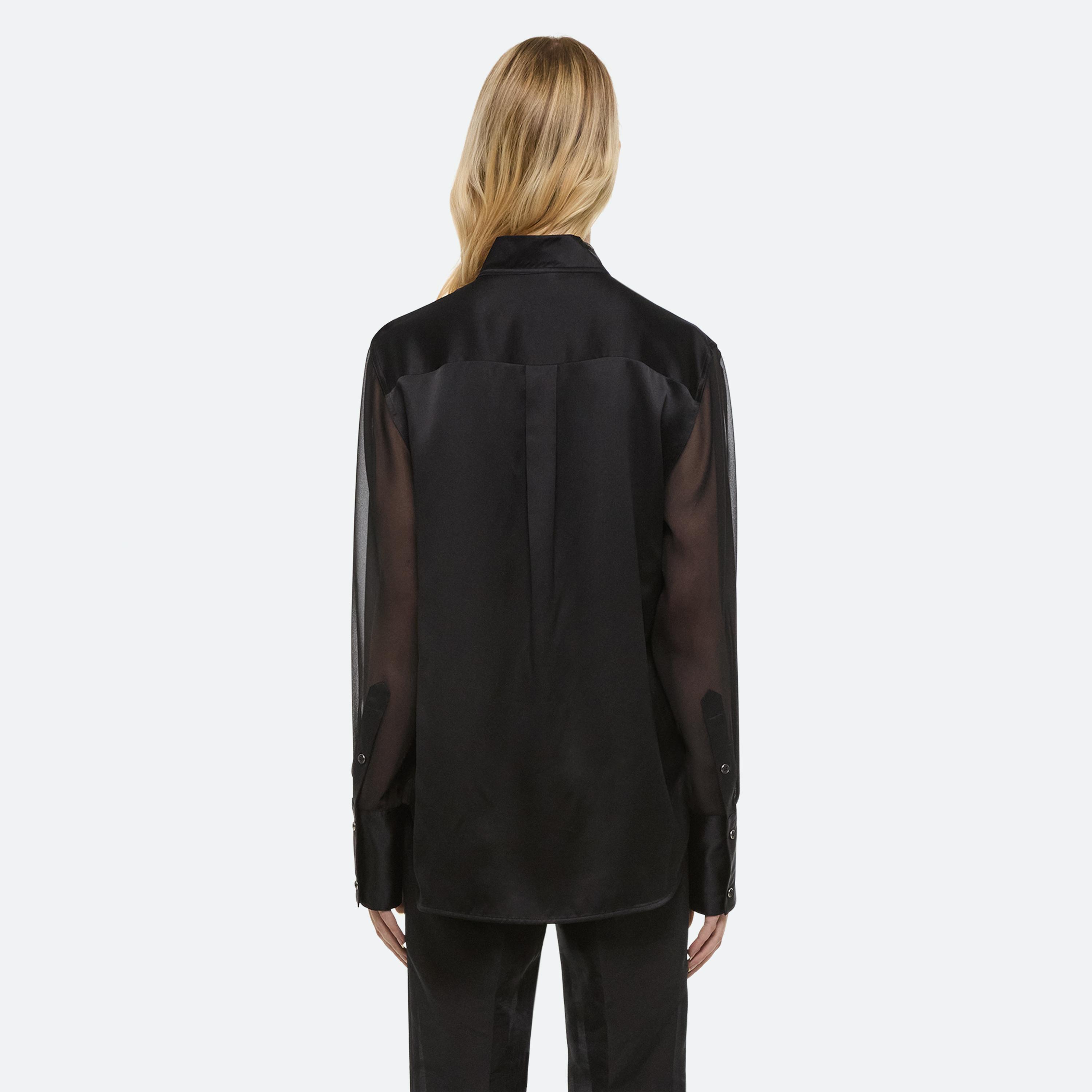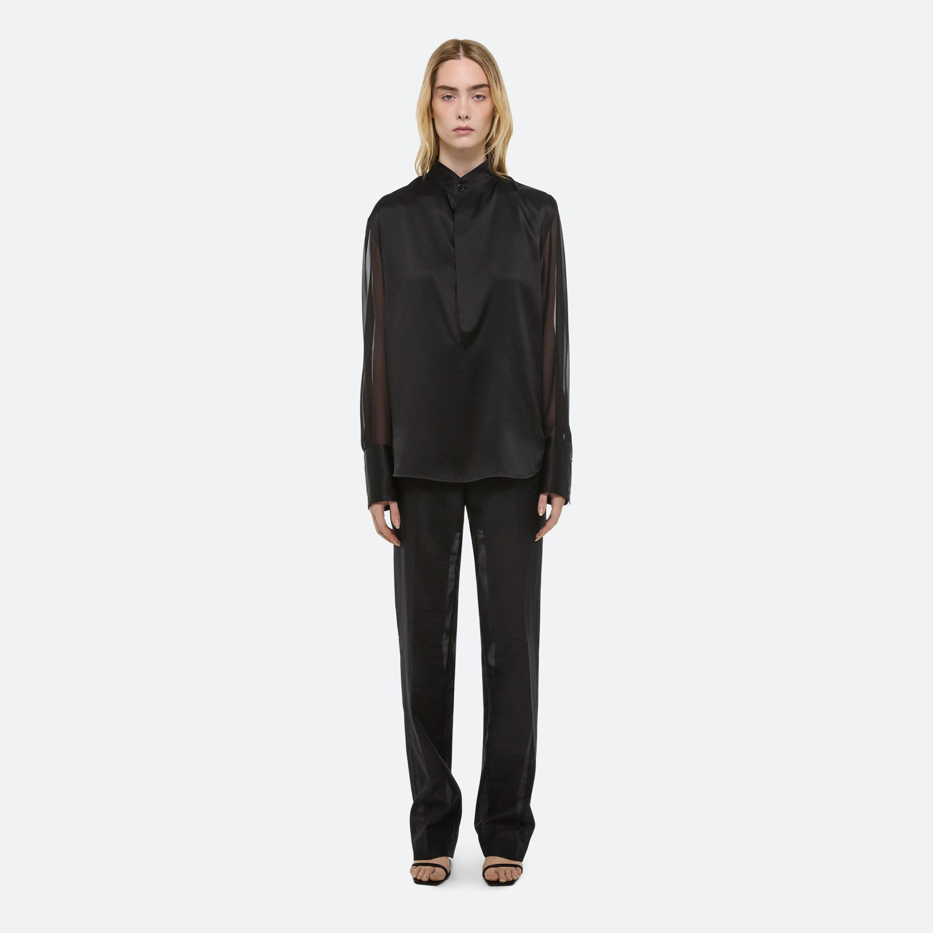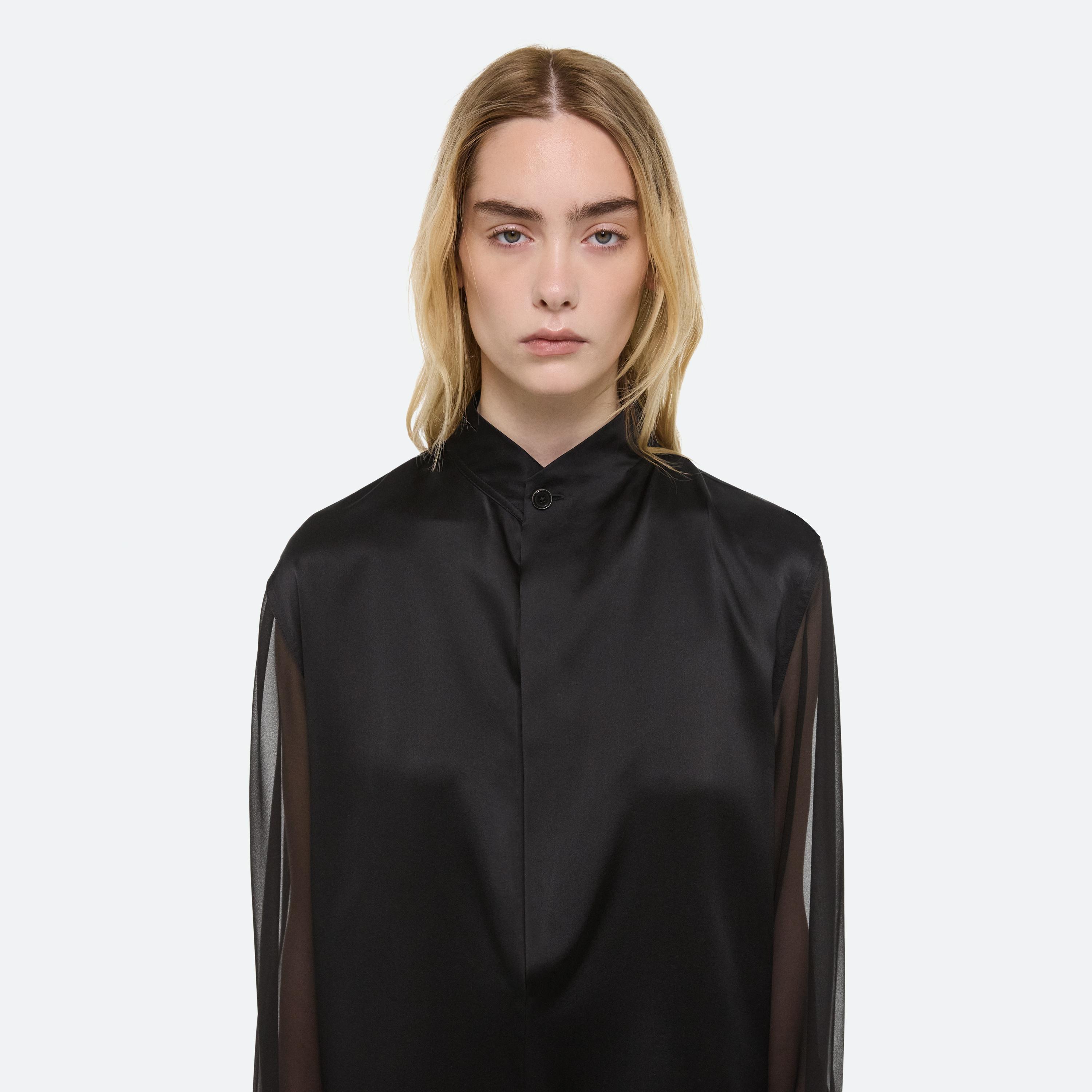 Silk shirt with sheer sleeves. Open the collar to reveal a draped cowl neckline in sheer chiffon.