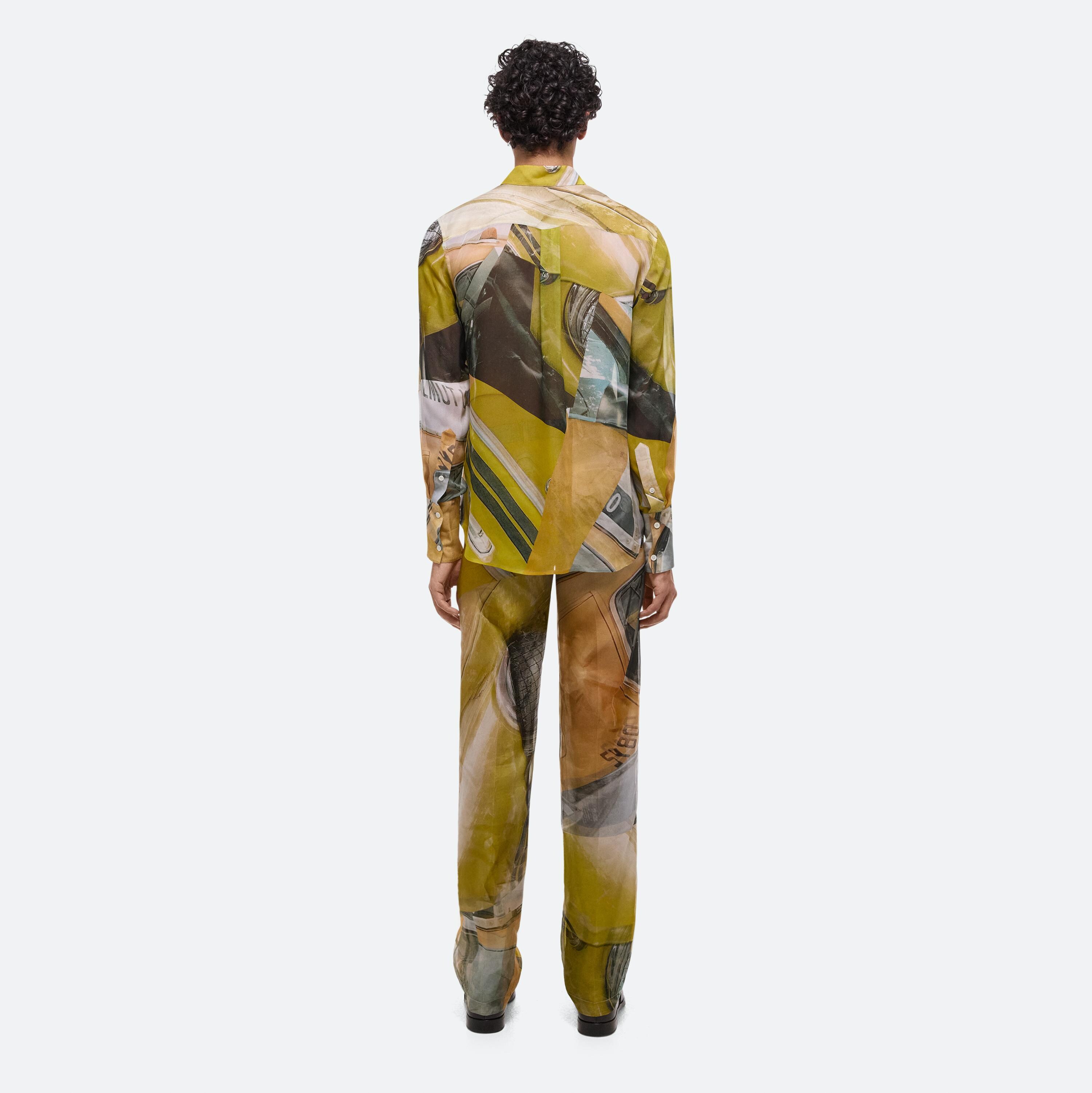 Relaxed unisex silk shirt with a custom developed car print. This garment was designed with many body types and gender expressions in mind