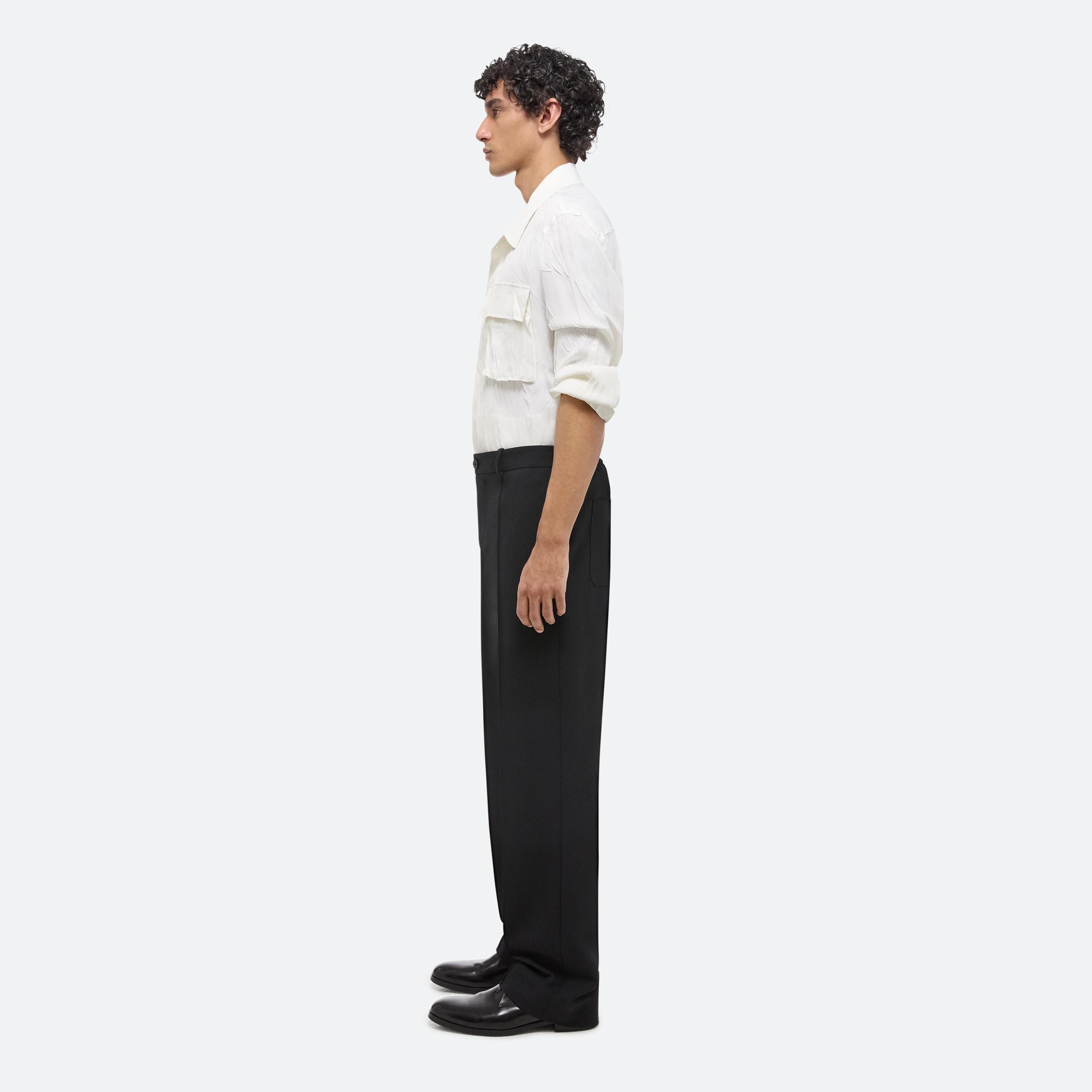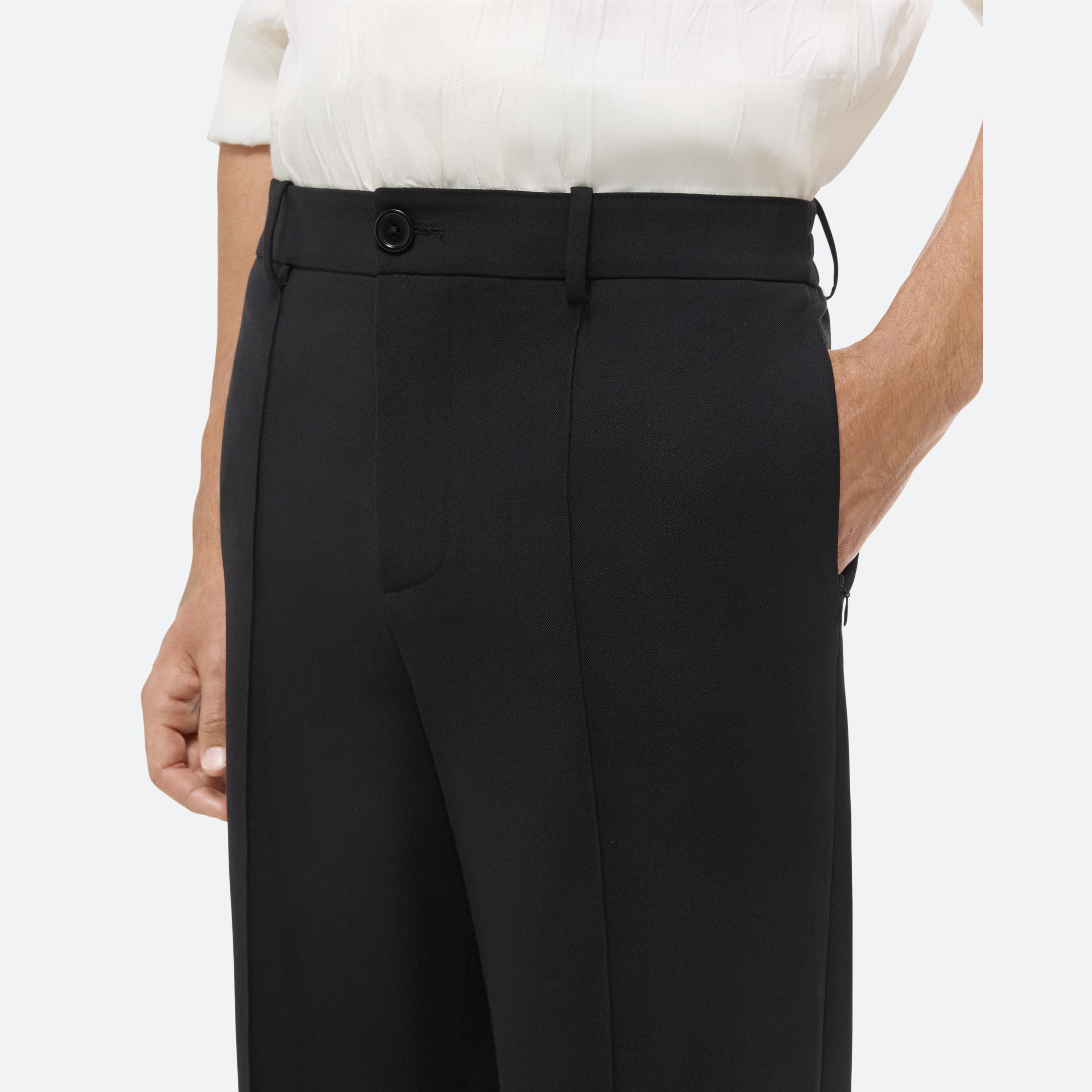 Relaxed straight leg trouser in stretch tropical wool with partially elasticized waistband.