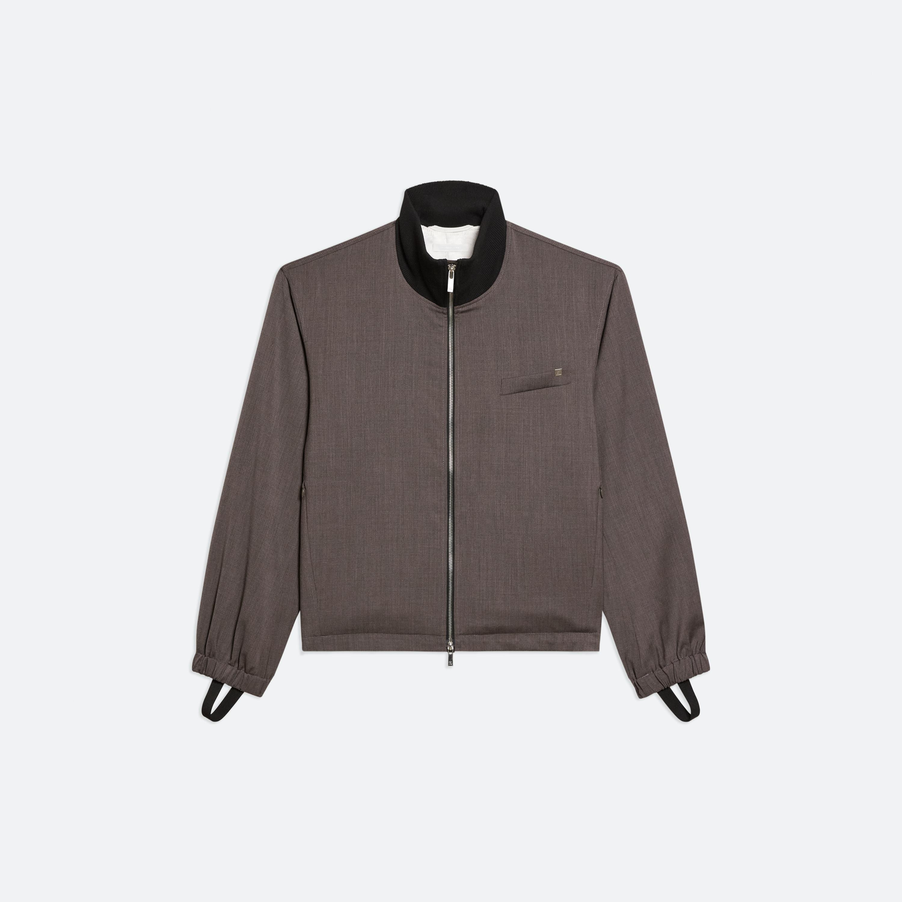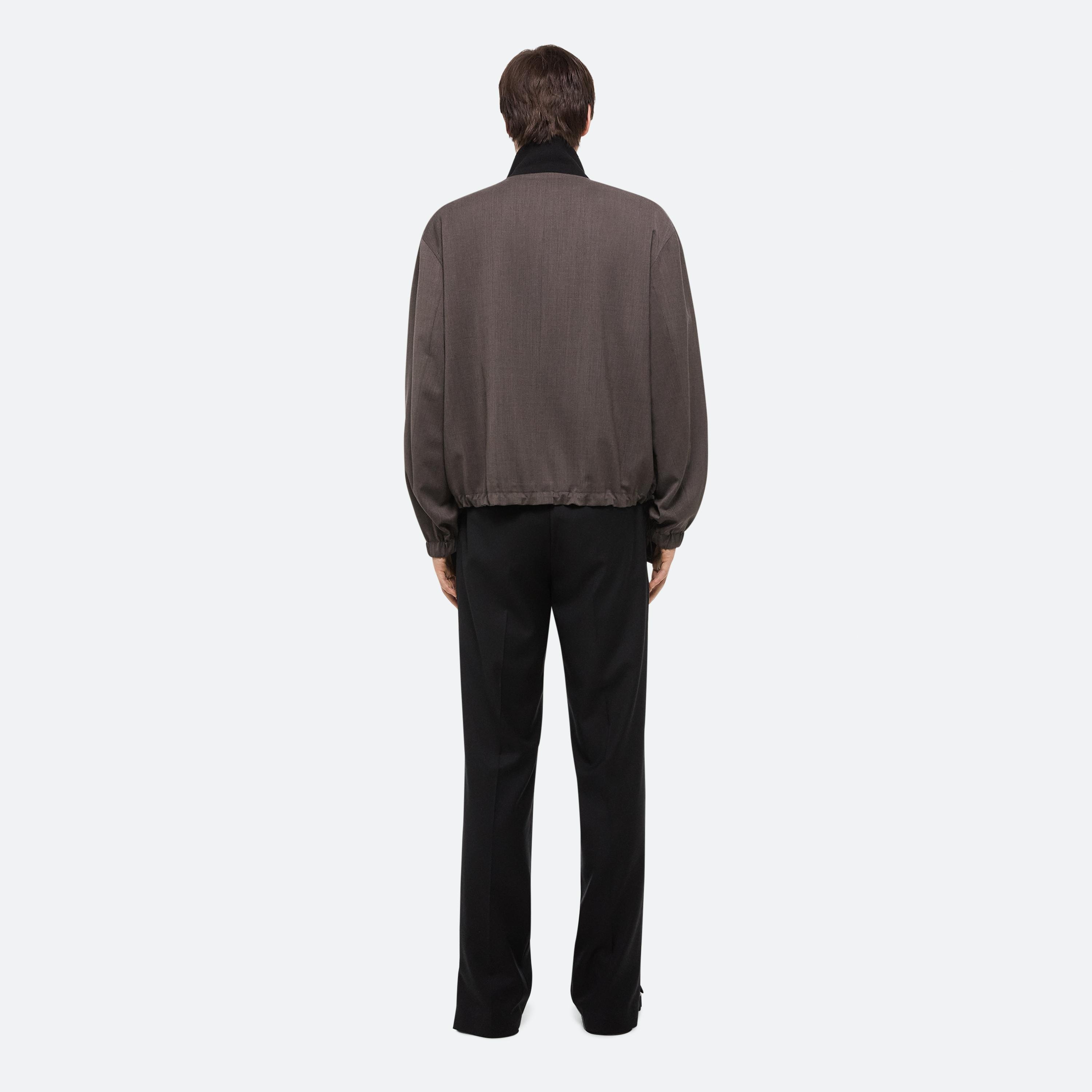 Relaxed bomber jacket in classic wool suiting. This zip-up style features a ribbed stand collar and classic utilitarian details. Cinch the bungee cord in the hem to emphasize the bomber shape. Matches the Tapered Pull-On Trousers.