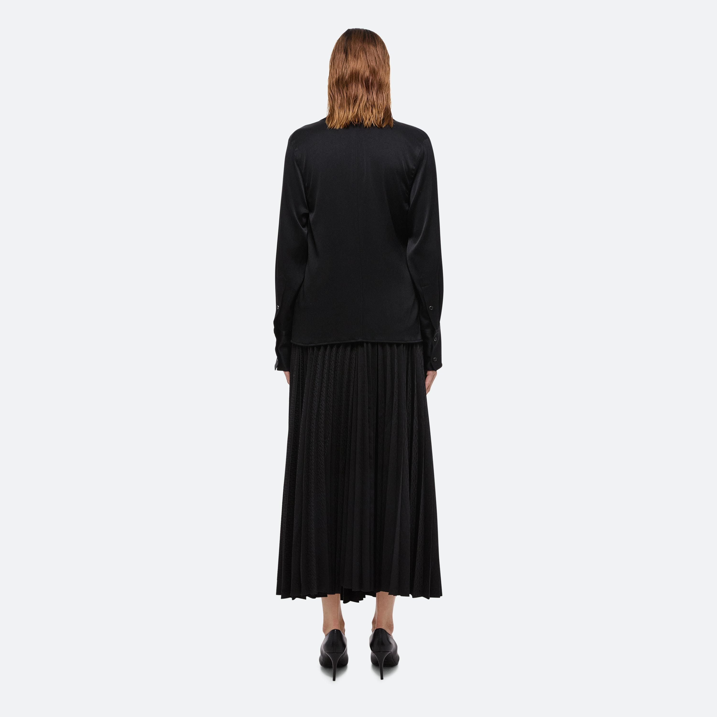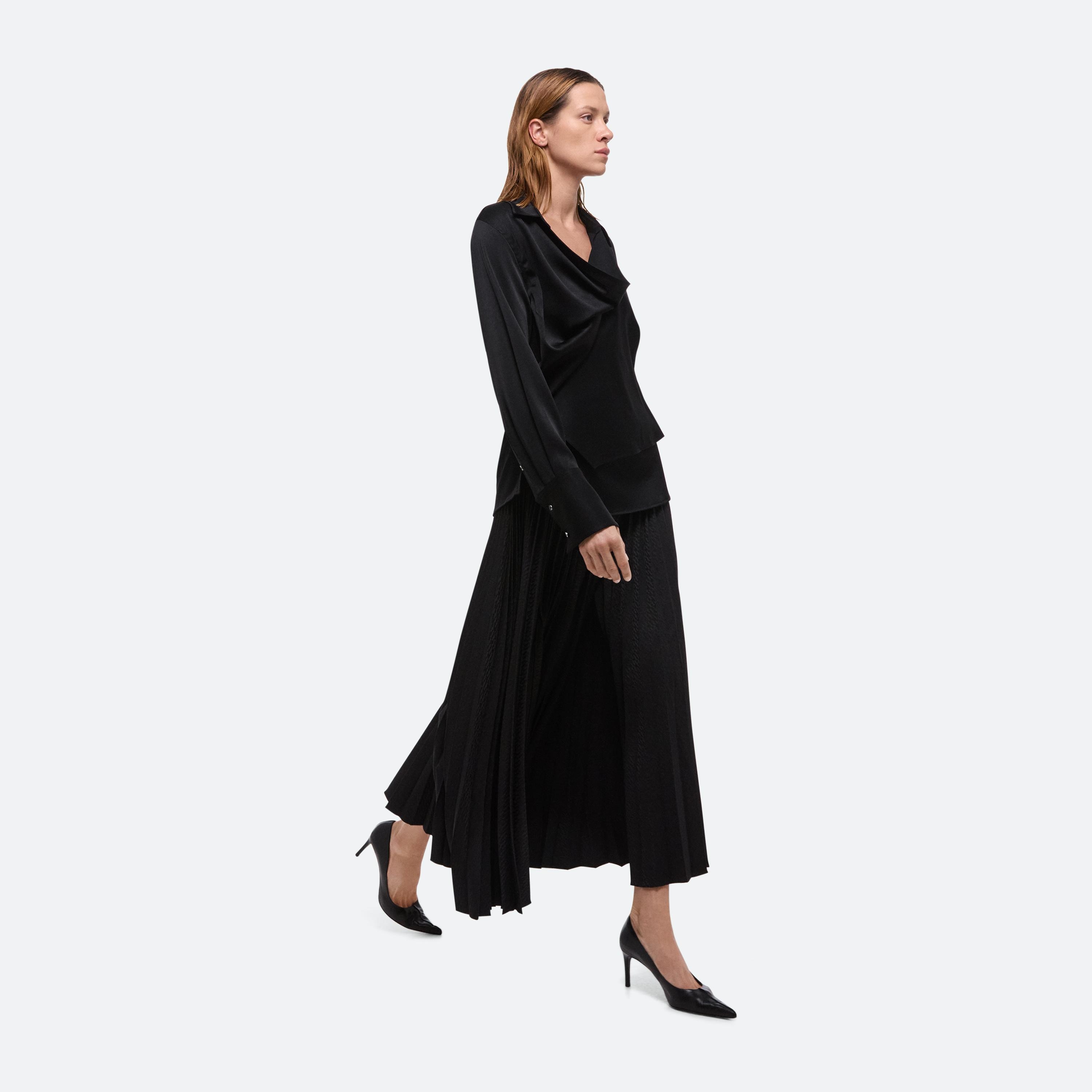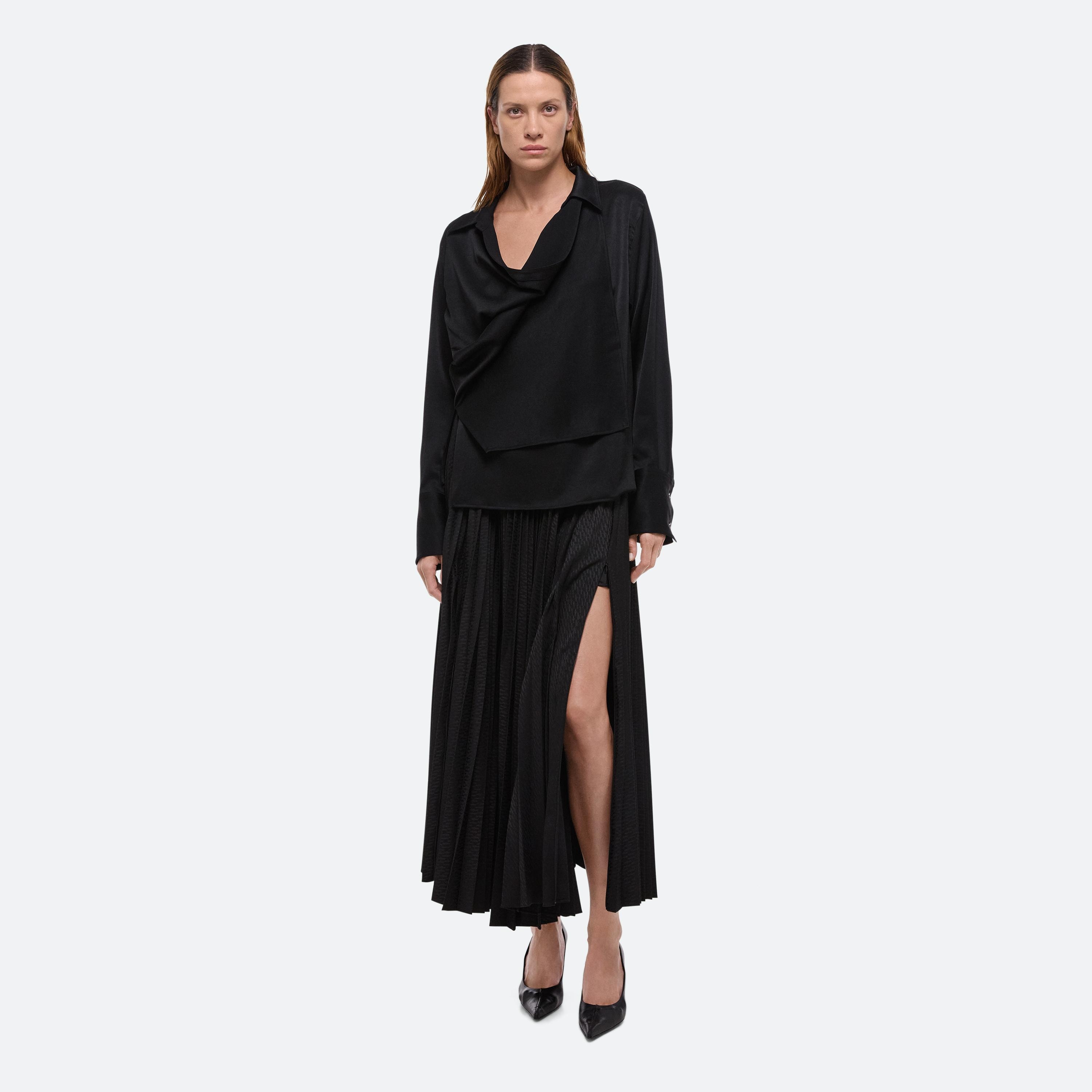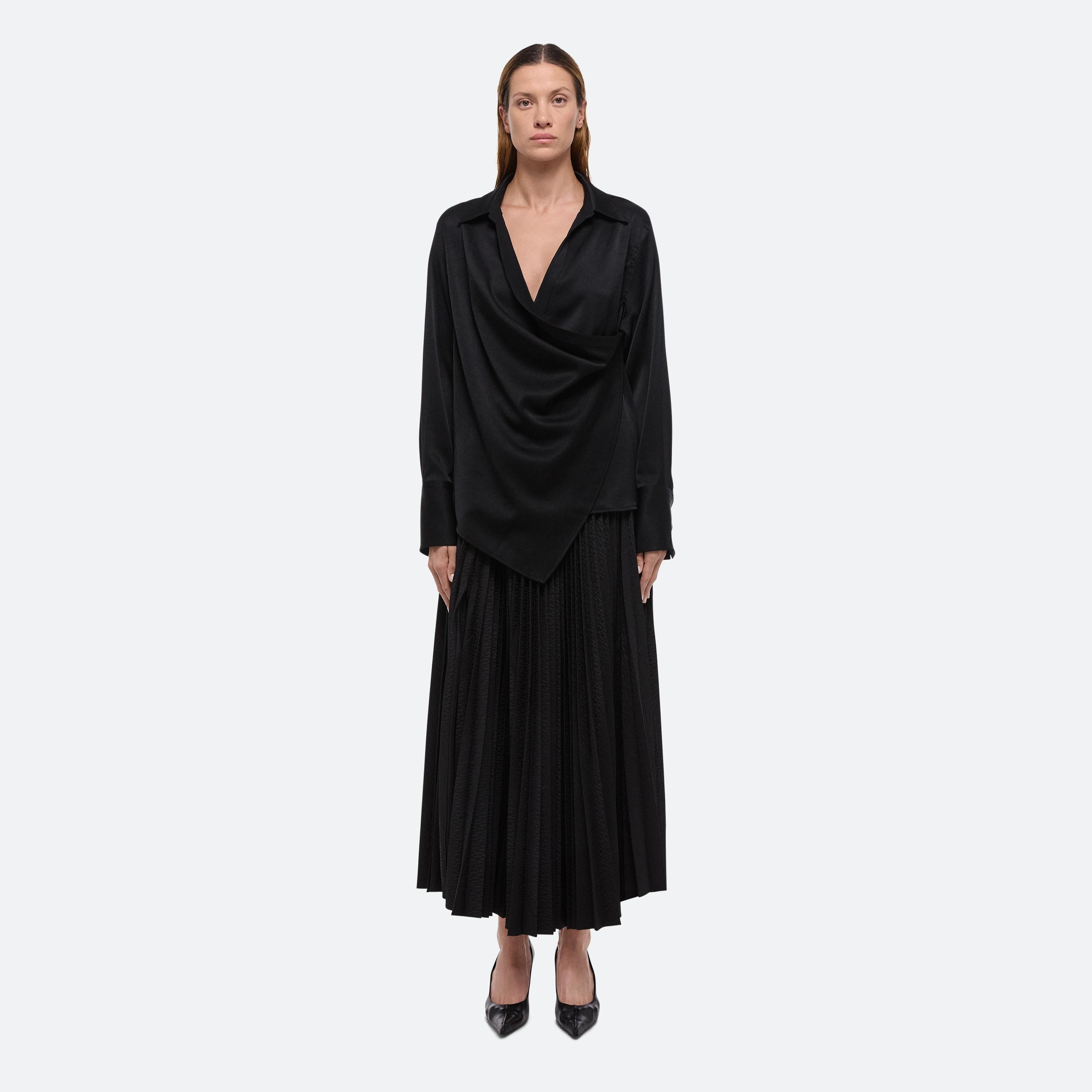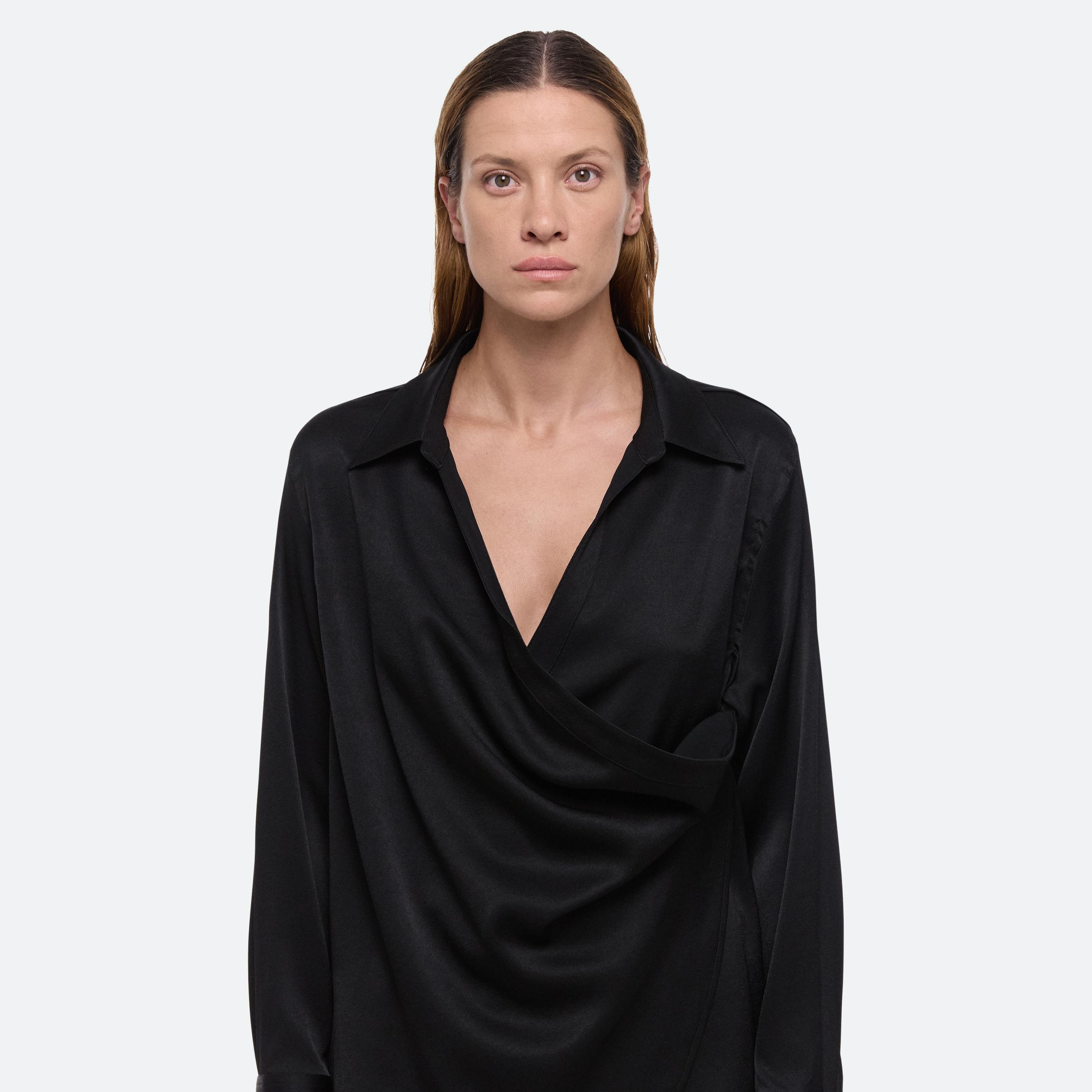 Wrap-front shirt in a fluid satin crepe. Adjust the depth of the wrap to control the amount of coverage, wear as a cowl neck, or leave open for a draped look.