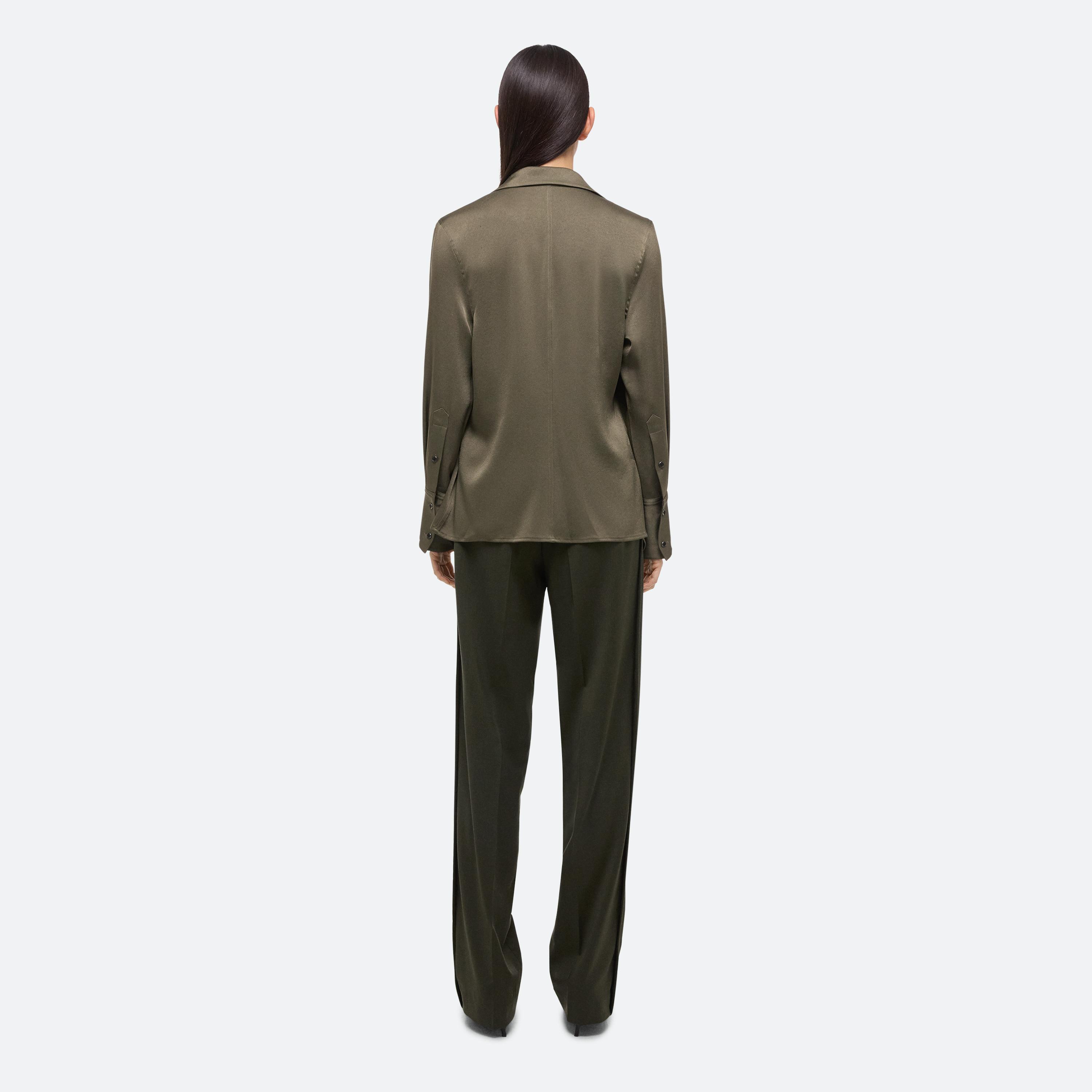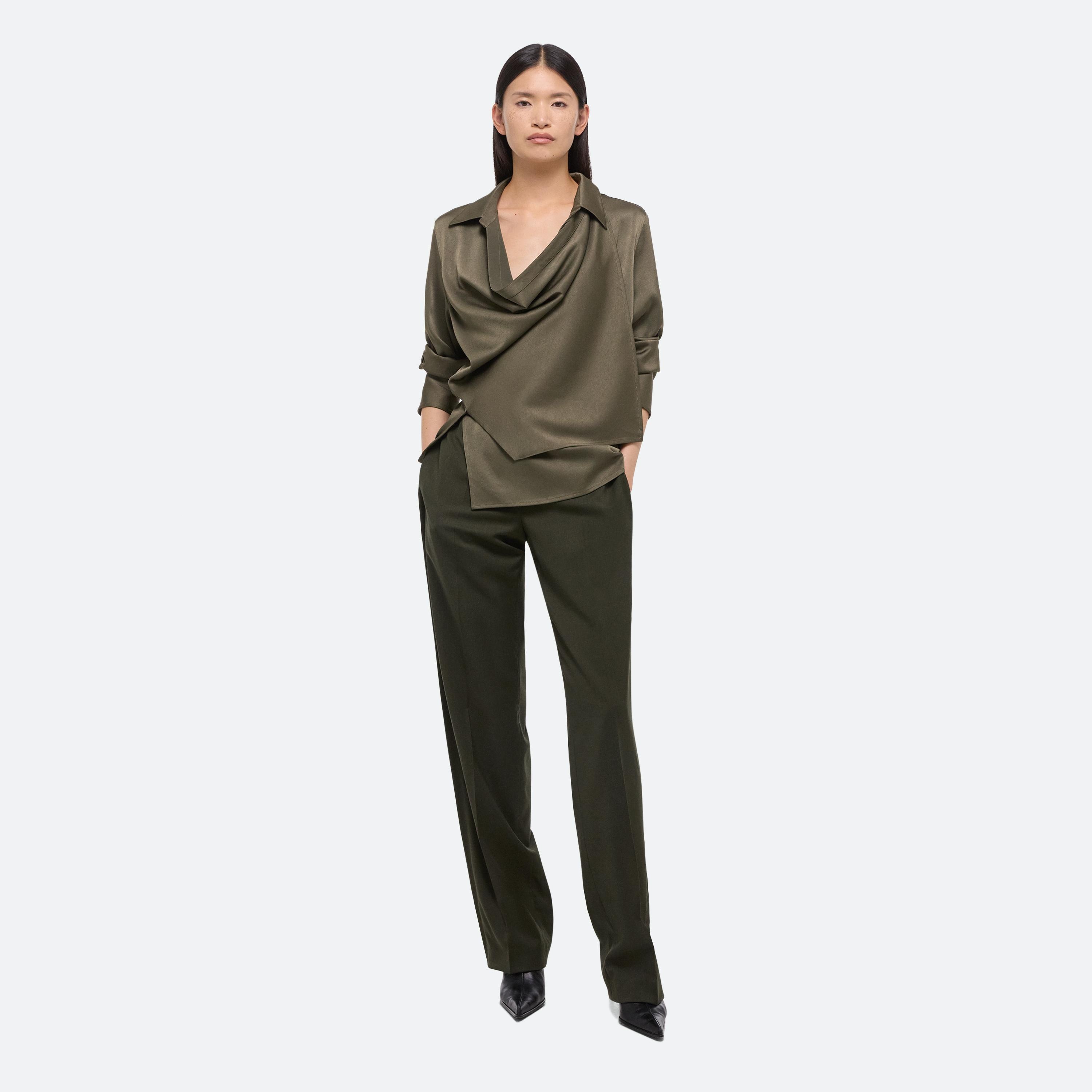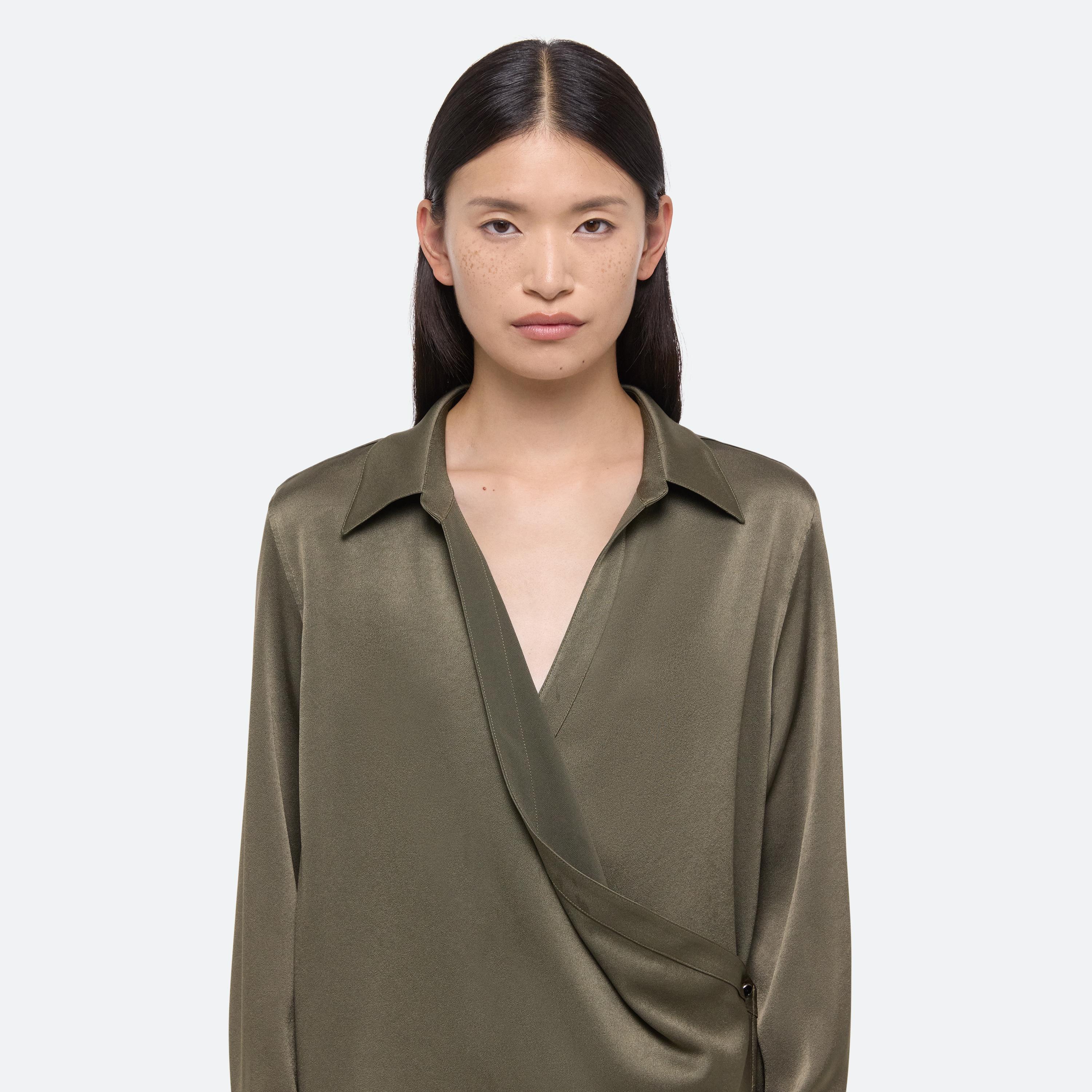 Wrap-front shirt in a fluid satin crepe. Adjust the depth of the wrap to control the amount of coverage, wear as a cowl neck, or leave open for a draped look.