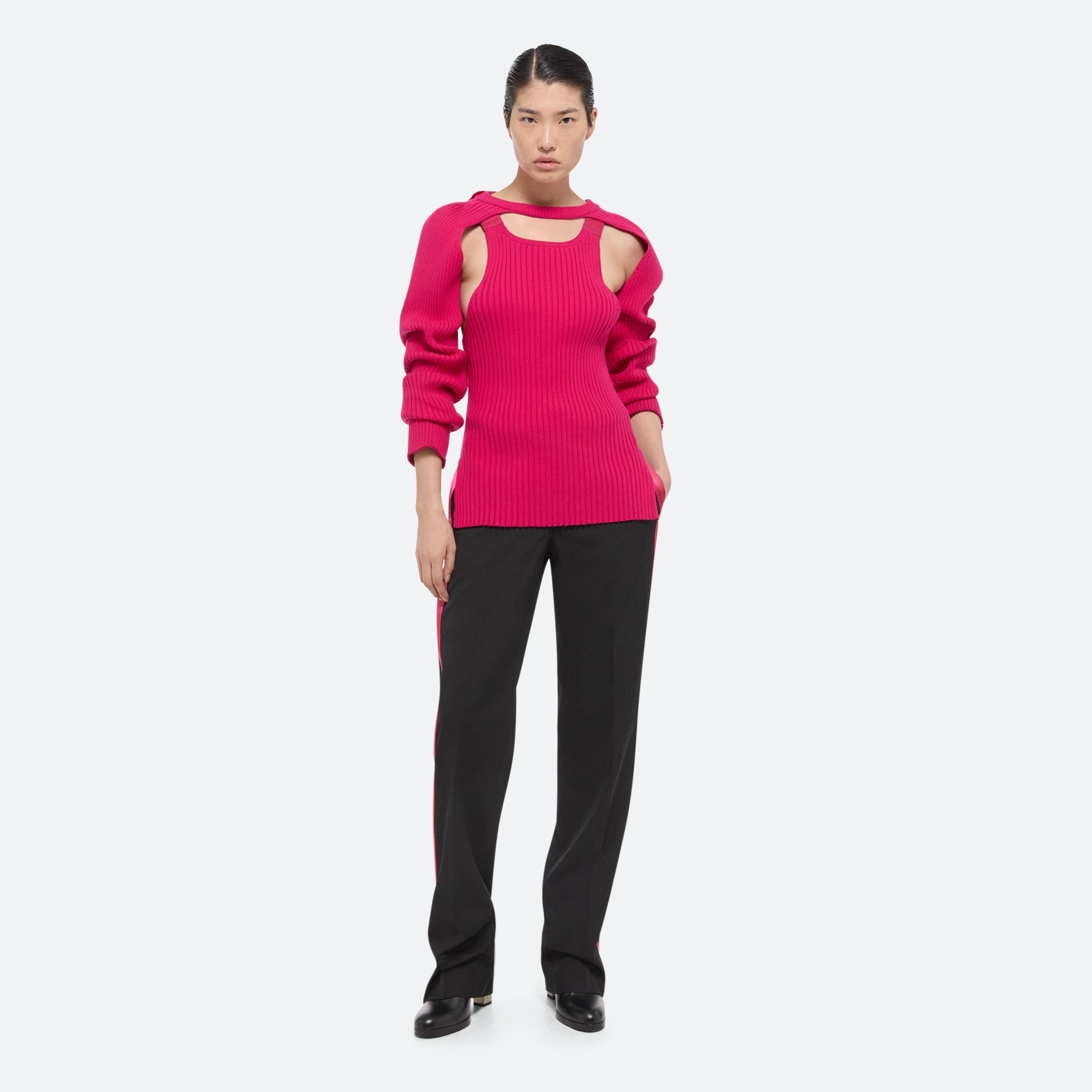 Rib shrug with seatbelt tape attached at back neck. Shrug is relaxed fit with raglan sleeves.