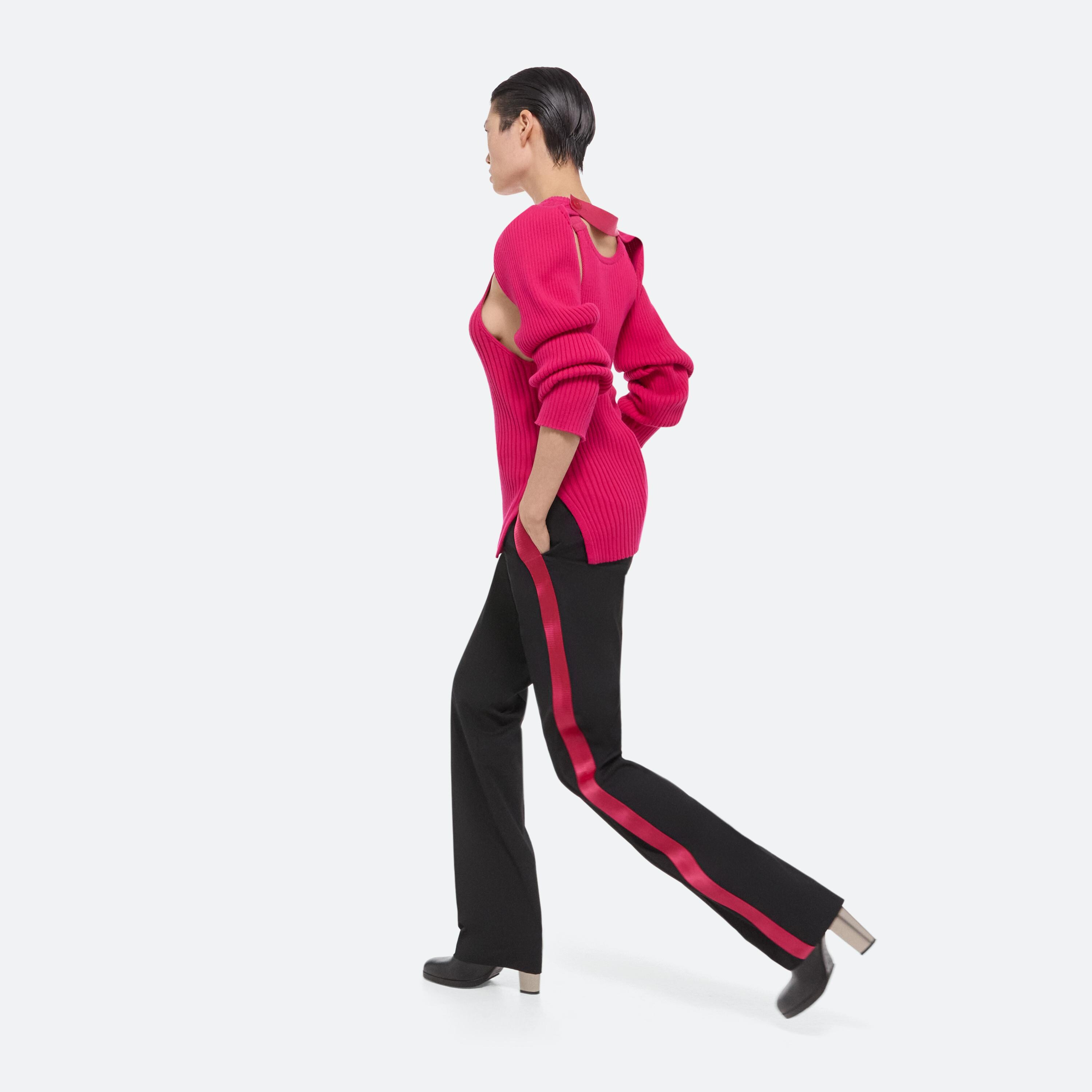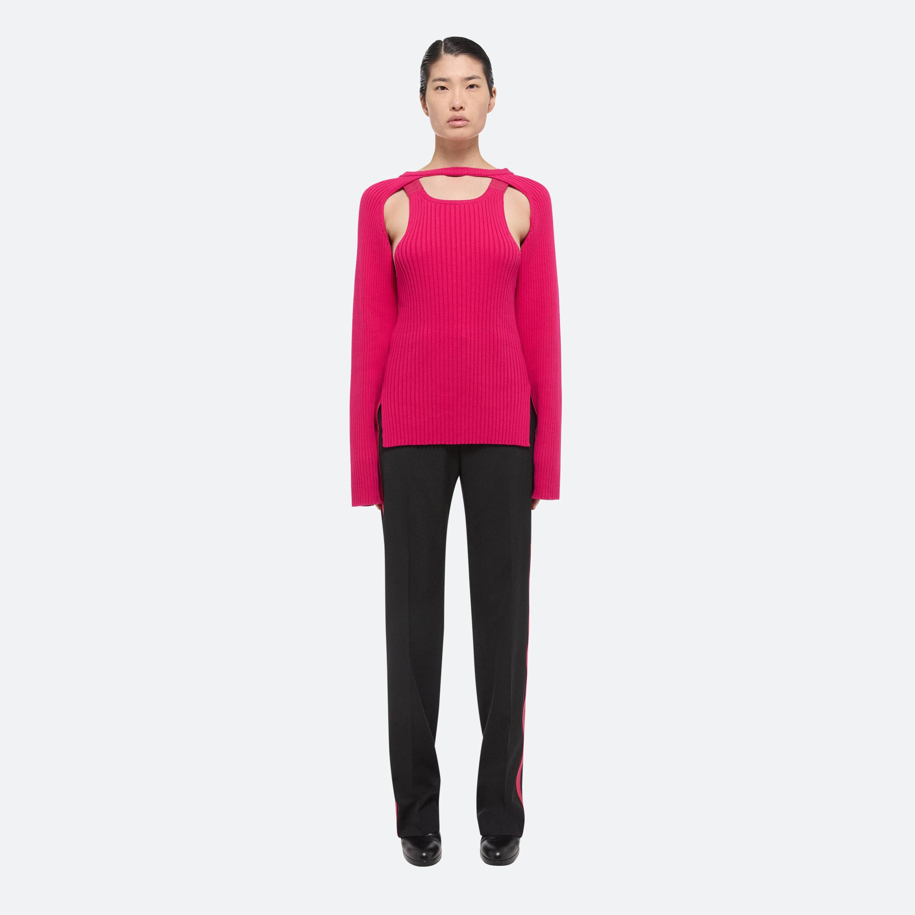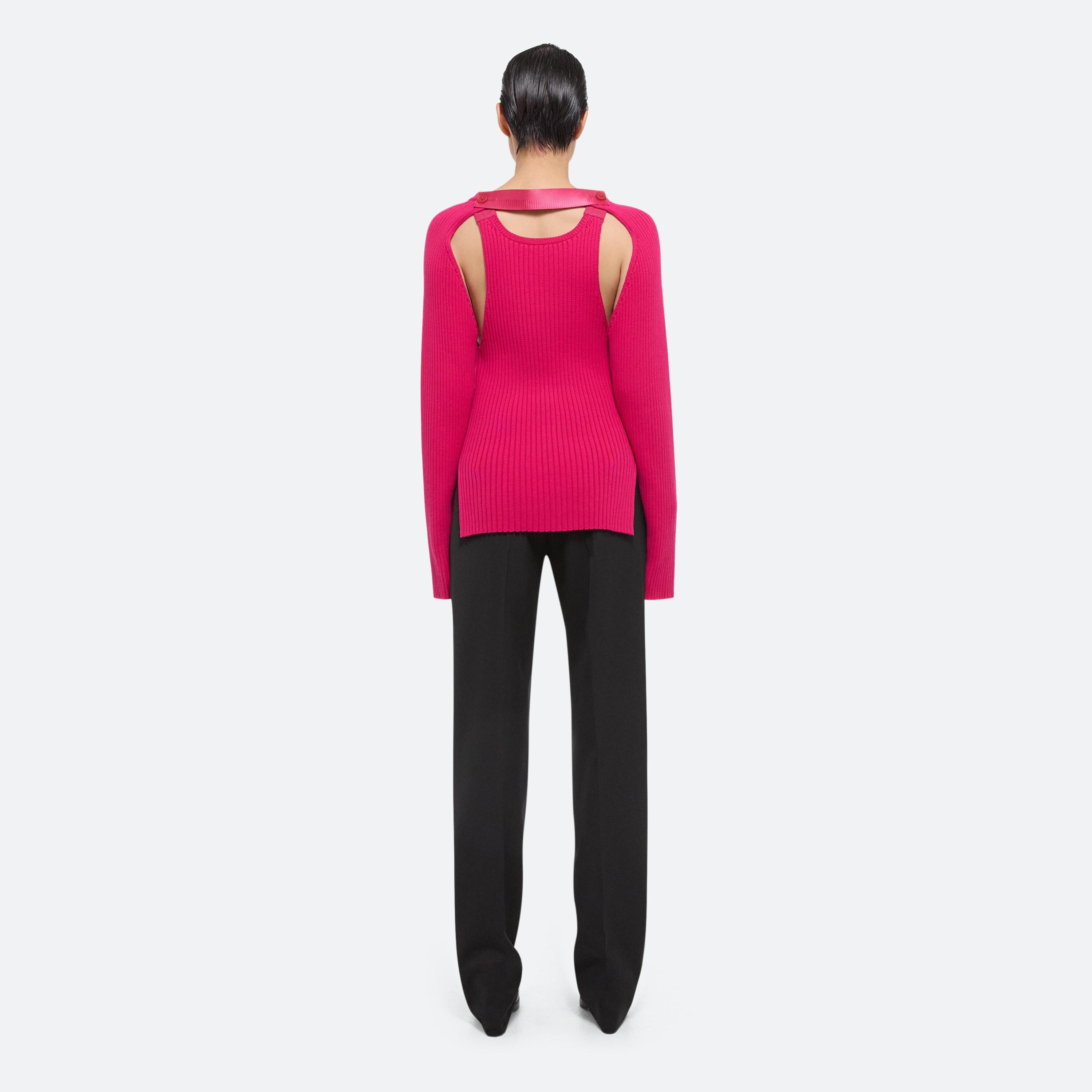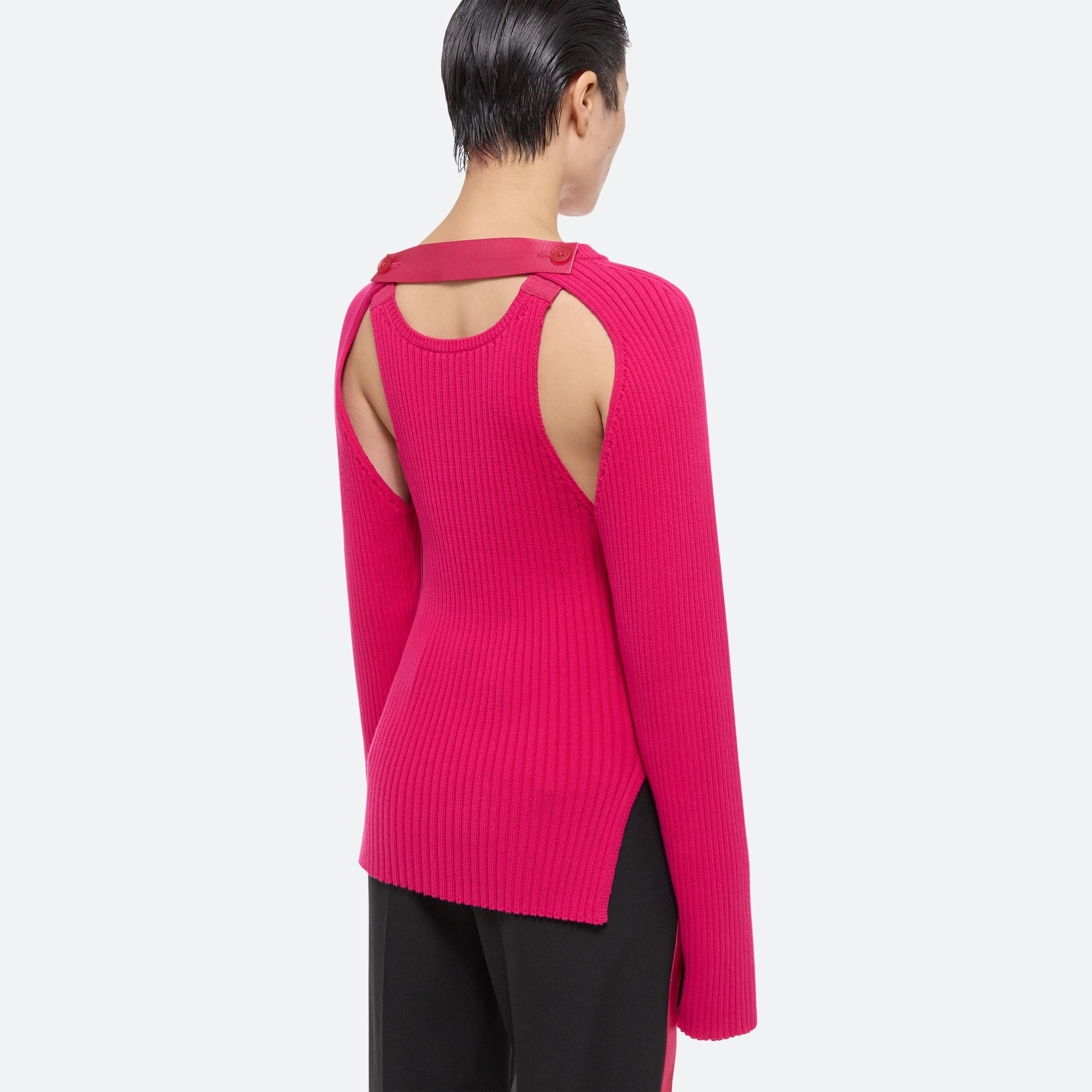 Rib shrug with seatbelt tape attached at back neck. Shrug is relaxed fit with raglan sleeves.