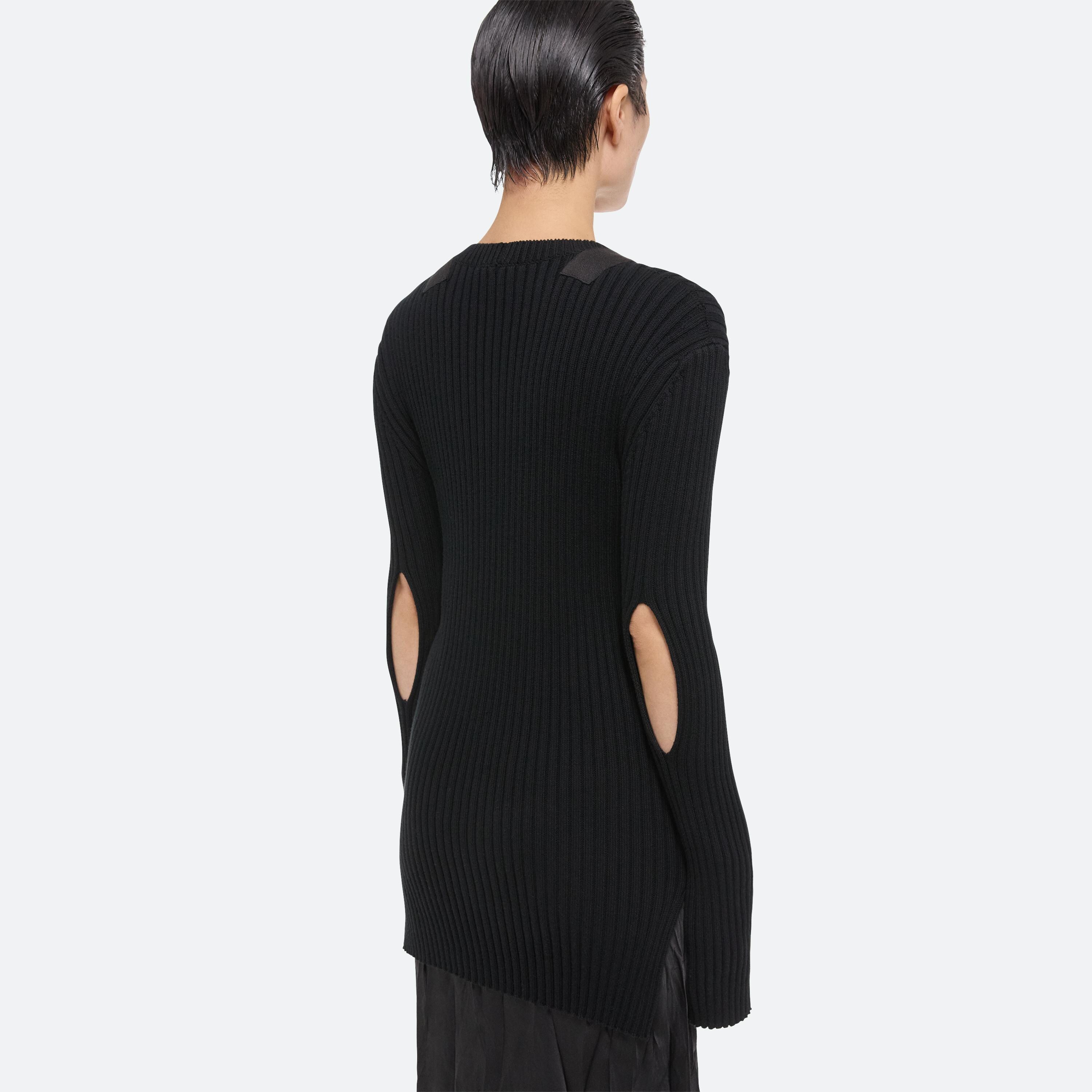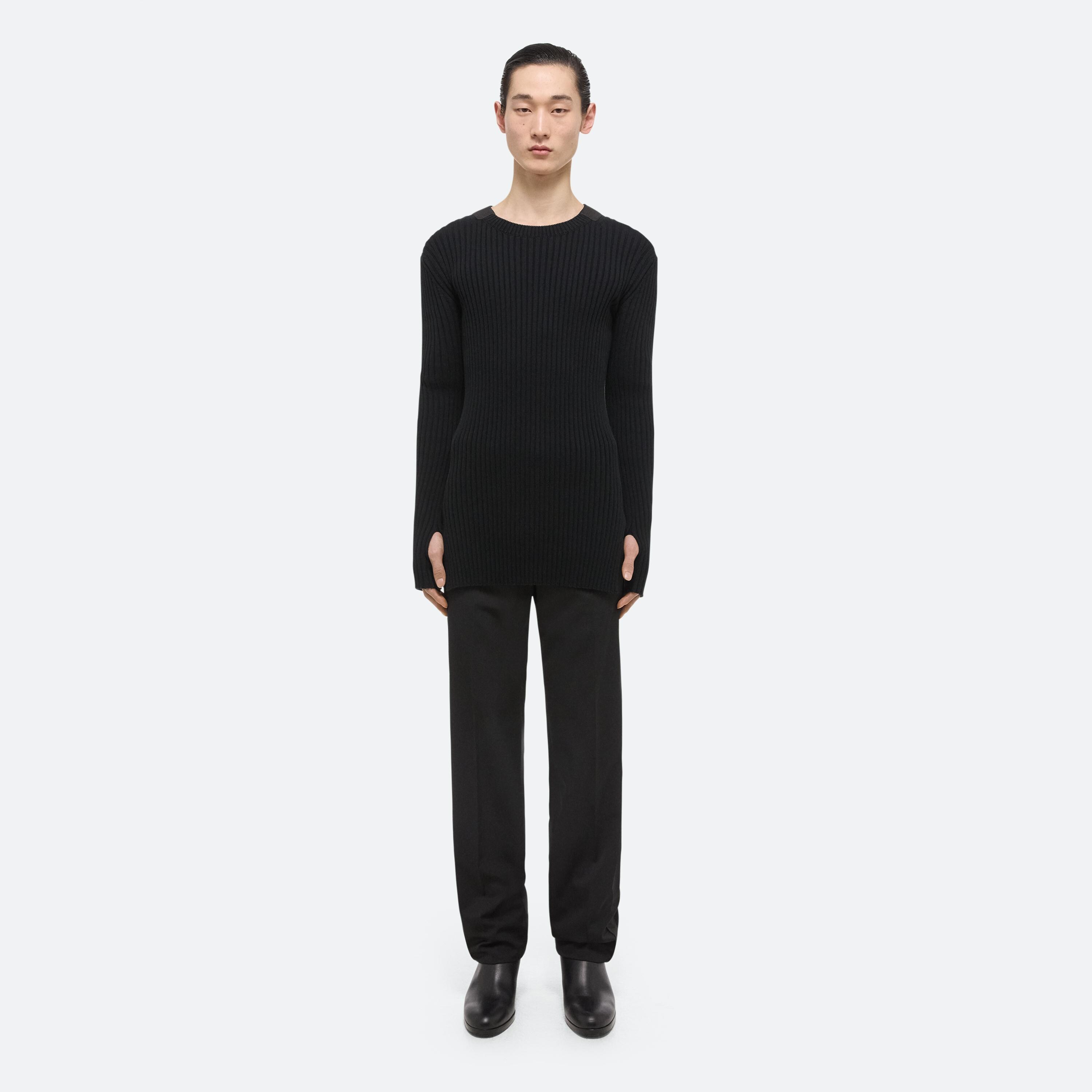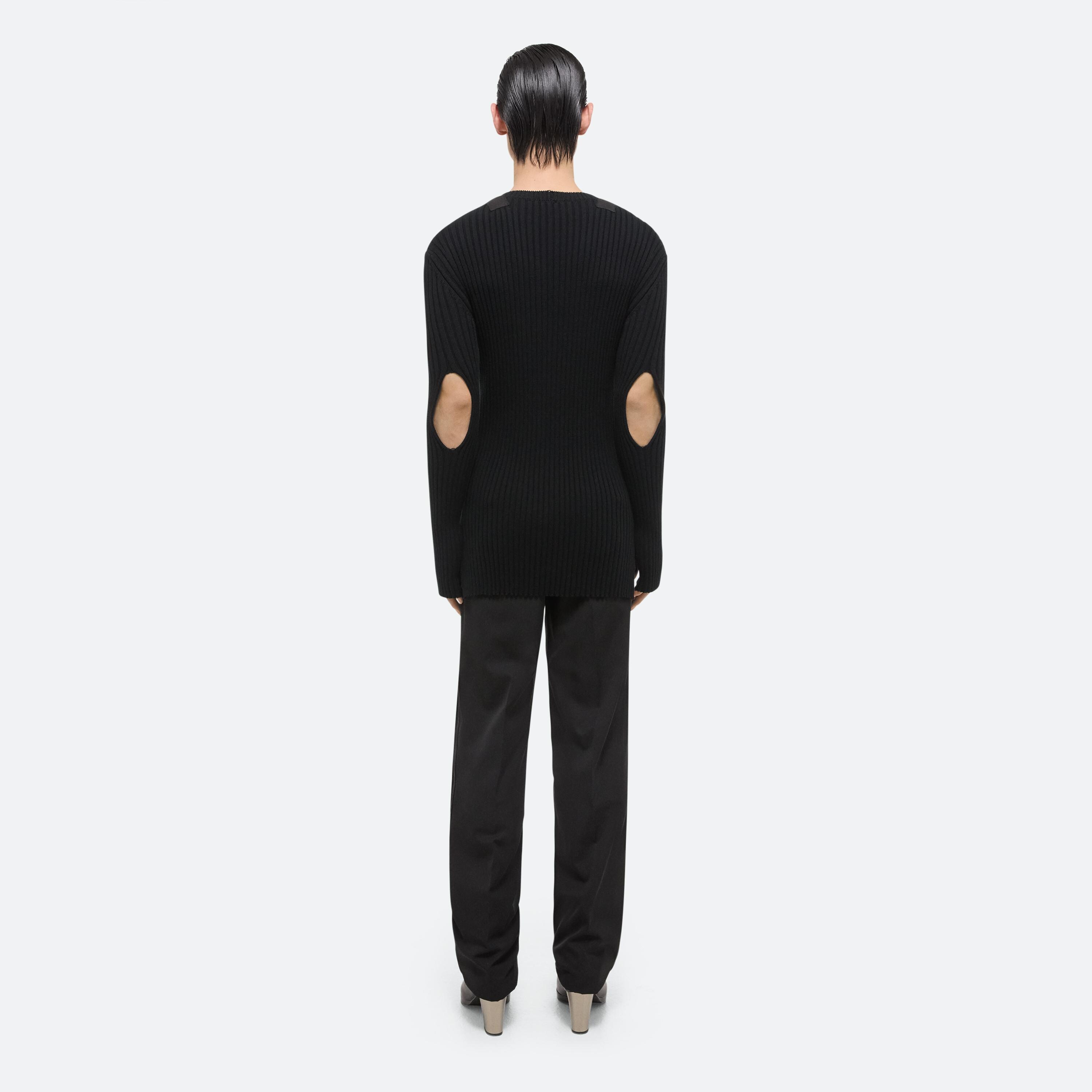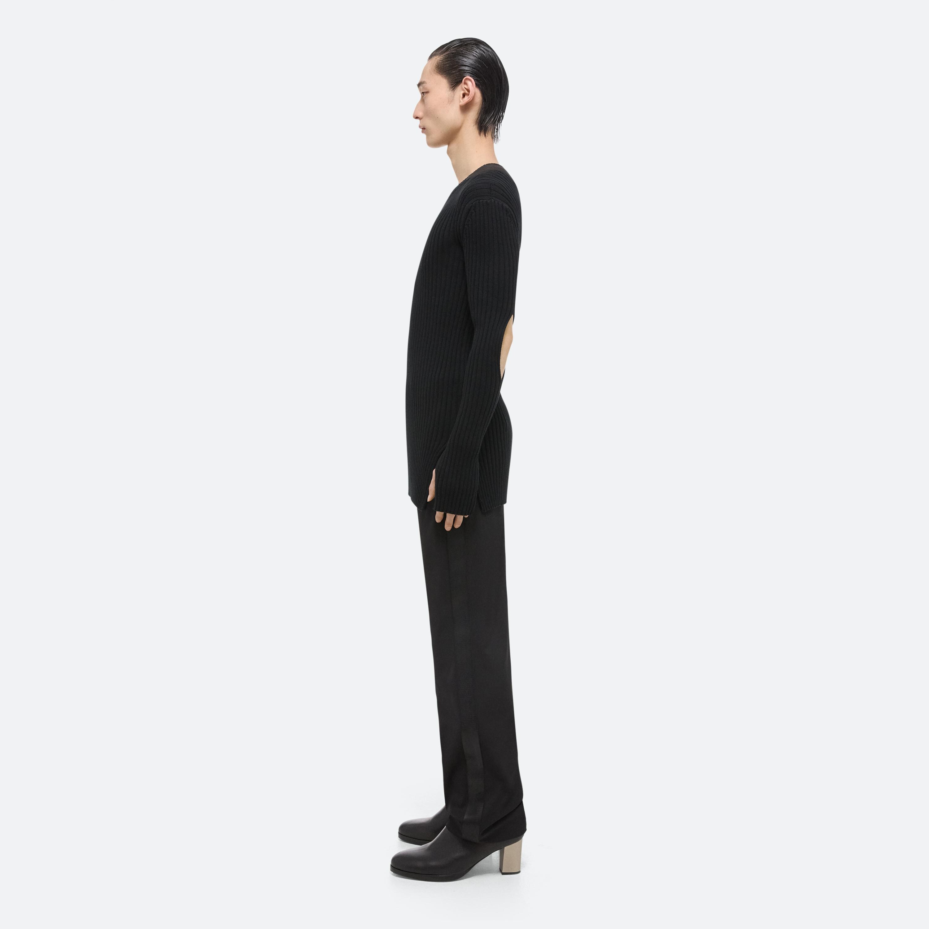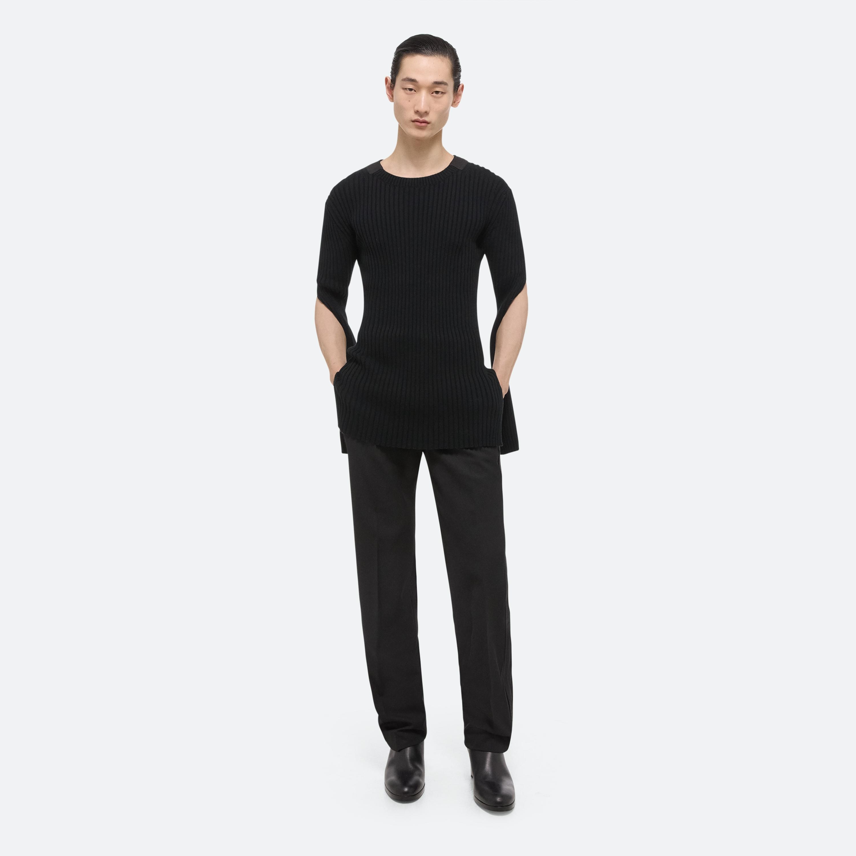 Relaxed rib top with cotton herringbone tapes topstitched along both sides of the neck. Sleeves have cut-outs at the elbow and thumbhole. This garment was designed with many body types and gender expressions in mind.