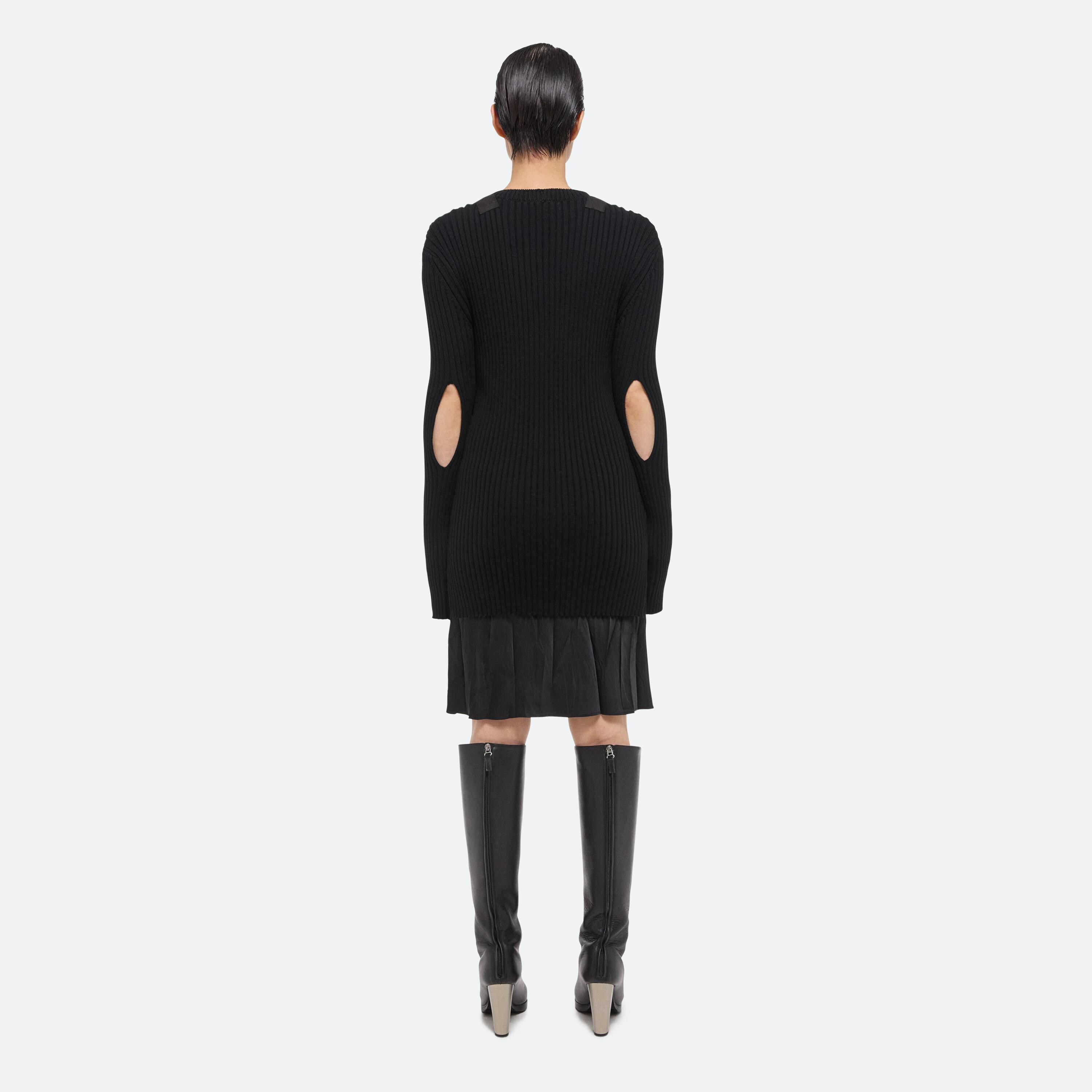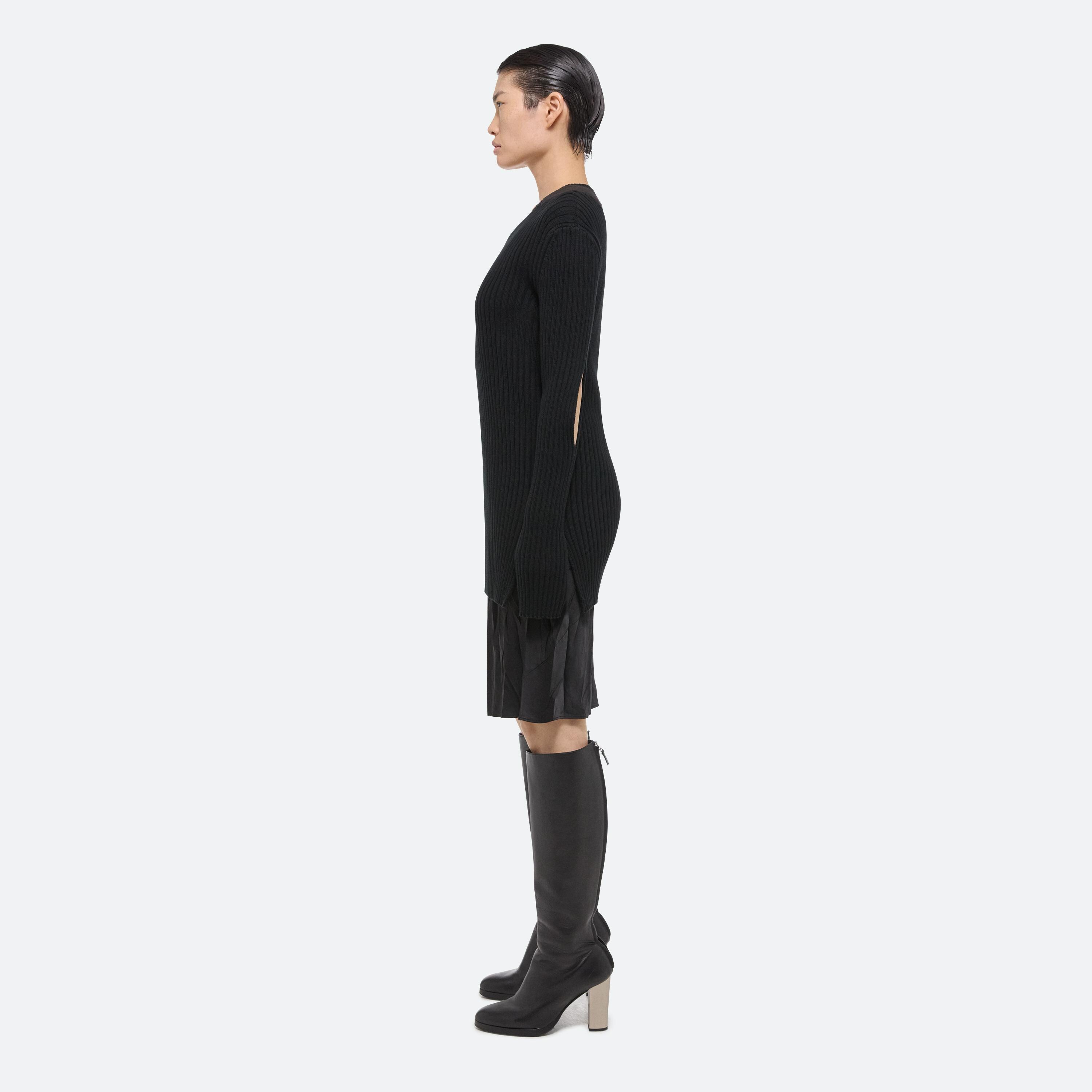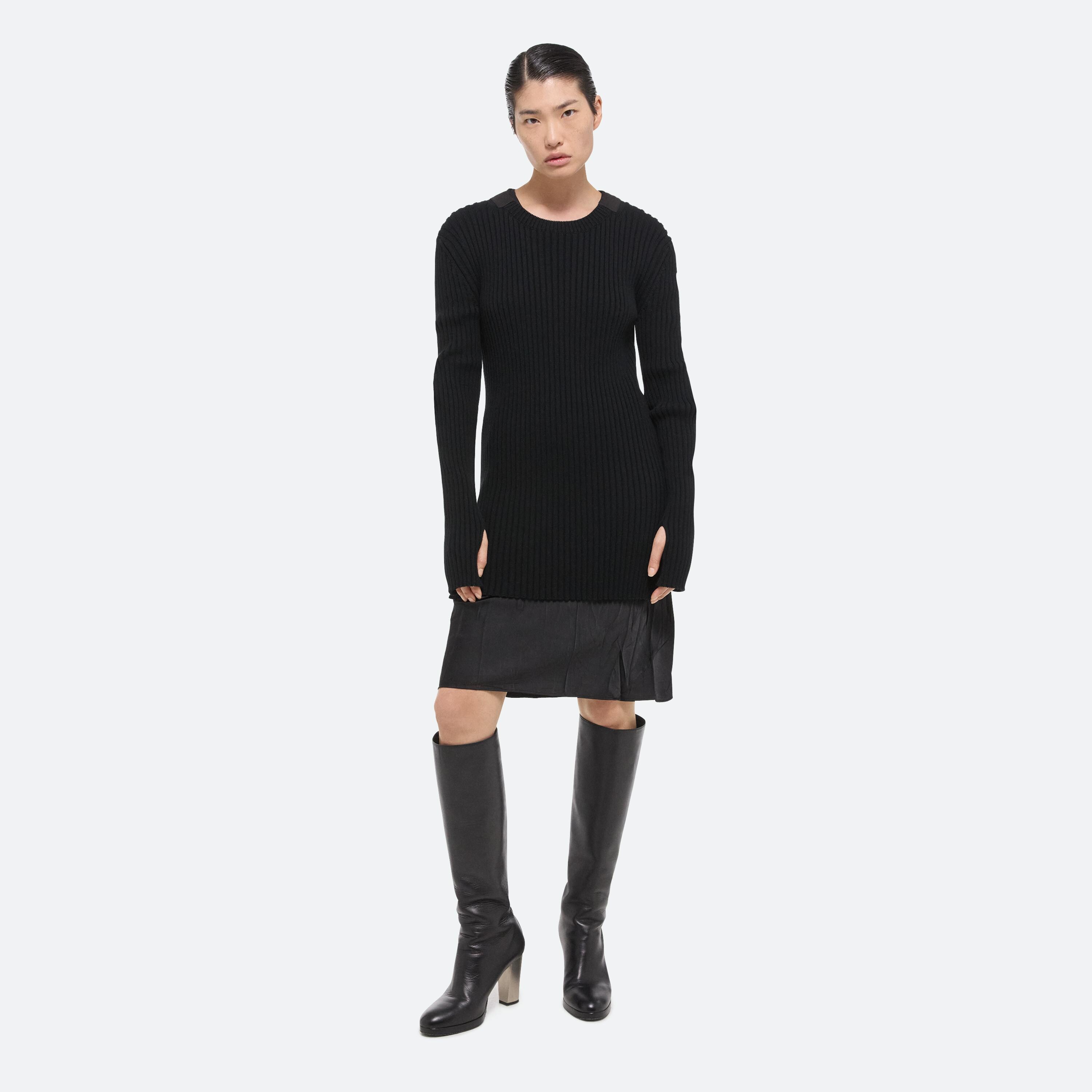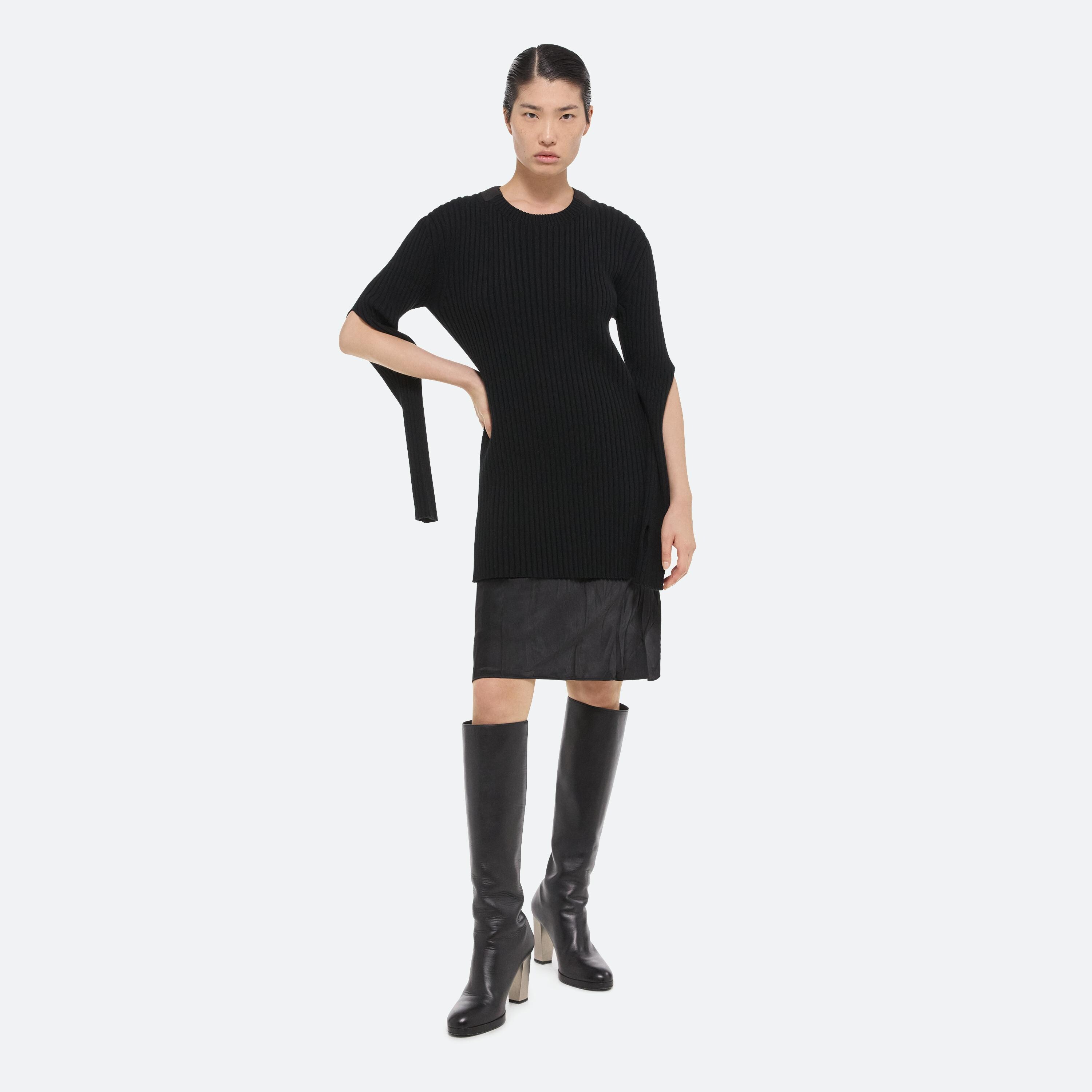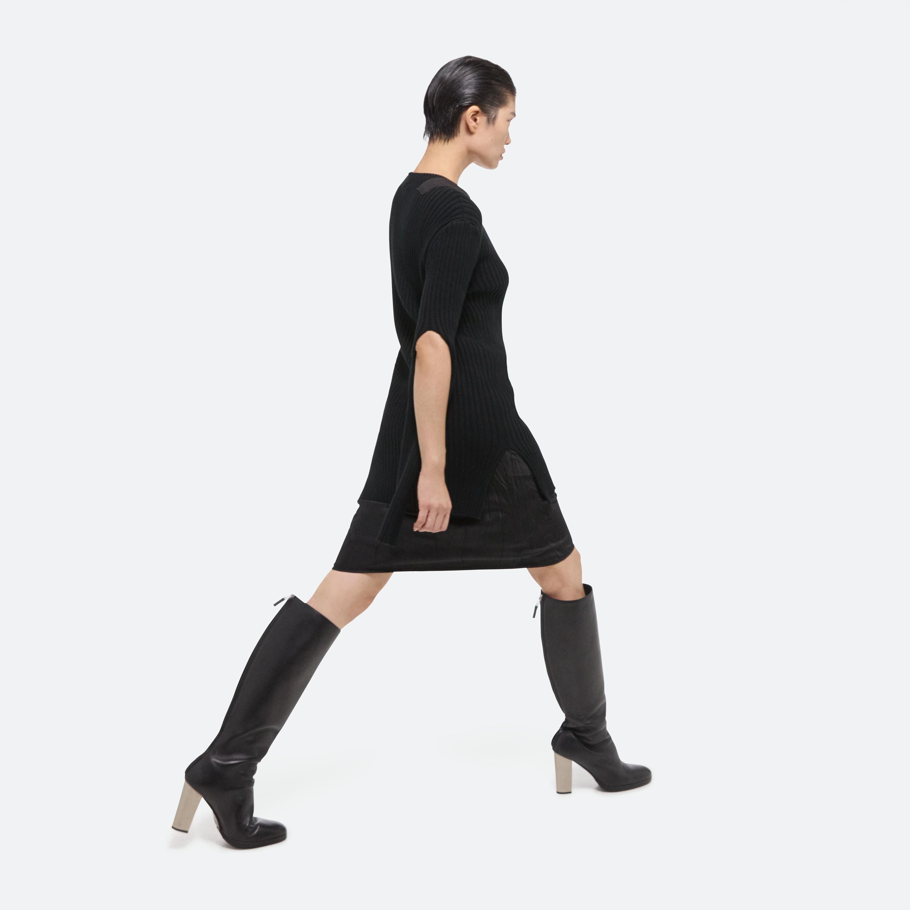 Relaxed rib top with cotton herringbone tapes topstitched along both sides of the neck. Sleeves have cut-outs at the elbow and thumbhole. This garment was designed with many body types and gender expressions in mind.