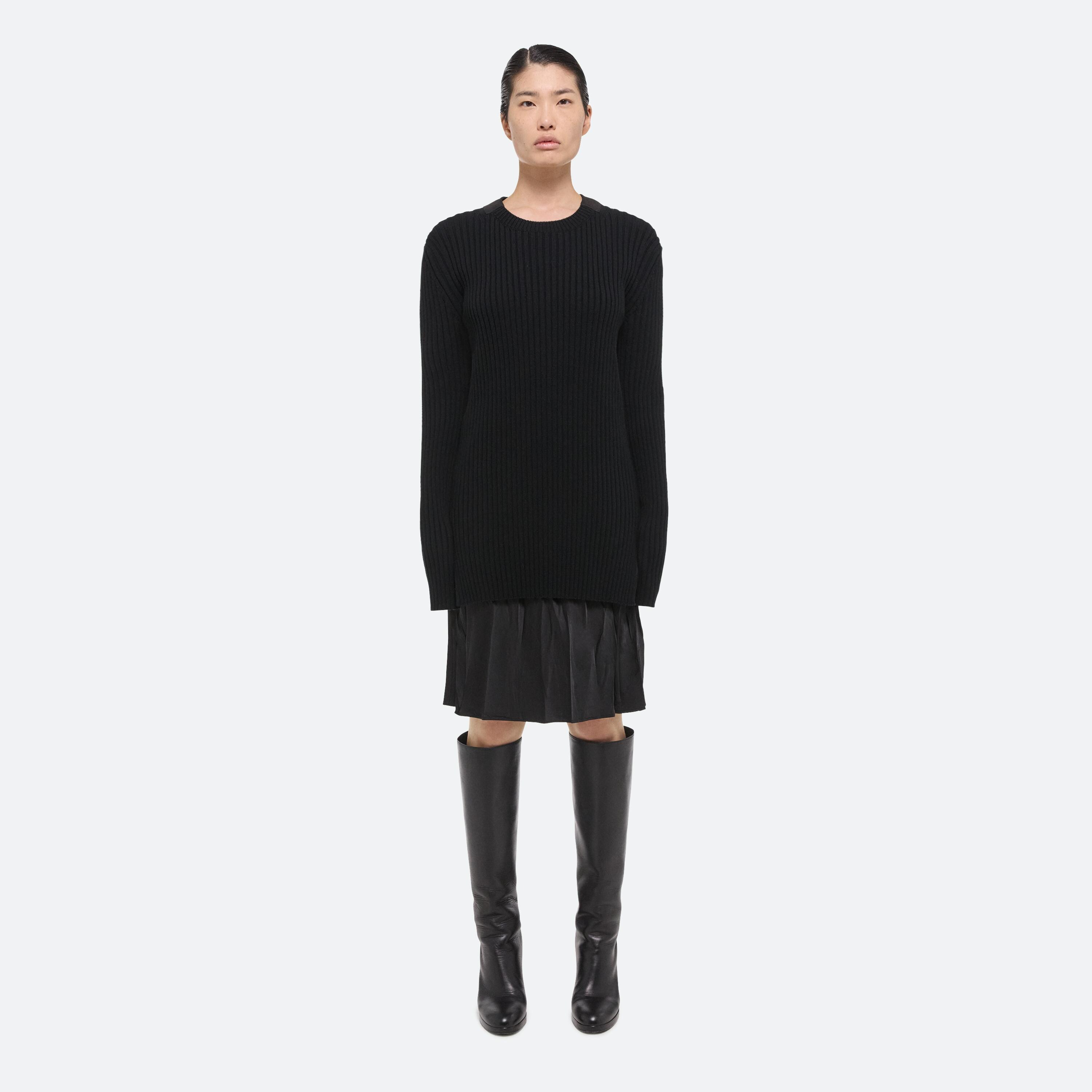 Relaxed rib top with cotton herringbone tapes topstitched along both sides of the neck. Sleeves have cut-outs at the elbow and thumbhole. This garment was designed with many body types and gender expressions in mind.