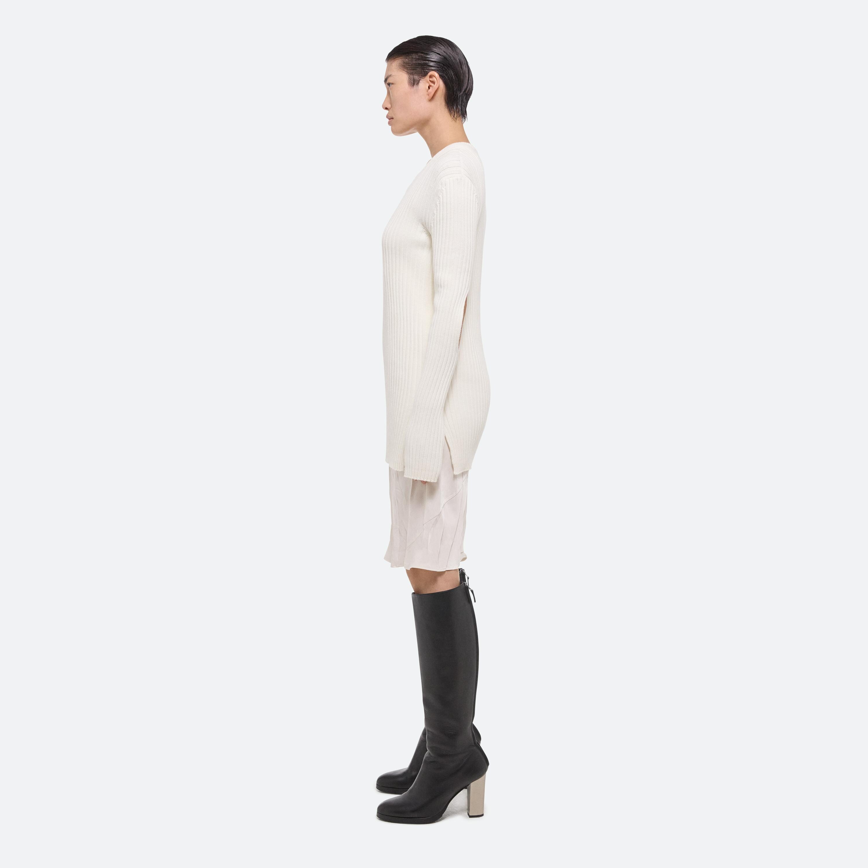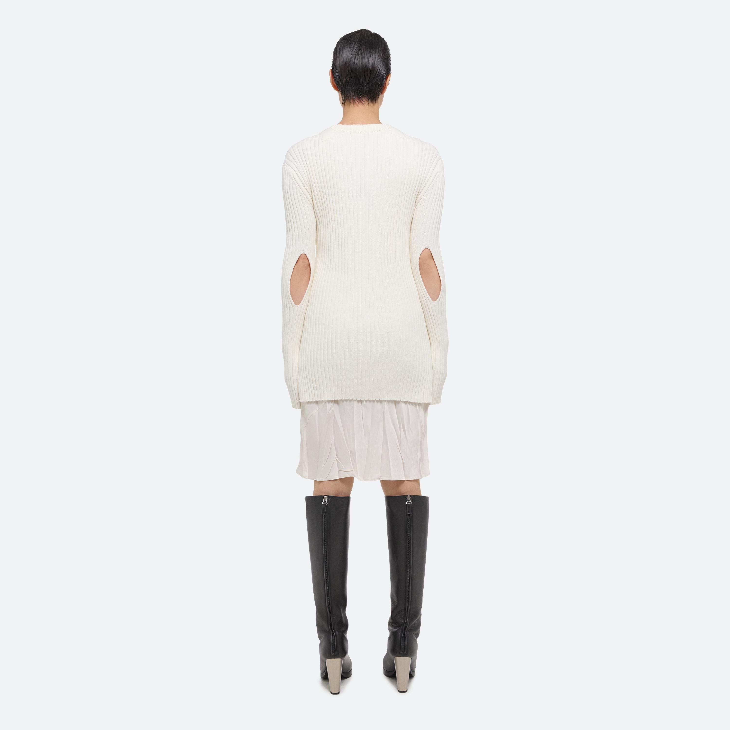 Relaxed rib top with cotton herringbone tapes topstitched along both sides of the neck. Sleeves have cut-outs at the elbow and thumbhole. This garment was designed with many body types and gender expressions in mind.