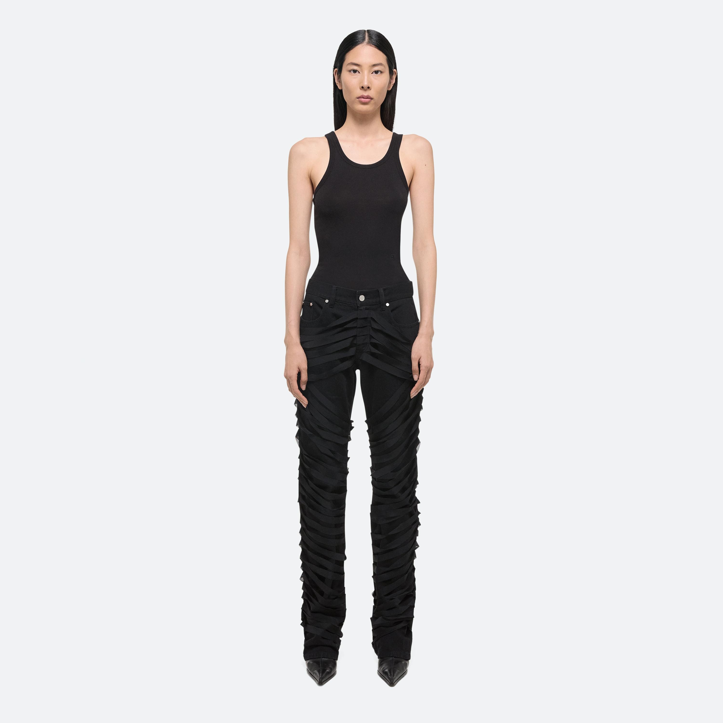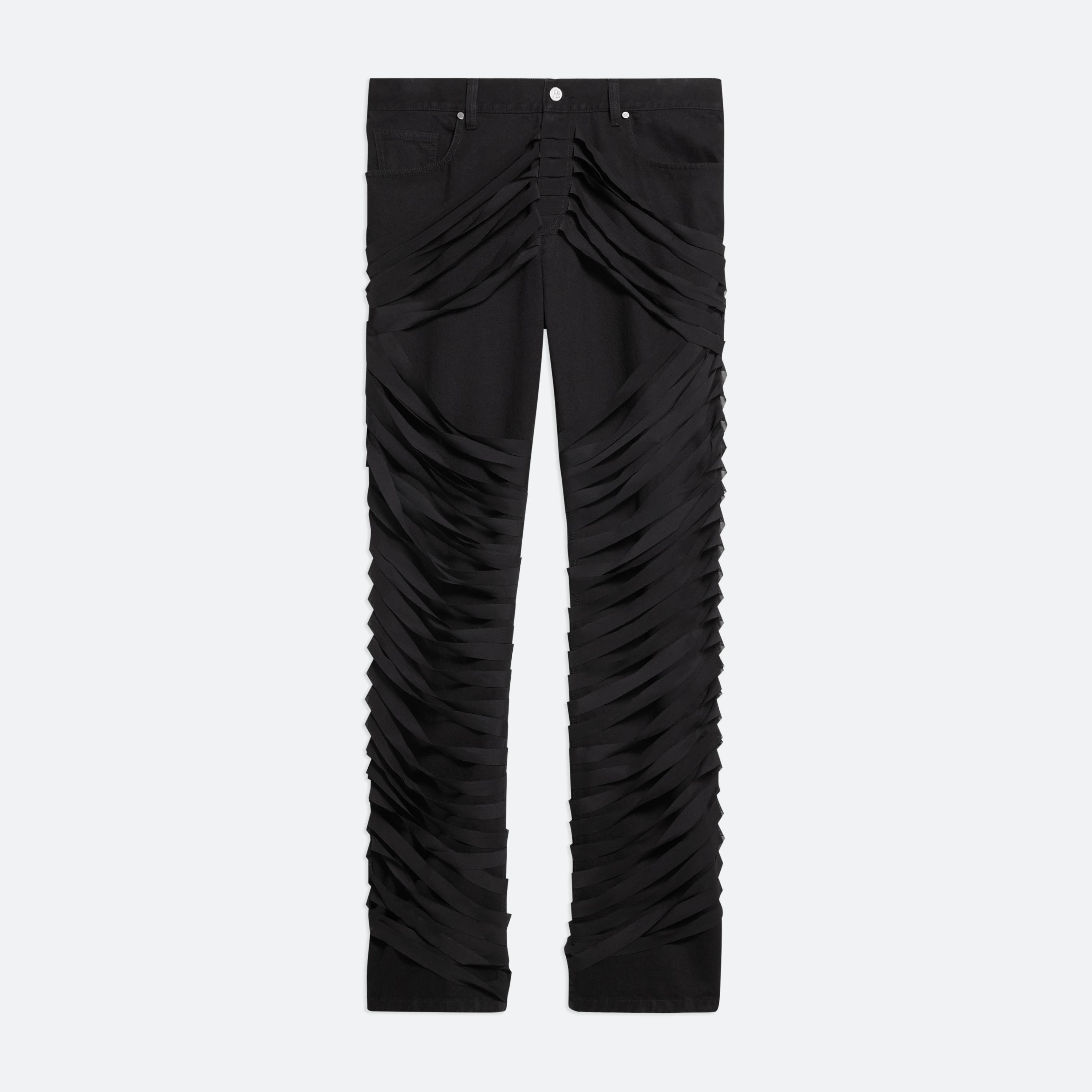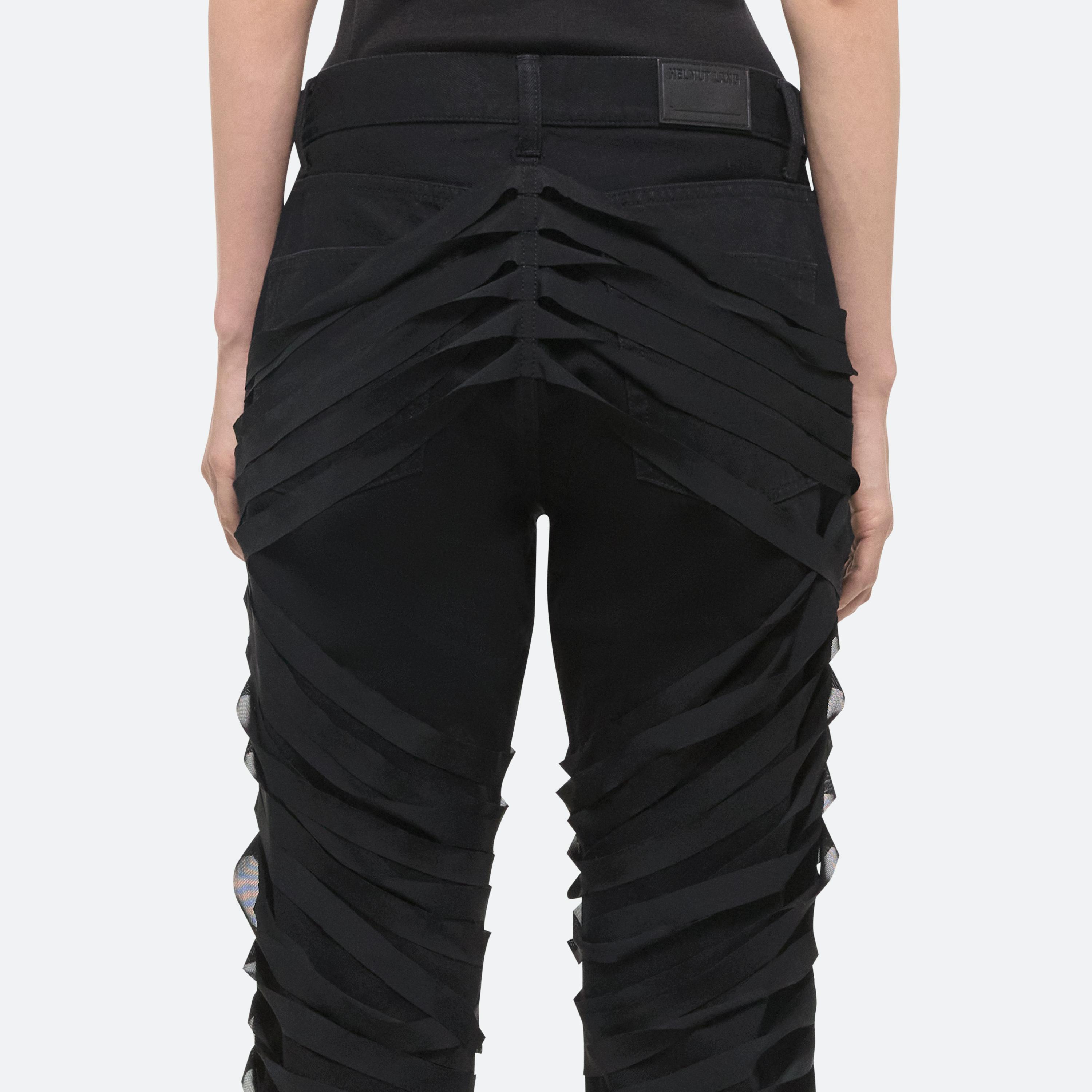 Low-rise five-pocket jeans wrapped in sheer ribbons. Layered strips of power mesh add texture and a sense of restraint without restricting movement. Cut with an easy, relaxed fit and a straight leg.
