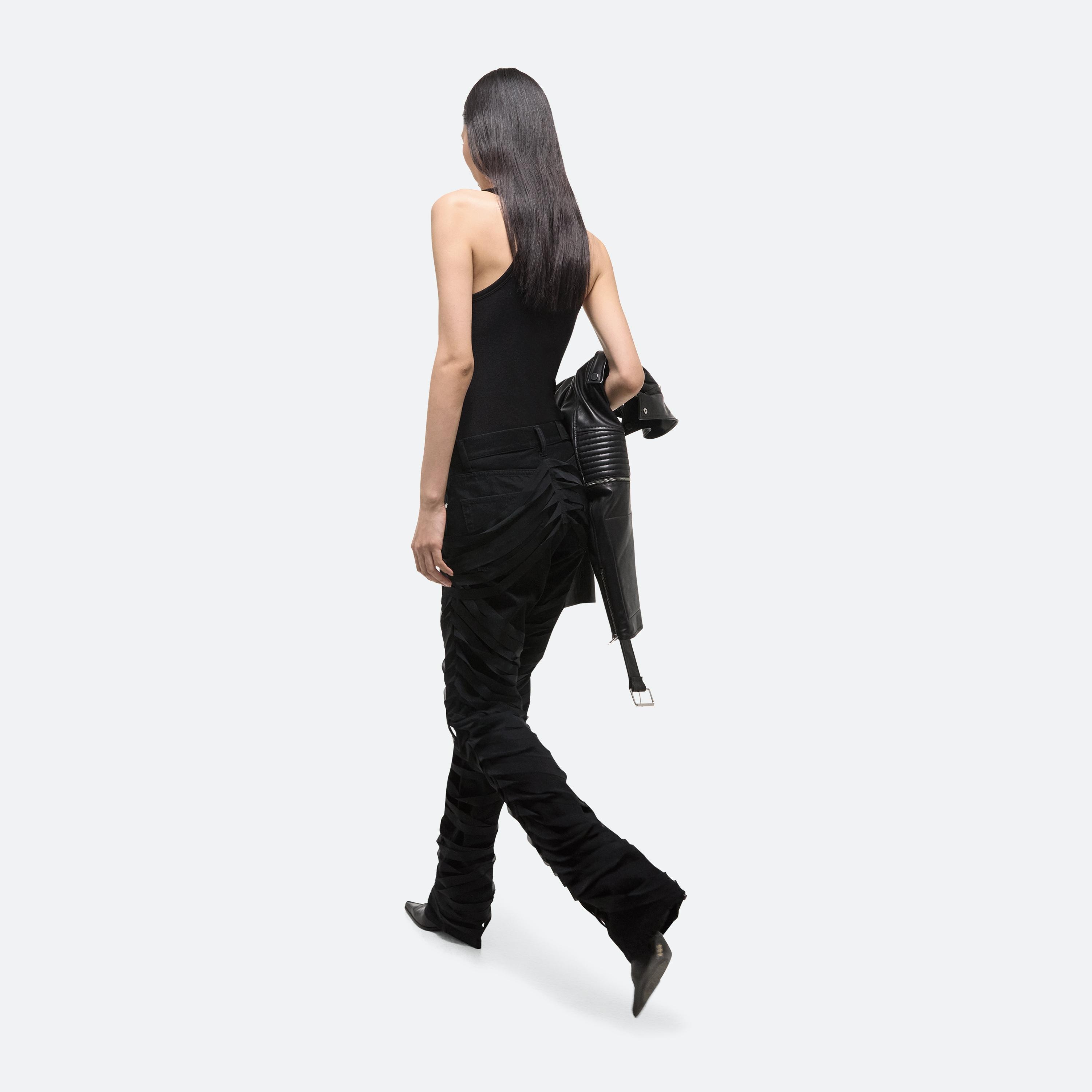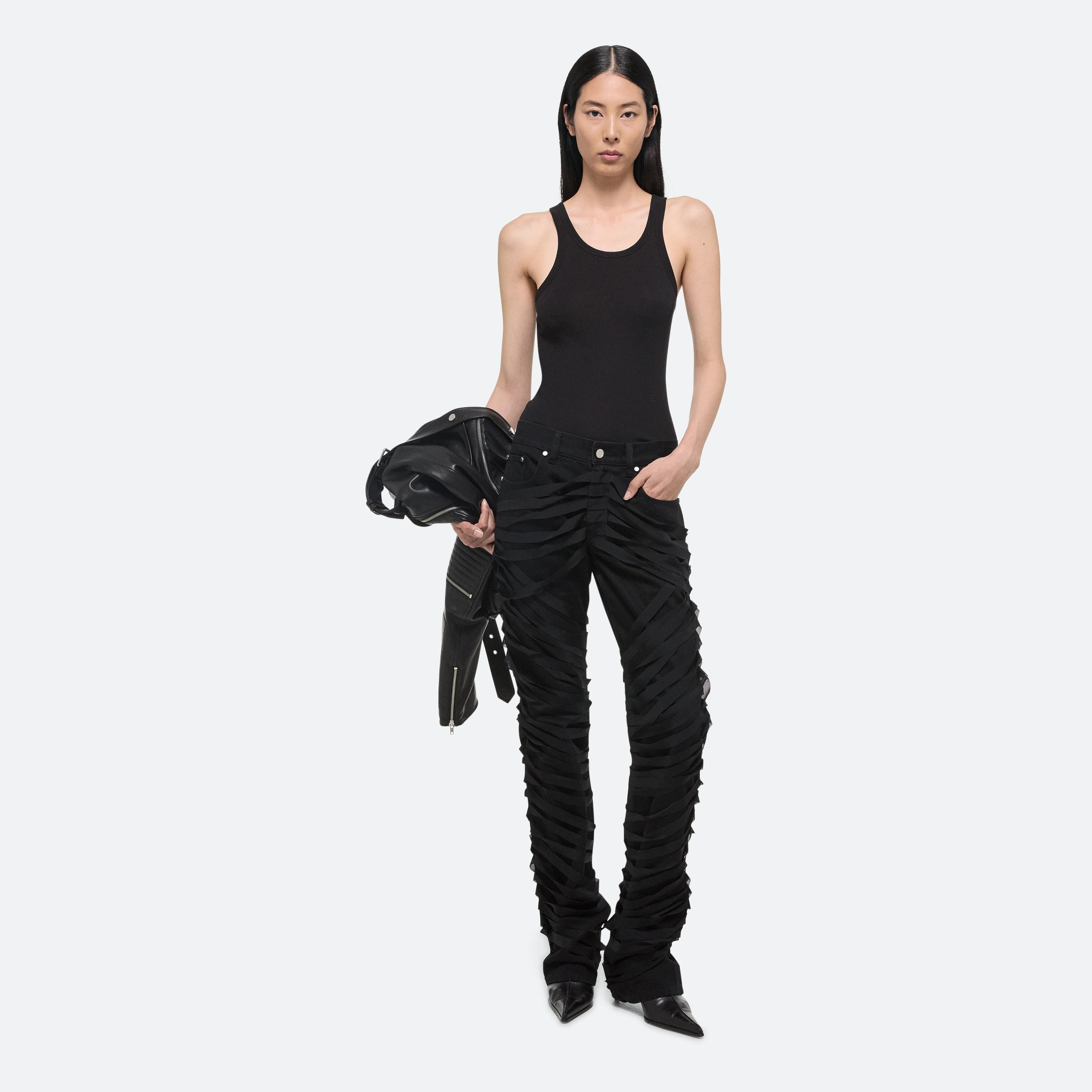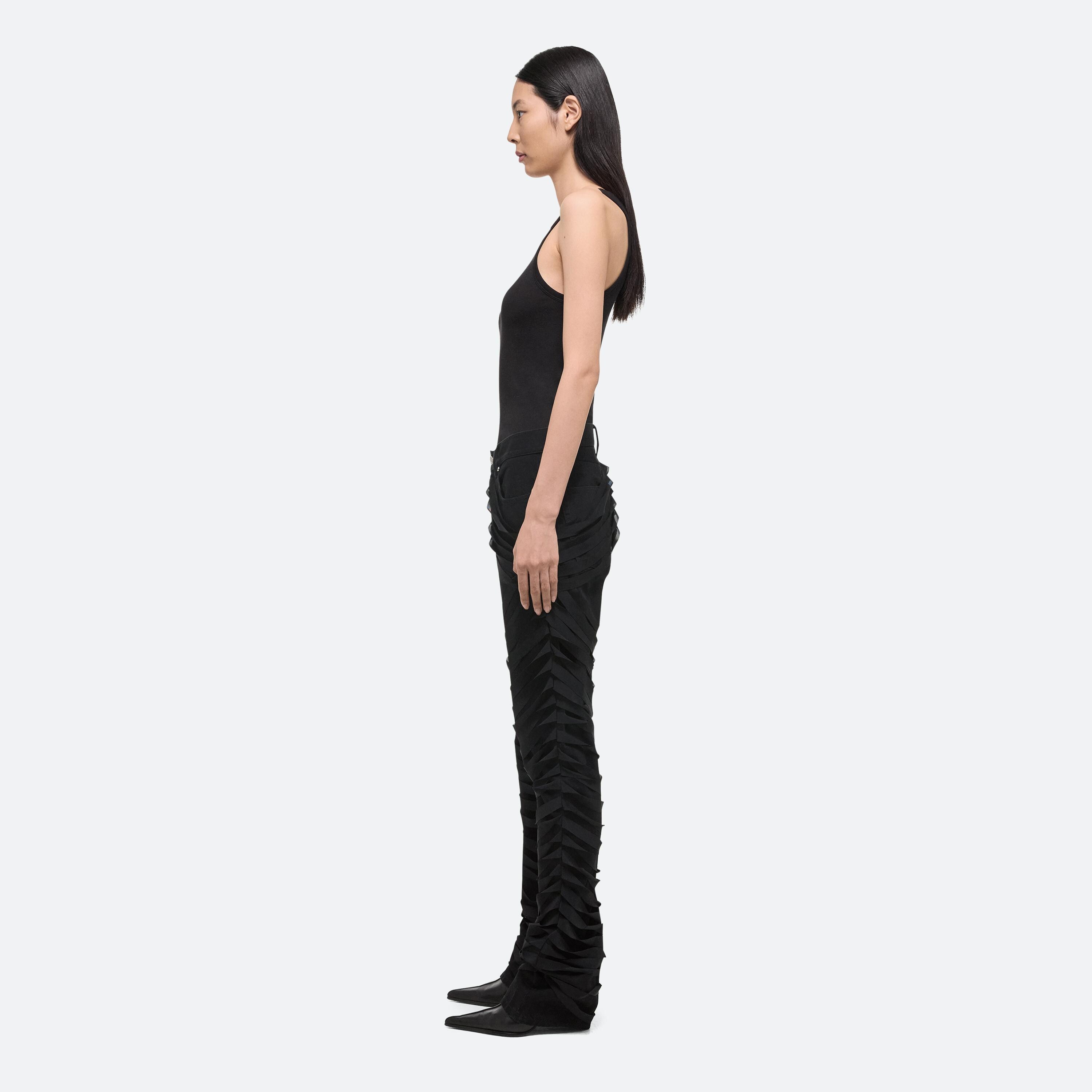 Low-rise five-pocket jeans wrapped in sheer ribbons. Layered strips of power mesh add texture and a sense of restraint without restricting movement. Cut with an easy, relaxed fit and a straight leg.